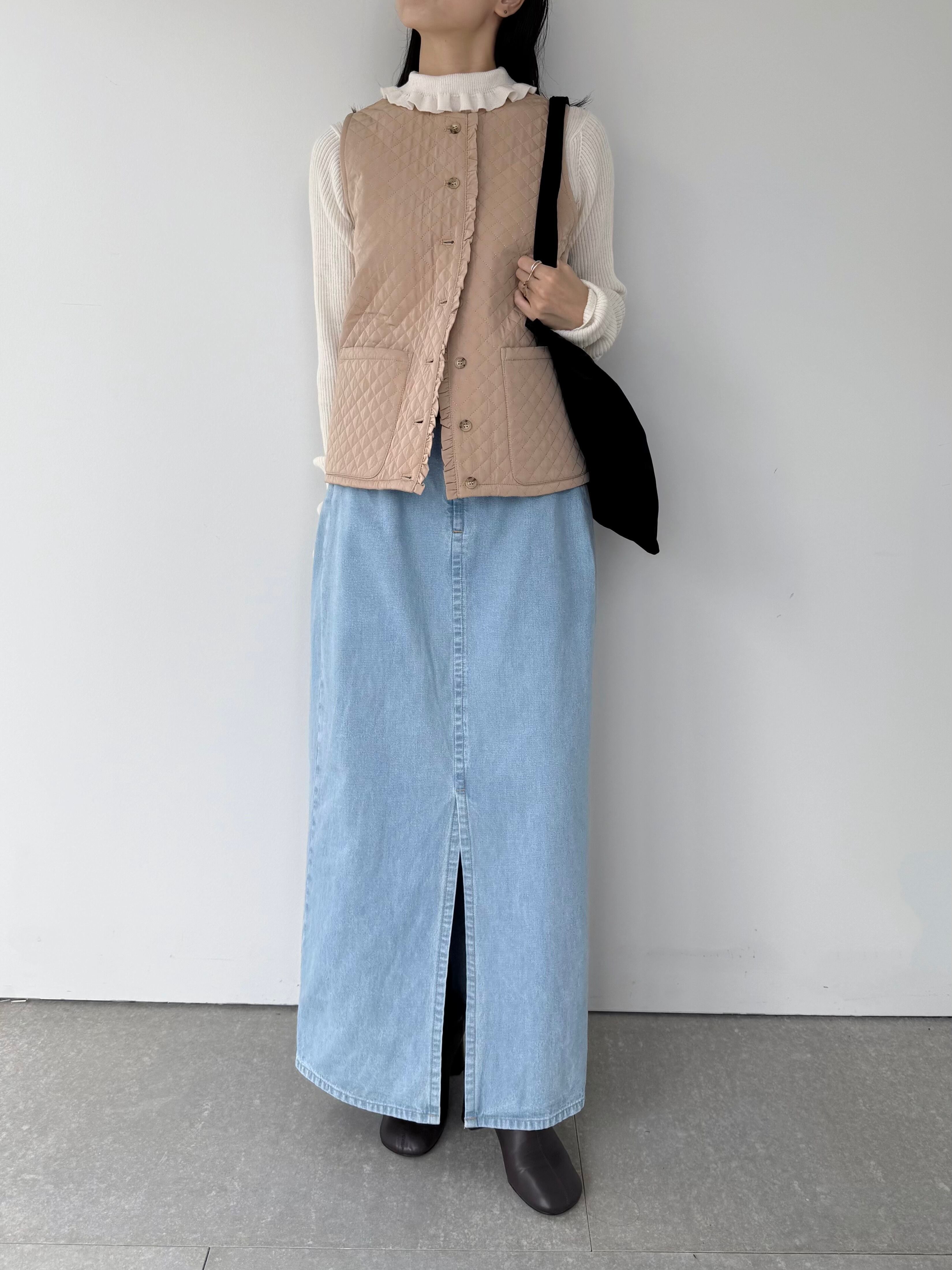 【 CURRENTAGE / カレンテージ 】 2017年に塚崎恵理子氏が立ち上げたブランド。 “CURRENT”+“VINTAGE”(今とヴィンテージ)と“CURRENT”+“AGE”(今を生きる世代) のダブルミーニングが由来。 デザイナーが長年培ったトラデッショナルな洋服への理解をベースに、 その時感じるムードから生み出されるストーリーを反映したアーティザナルなもの作りを行う。 エレガントでクラシックな洋服の成り立ちに、少しの新しさを加えたモダンな佇まいのコレクションが魅力。 ローウエストで大人が履けるプリーツスカート。 バックスタイルはスッキリとしているので大人も履きやすいシルエットでうれしい一着。 デニムはスペインで70年リサイクルコットンを生産してきた"RECOVER”のPost Consumer Recycled Denim yarn を使用したデニムを使用。 緯糸は“RECOVER“のリサイクルコットン50%、オーガニックコットン50%のブレンド糸を使用、経糸はアメリカとオーストラリア産のコットンとリサイクルコットンをブレンドした糸を使用して日本の岡山で織られており、縫製と加工も日本の岡山で作られている。 加工は水を通常の30%カットするエコフレンドリーな加工方法で、極限ブリーチは11ozリングオールドデニムを使用。 タテヨコ共ストレート糸を使用し、ヴィンテージ感のあるソフトな風合いになるデニムをブリーチしいる。 生地の重なる部分はインディゴがほんのり残り、ポケットは加工後に外すことでインディゴがしっかり残ってポイントに。 【サイズ】 1 ウエスト:69 着丈:64.3 ヒップ:98 2 ウエスト:71 着丈:65.3 ヒップ:104 (cm) 【カラー】 Bleach 【素材】 コットン100% 【原産国】 日本 ※ブリーチにかけたアイテムです。 ※サイドファスナー仕様 ※裏地なし ※モデル身長163cm、1サイズ着用 ※モニター発色の具合により色合いが異なる場合がございます。 (A2561FS506)