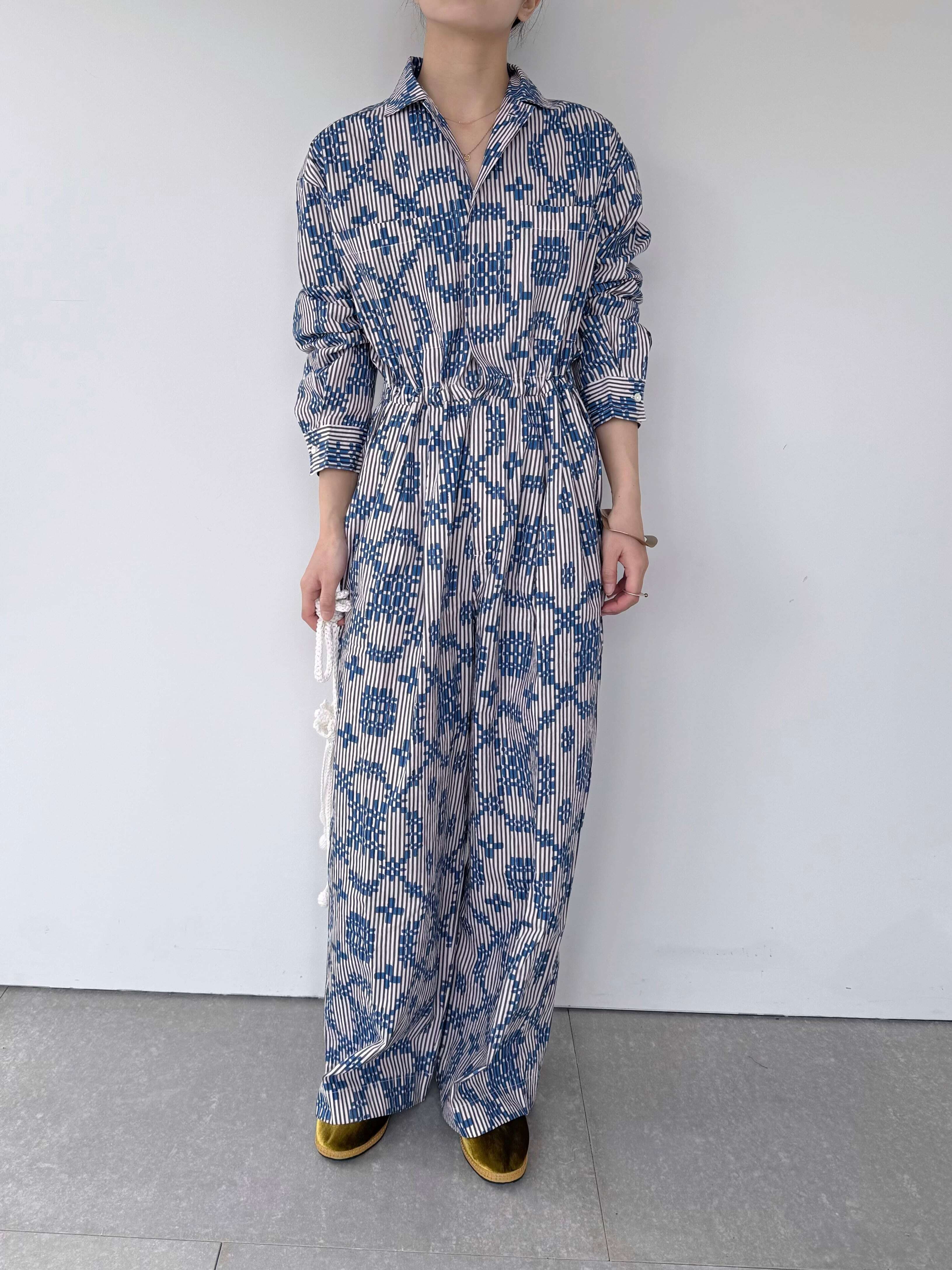 【Sara Mallika / サラマリカ】 日本人女性がデザイナーのインド製でテキスタイルや刺繍を得意としたアイテムを多く展開しているブランド。 ブランド名はボーダーレスな感覚で世界中を旅する“Sara” という女性と サンスクリット語で、ジャスミンの花を意味する言葉“mallika”を合わせた造語から名づけられた。 【モード&リラクシーなオールインワン】 ハリのあるコットン100%のストライプ生地にオリジナルプリントを施したオールインワン。 幾何学的なリズミカルなモチーフが魅力的。 比翼仕立てのフロントは、ミニマルで洗練された印象を演出。 内側にはドローストリングのコードを備え、ウエストを絞れば、体型やシーンに合わせてシルエットのアレンジが可能なアイテム。 絞らずにストンと落として着れば、バギーシルエットになり、ラフな抜け感を楽しめます。 ウエストの細やかなタックが立体感を生み、履くだけでスタイル良く見せてくれます。 胸元や背面に配したポケットが、ワークの要素を感じさせながらも上品な雰囲気を醸し出します。 袖口はシャツのような開き仕様で、軽くまくると、こなれ感が生まれます。 構築的でいて、柔らかい、Sara mallikaが提案する、新しい“大人のオールインワン”です。 【サイズ】 S 肩幅:49 身幅:51 袖丈:55 着丈:138 股下:60 ヒップ:116 M 肩幅:49.5 身幅:52.5 袖丈:56.5 着丈:149 股下:66 ヒップ:120 (cm) 【カラー】 Blue 【素材】 コットン100% 【原産国】 インド ※モデル身長164cm、Mサイズ着用 ※モニター発色の具合により色合いが異なる場合がございます。 (020861SE1)