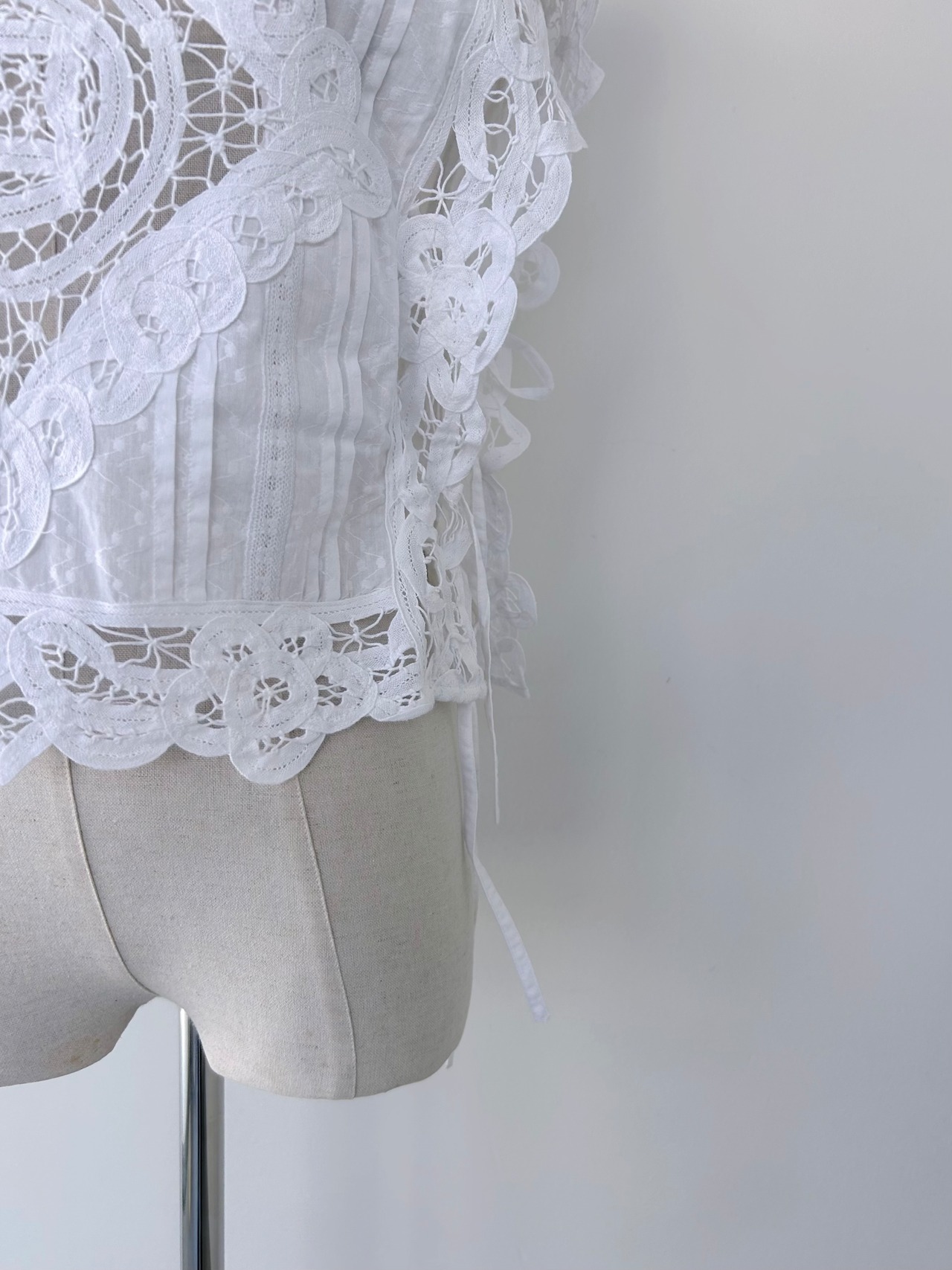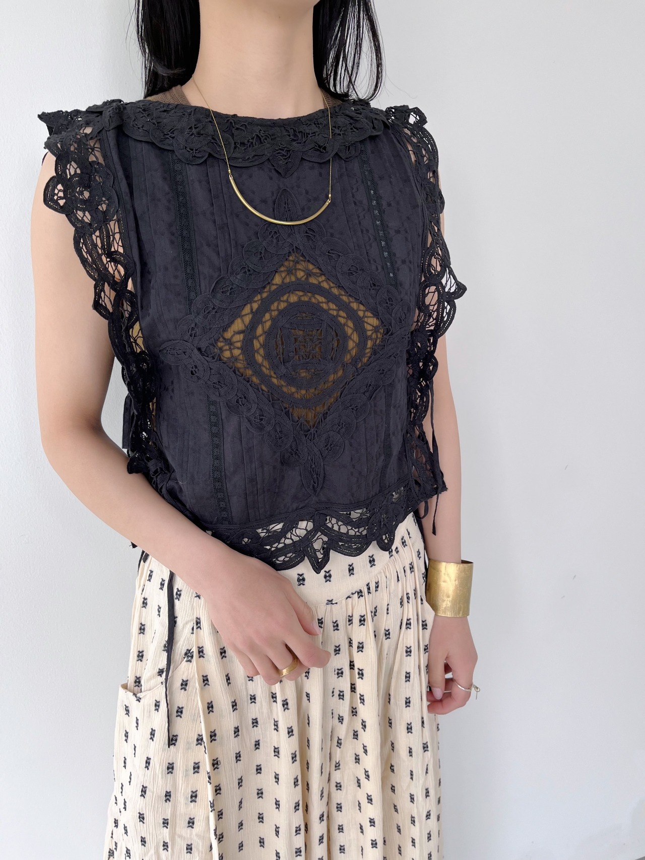 ヴィンテージライクなバテンレースを大胆にあしらったトップスはプラスワンアイテムおすすめ。
