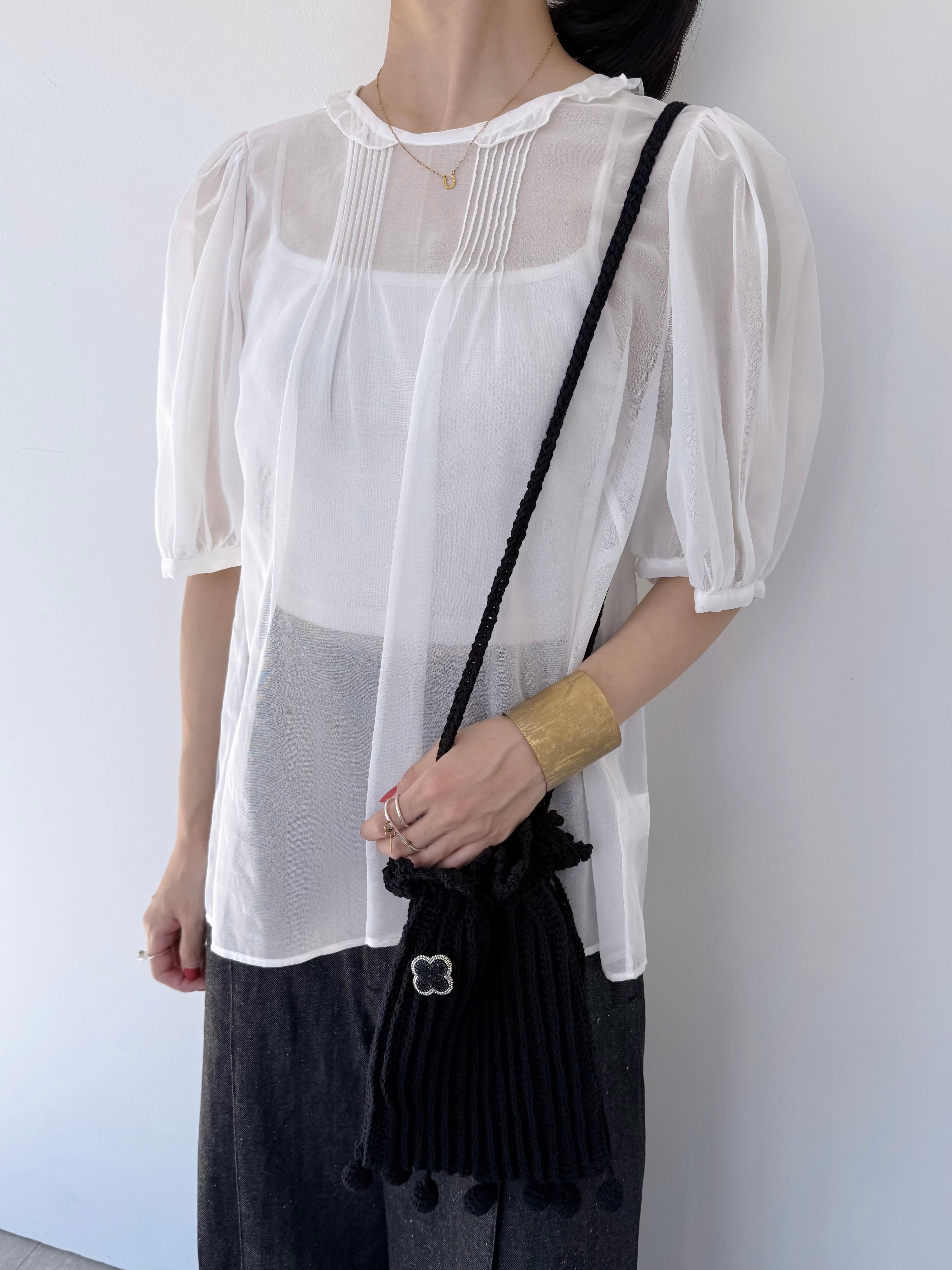 ハリと光沢感が美しいオーガンジー素材がドレッシーな装いにシフトするトップス。