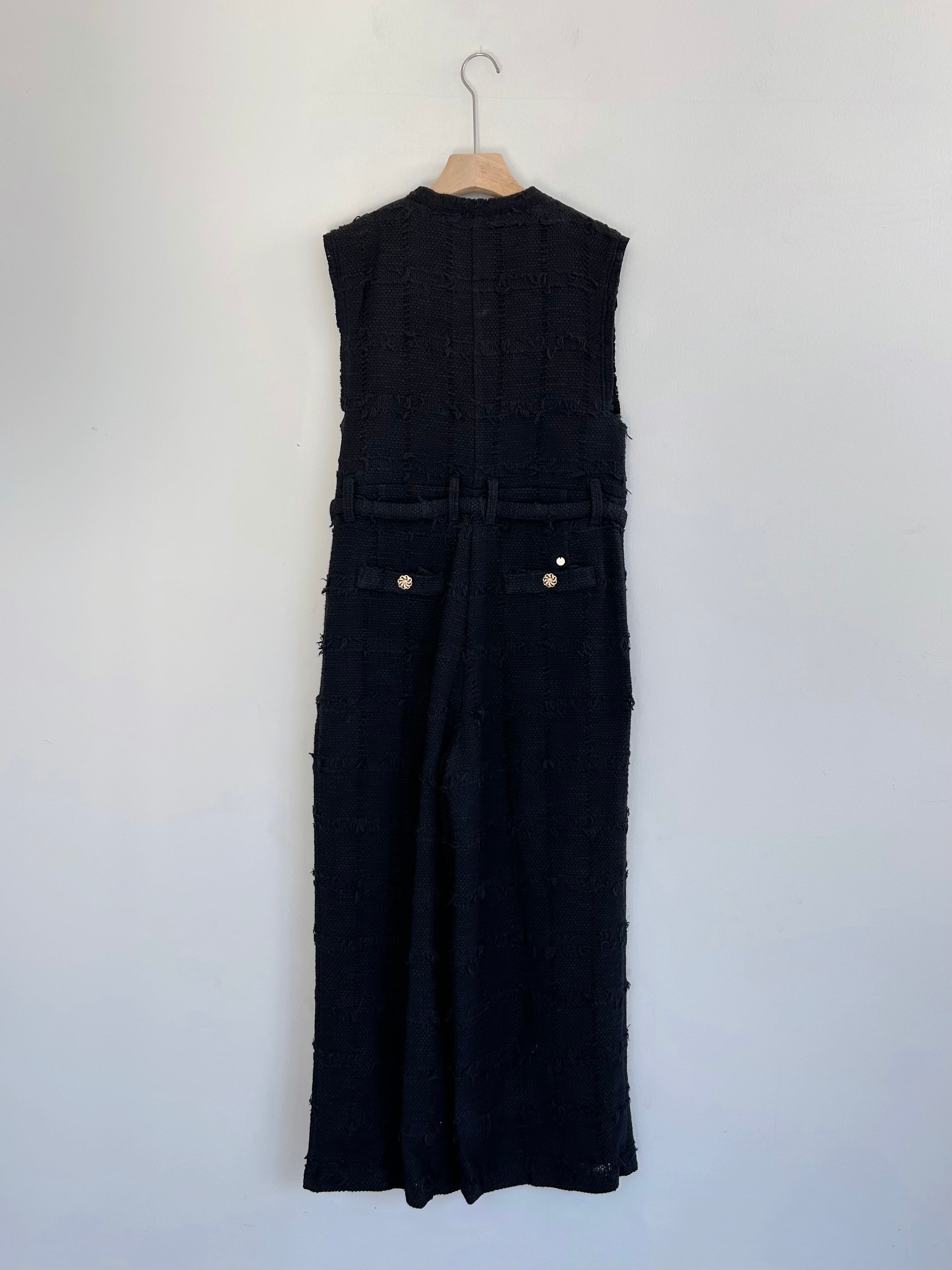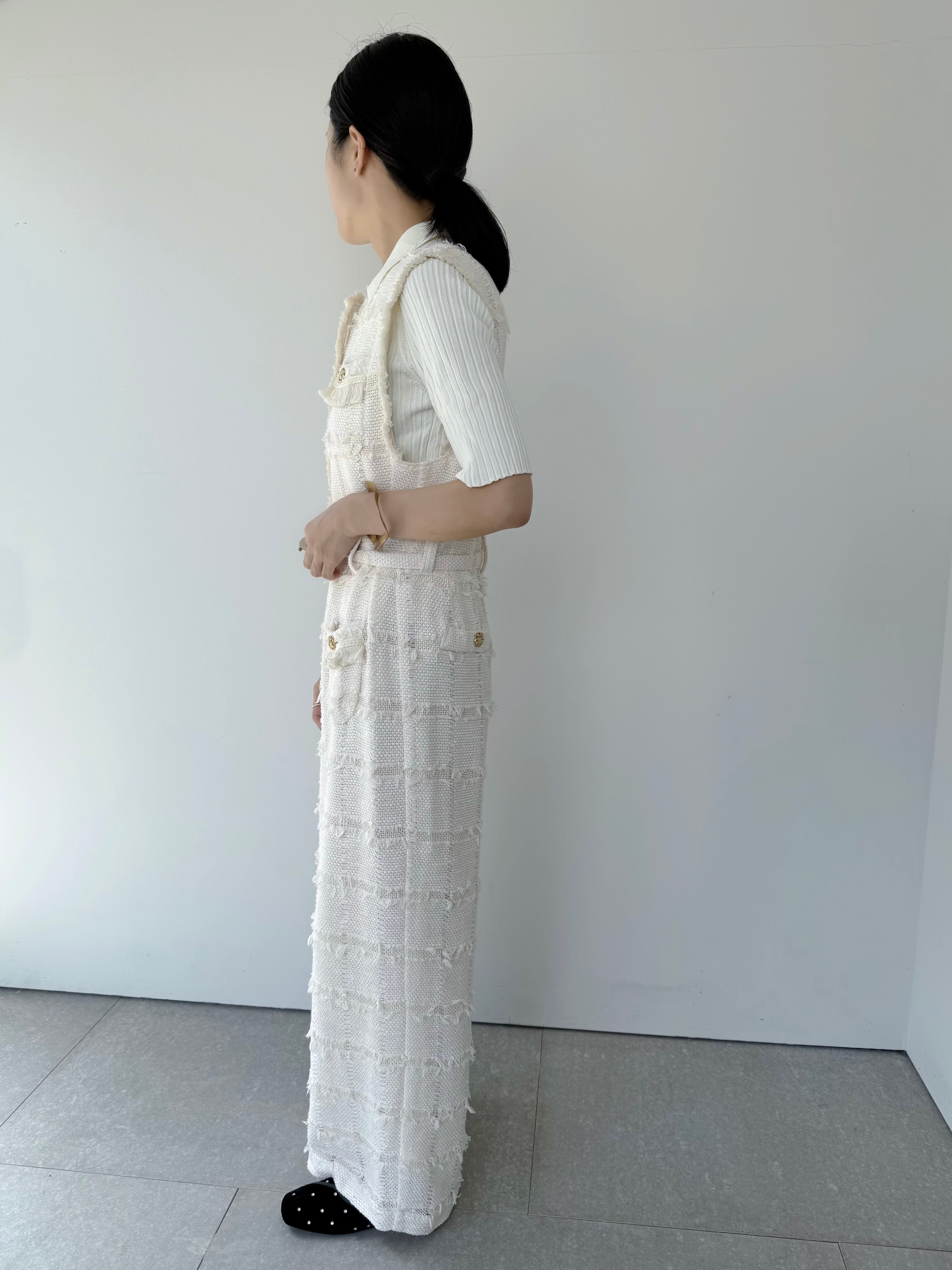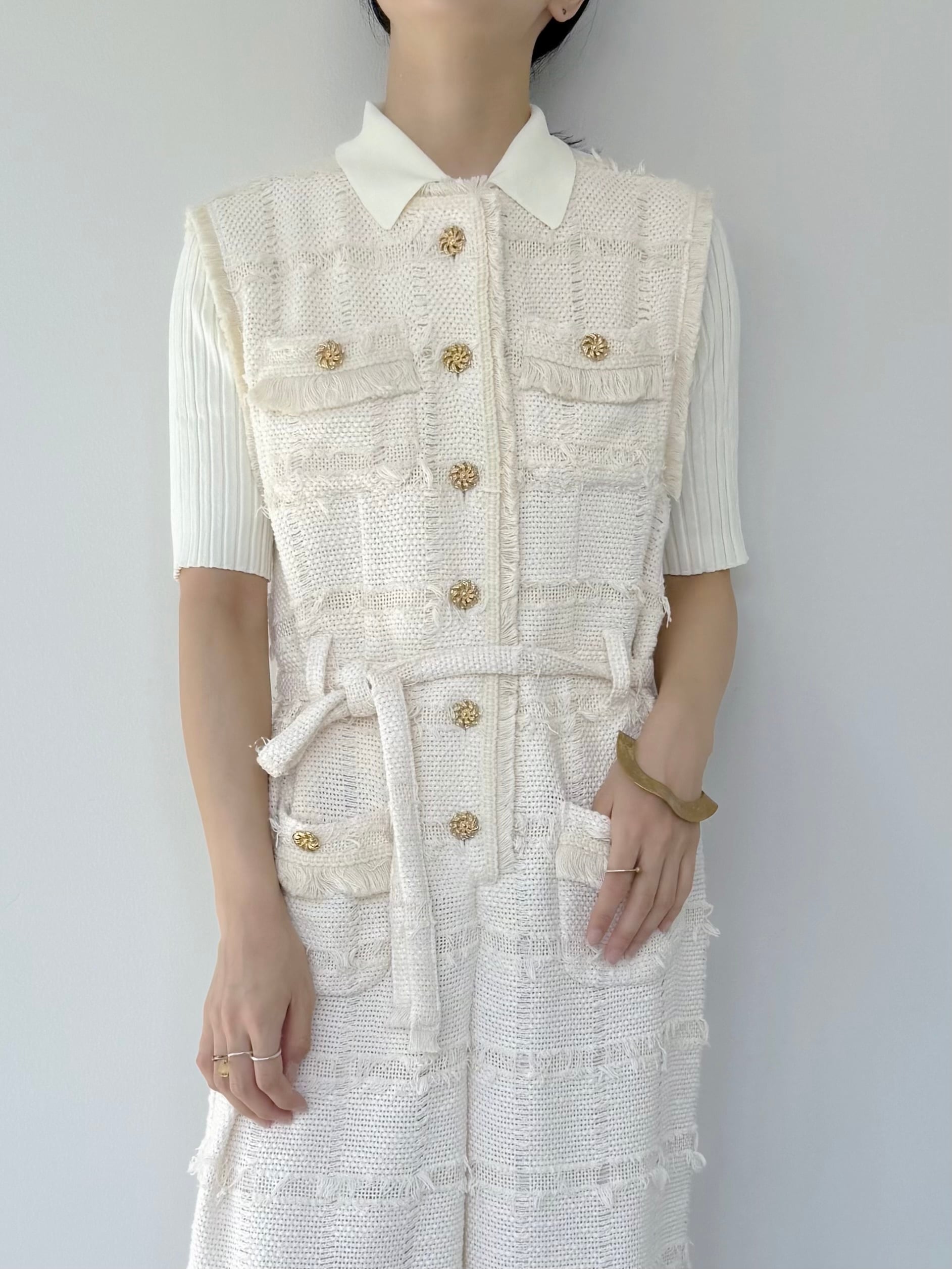 ゴールドのフラワーボタンとフリンジ、ケーブルで表情豊かに仕上げたツイードジャンプスーツ。
