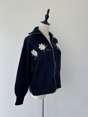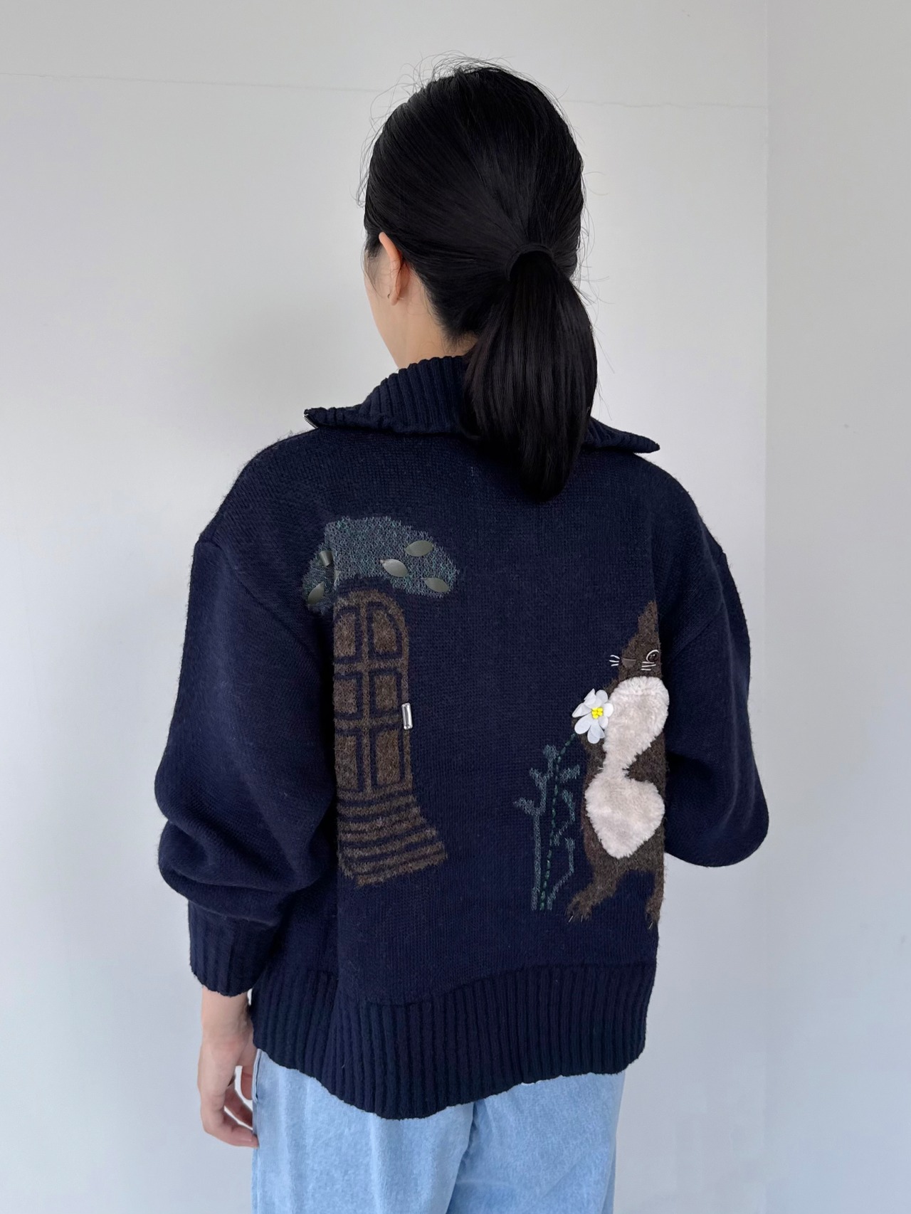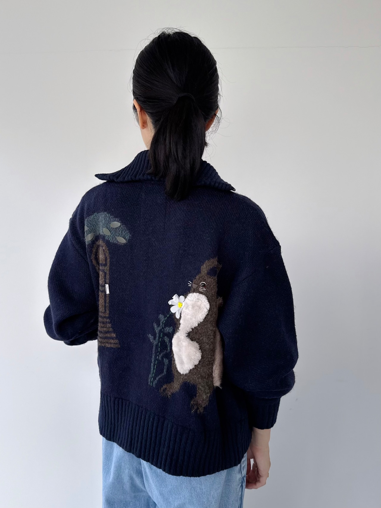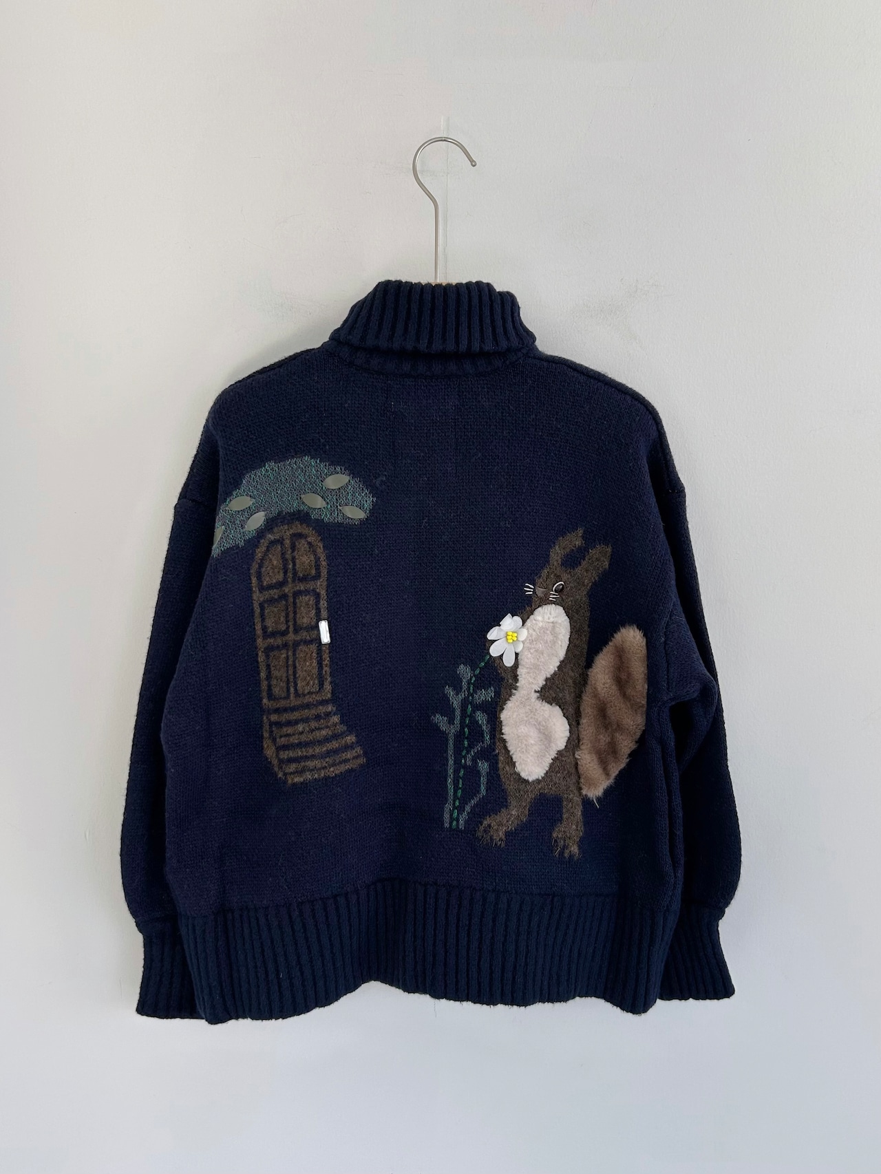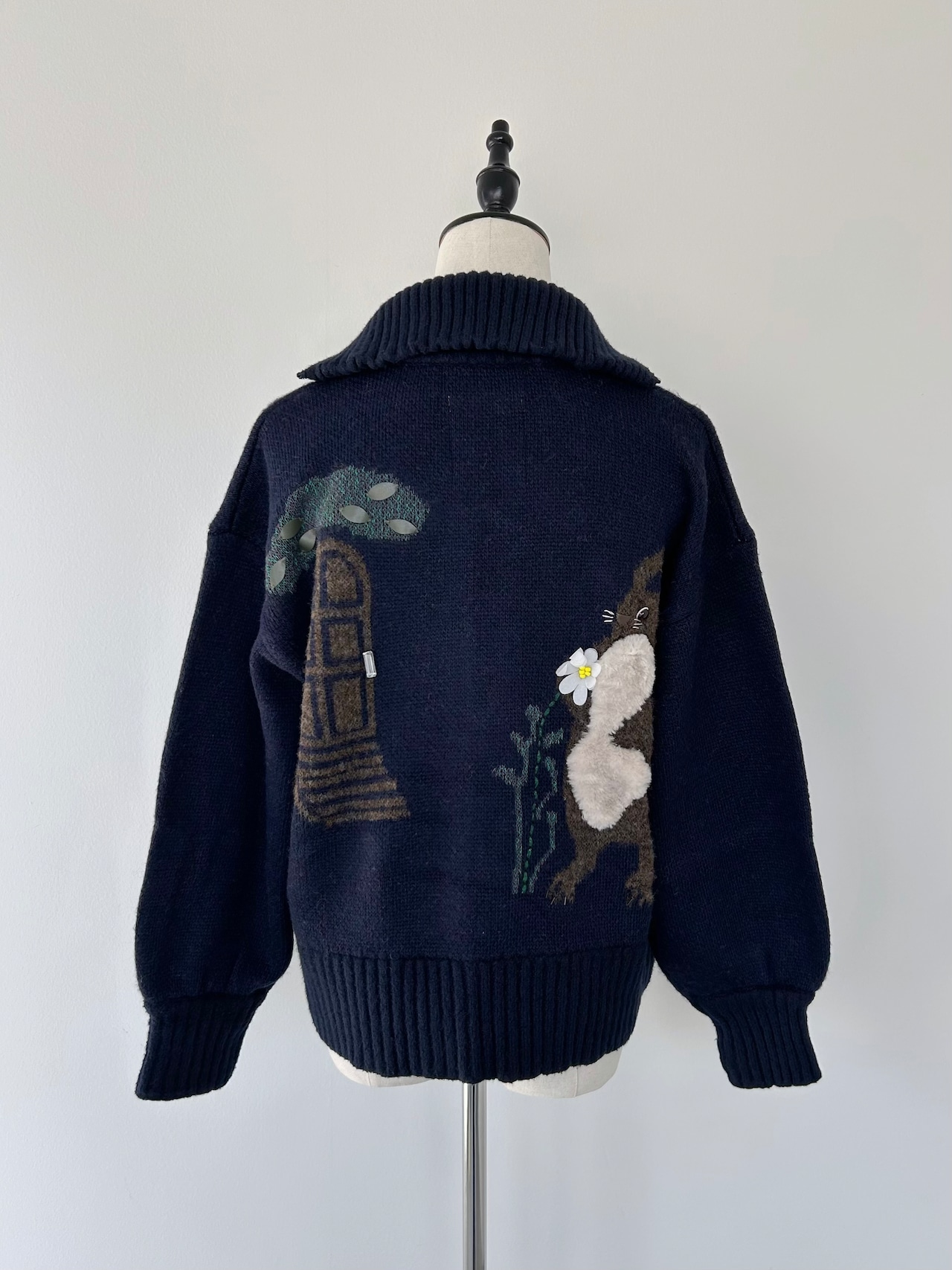 リスとおうちの庭のモチーフをニットで表現したジップカーディガン。