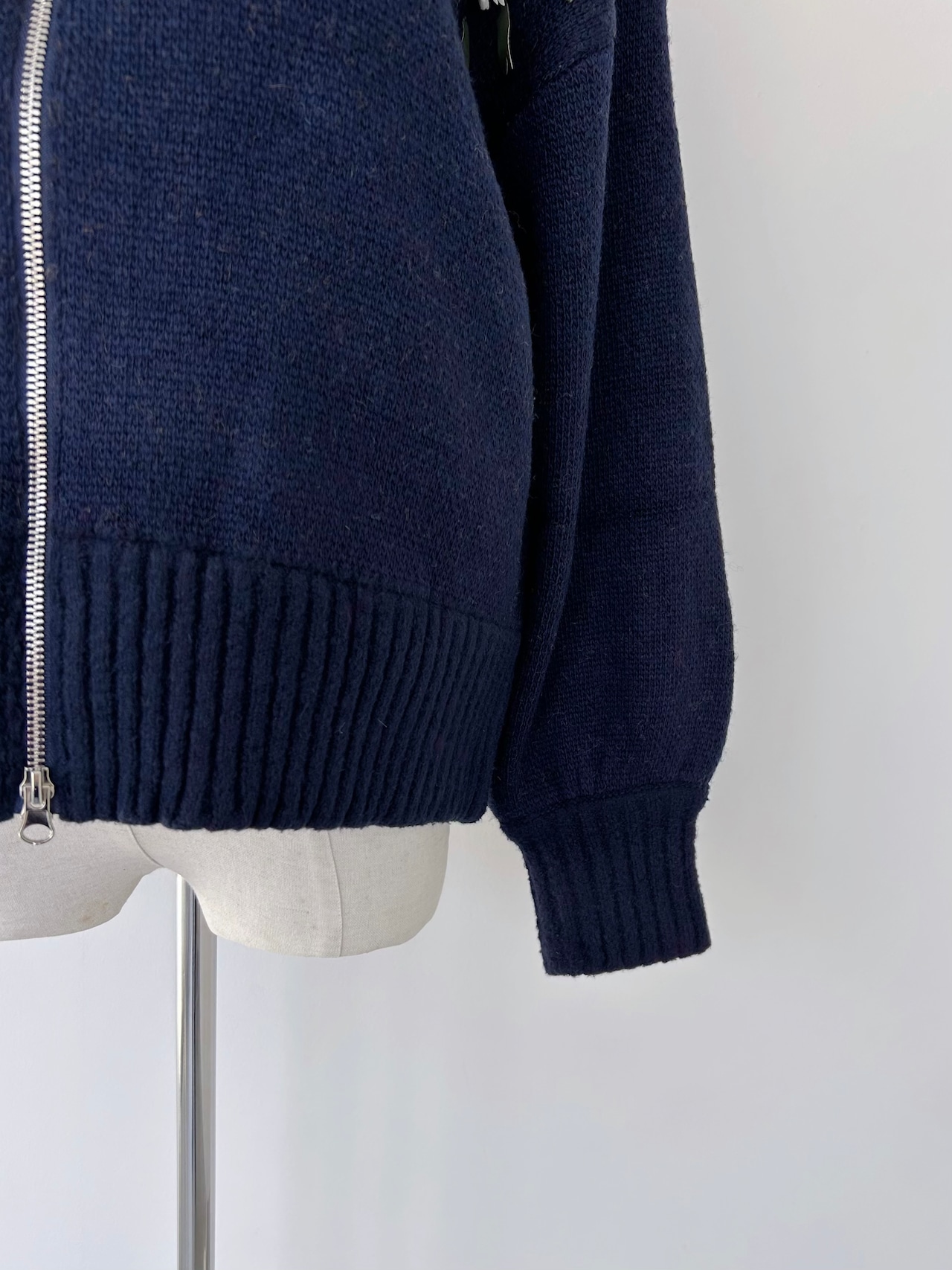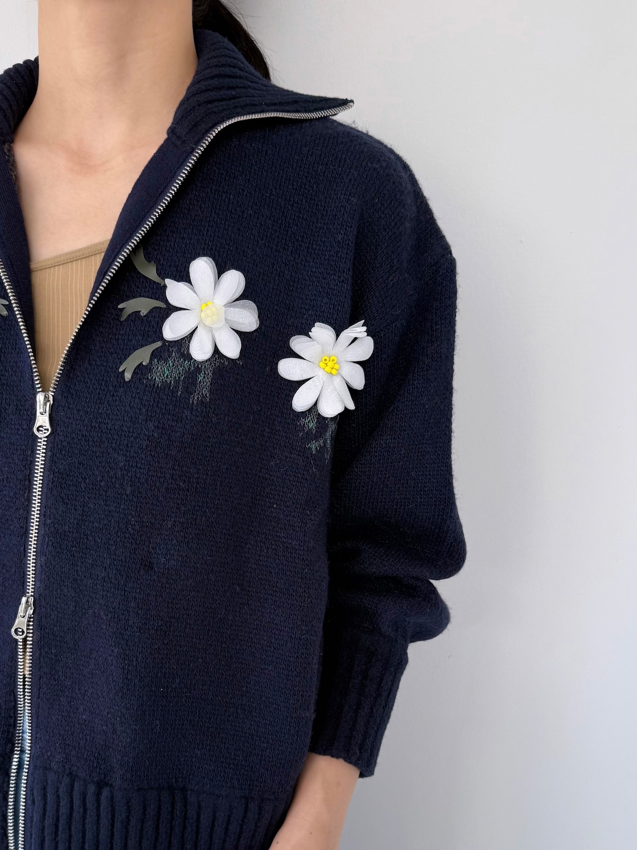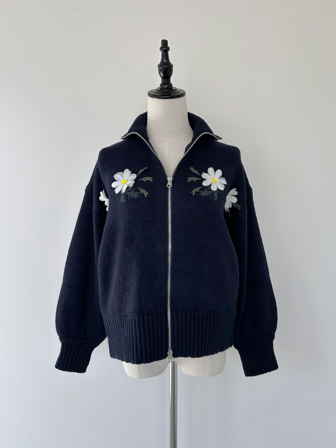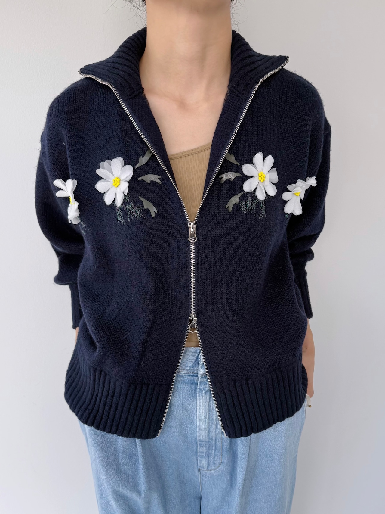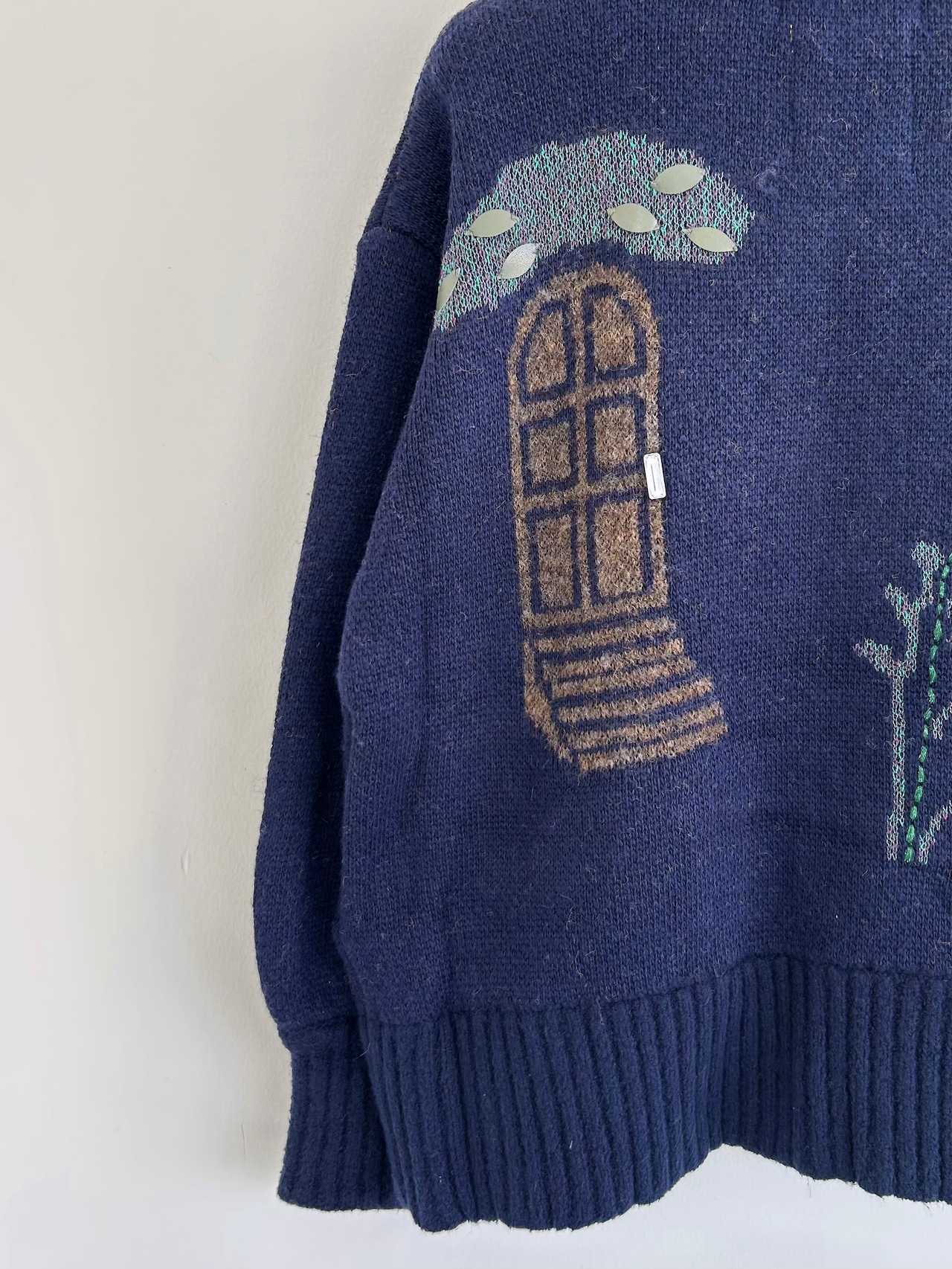 リスとおうちの庭のモチーフをニットで表現したジップカーディガン。