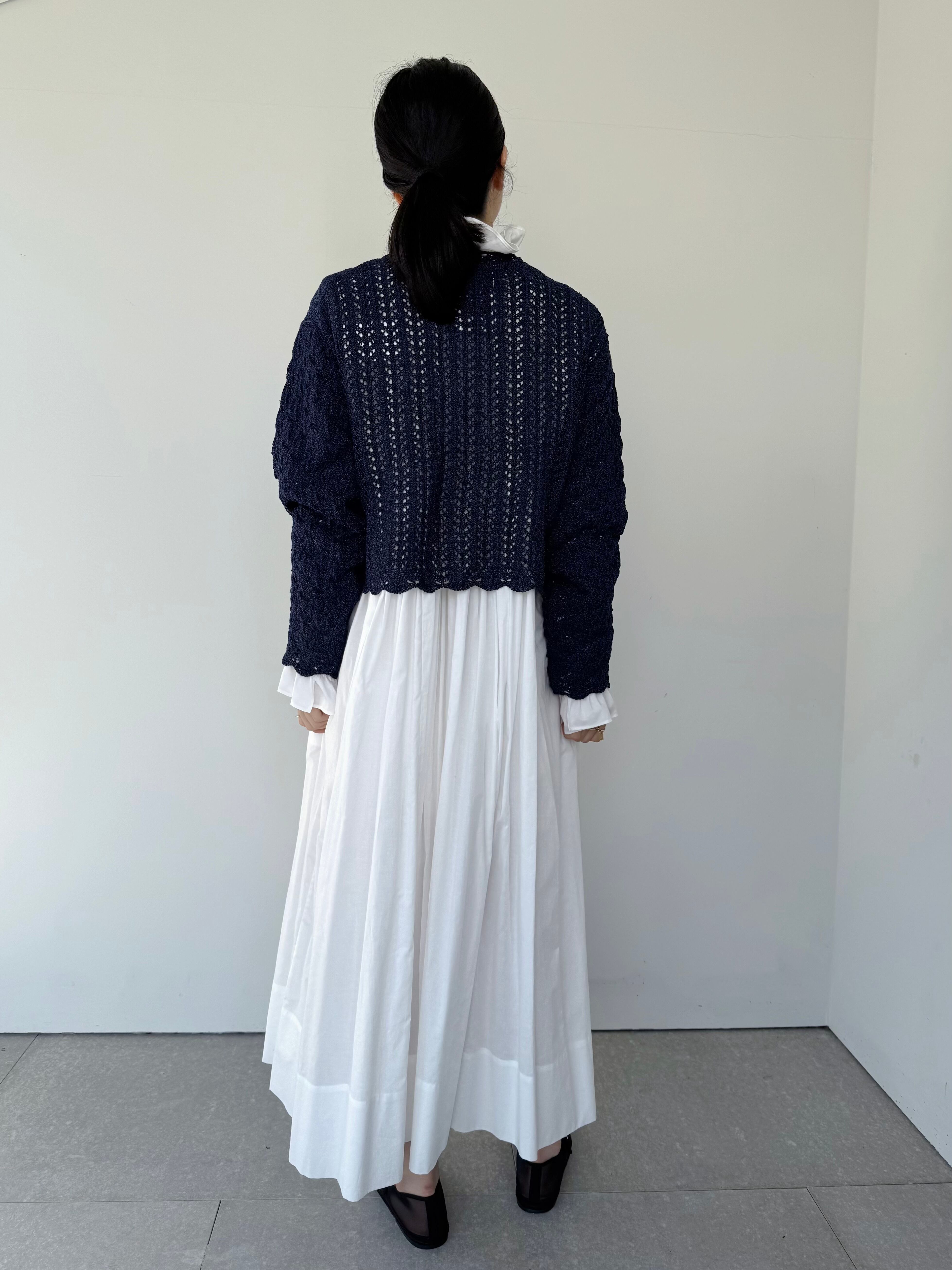 レース編みでビスコースとペーパ―を使用したドライタッチなハリのある糸を使用しているので、網目が立って表情豊かに仕上げました。