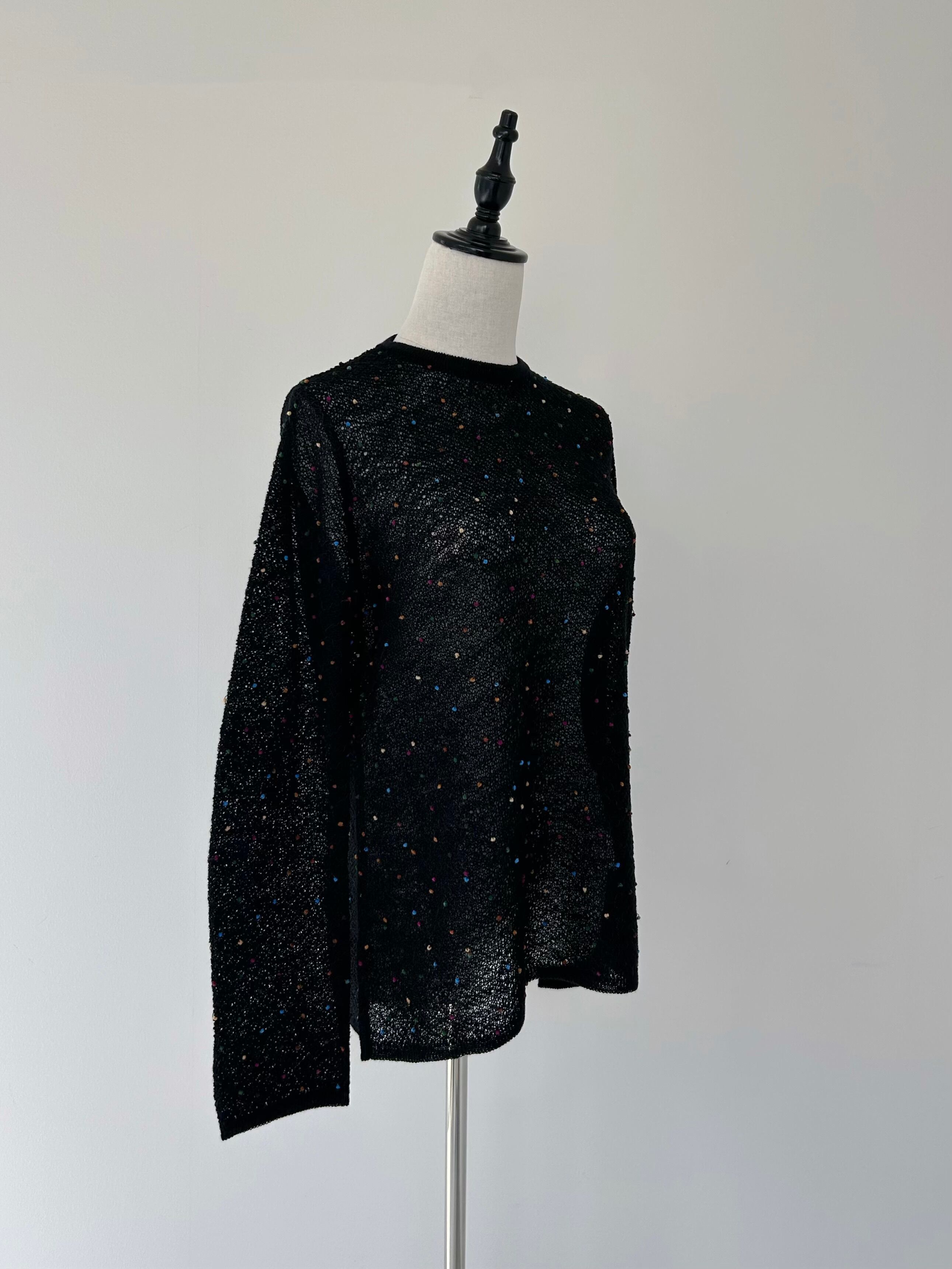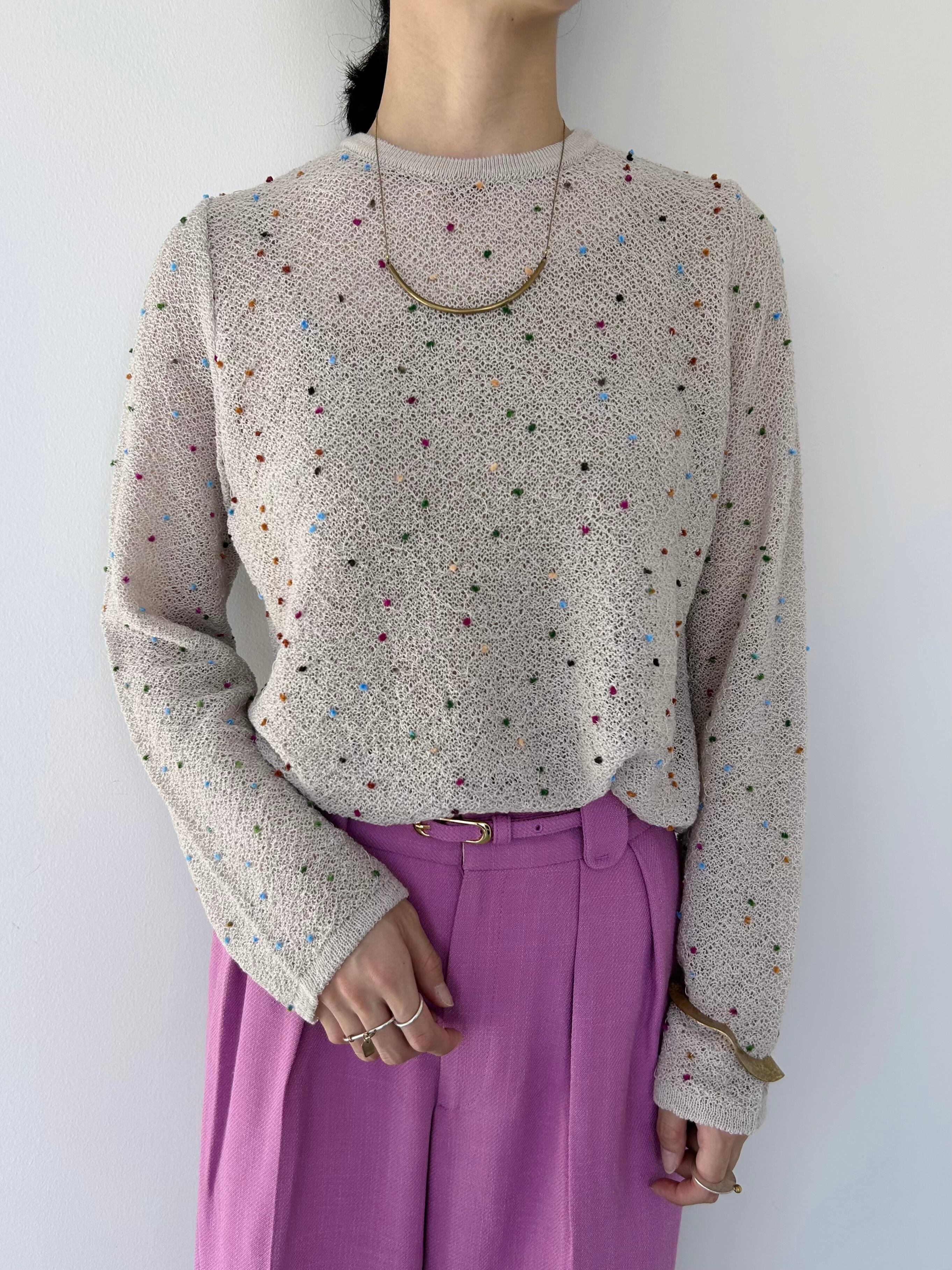 マルチカラーのファンシーヤーン(意匠糸)を編み込んだニットトップ。