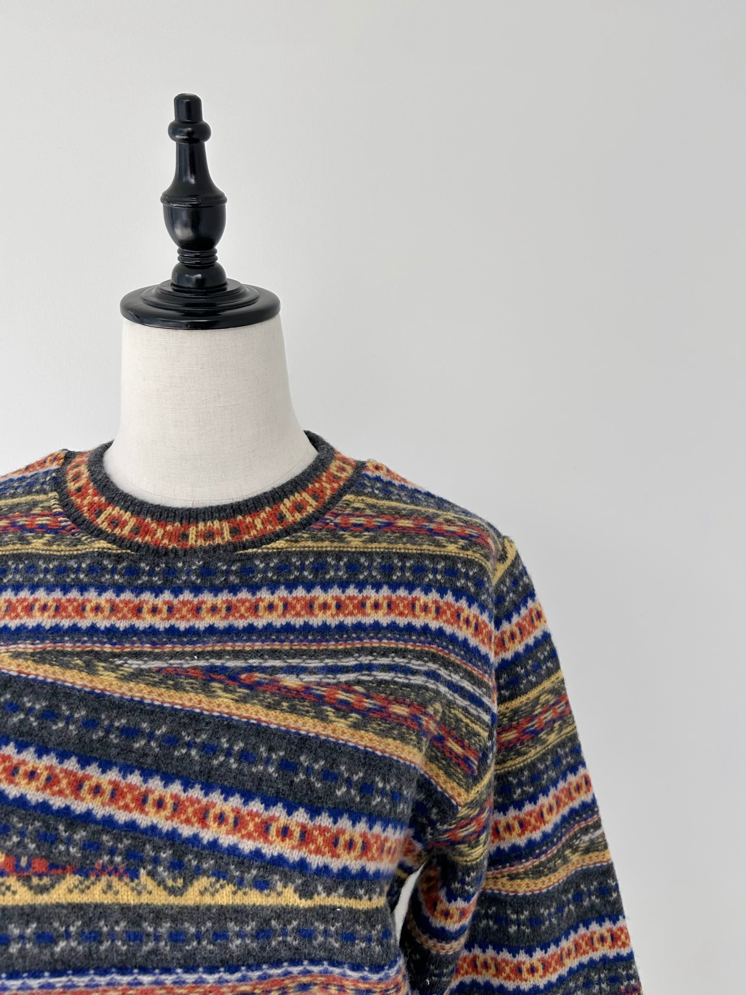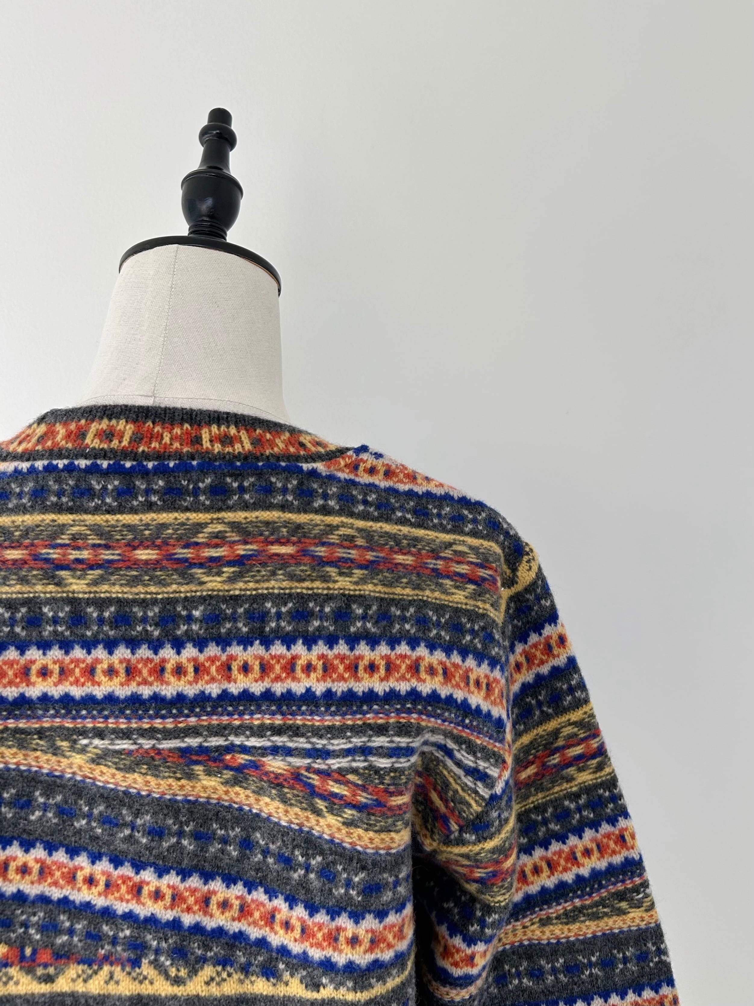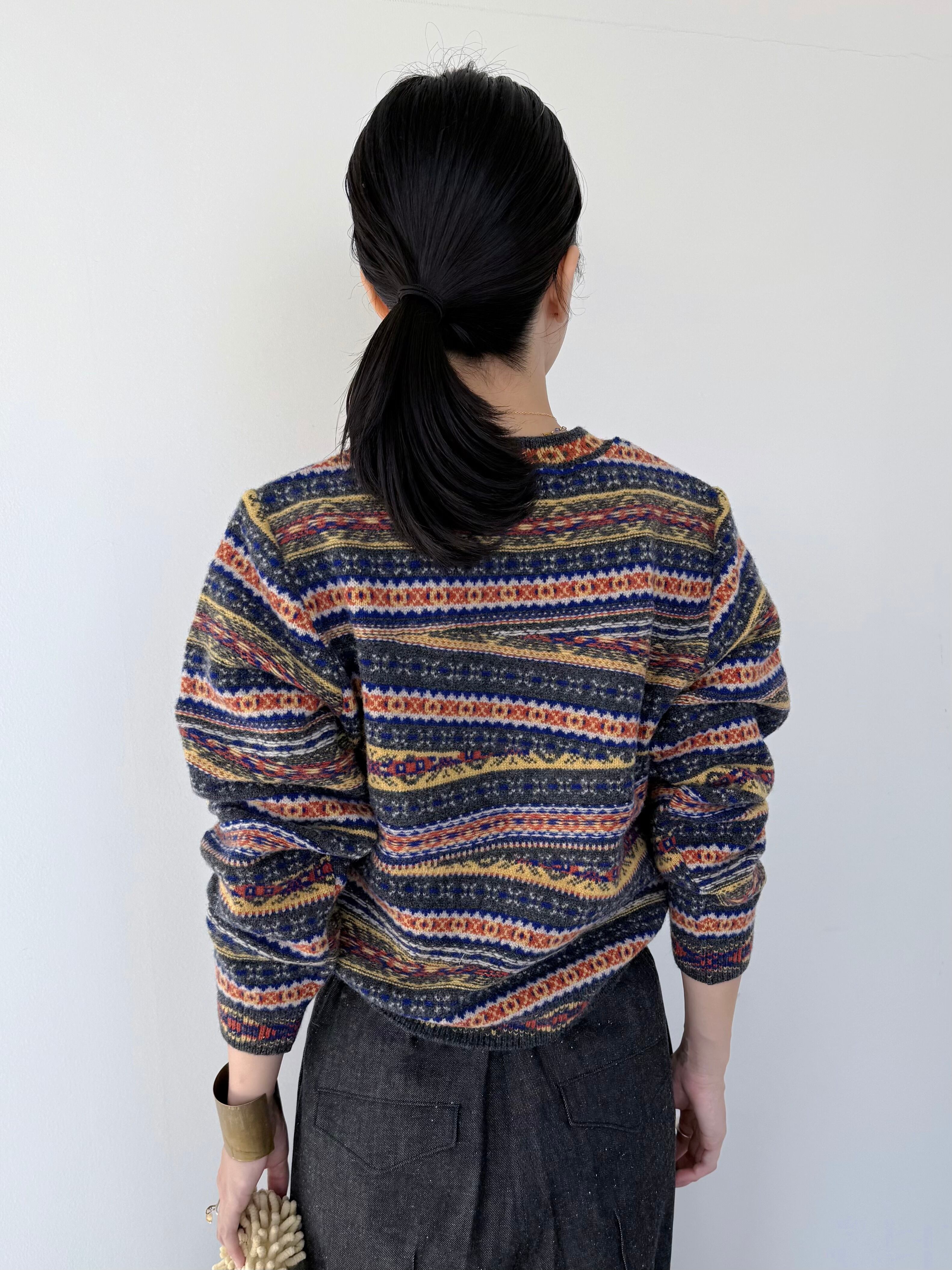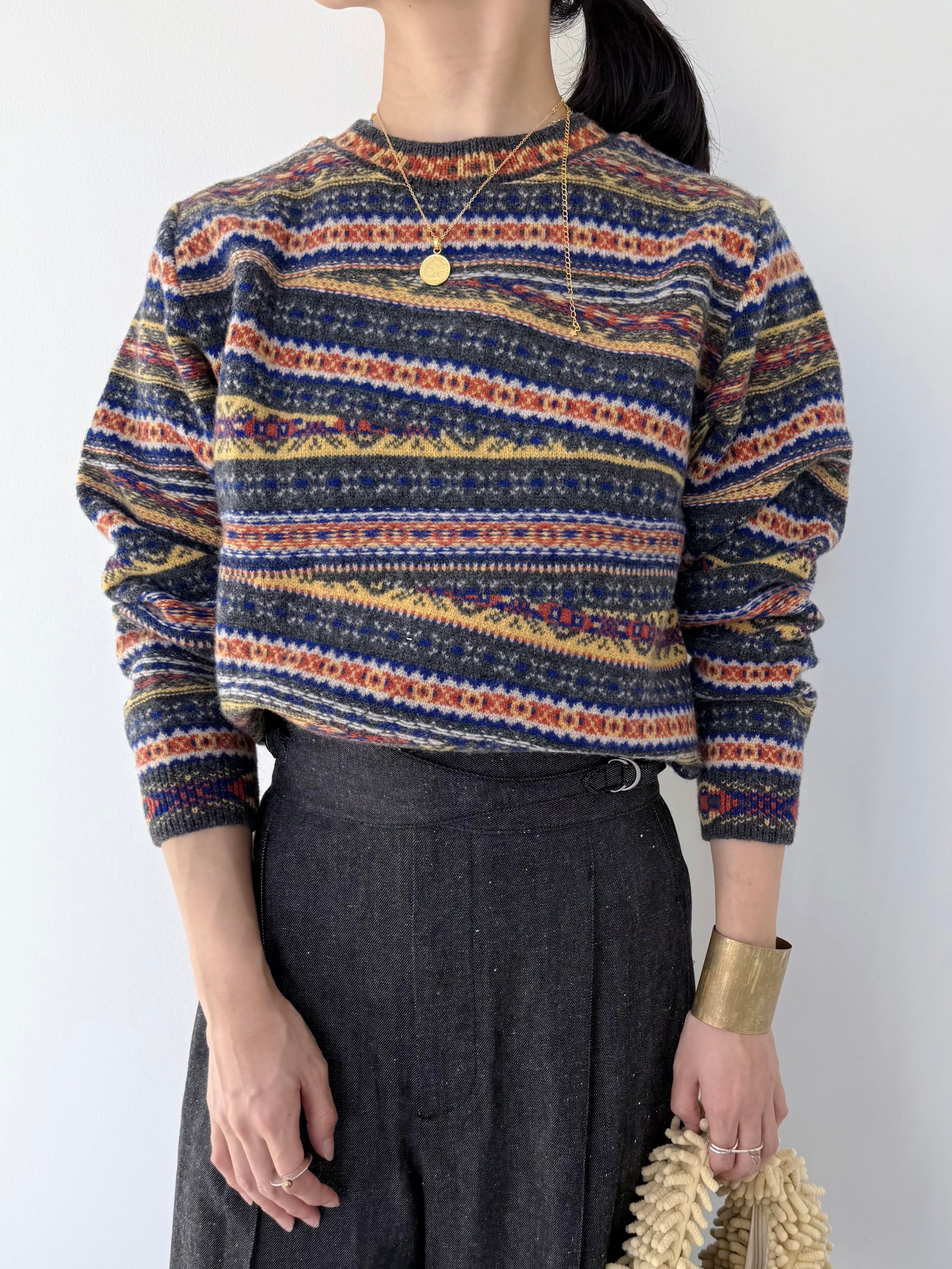 トラディショナルなフェアアイル柄をあえて歪ませたミドルゲージセーター。