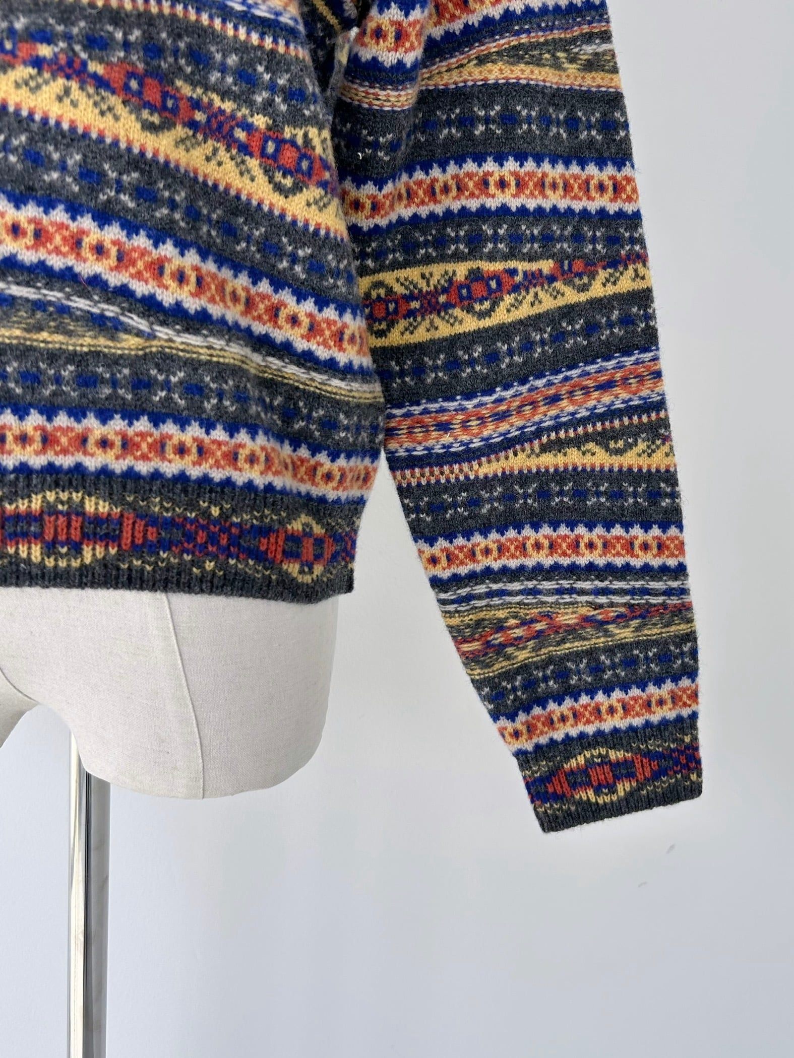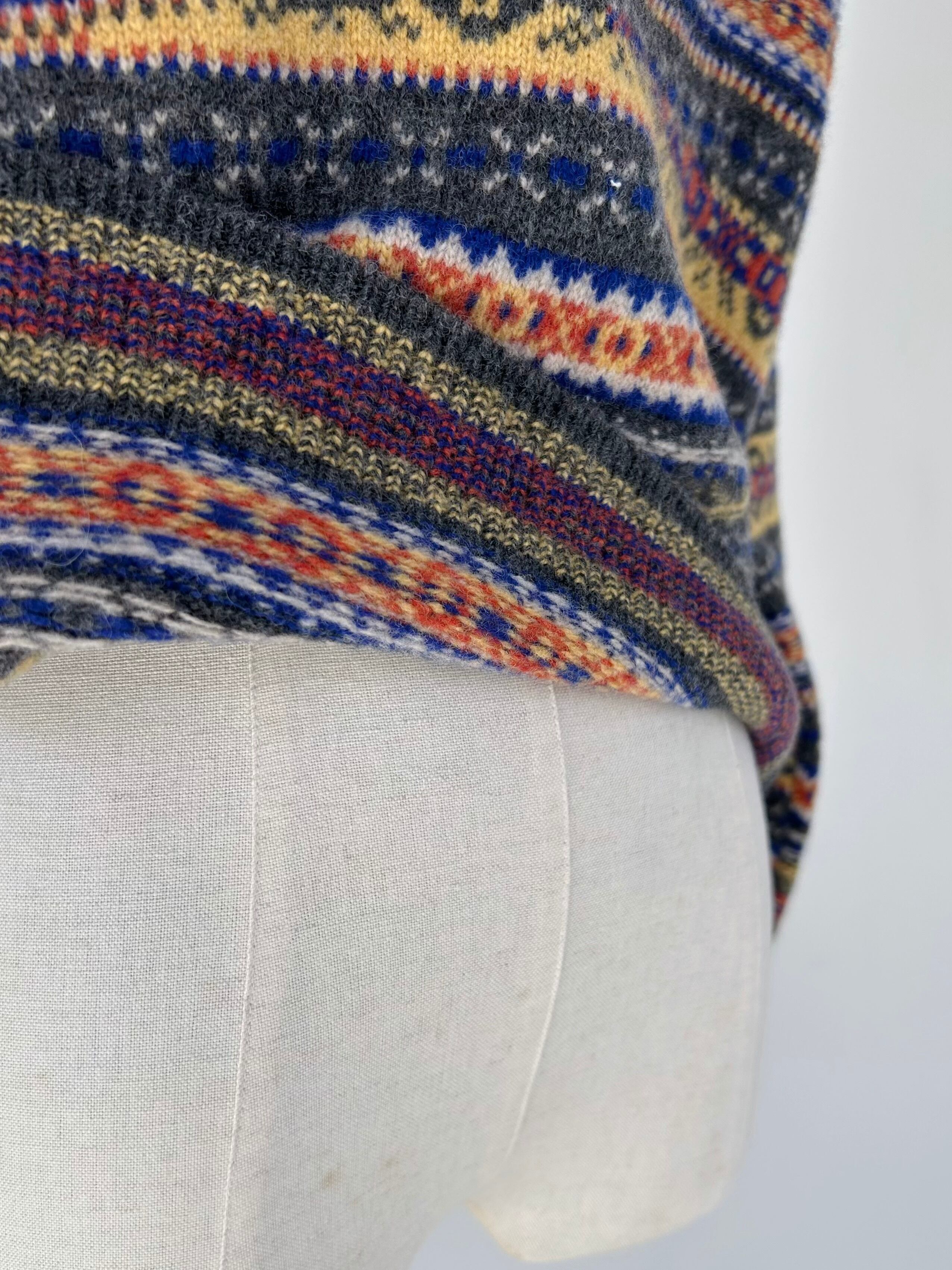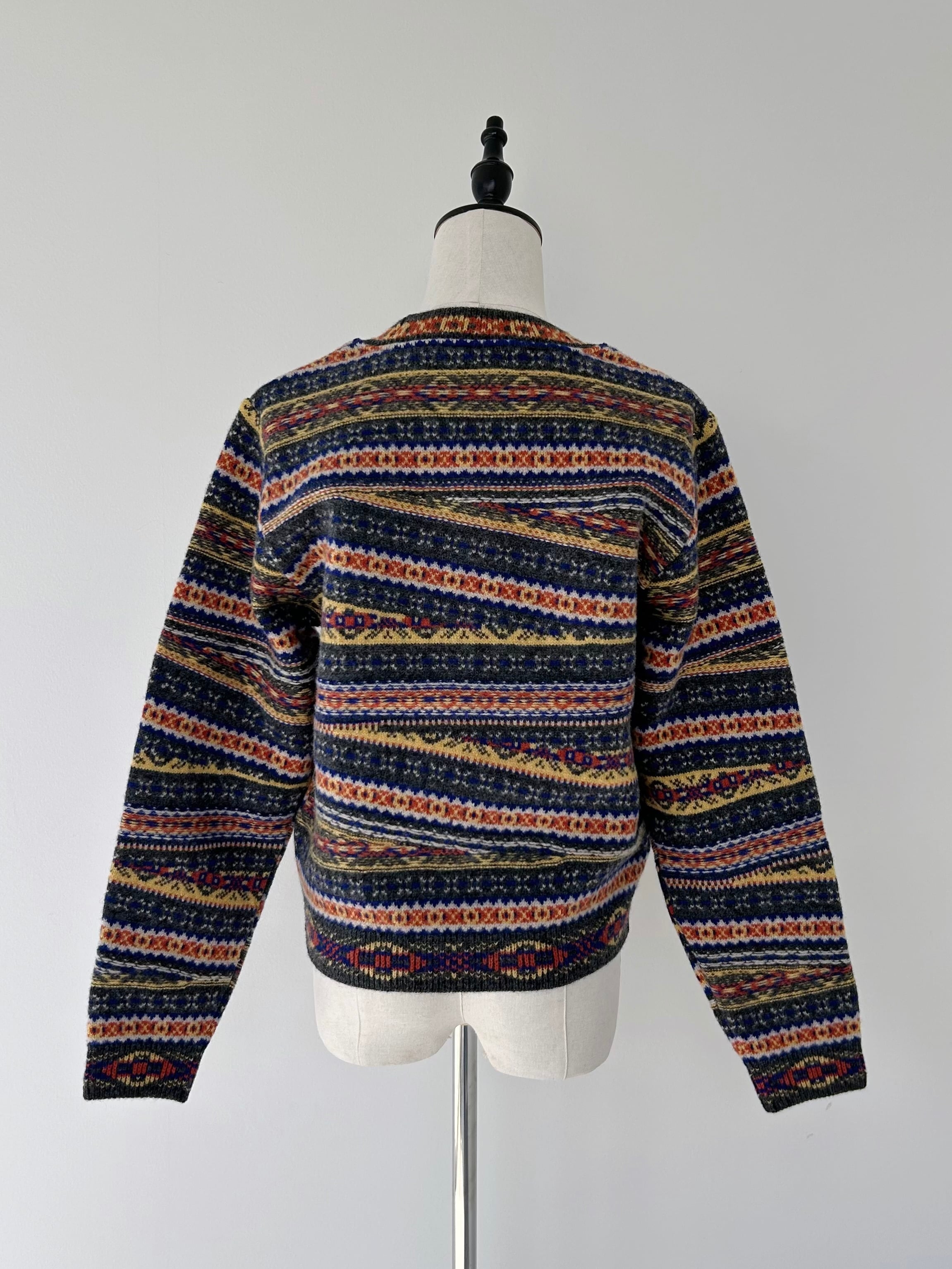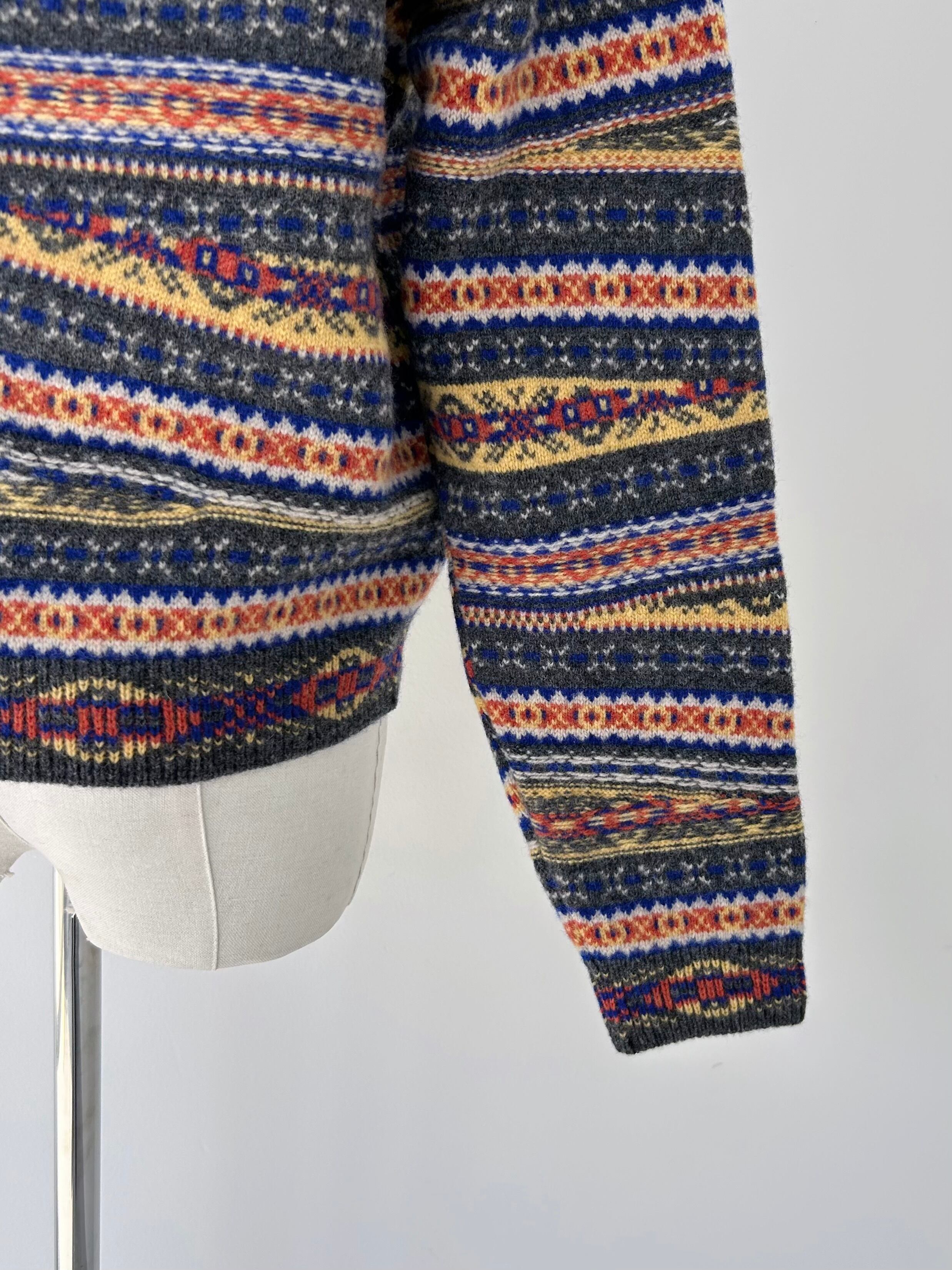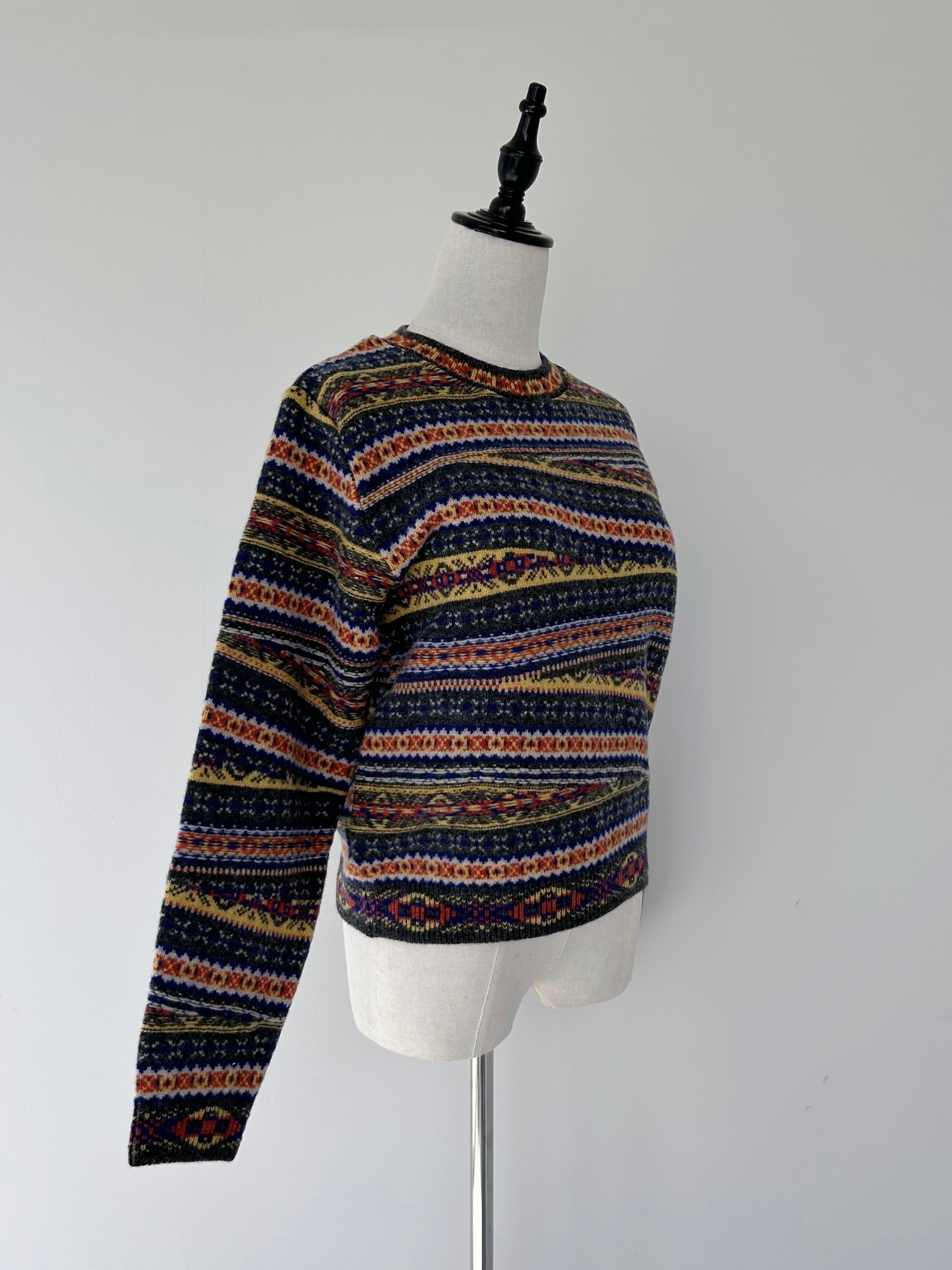 トラディショナルなフェアアイル柄をあえて歪ませたミドルゲージセーター。
