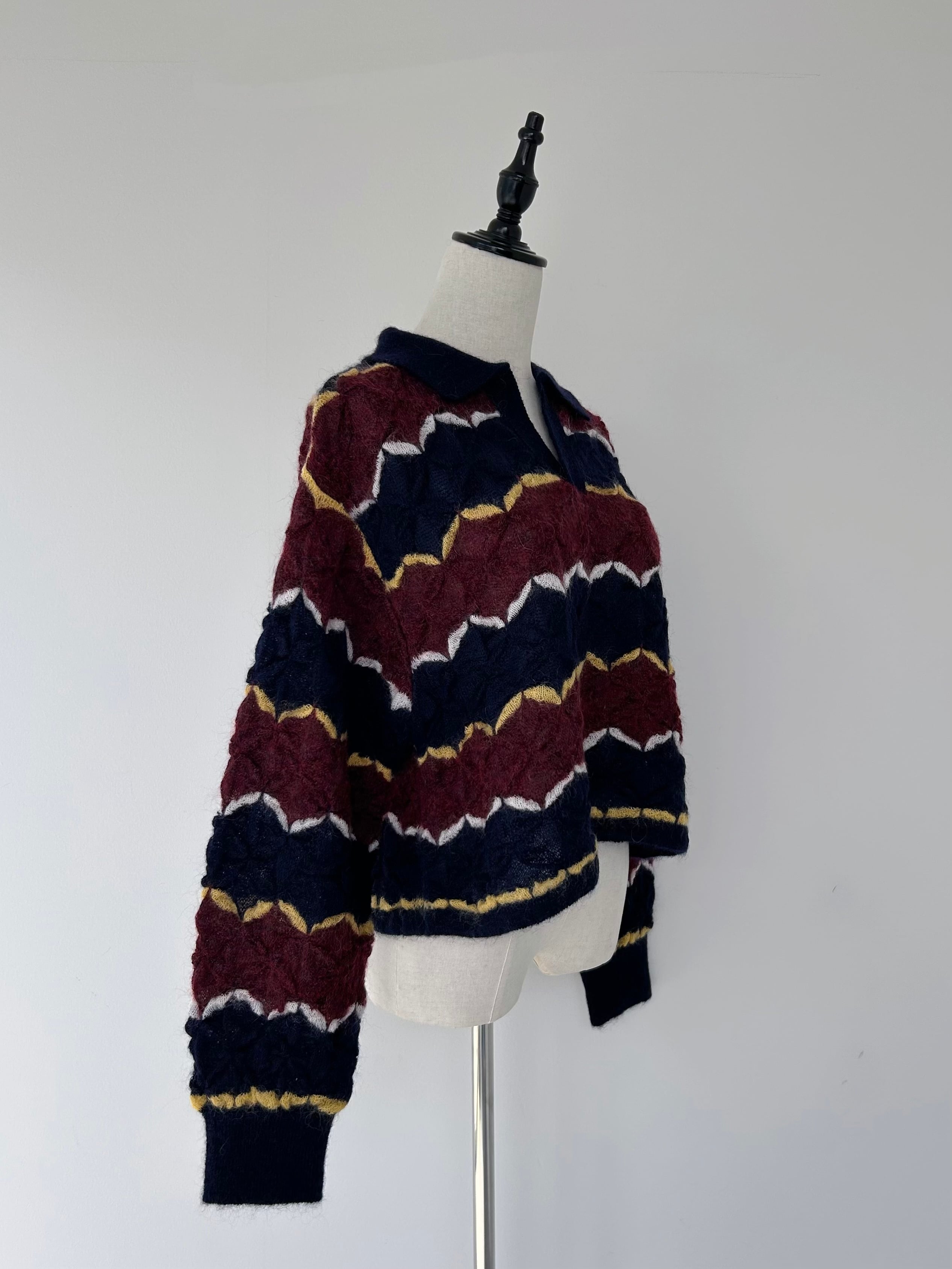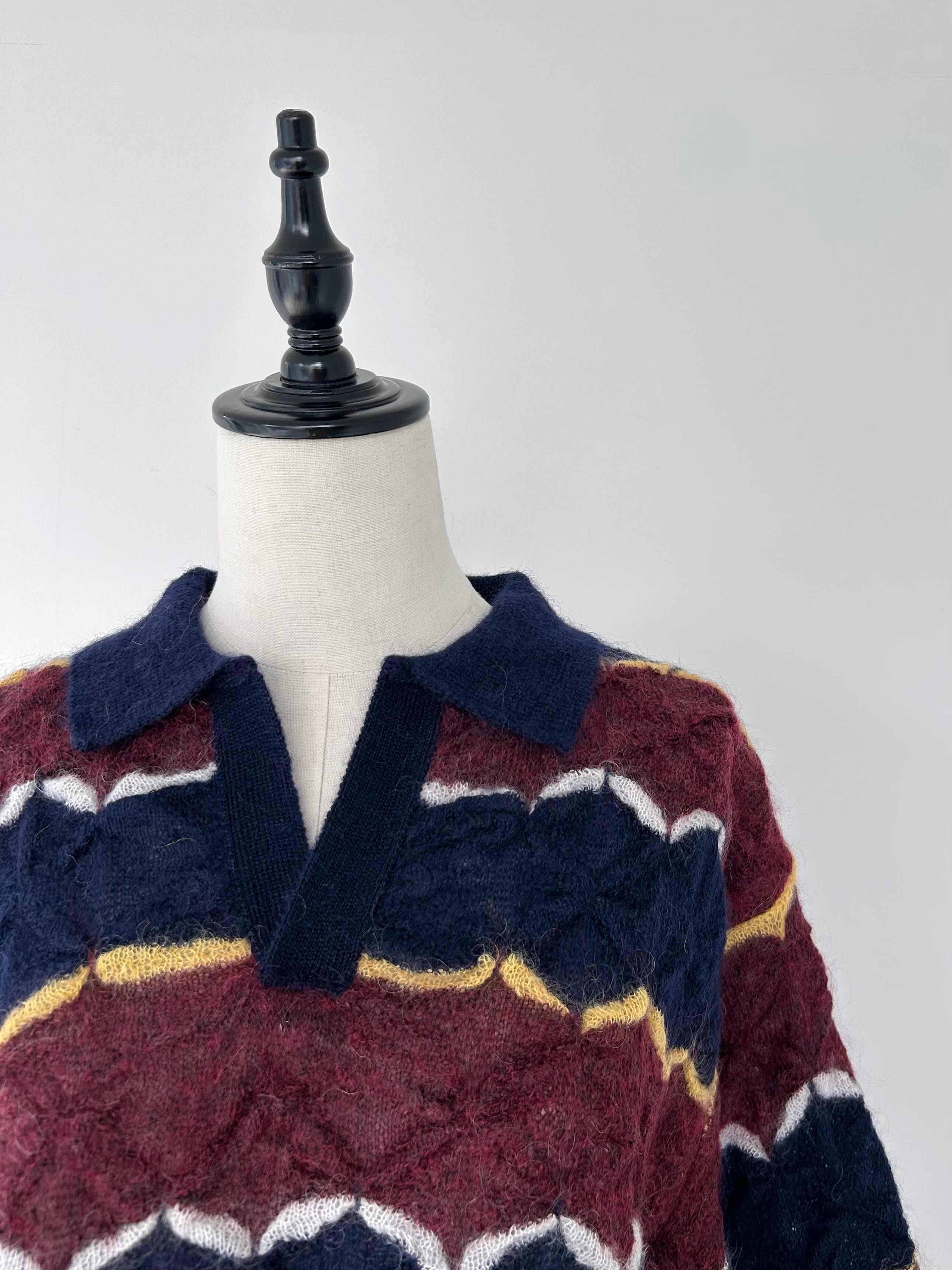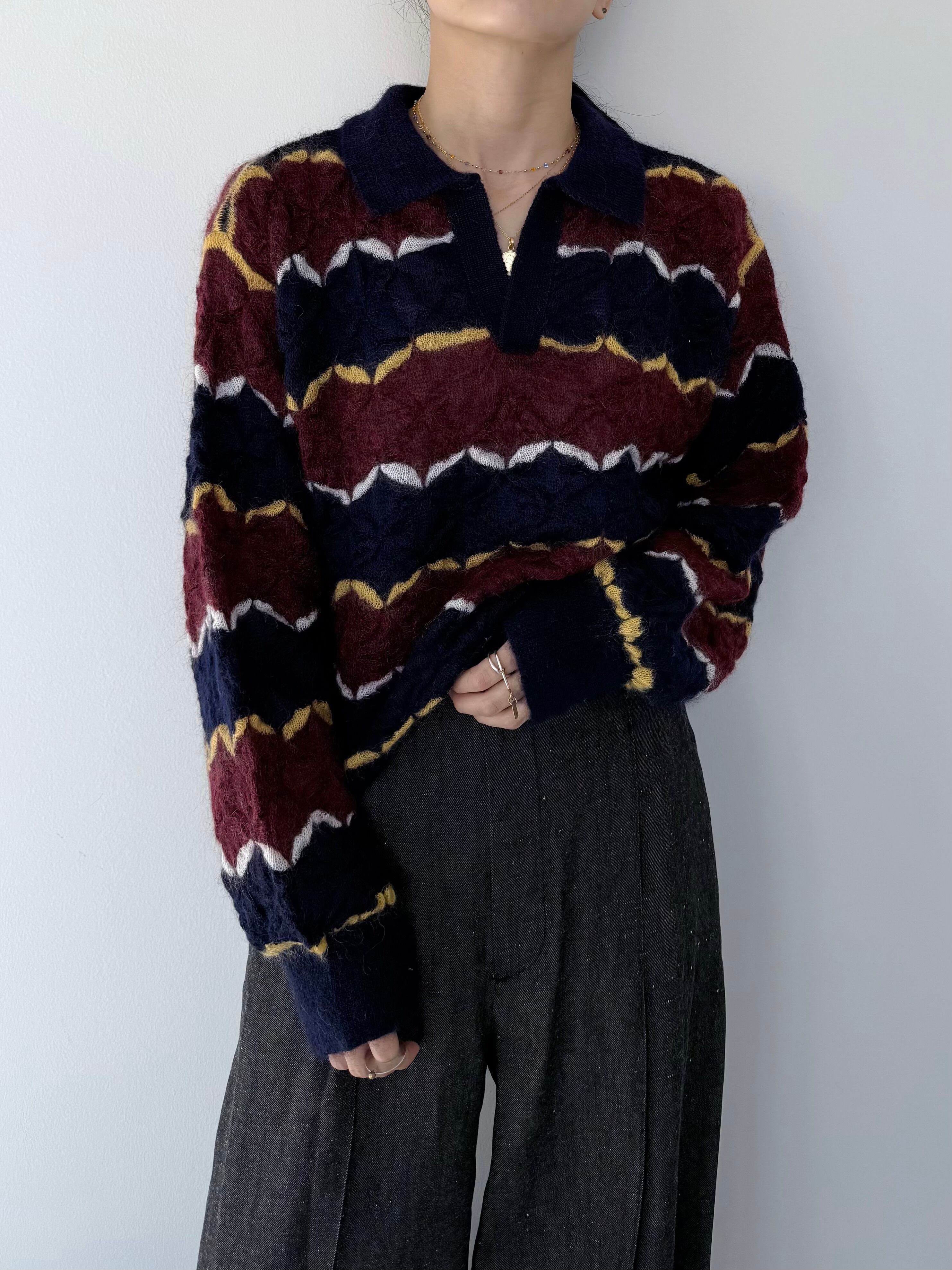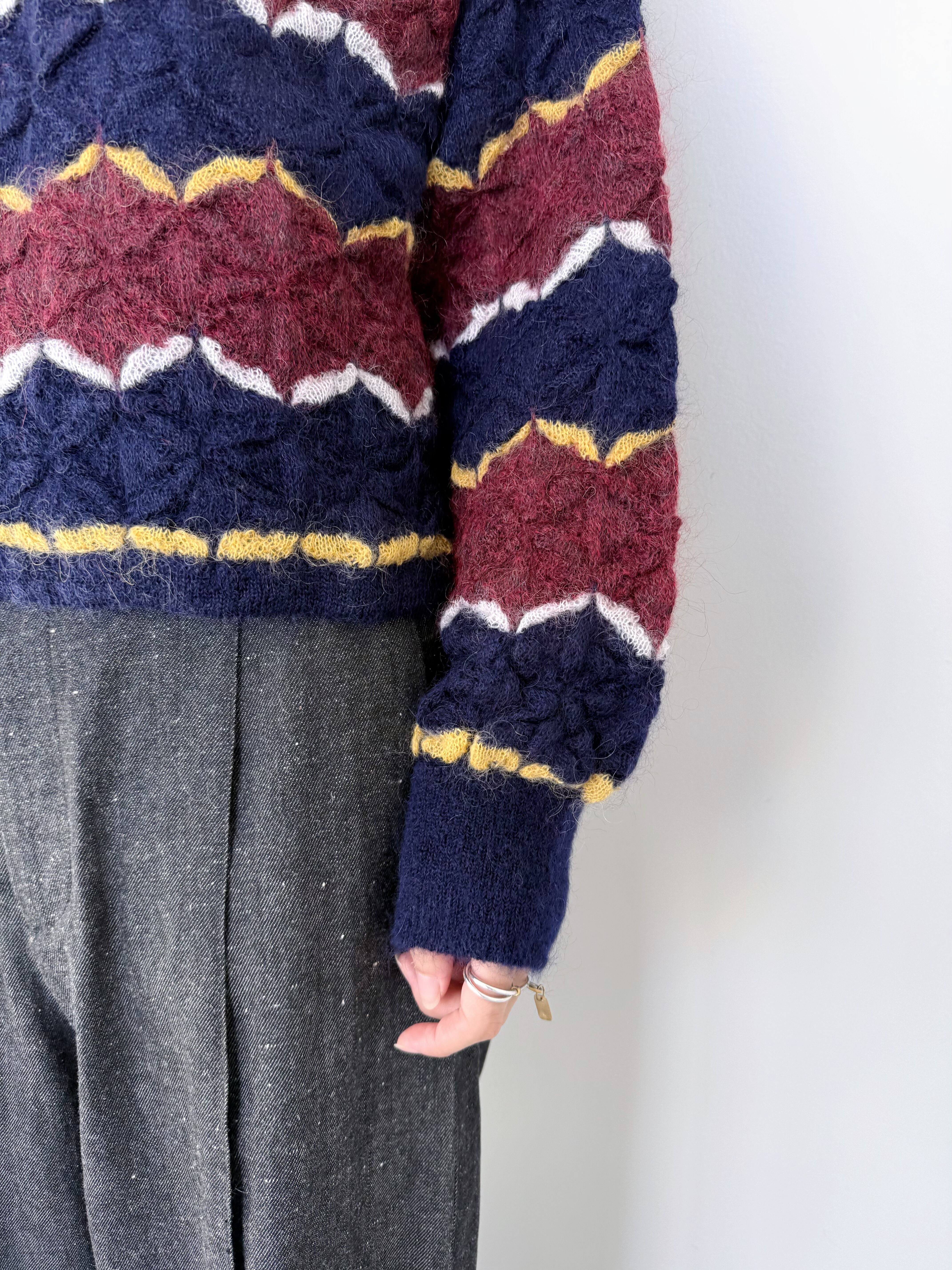 折り紙や木工細工を彷彿とさせる幾何学的・立体的な編み方が特徴で軽く・薄く仕上げたモヘアセーター。