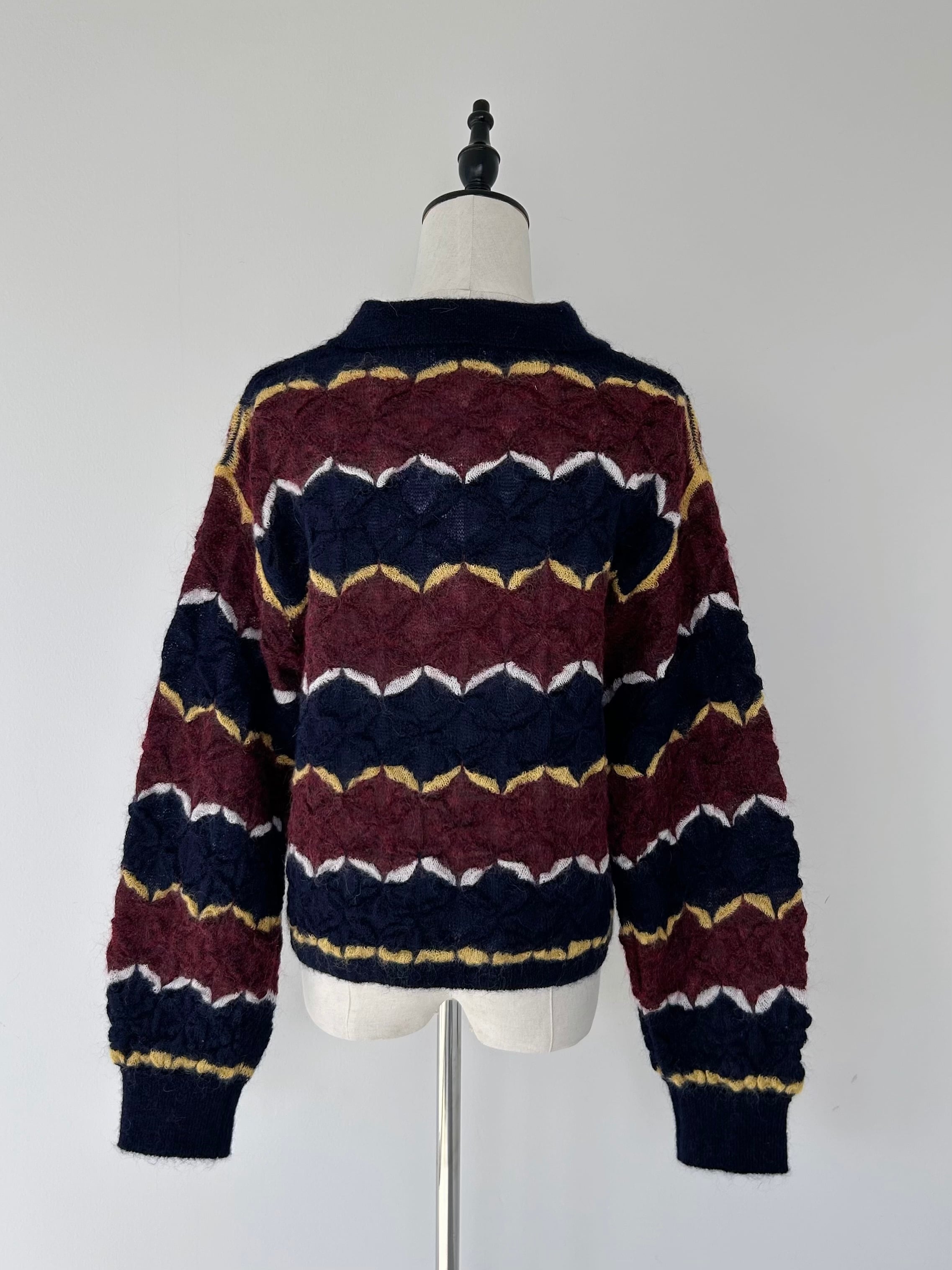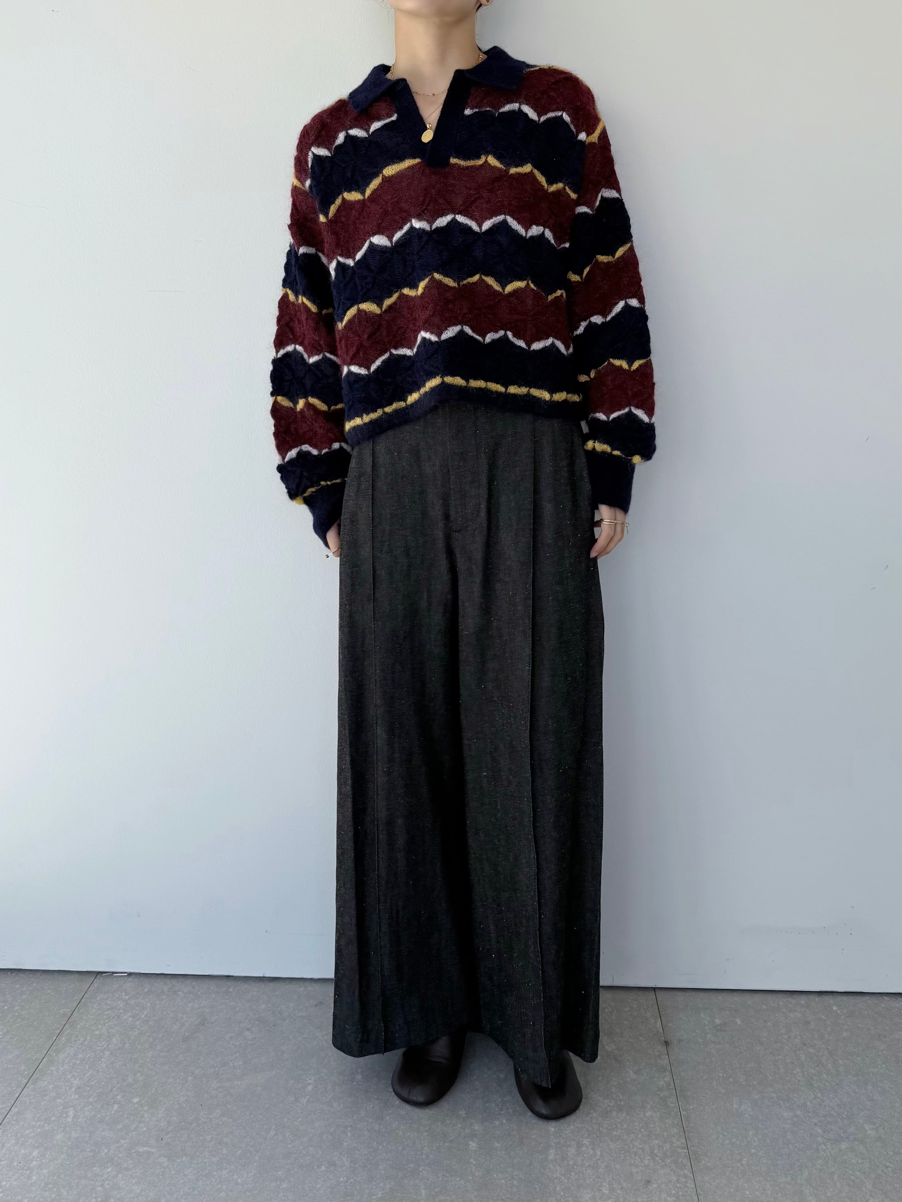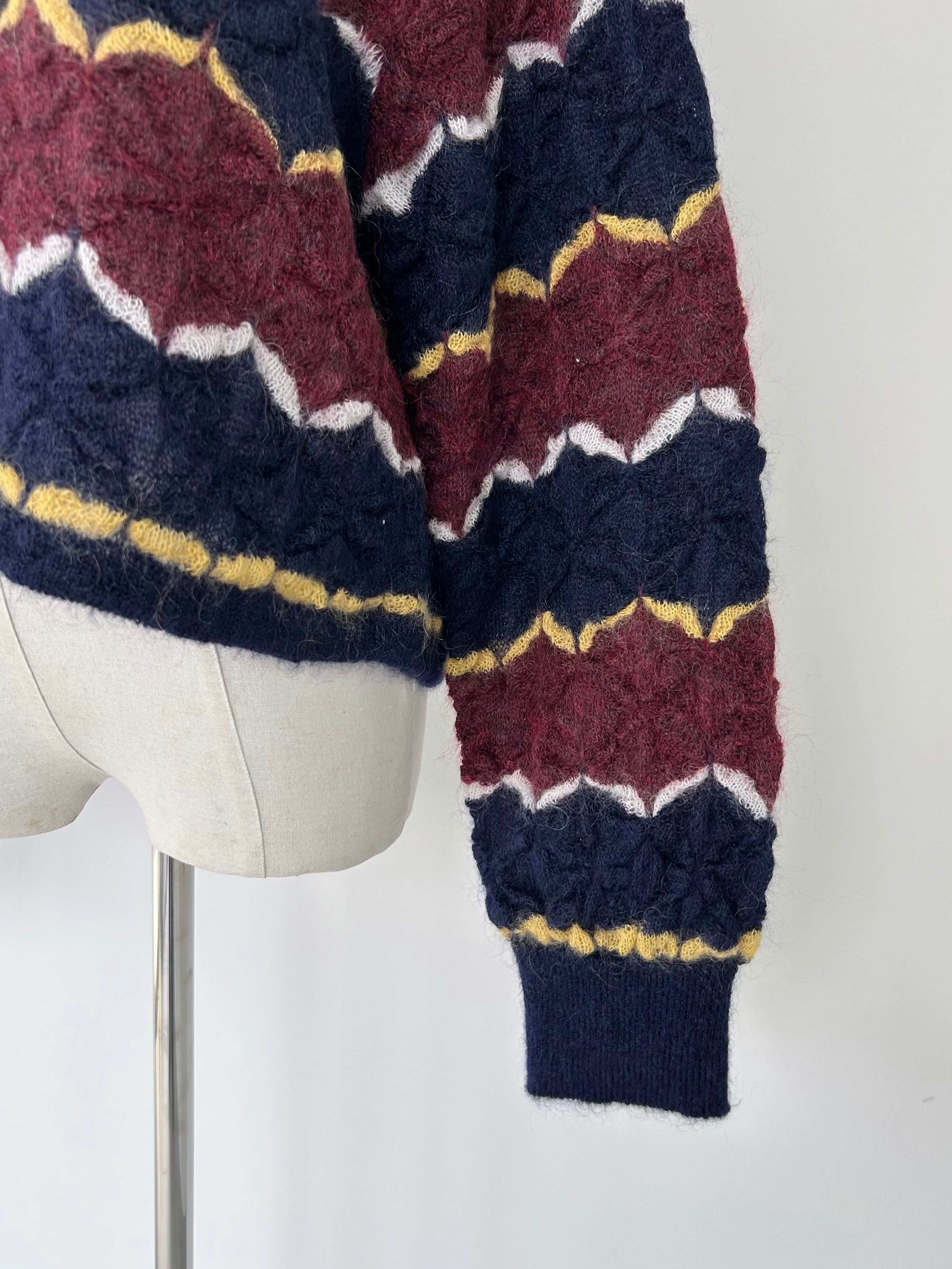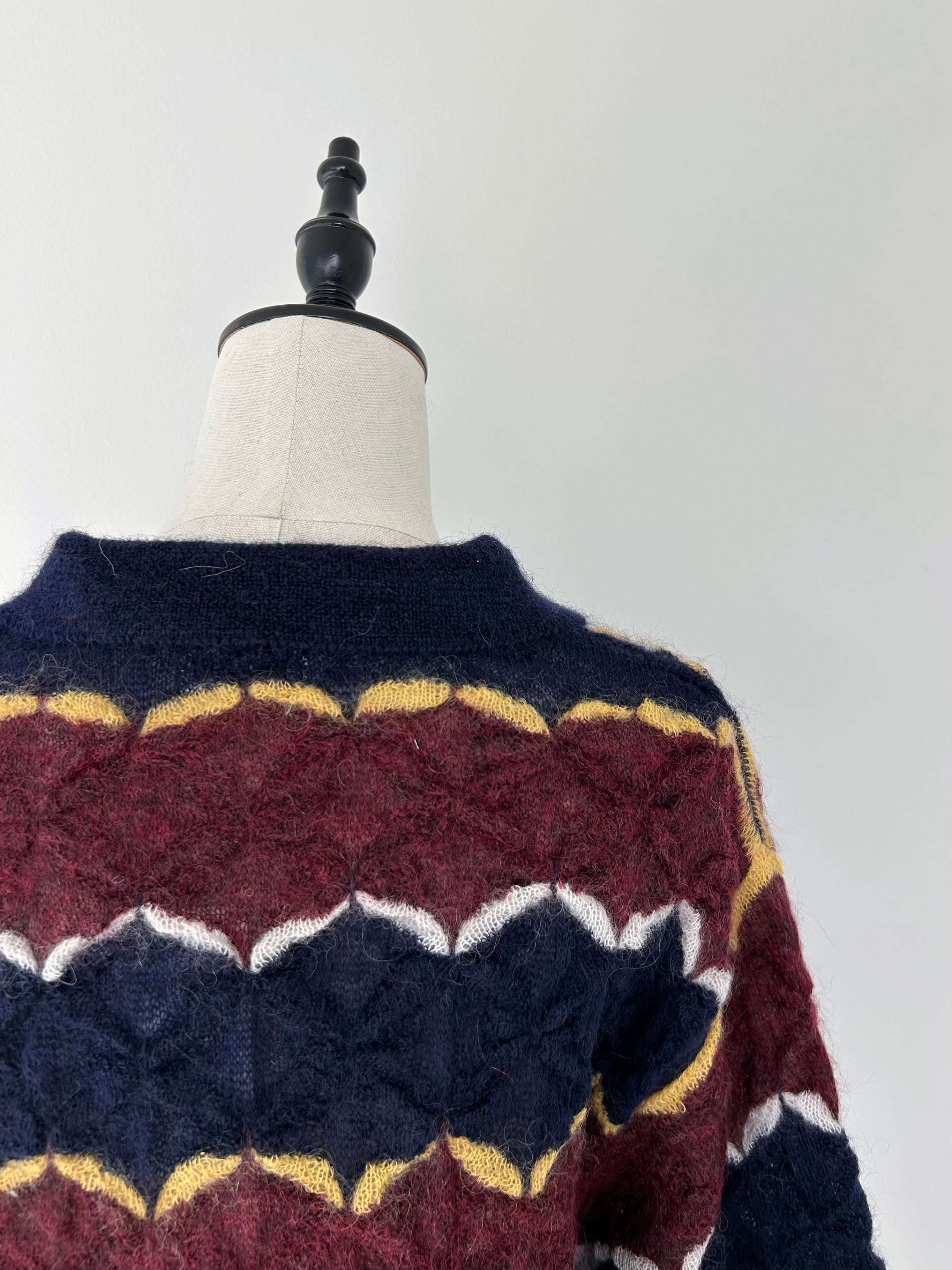 折り紙や木工細工を彷彿とさせる幾何学的・立体的な編み方が特徴で軽く・薄く仕上げたモヘアセーター。