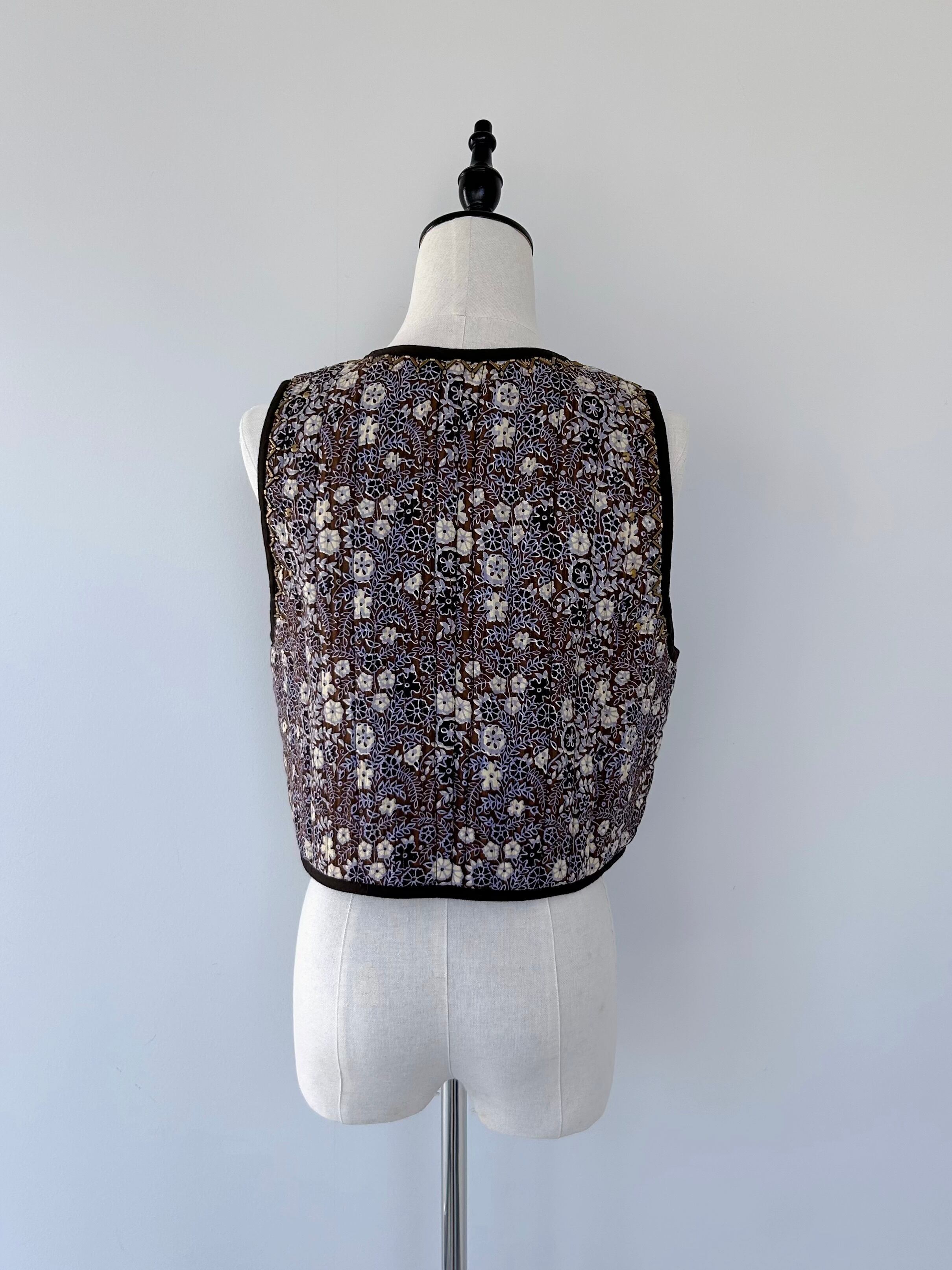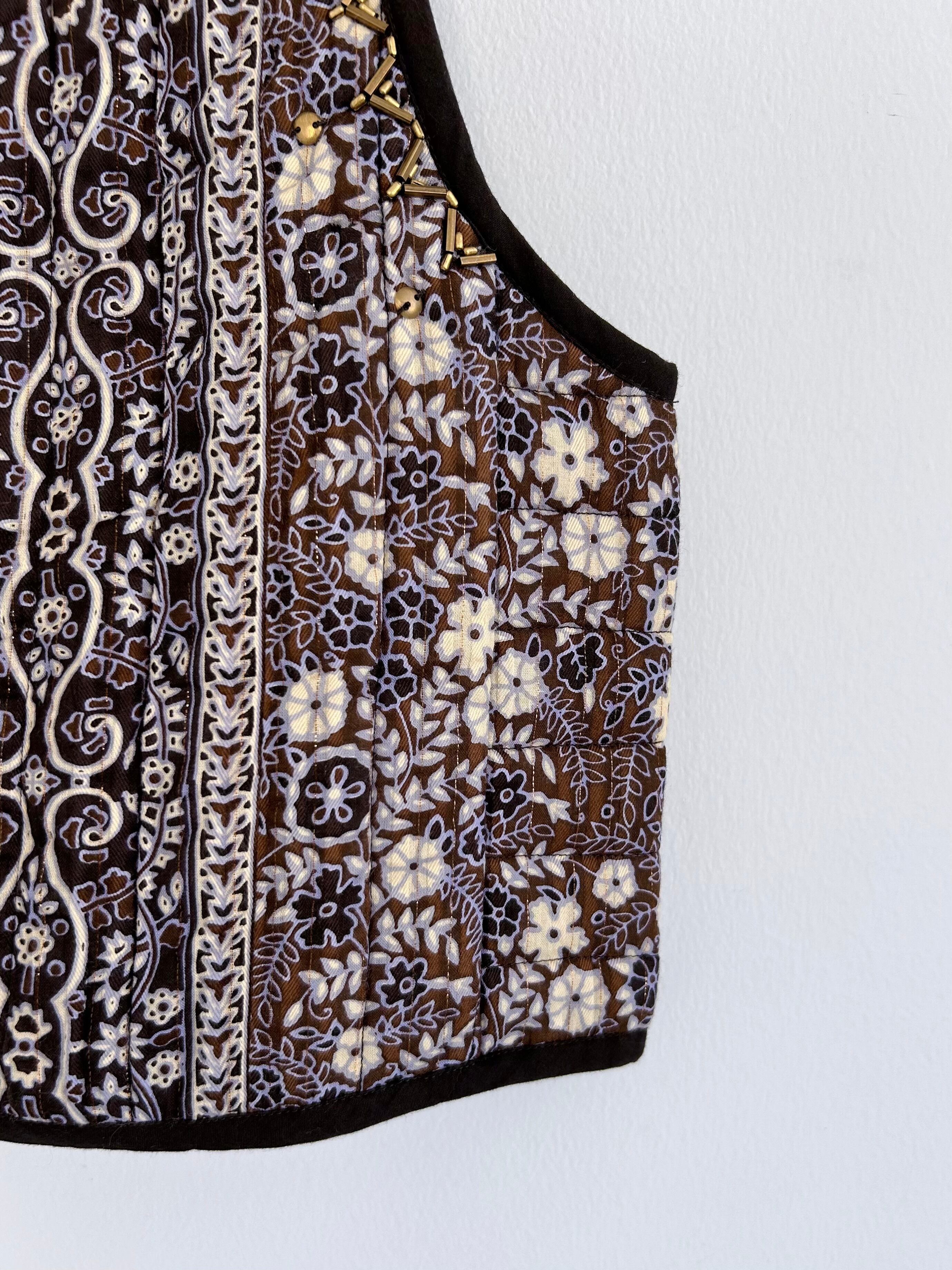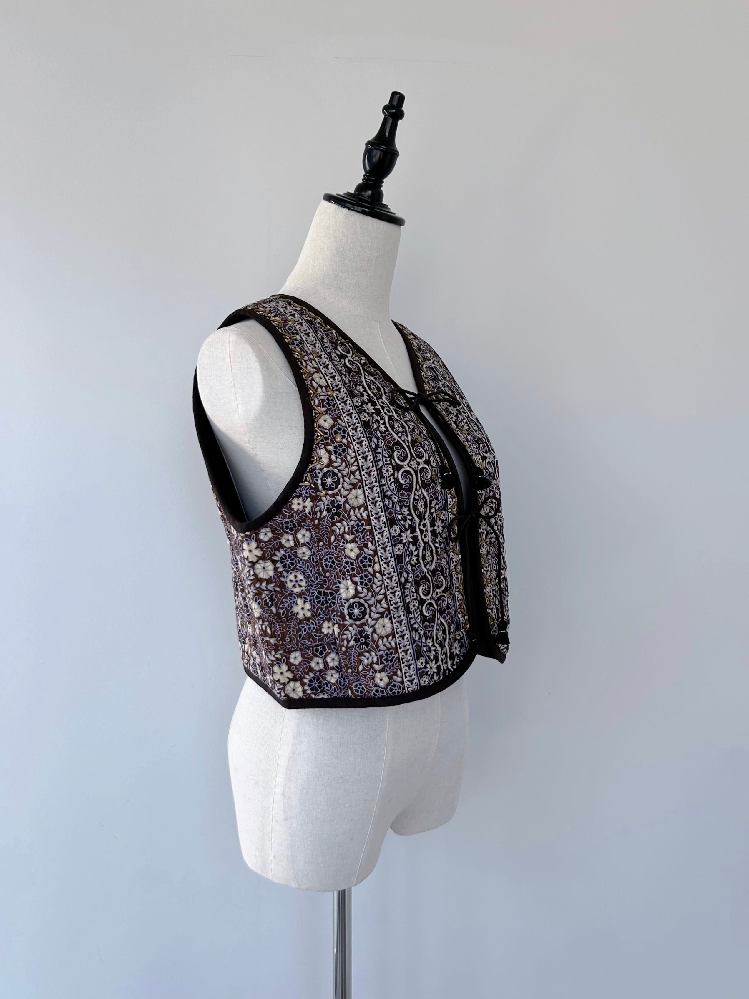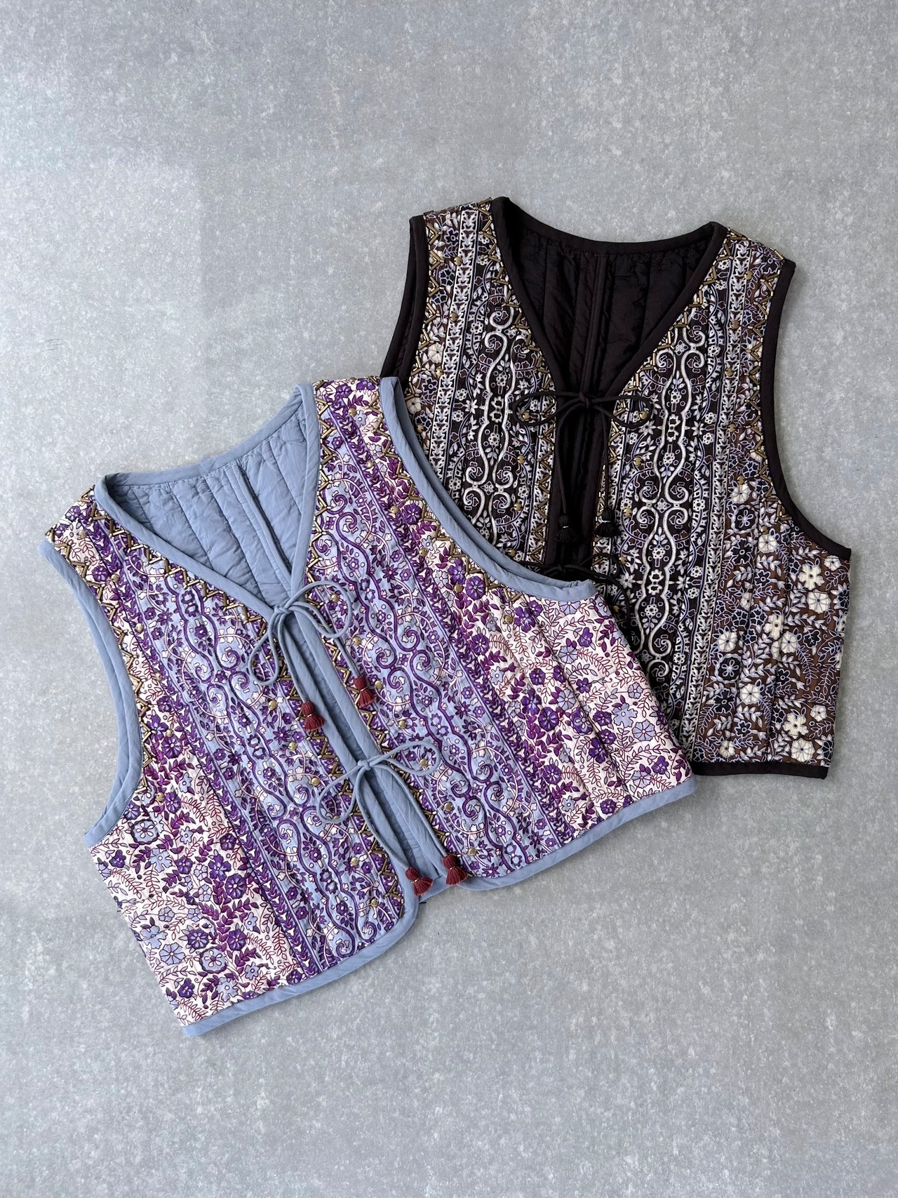 オリジナルモチーフをプリントしたテキスタイルにラメ糸がさりげなく光るキルティングベスト。