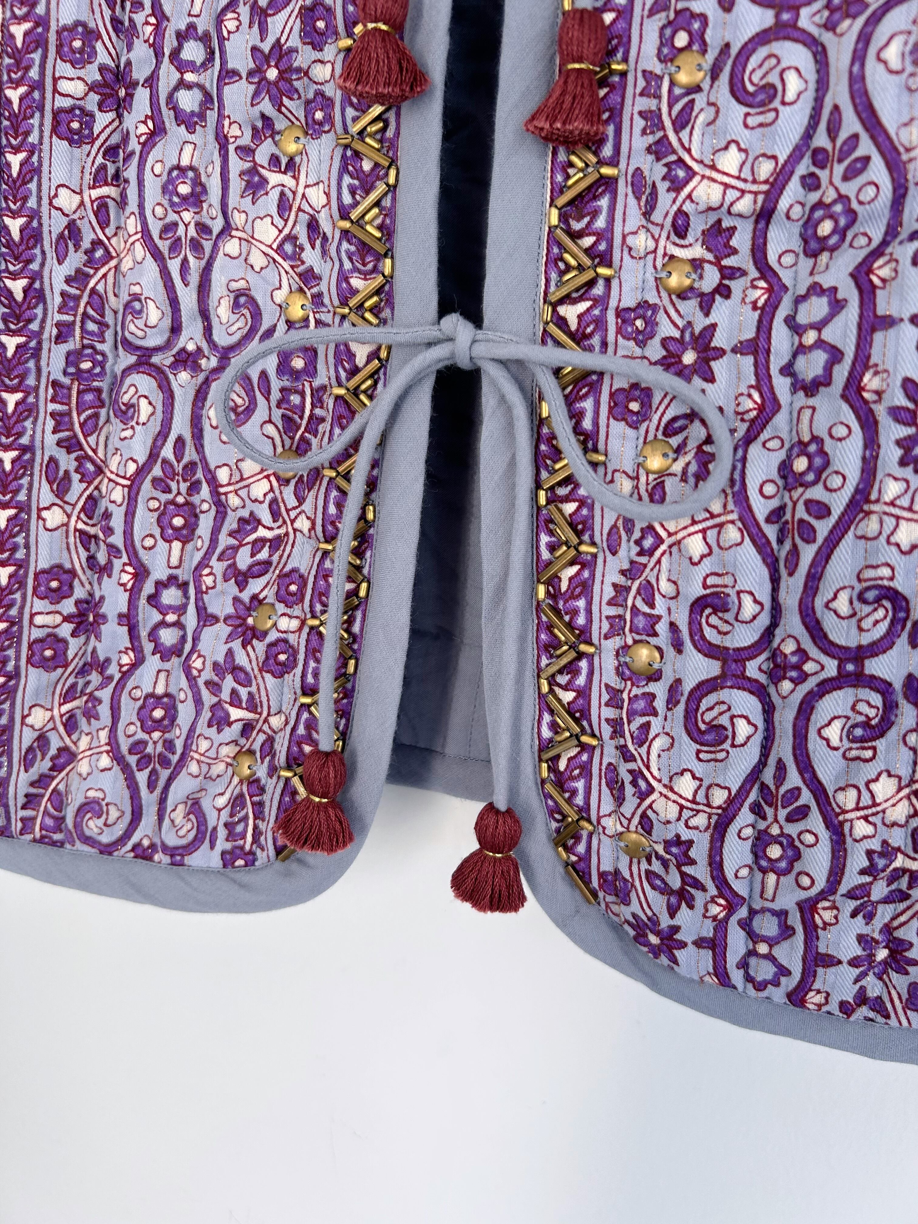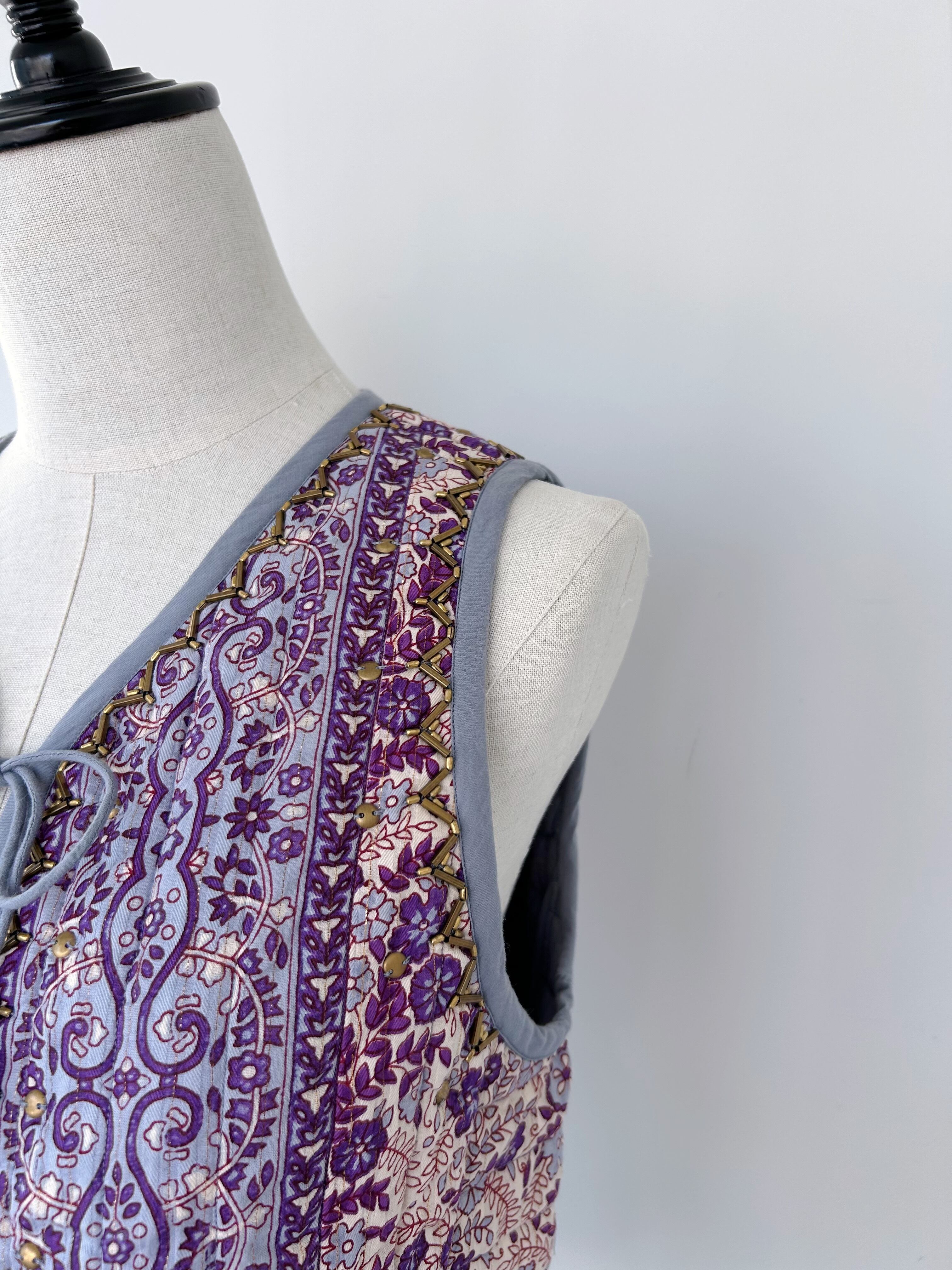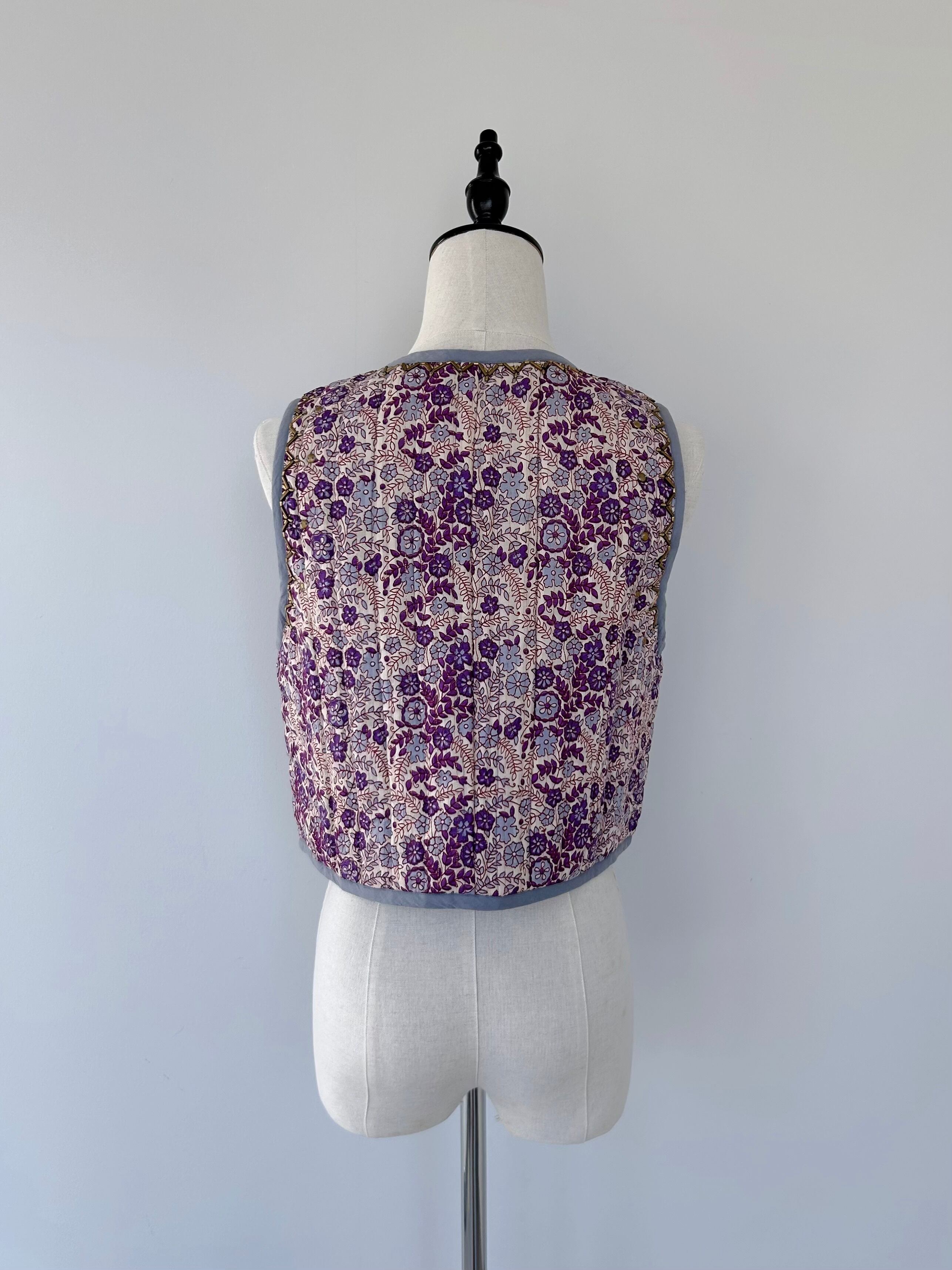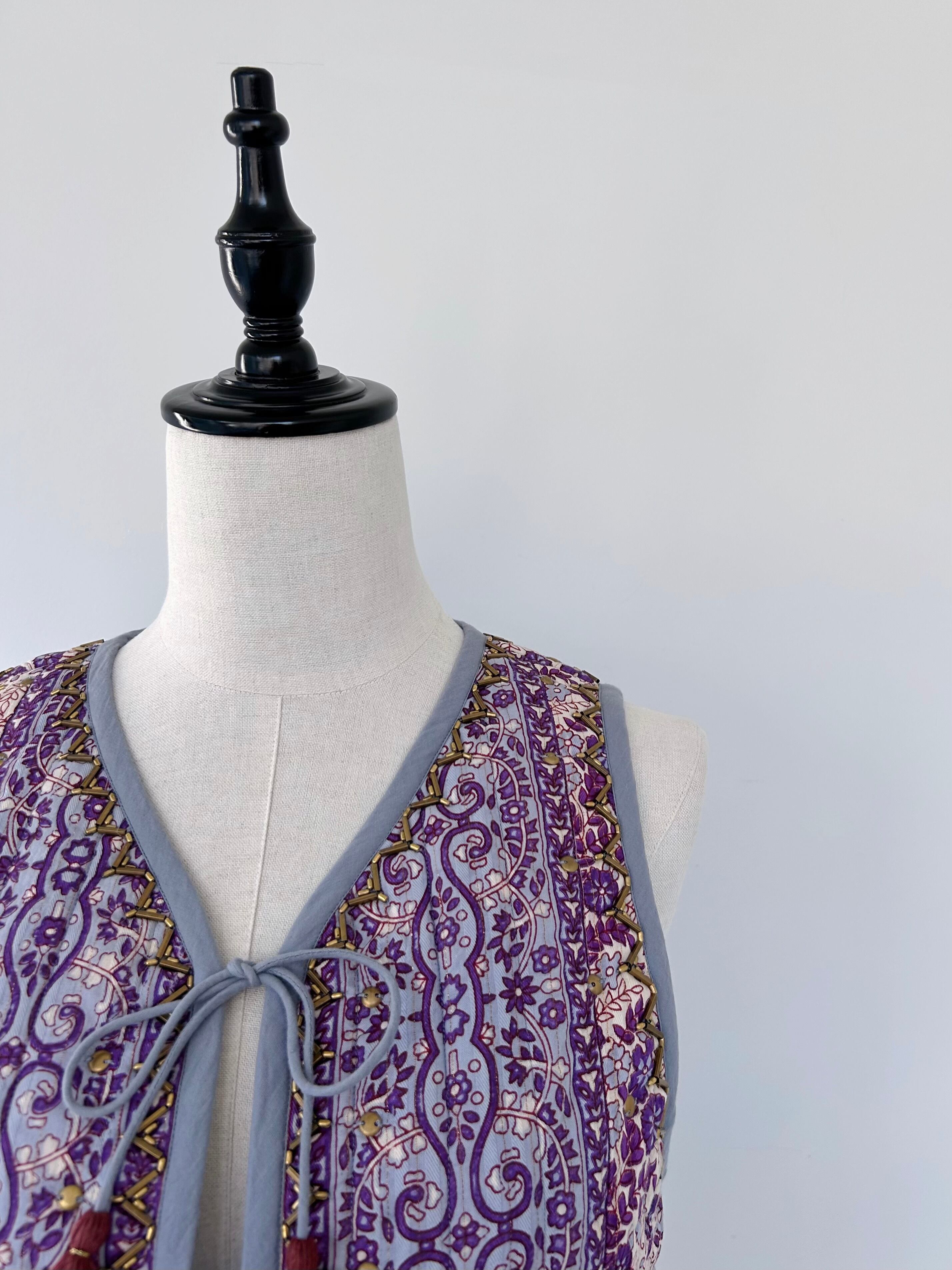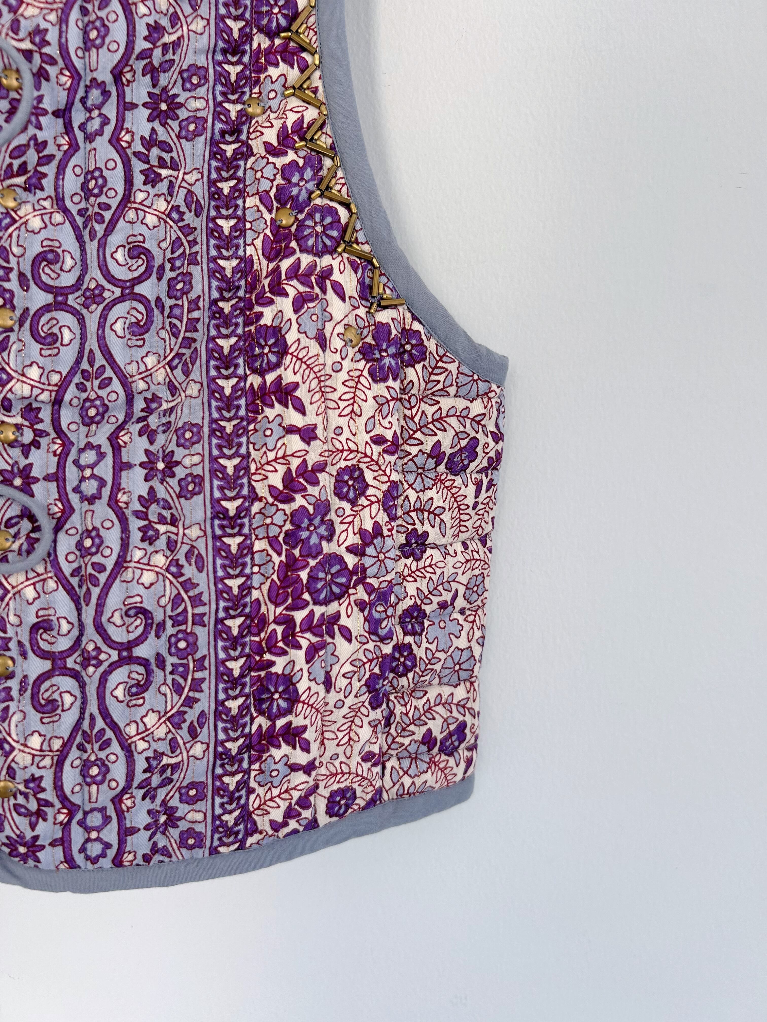 オリジナルモチーフをプリントしたテキスタイルにラメ糸がさりげなく光るキルティングベスト。