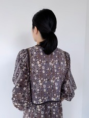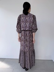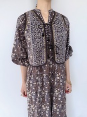 ノスタルジックなプリントと手作業で施したメタルの刺繍のコントラストが印象的。