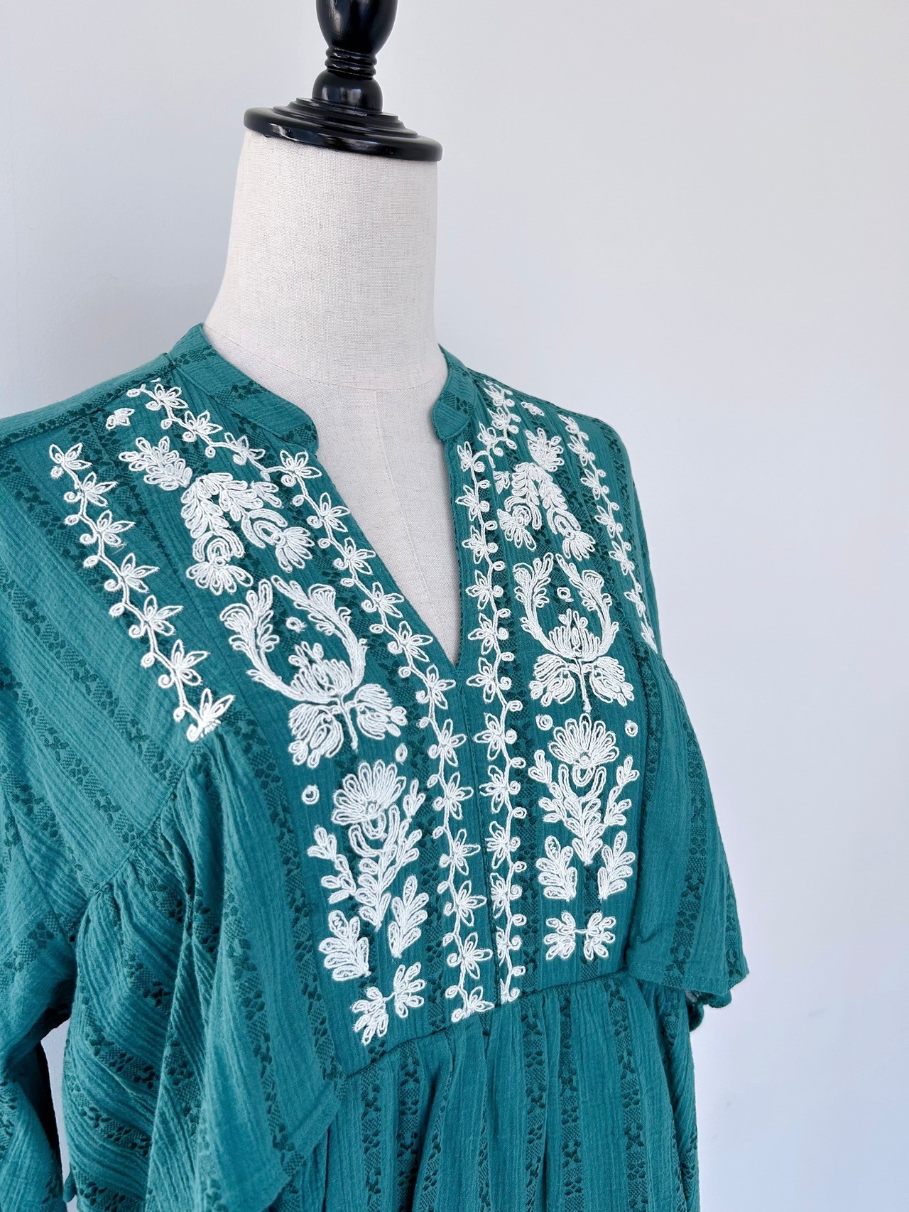 バスト部分にふんだんに施されたコード刺繍は、立体感と存在感を放ち、さりげなく華やかさをプラスします。