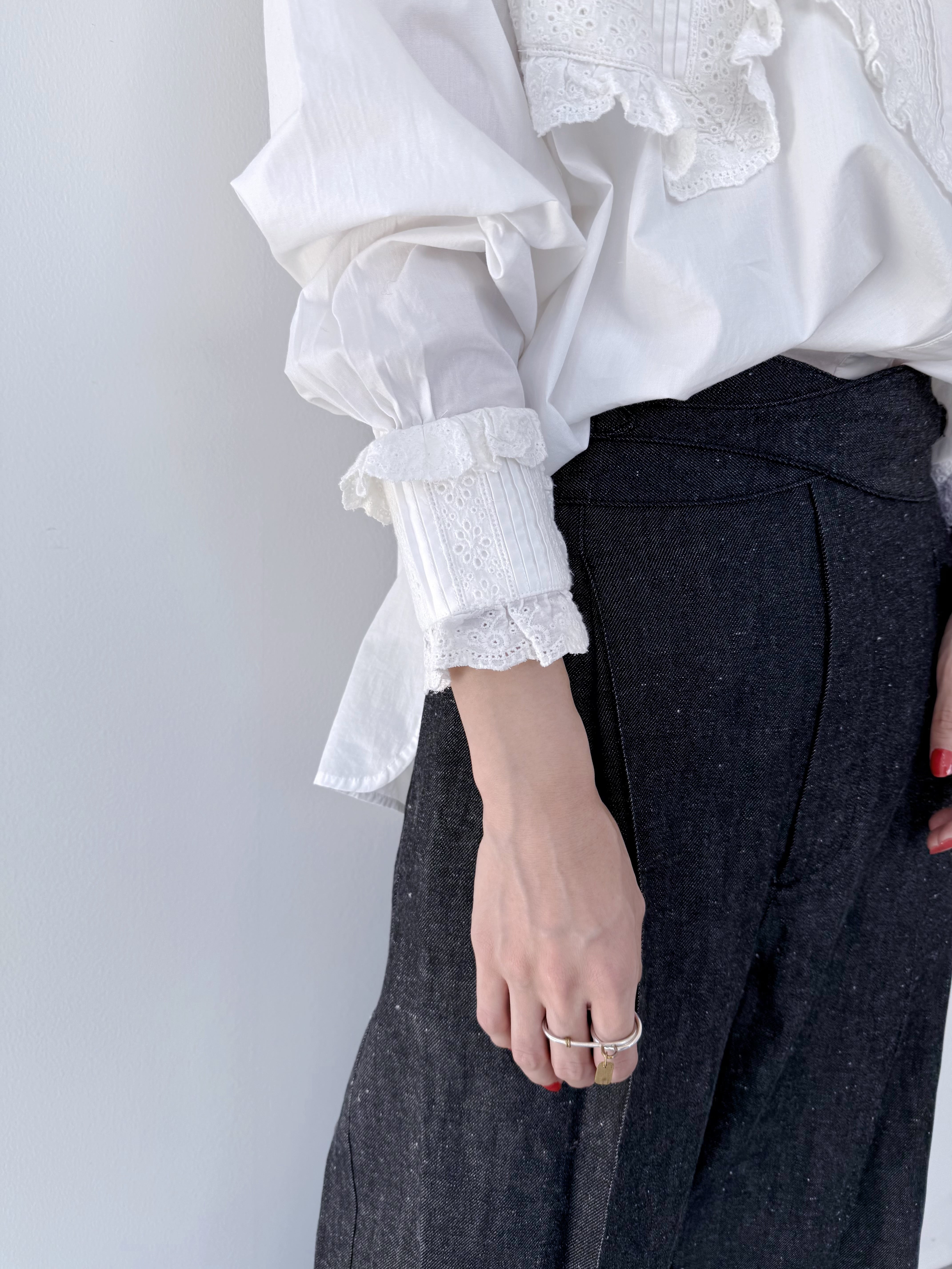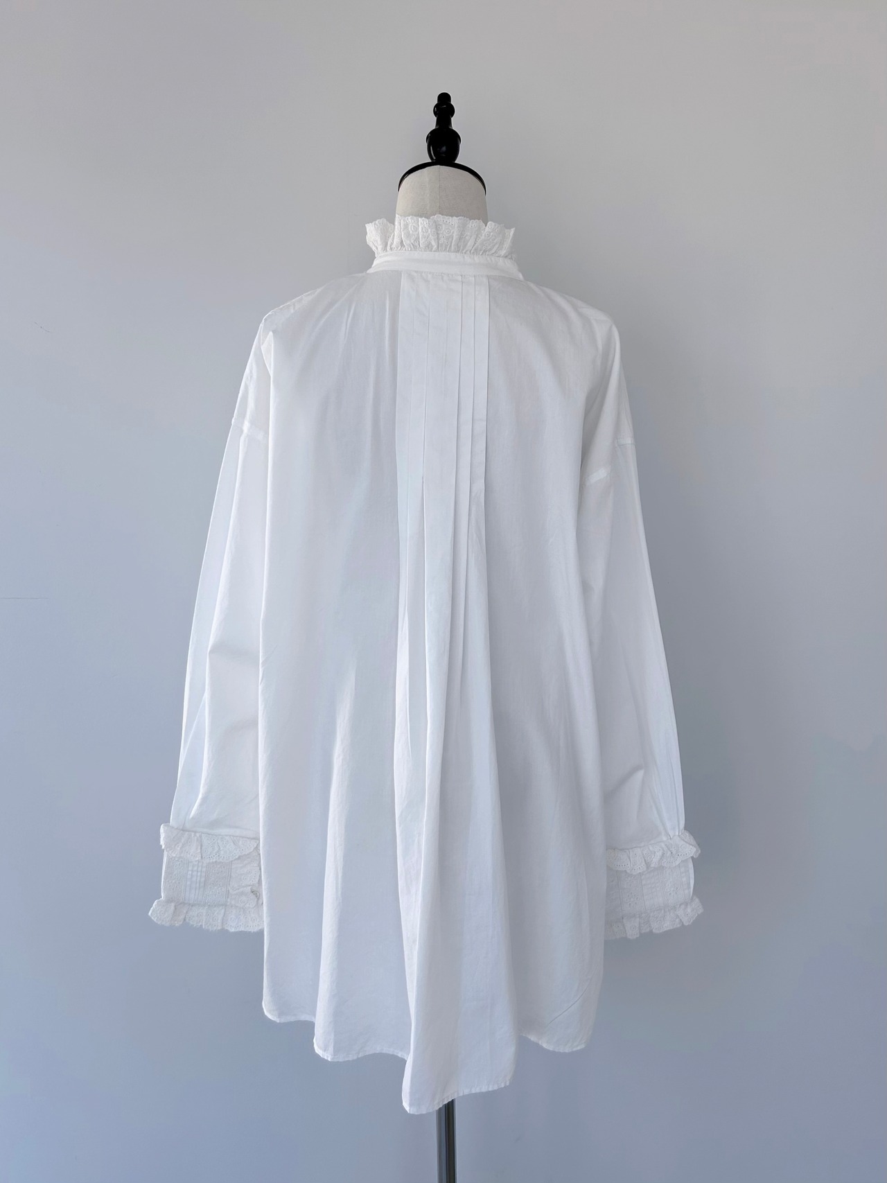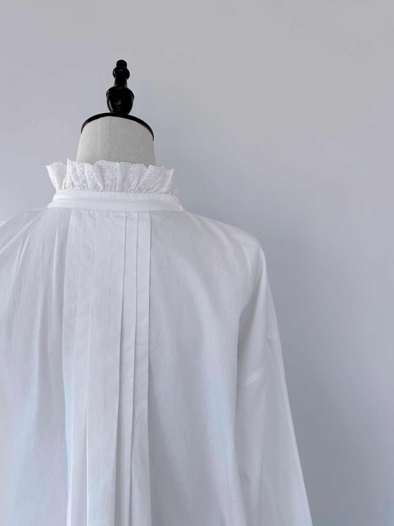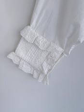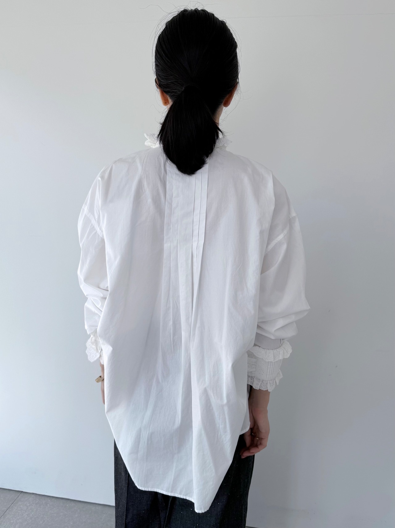 袖口にはピンタック&レースのパネルをパッチのように重ね、印象的な手元を演出。背面には大きめのボックスタックが入り、動きのあるフレアシルエットを実現。