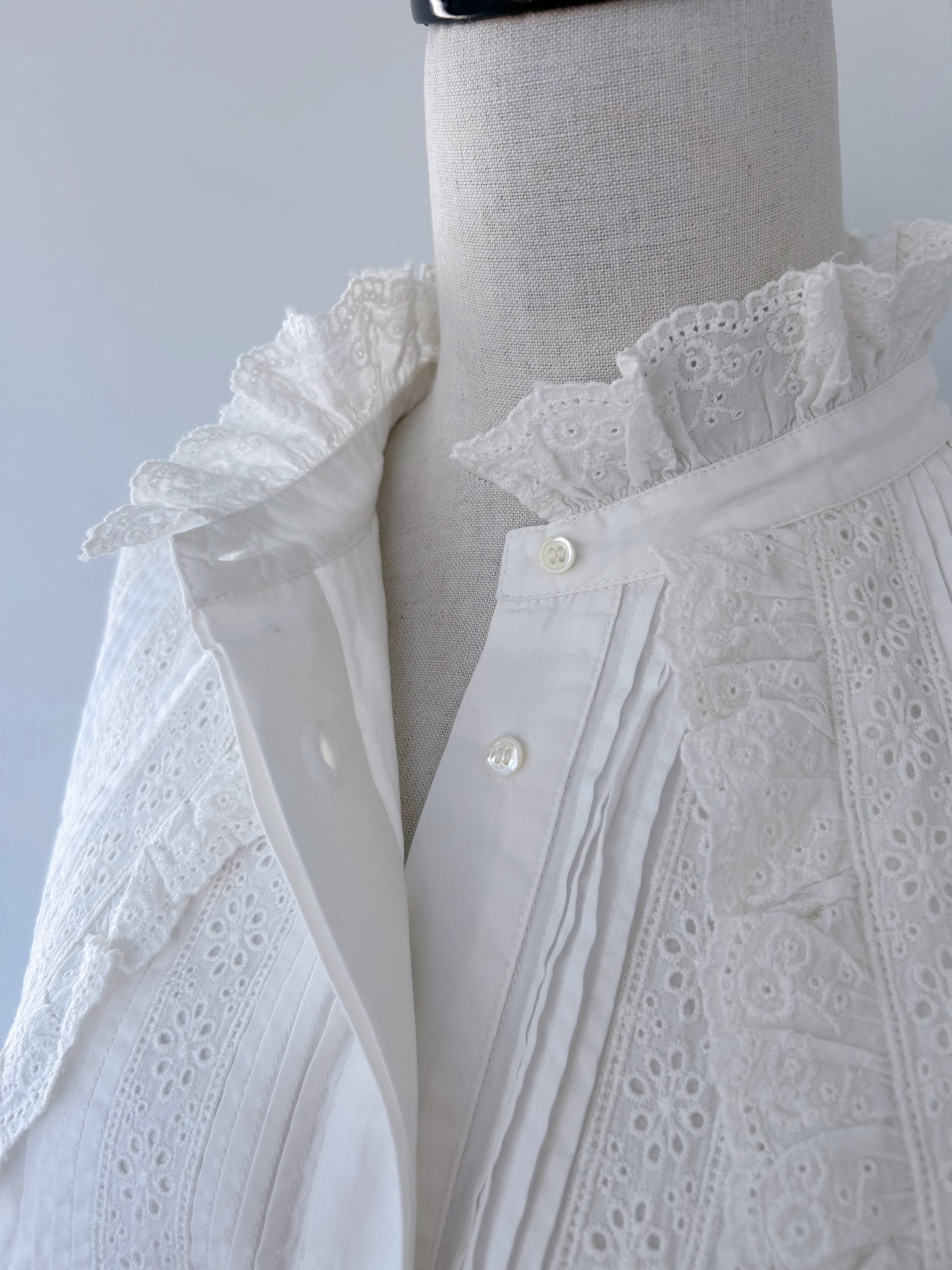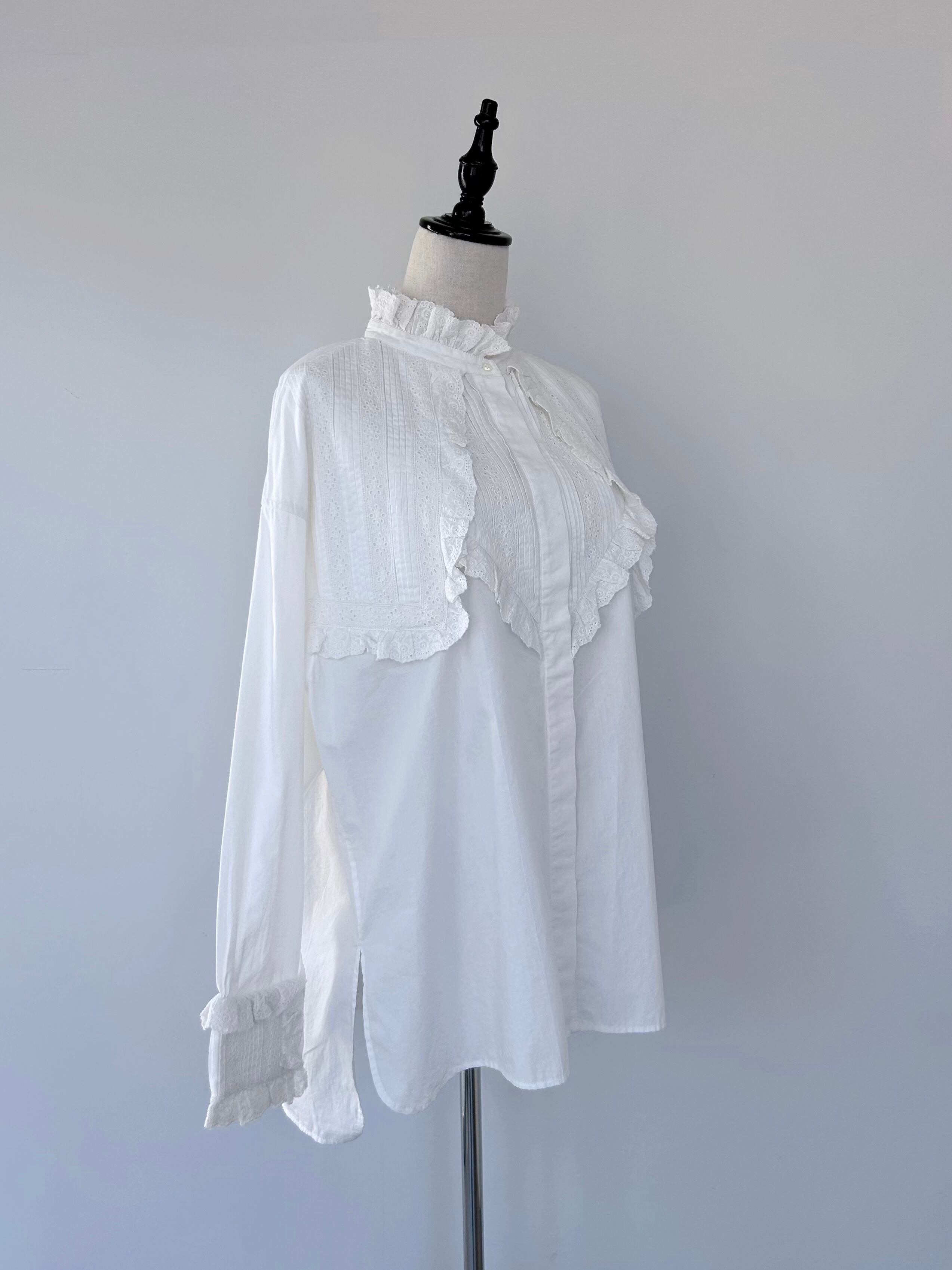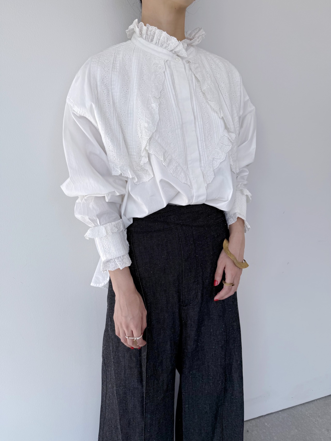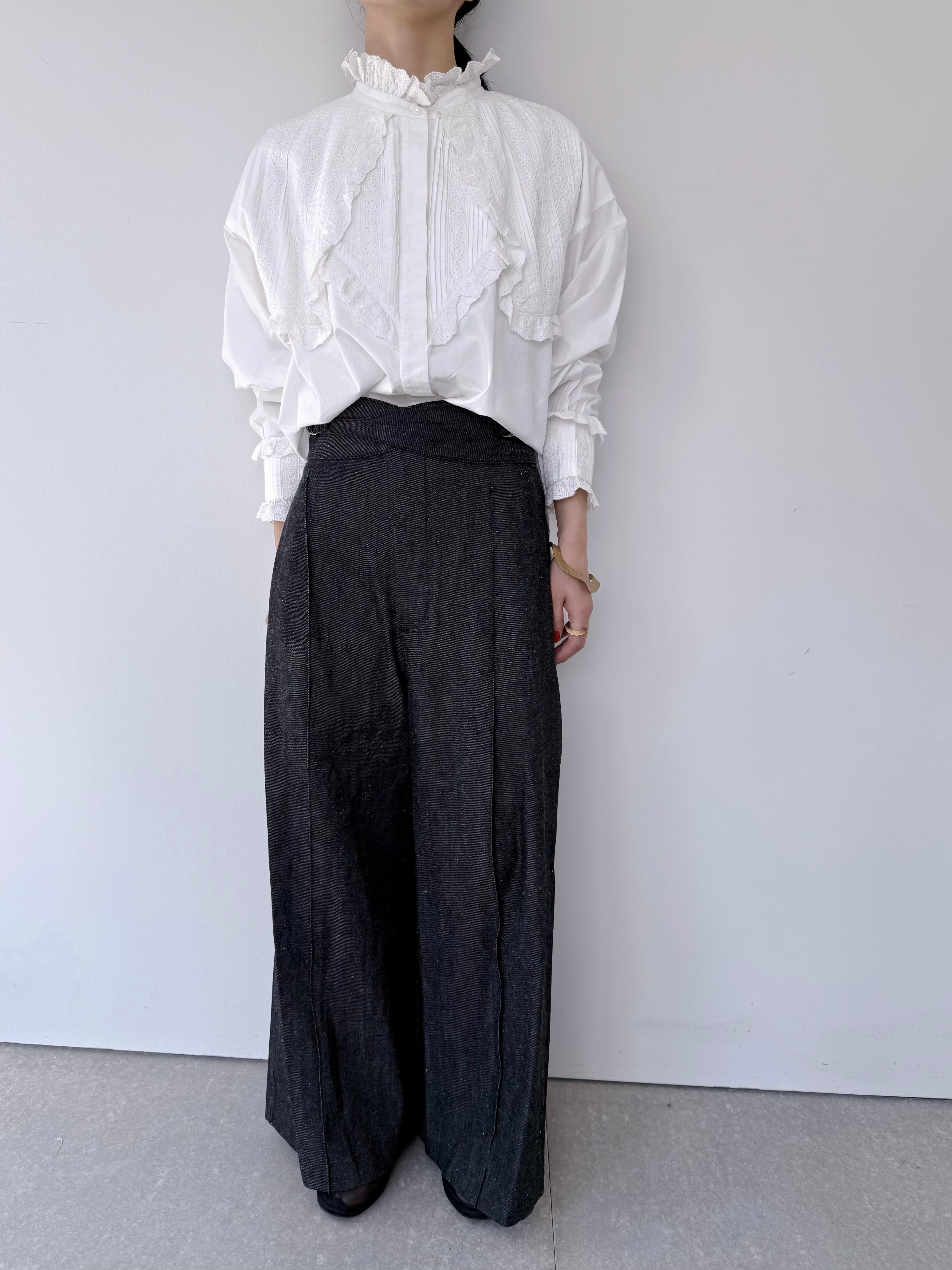 袖口にはピンタック&レースのパネルをパッチのように重ね、印象的な手元を演出。背面には大きめのボックスタックが入り、動きのあるフレアシルエットを実現。