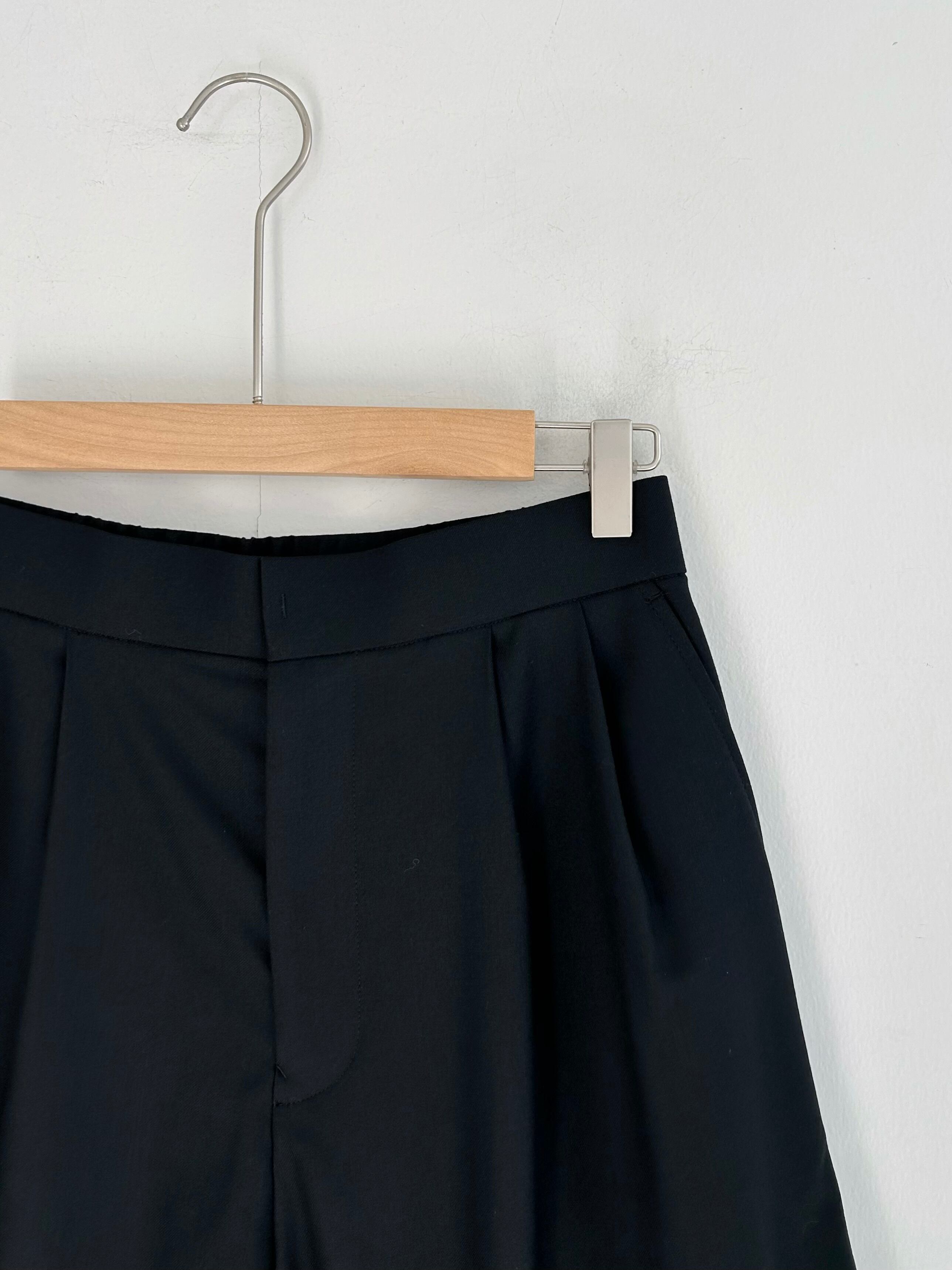 パンツ裾の立体的なフレアーや前ウエストに施した4箇所のタックで、洗練された印象に仕上げています。