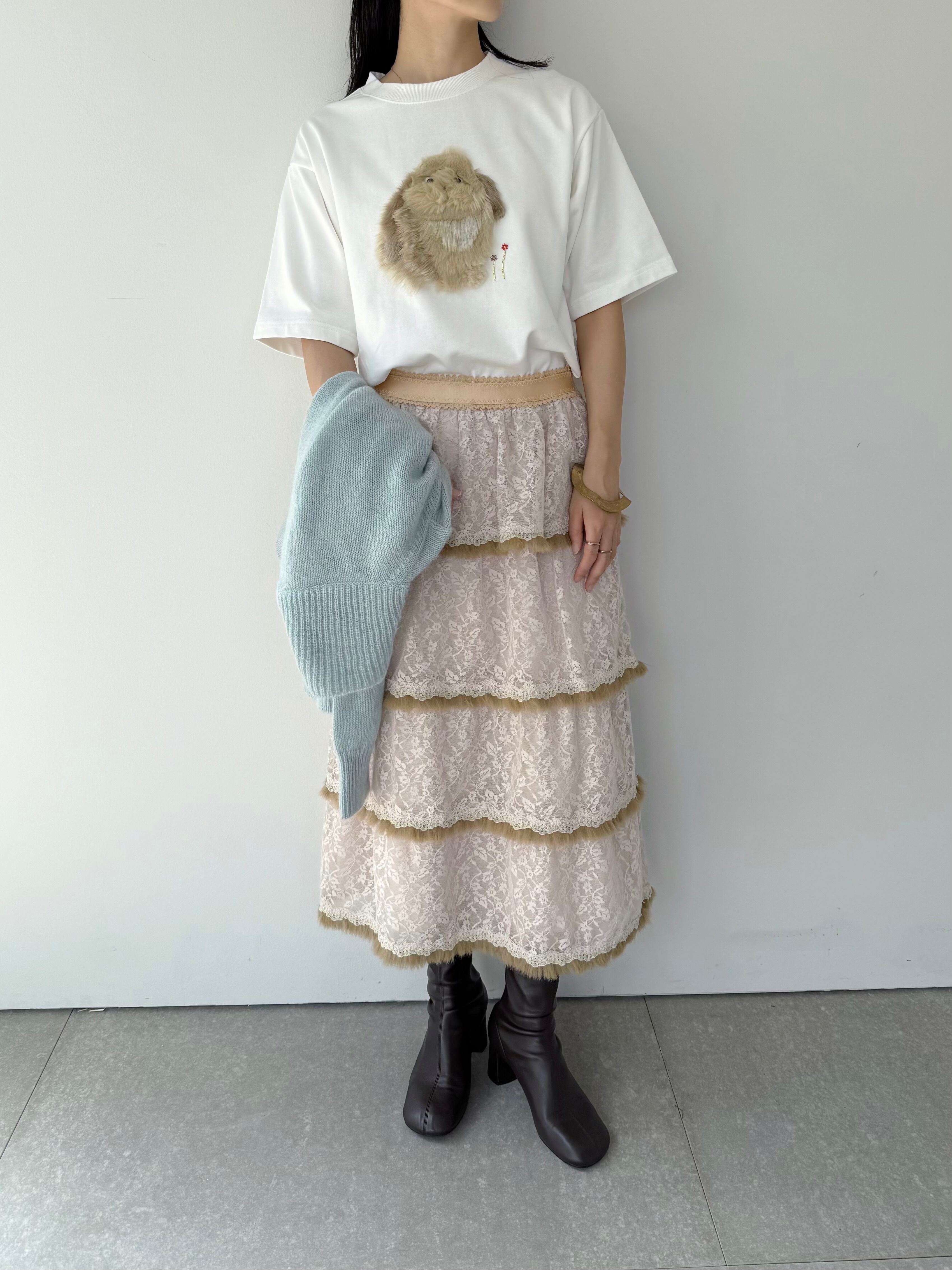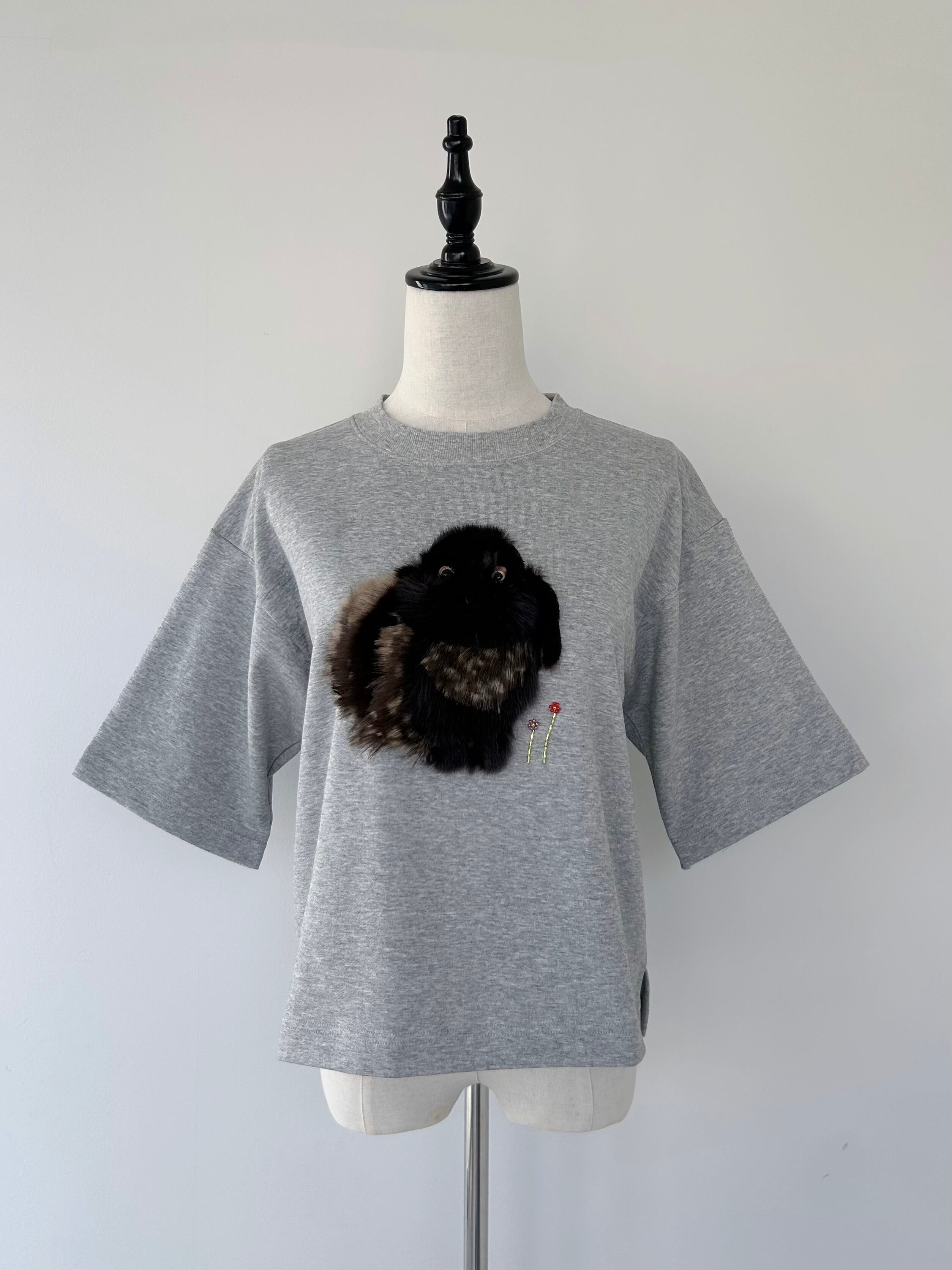 コレクションテーマに合わせて愛らしいウサギのファーアップリケを施したTシャツ。