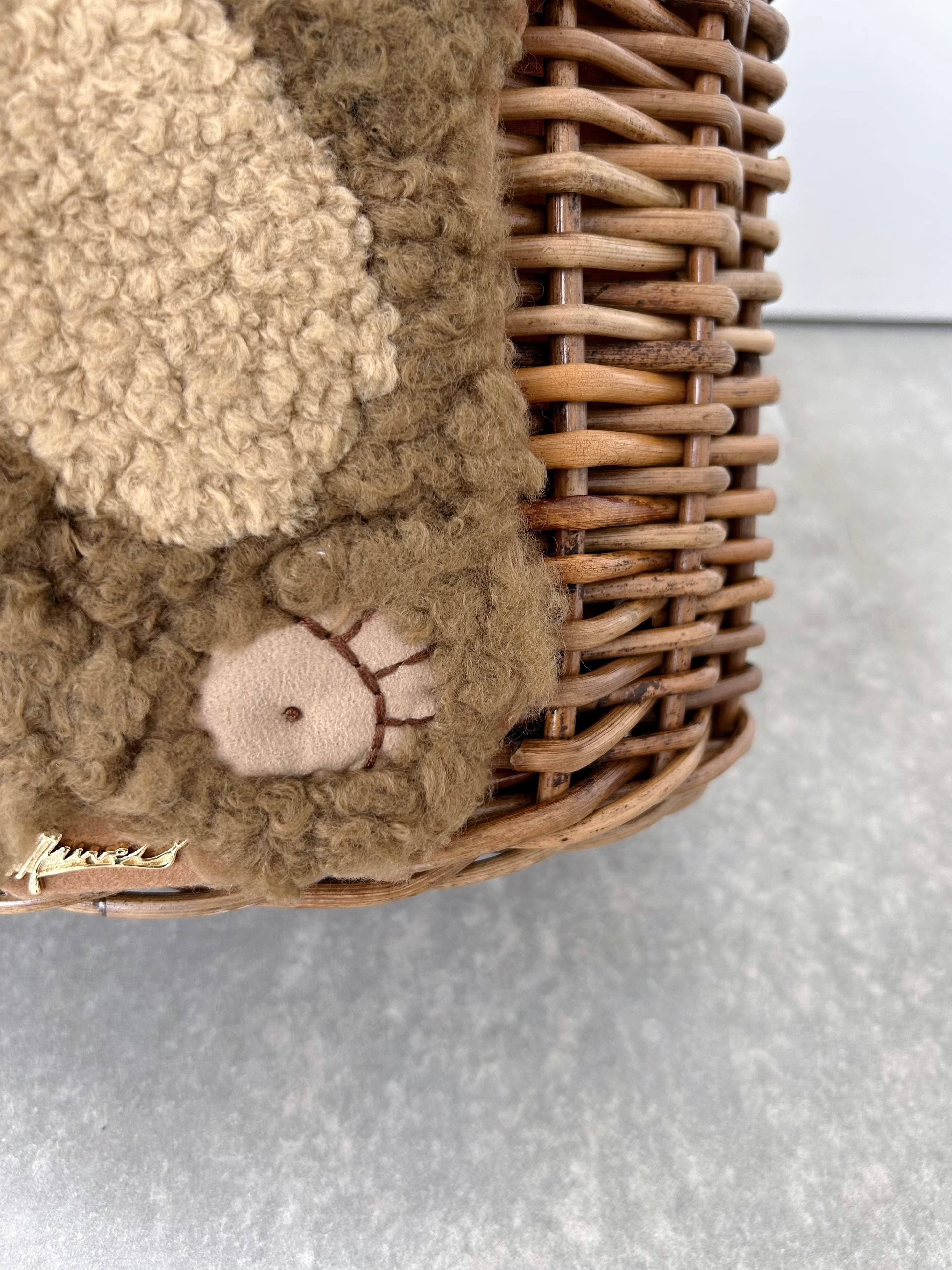 コレクションテーマに合わせて制作した愛らしい表情のクマを施したカゴバッグ。