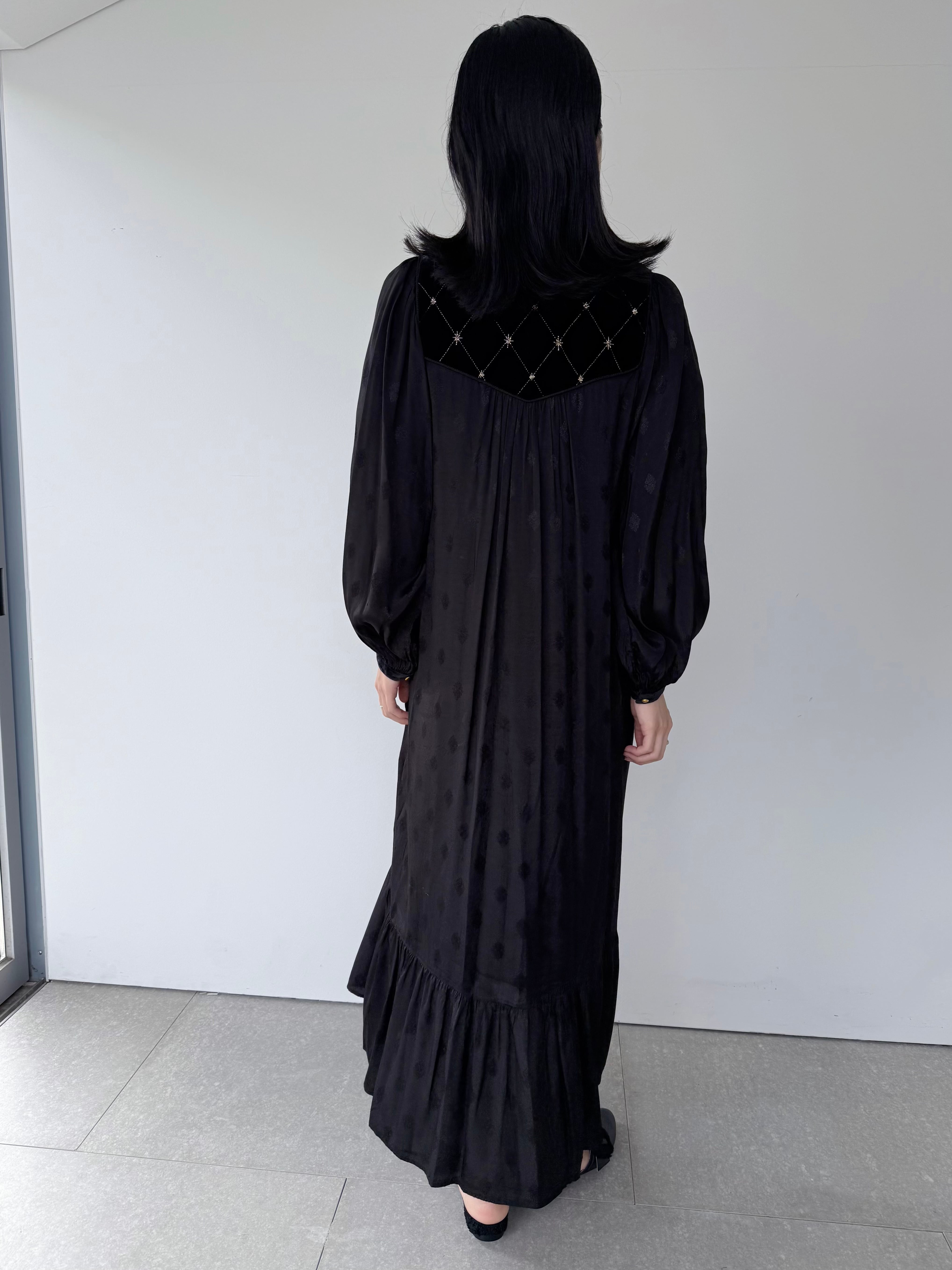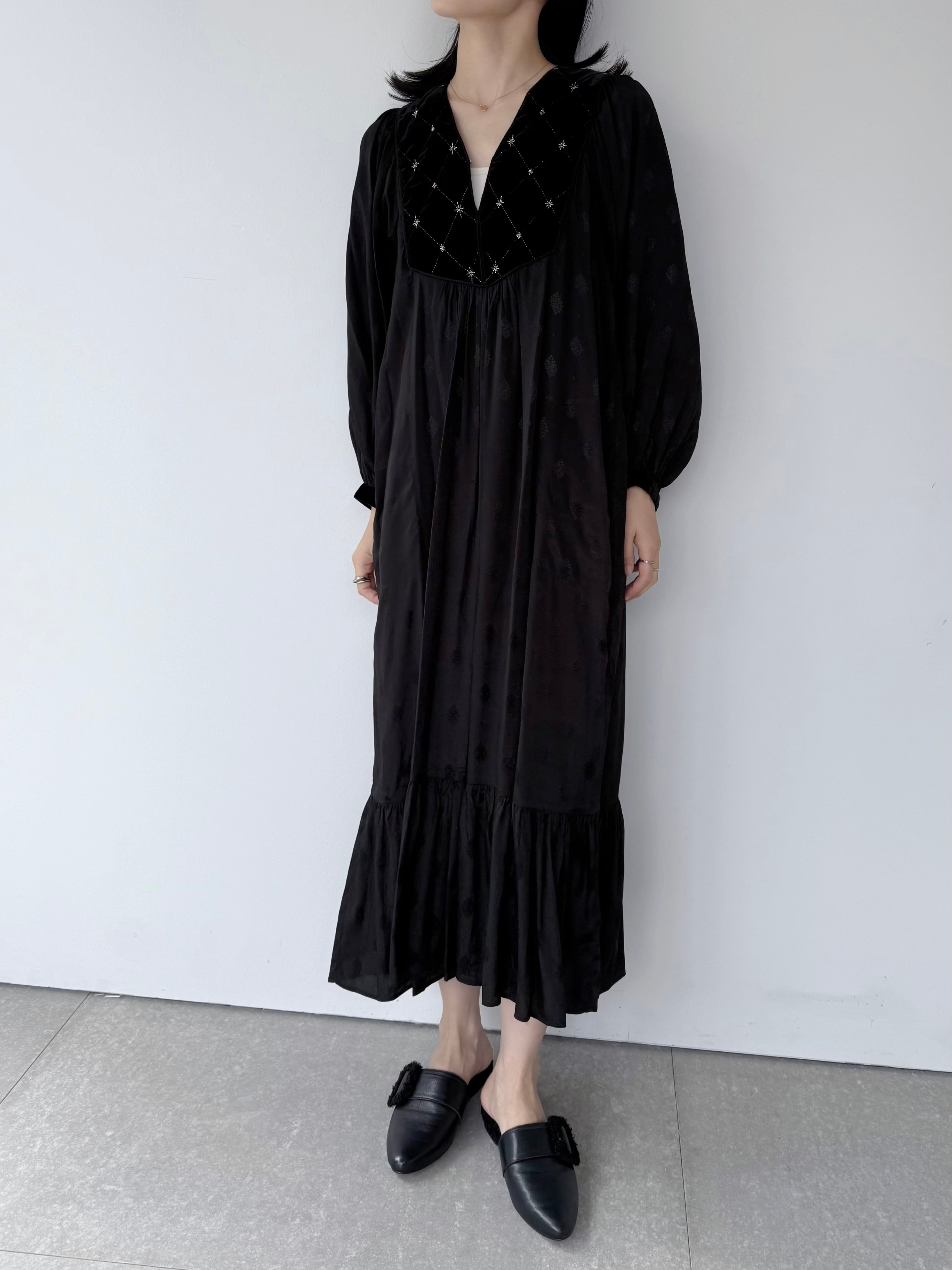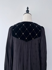ベルベッド生地にたっぷりのビーズ刺繍を施したロングドレス。