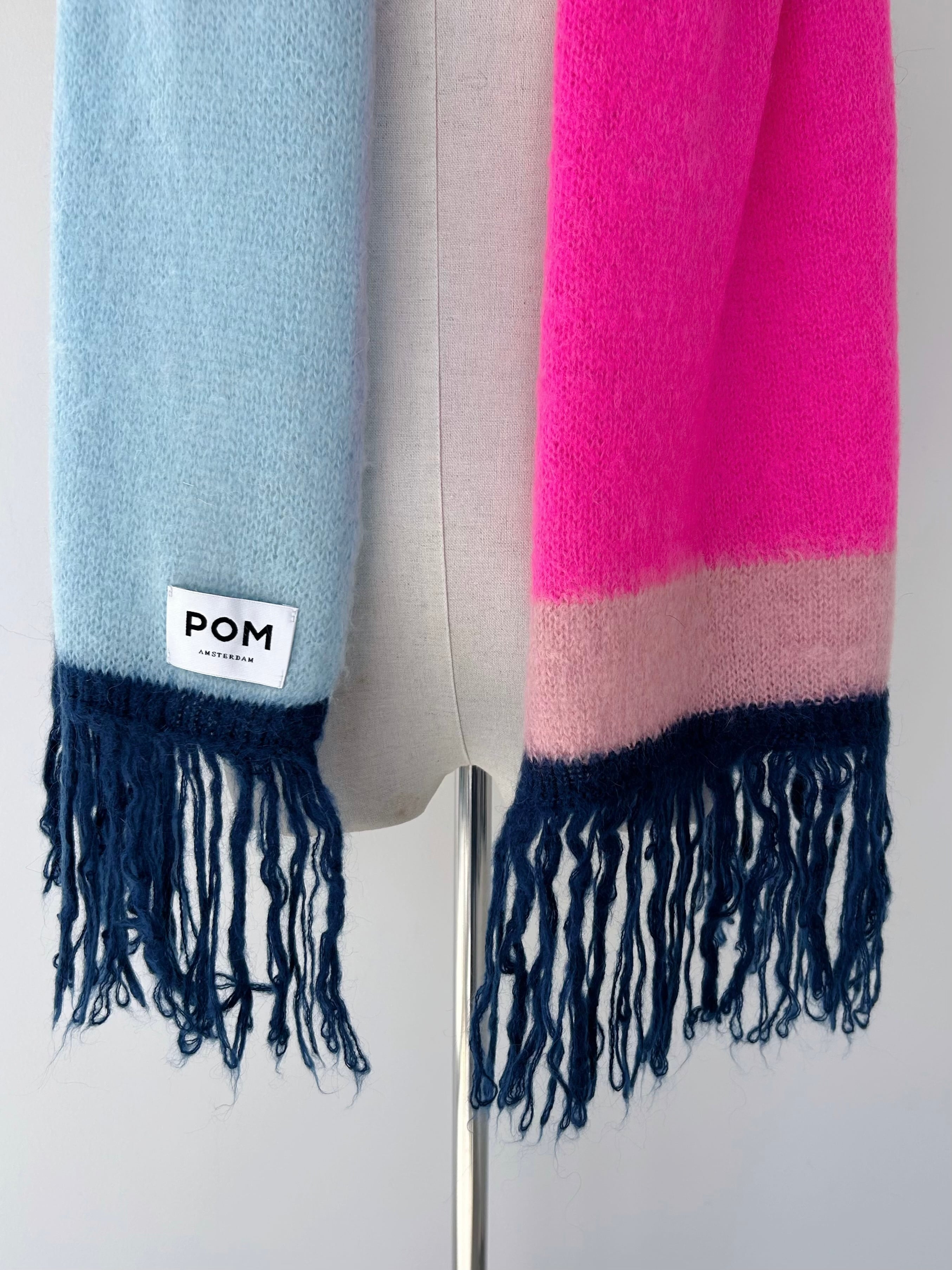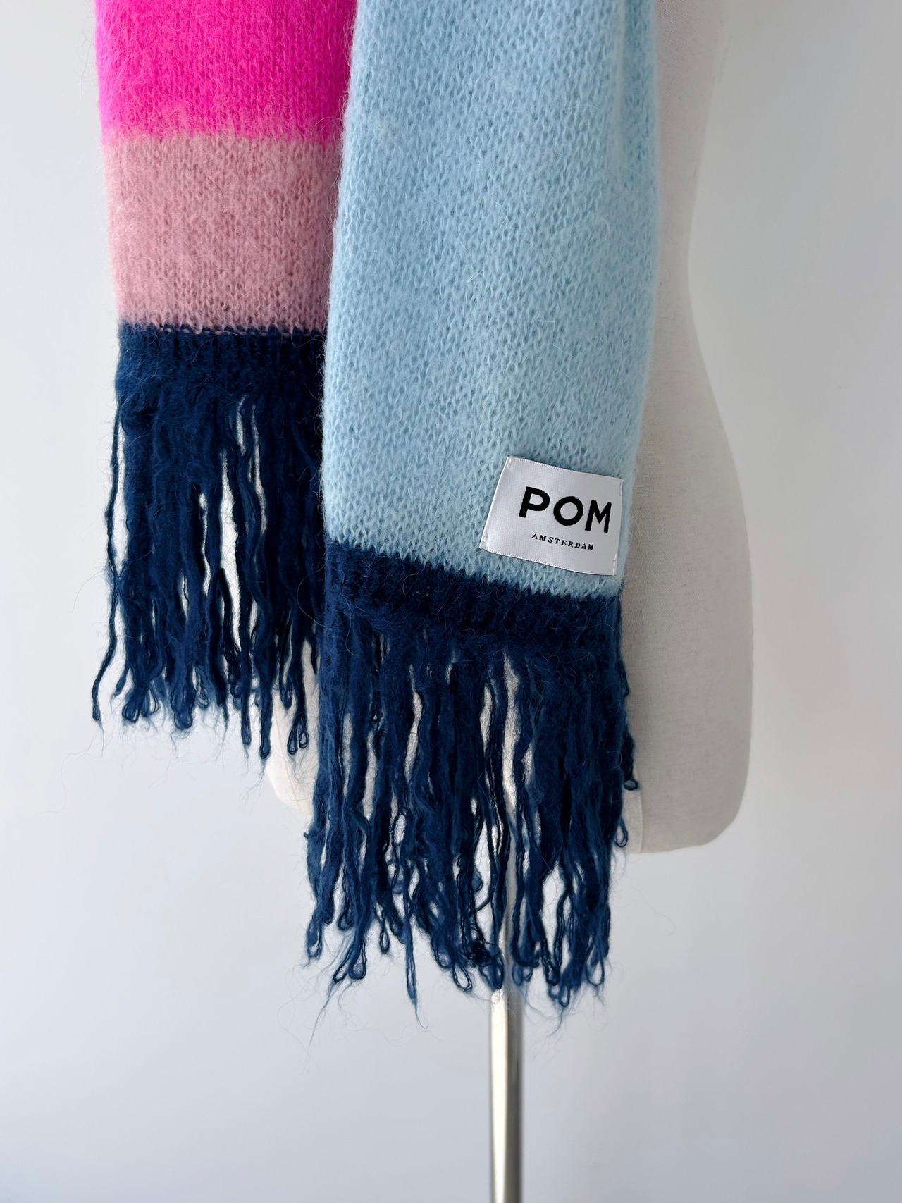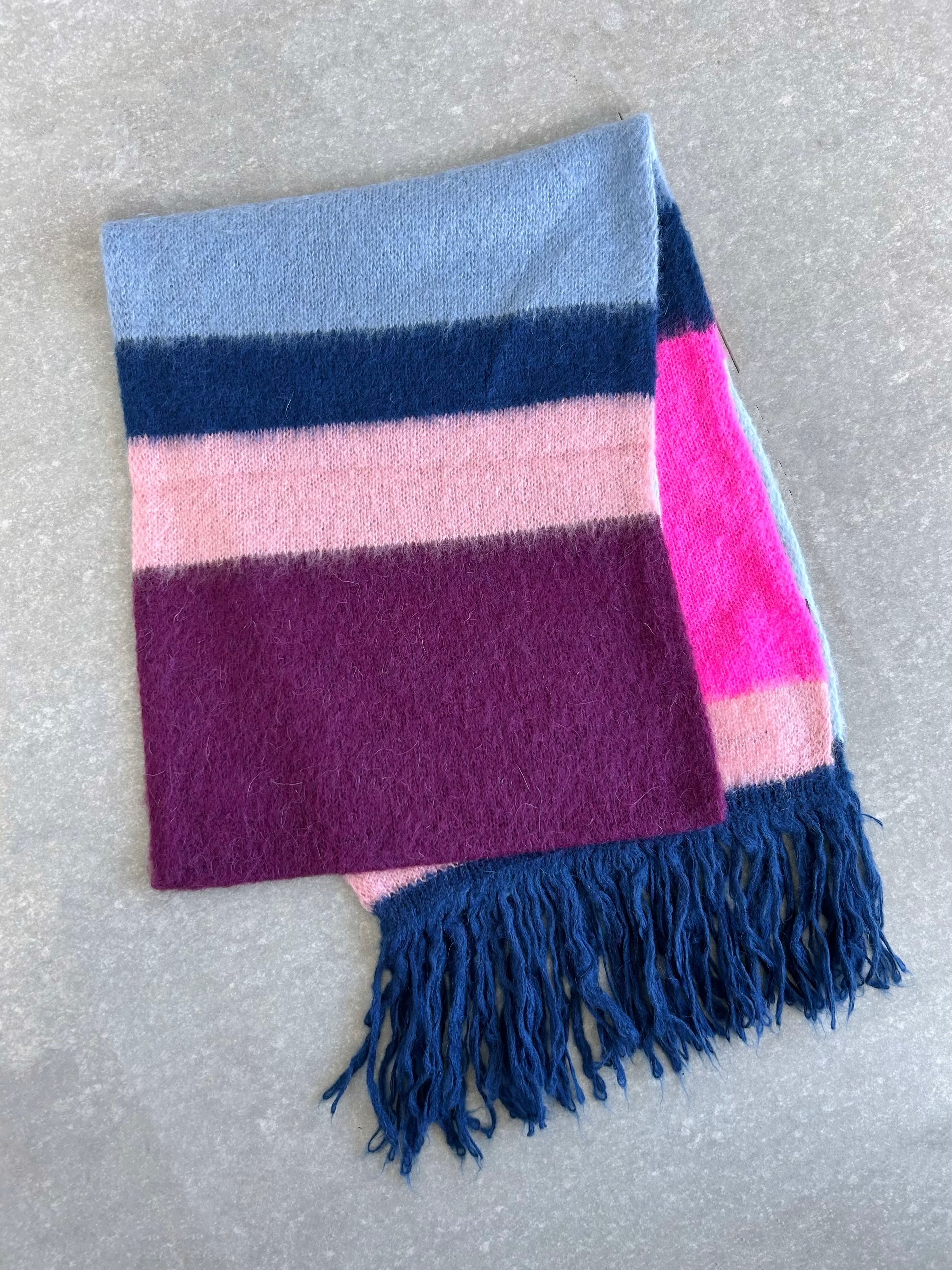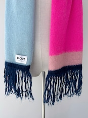幅広のカラーブロックとふわふわのフリンジを備えたこのニットスカーフは、肌寒い日の陽気にプラスワンアイテムに。