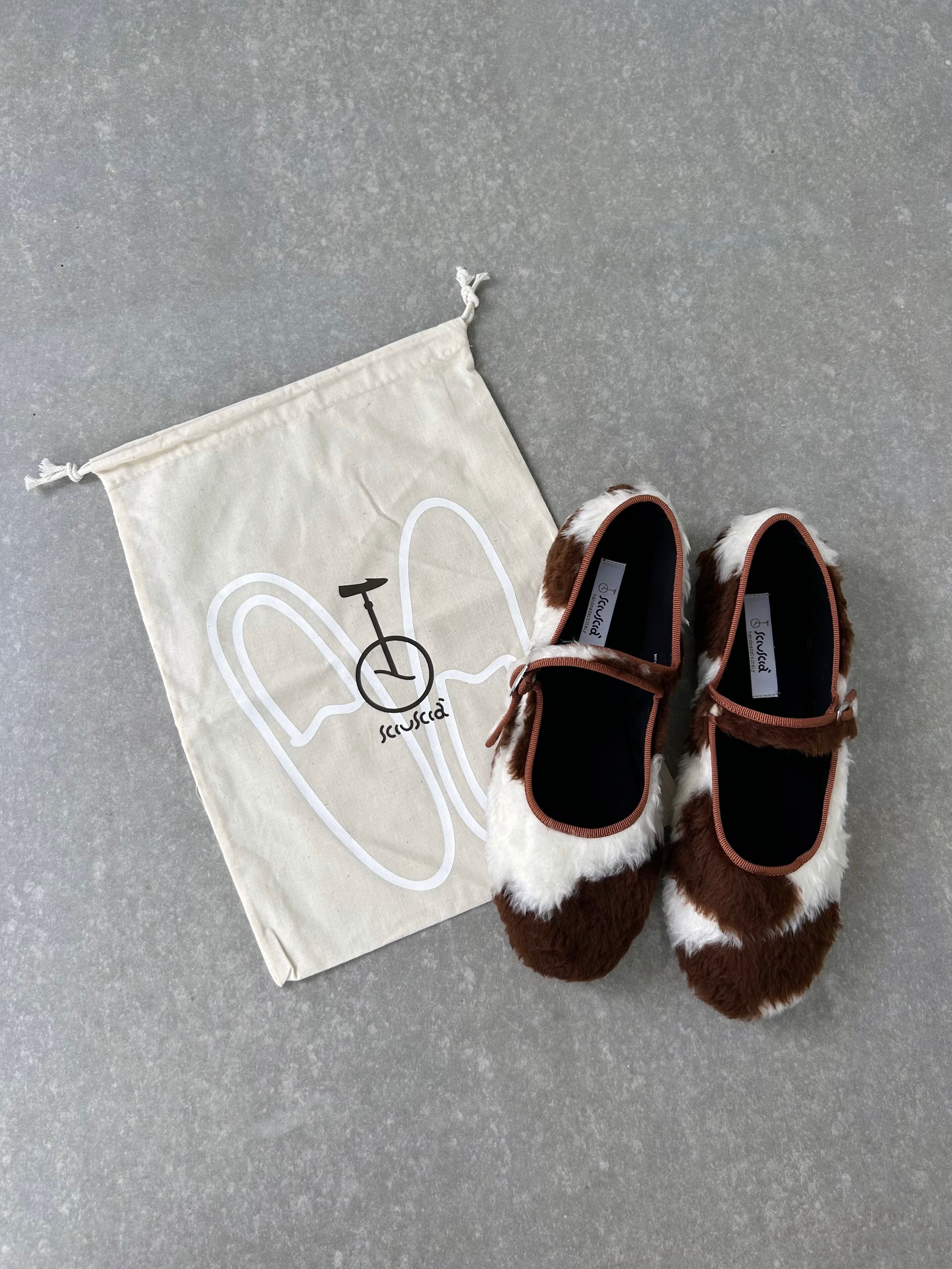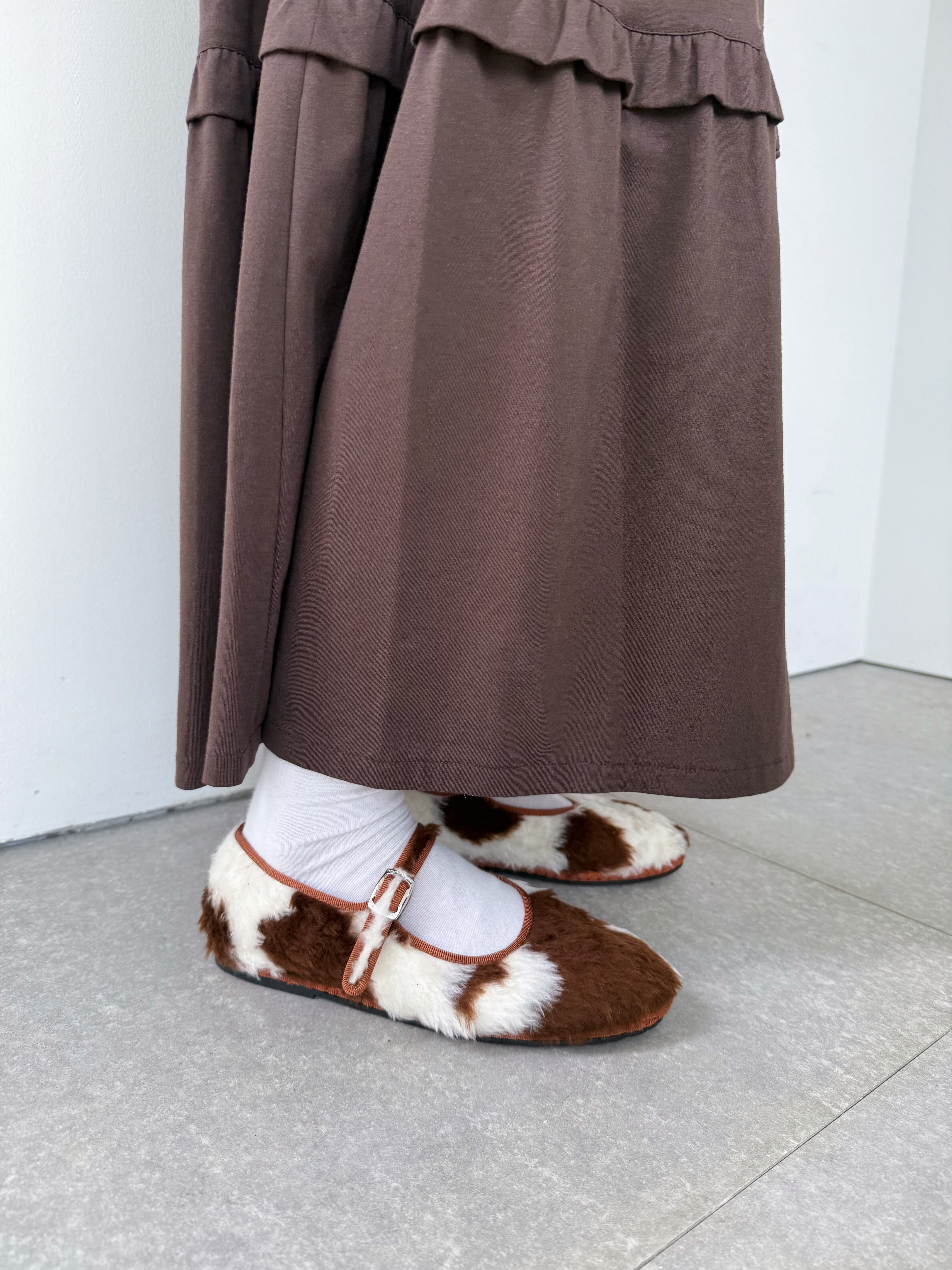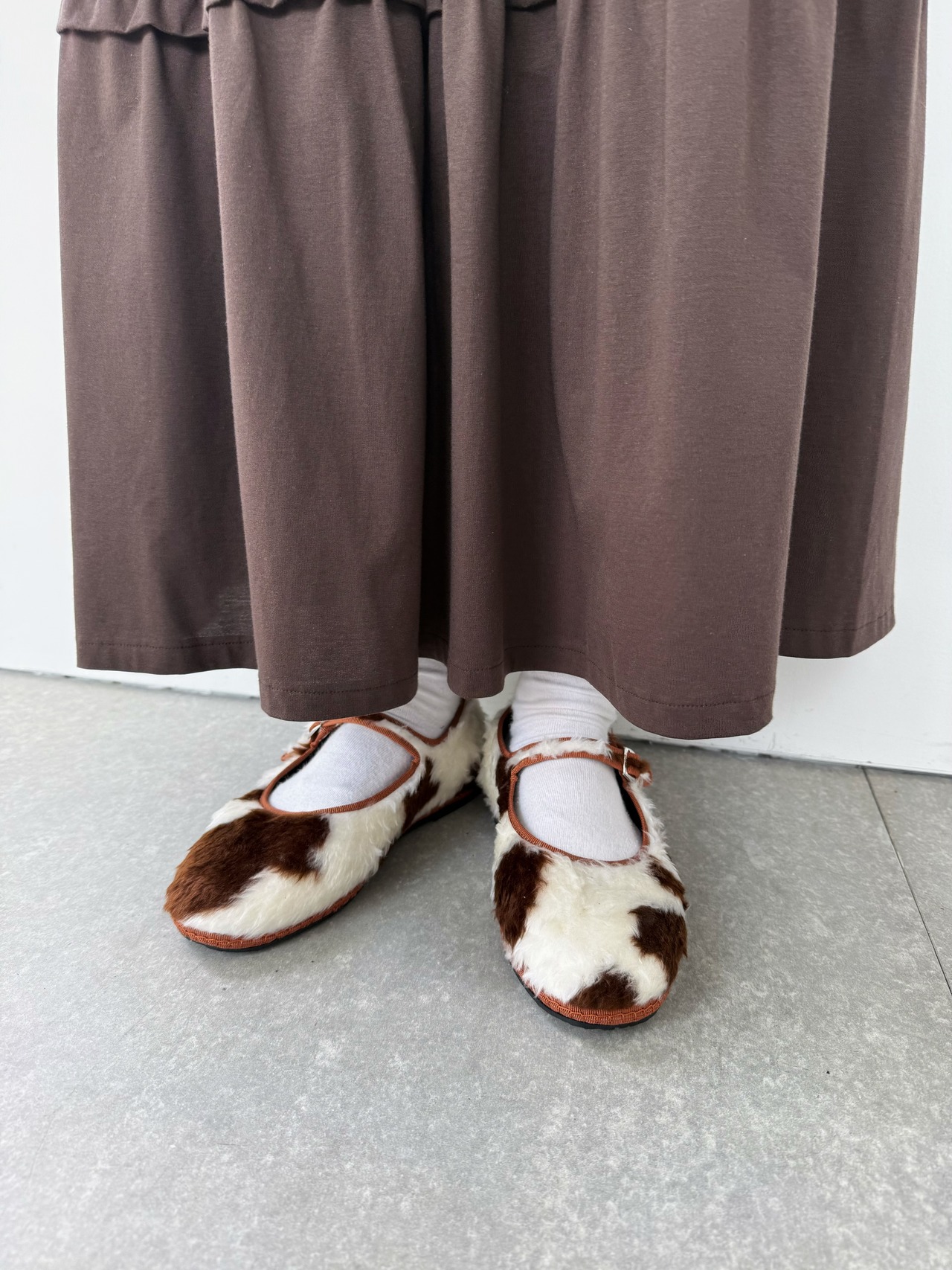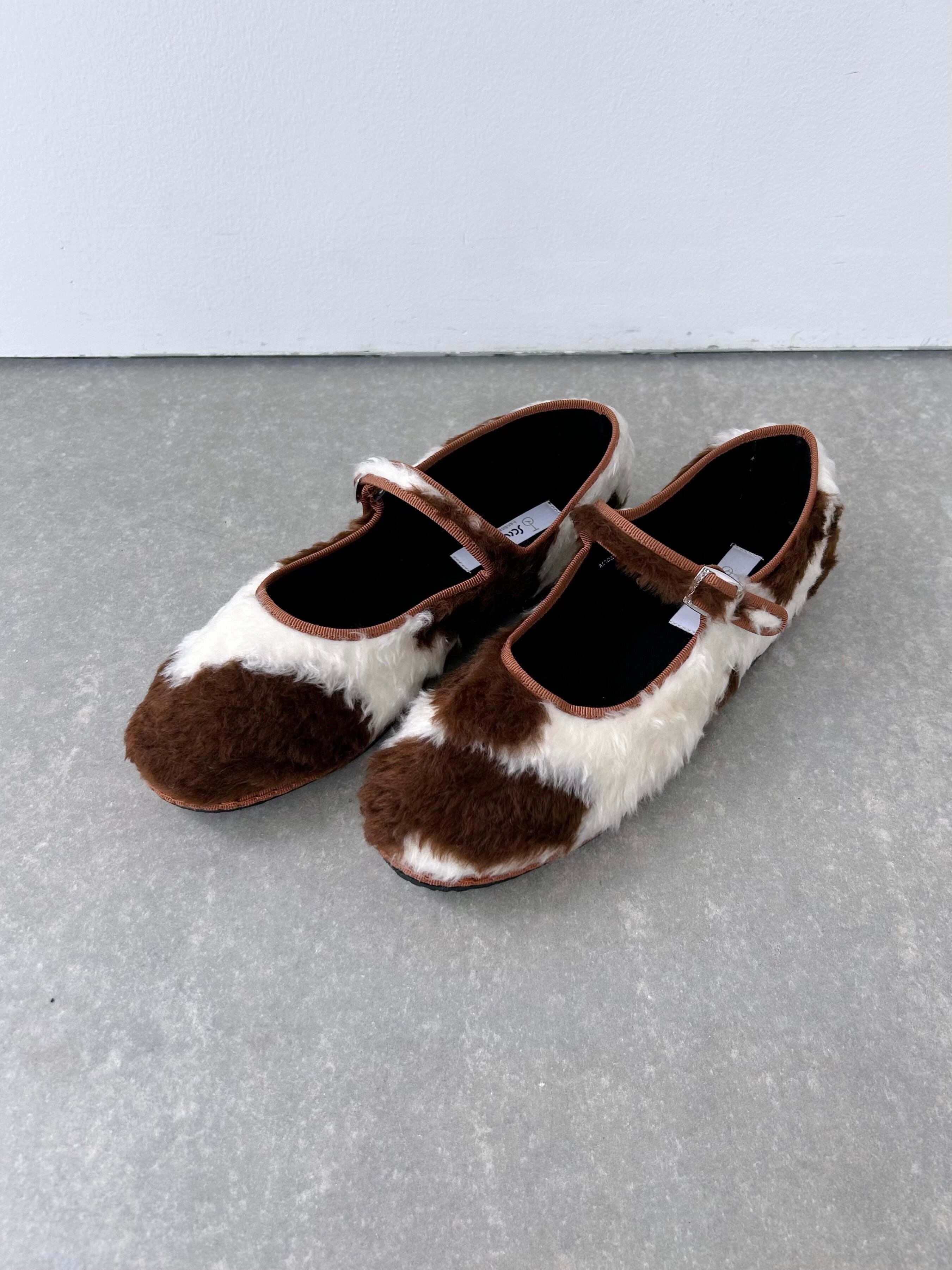 もこもこファーの牛柄シューズ。