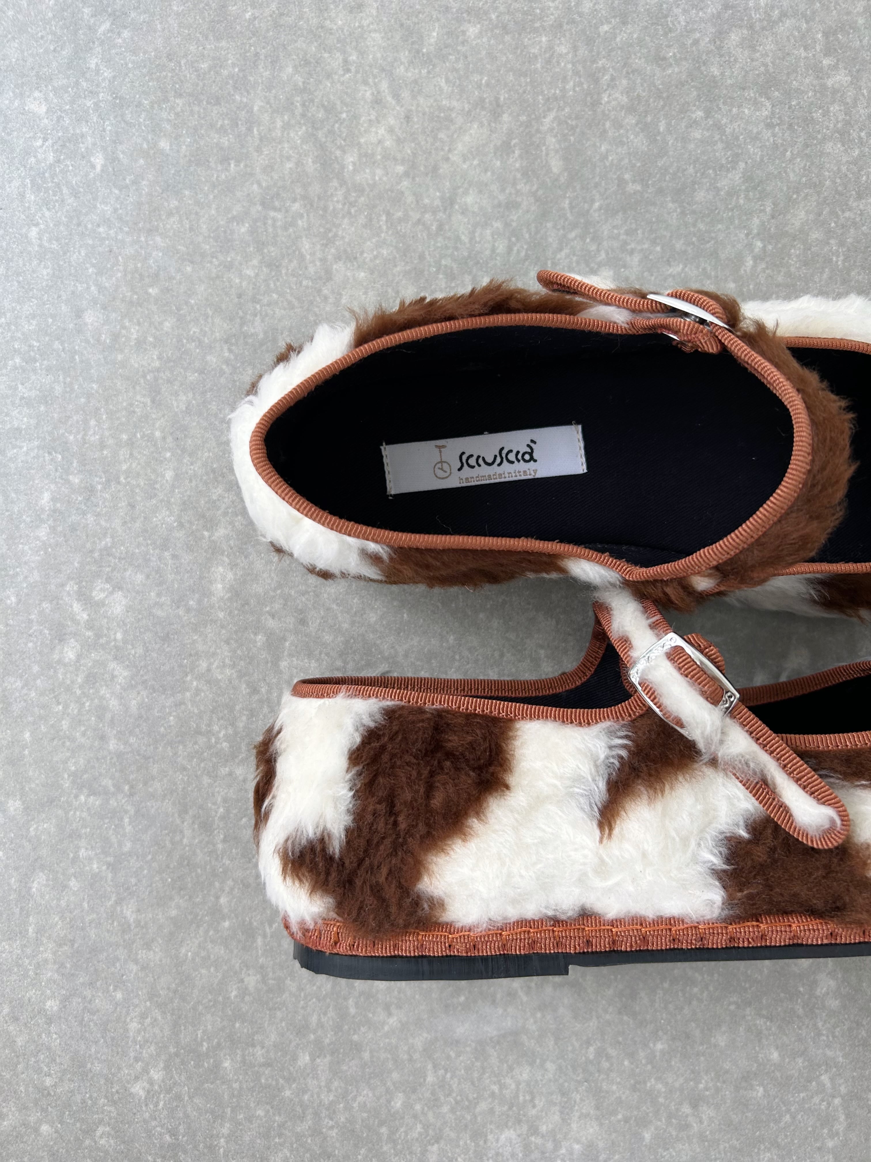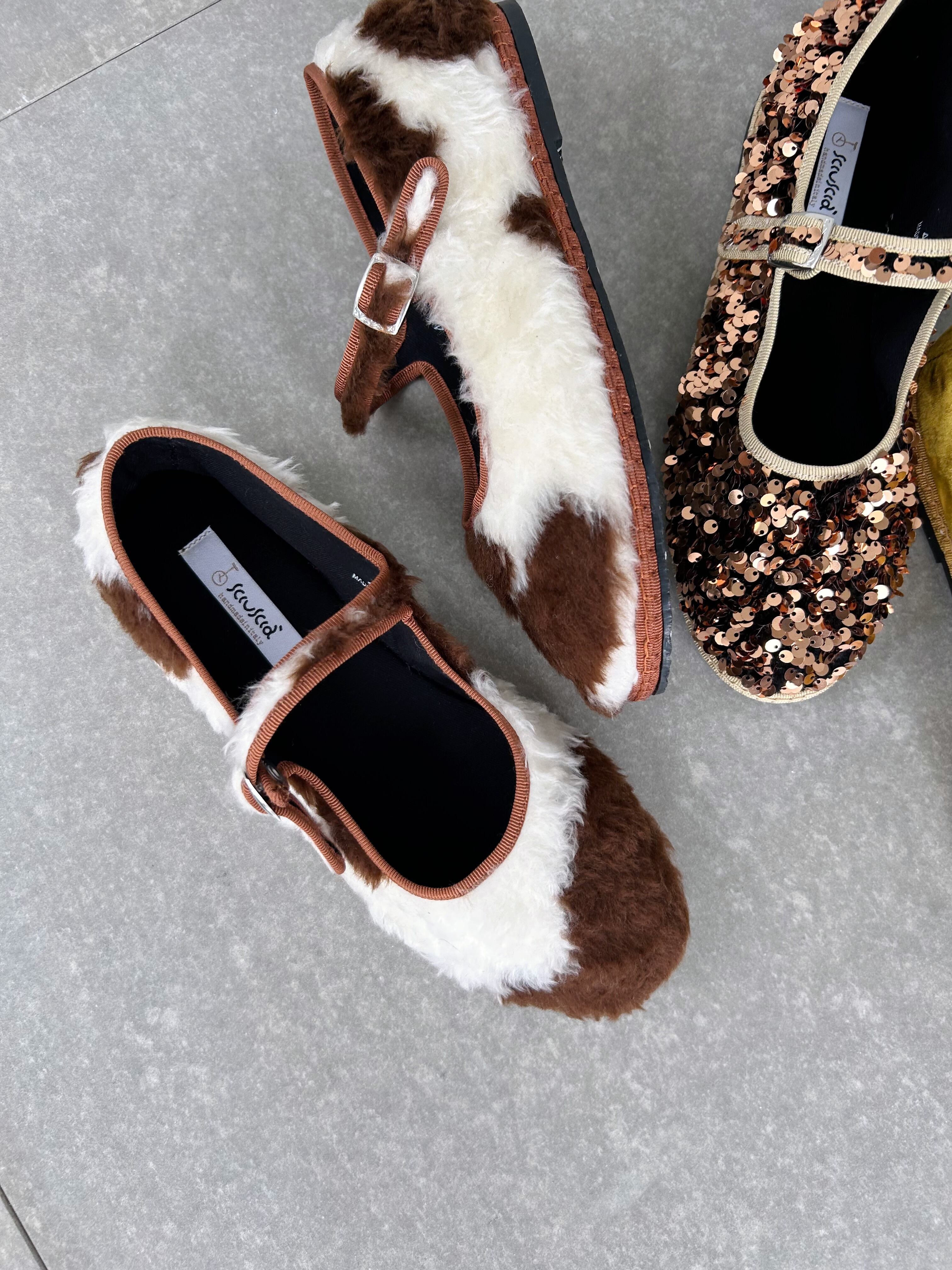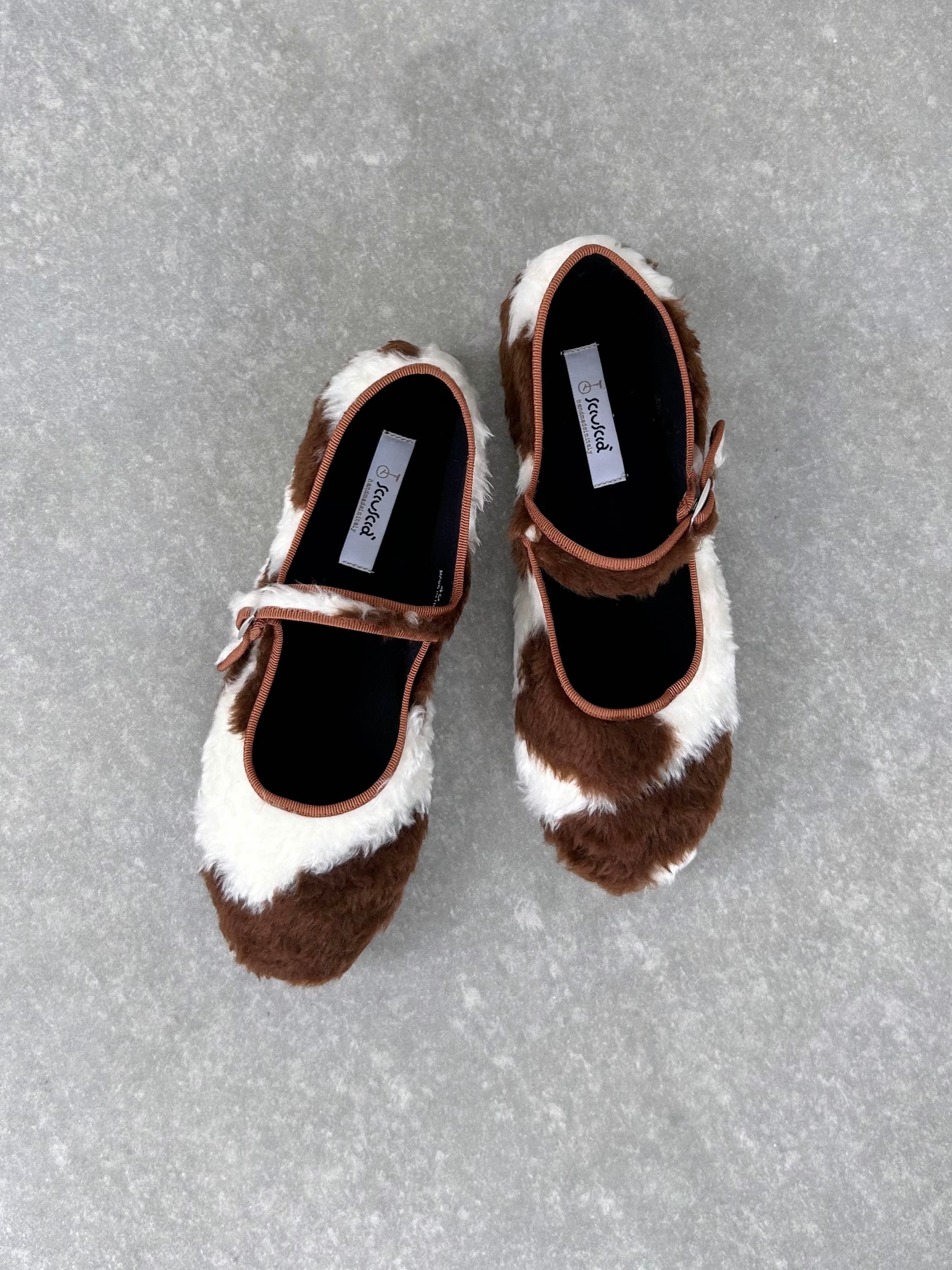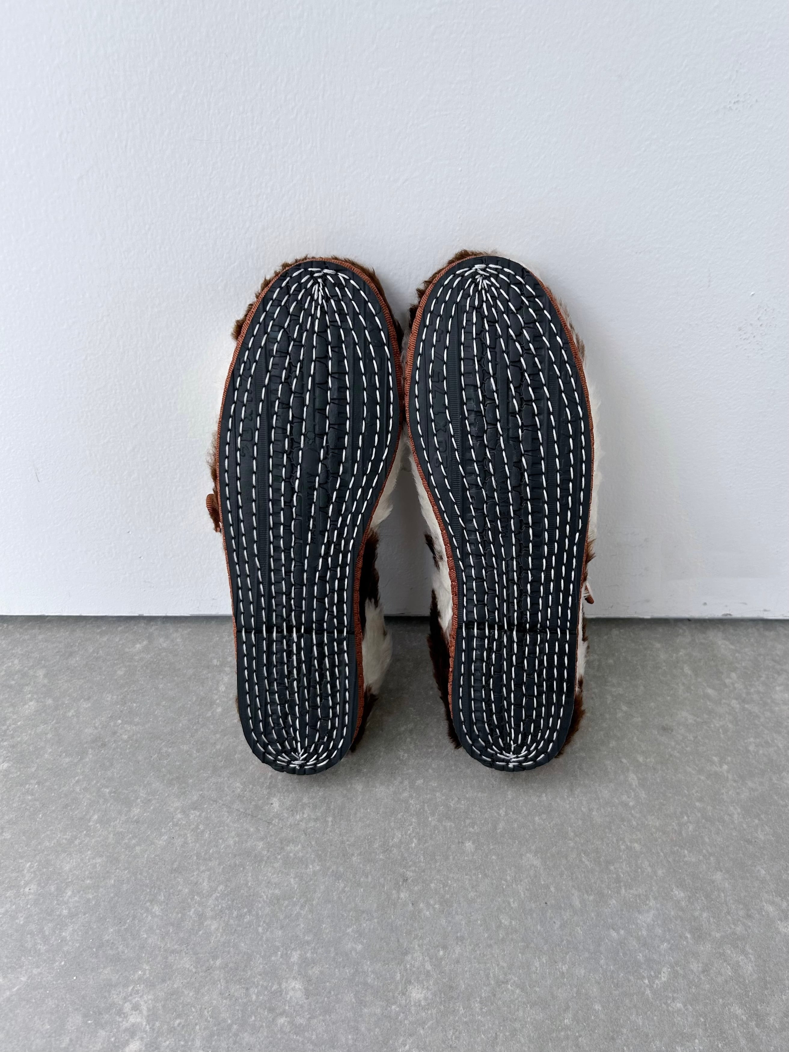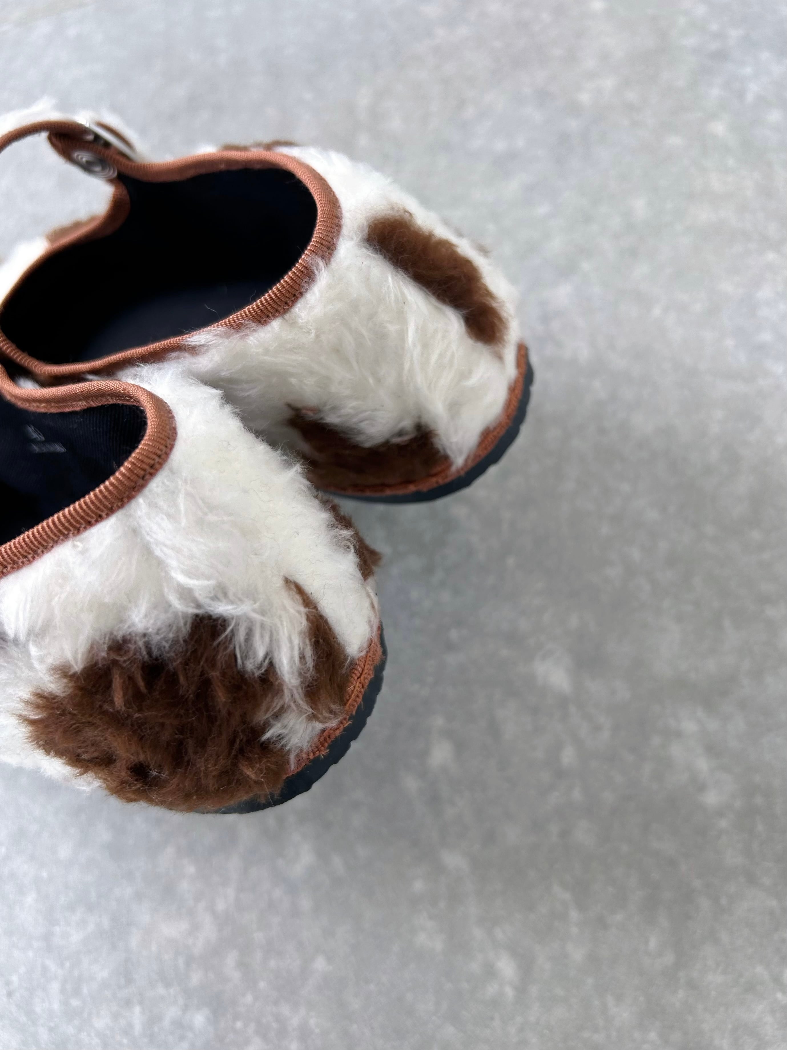 もこもこファーの牛柄シューズ。