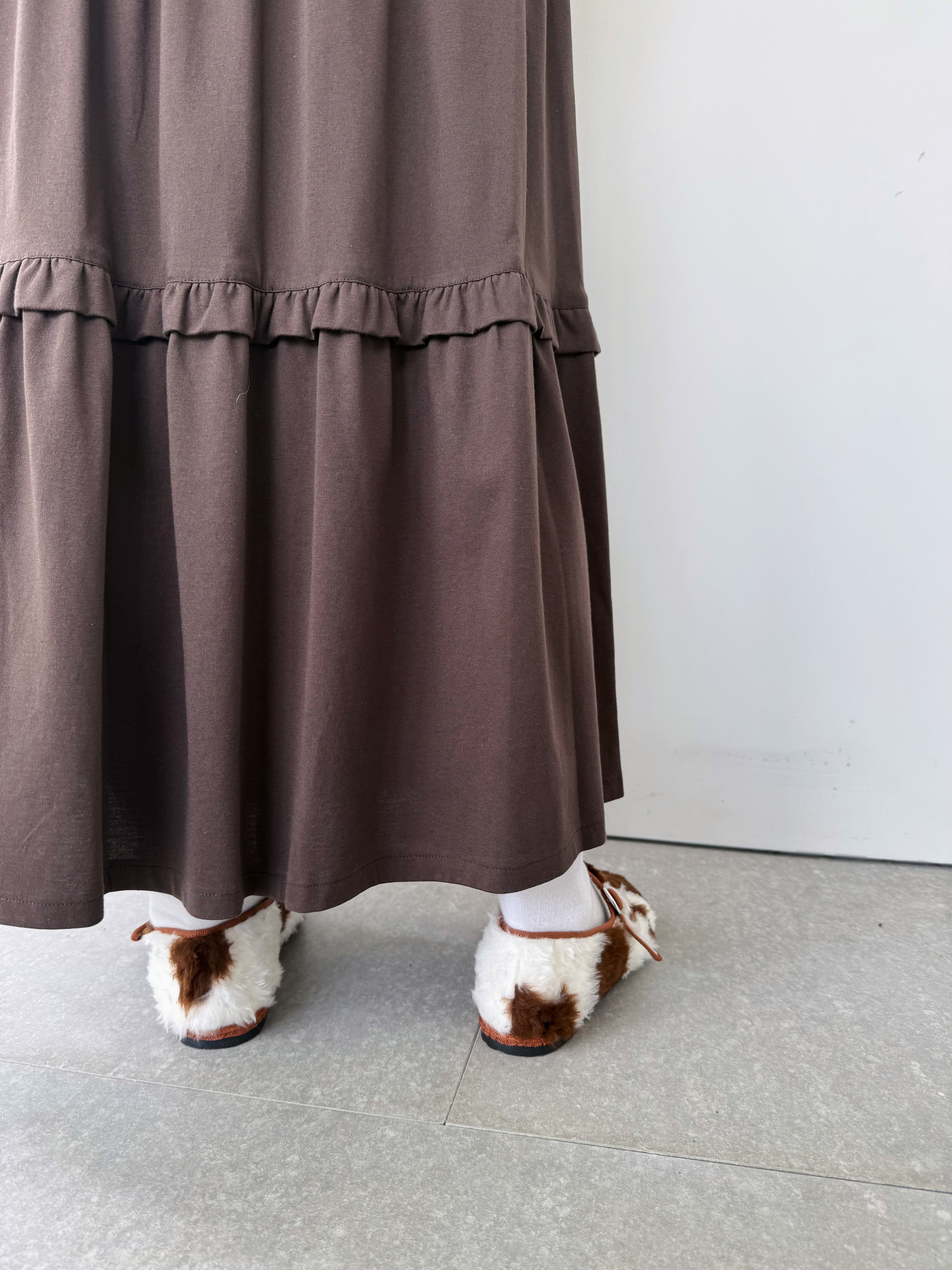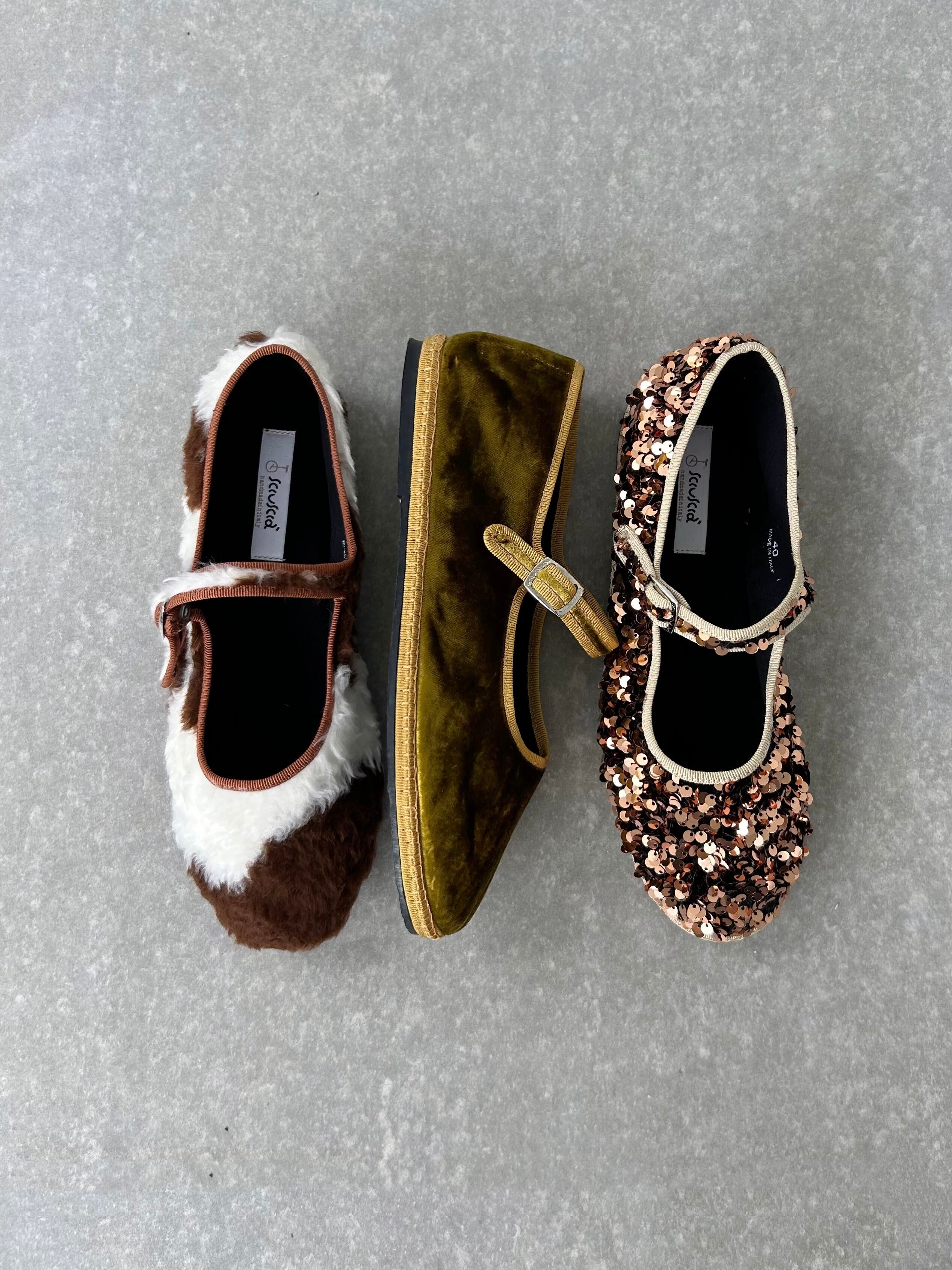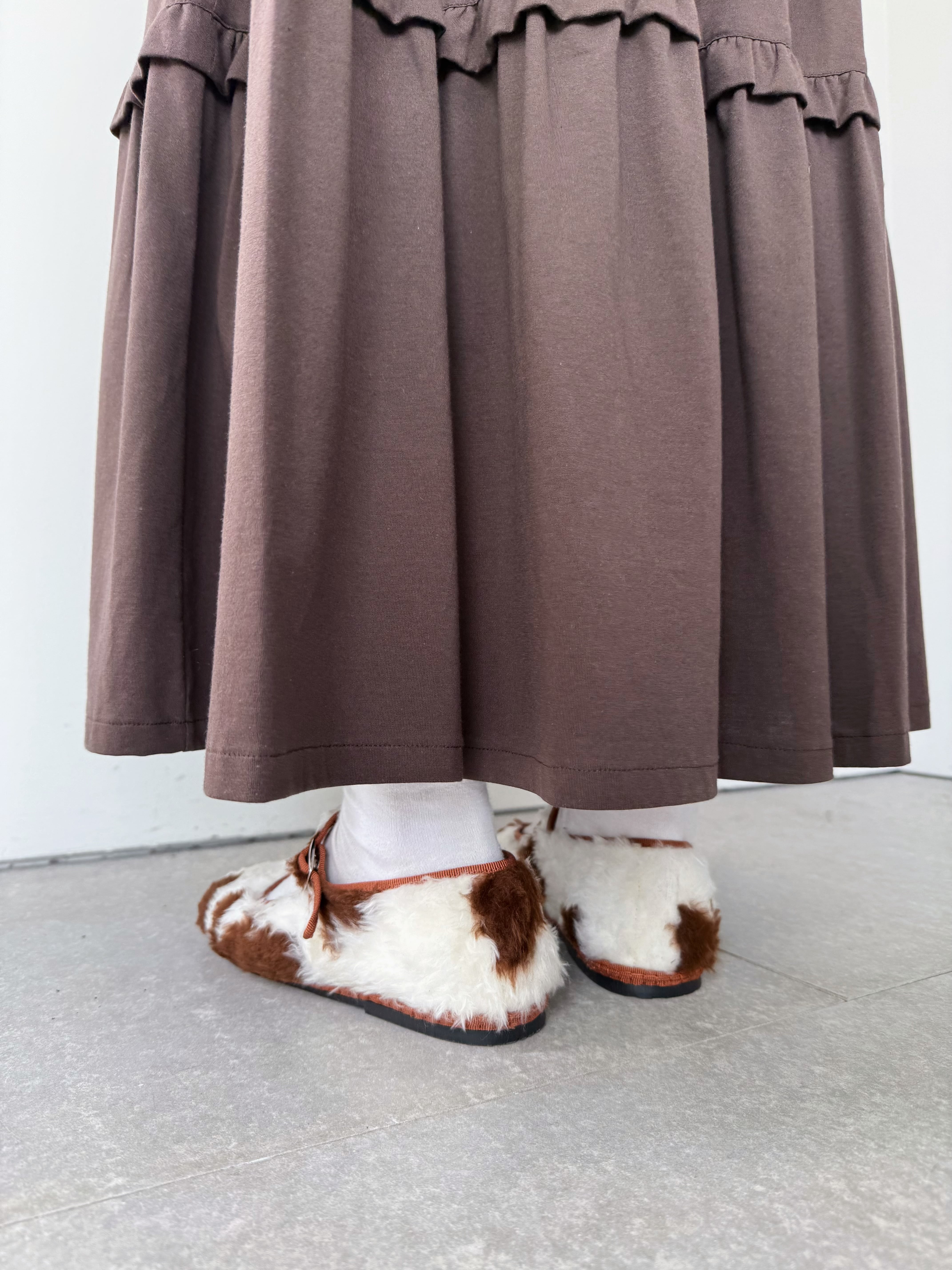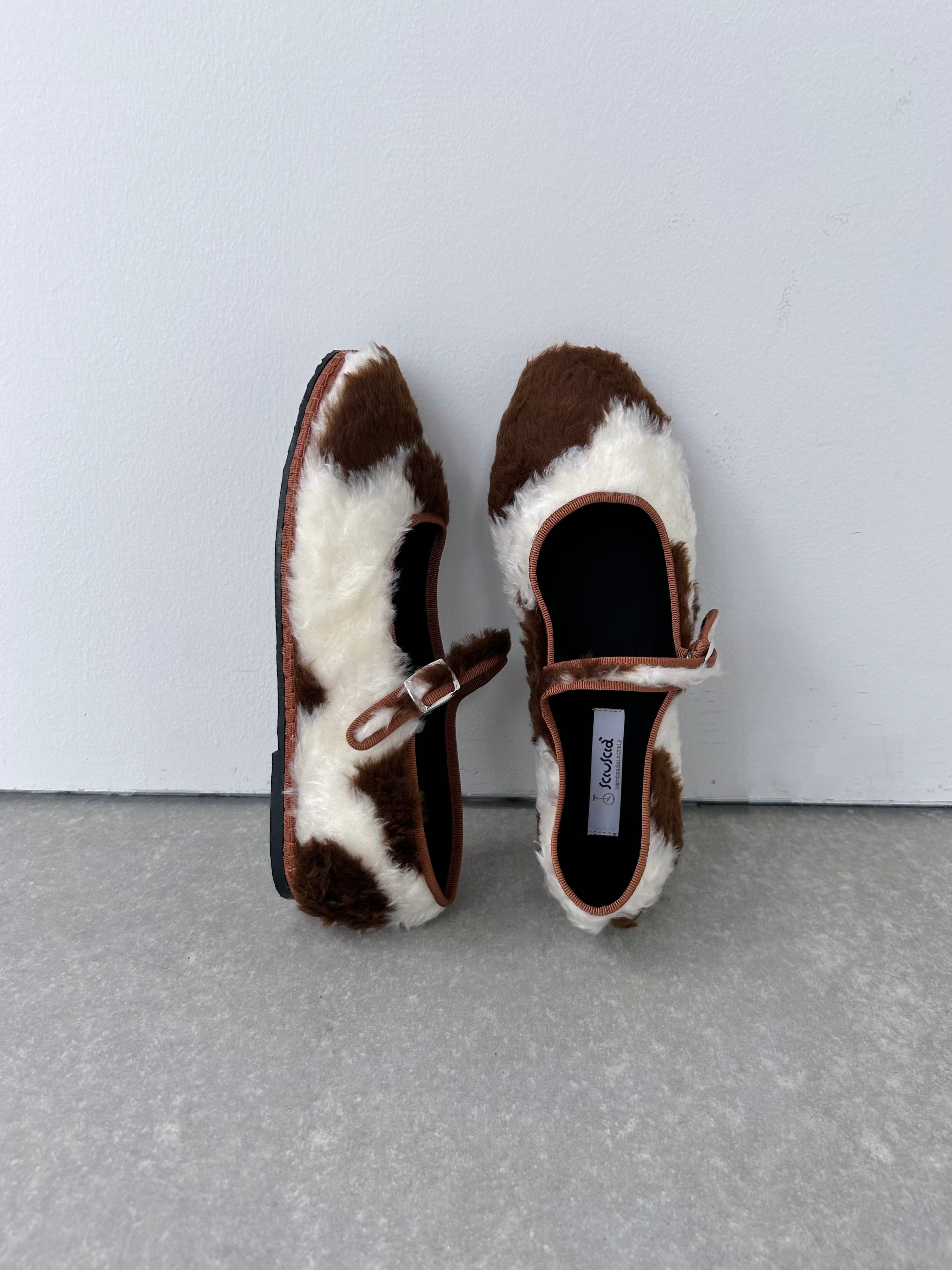 もこもこファーの牛柄シューズ。
