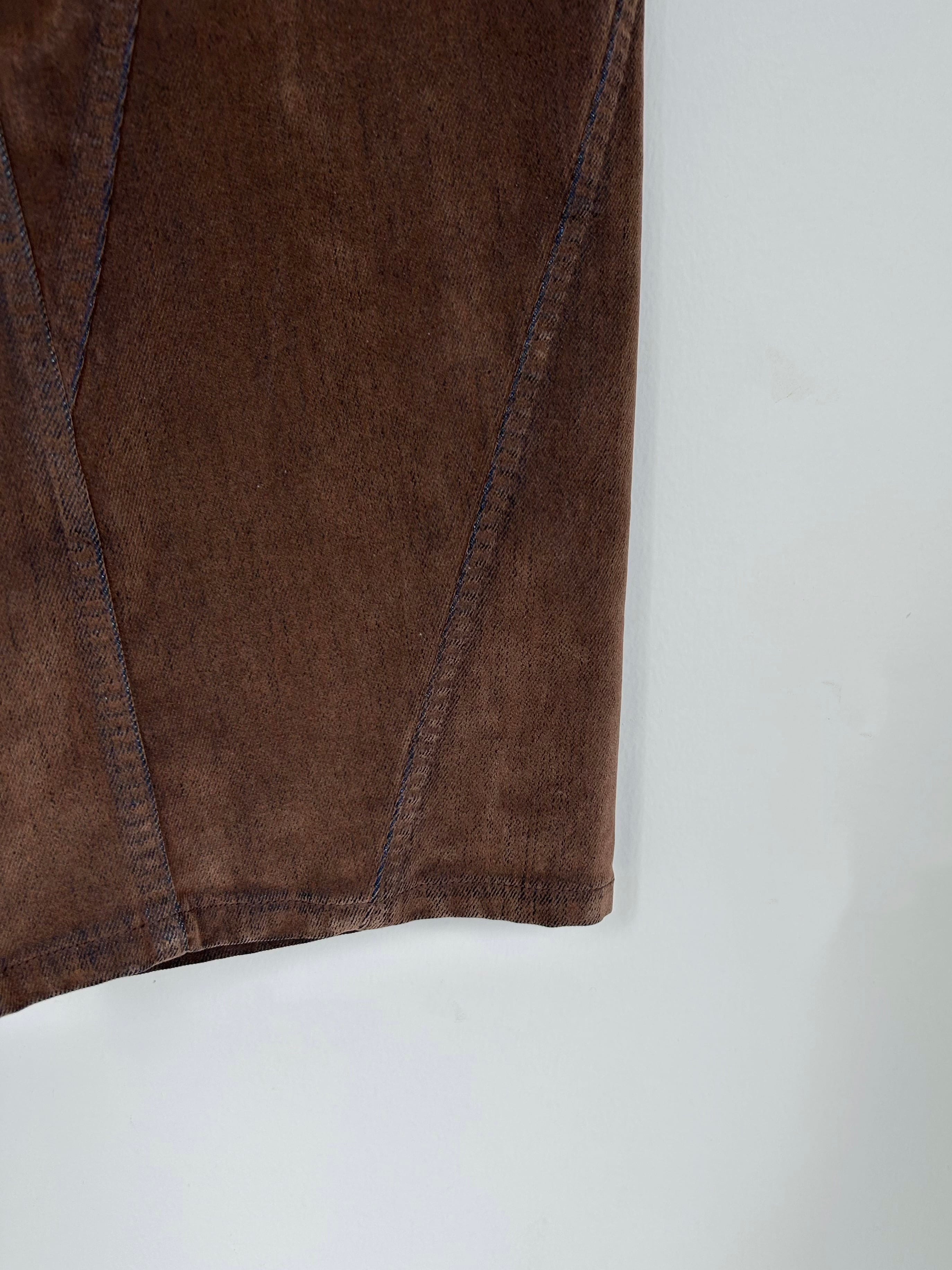 ベロアのような表情のフロッキー加工を施した、バレルシルエットのデニムパンツ。