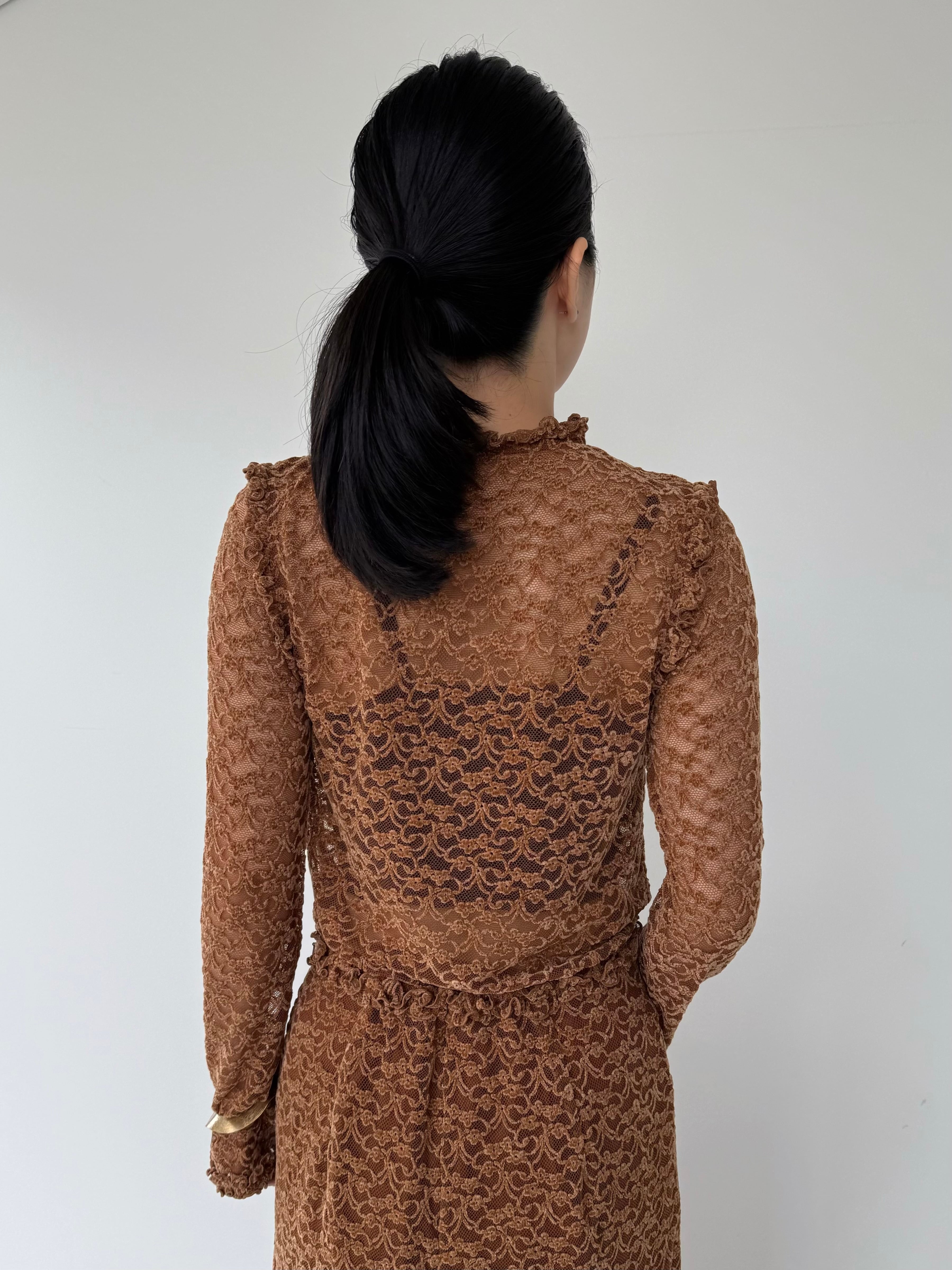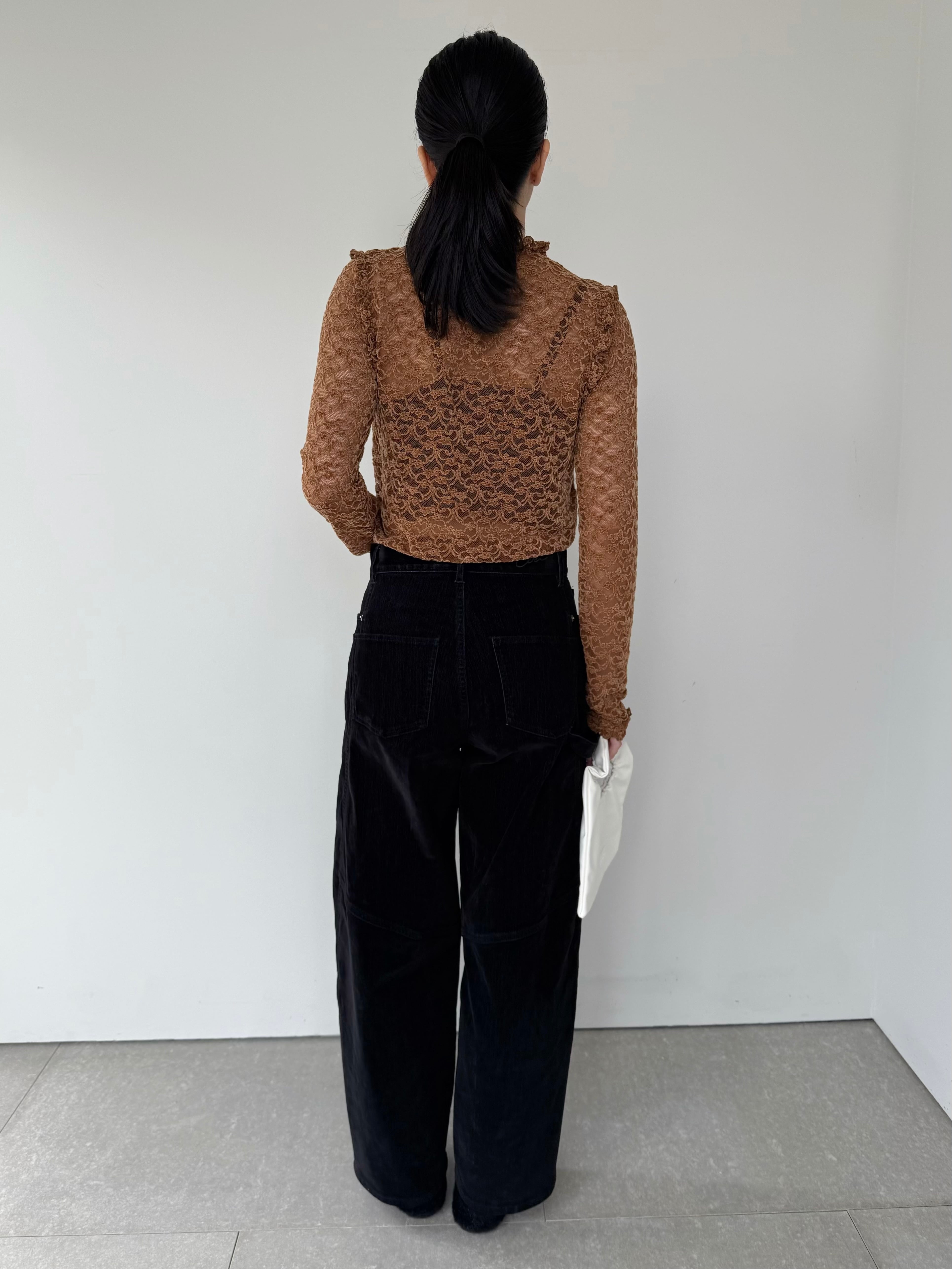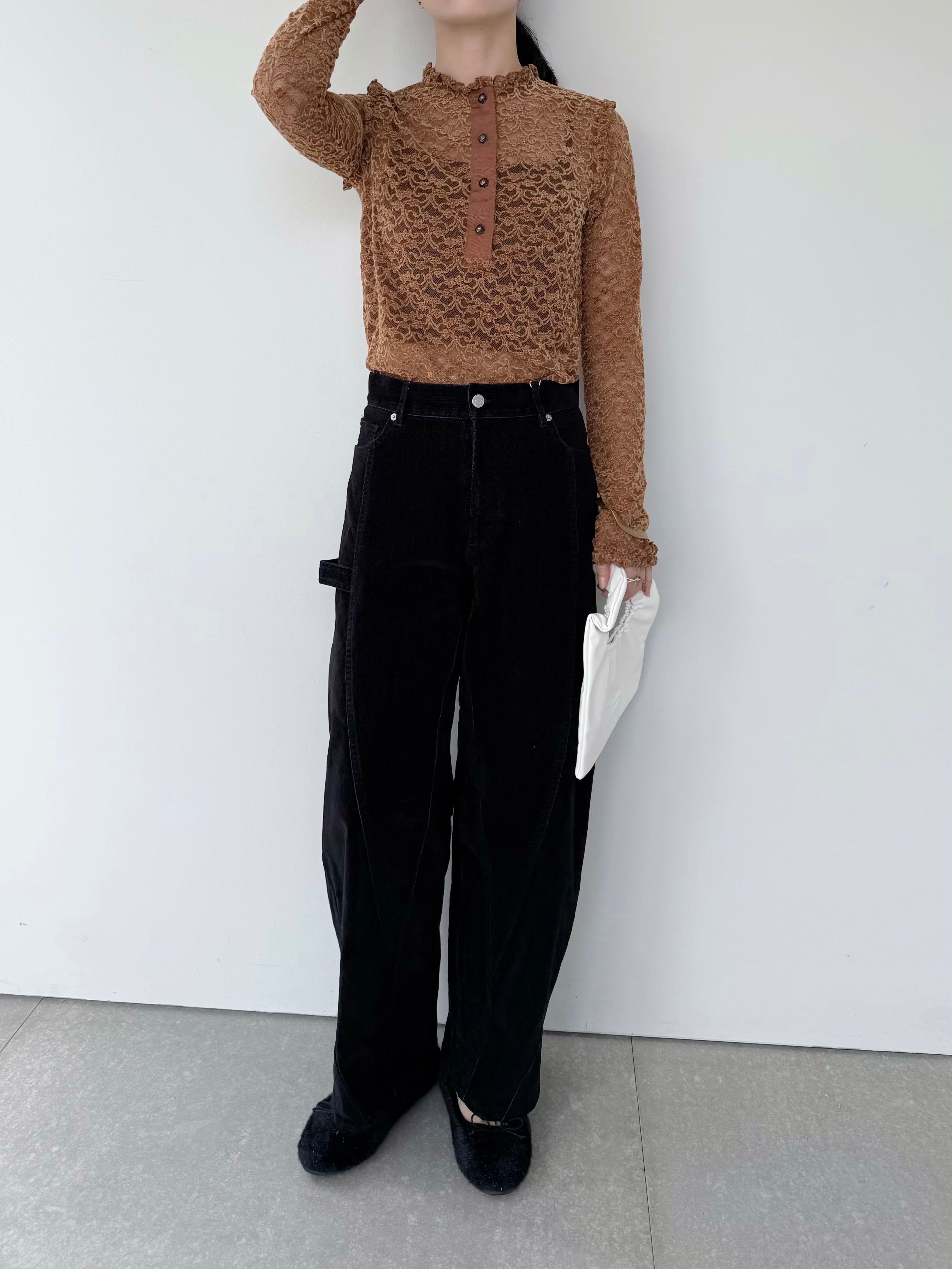 1枚できてもサマになるように、フロントにあきを作ったり、肩や袖口にミニフリルを施したりとこだわりのディテールが施されたデザイントップス。