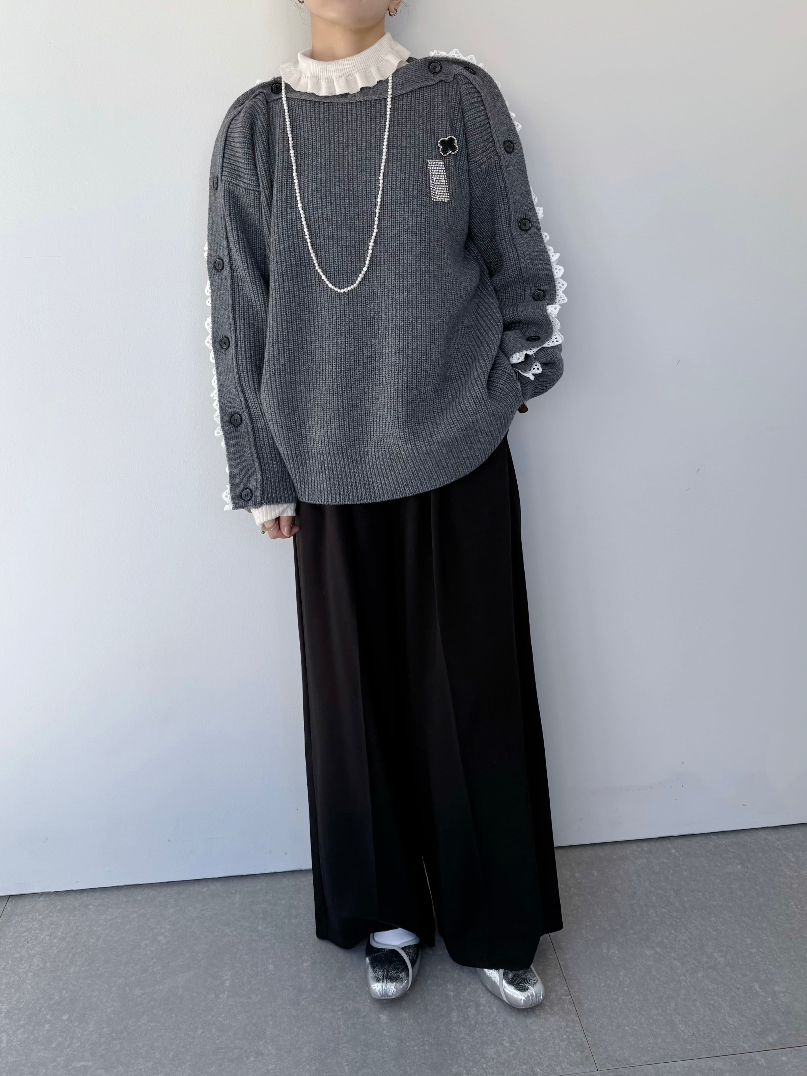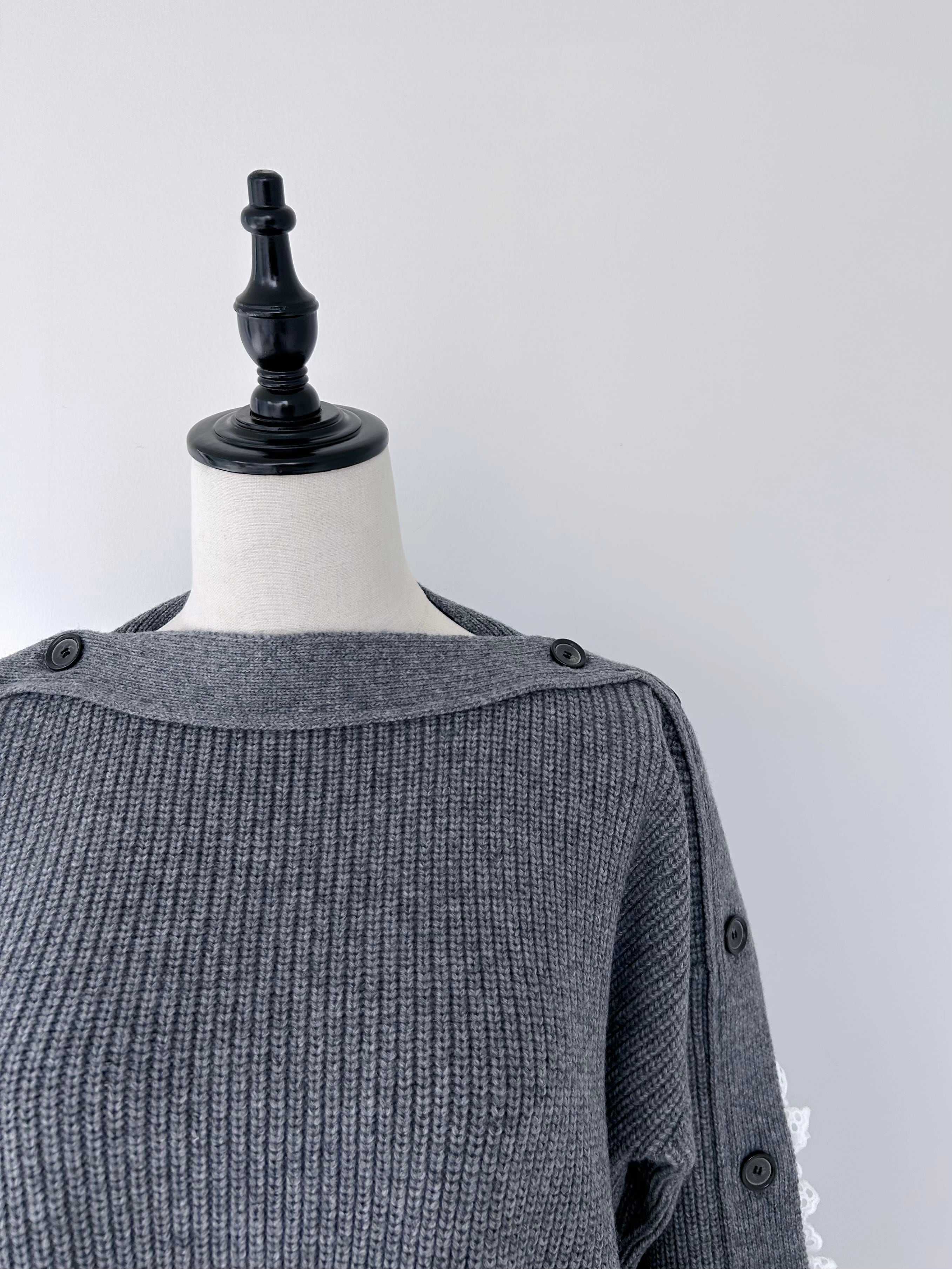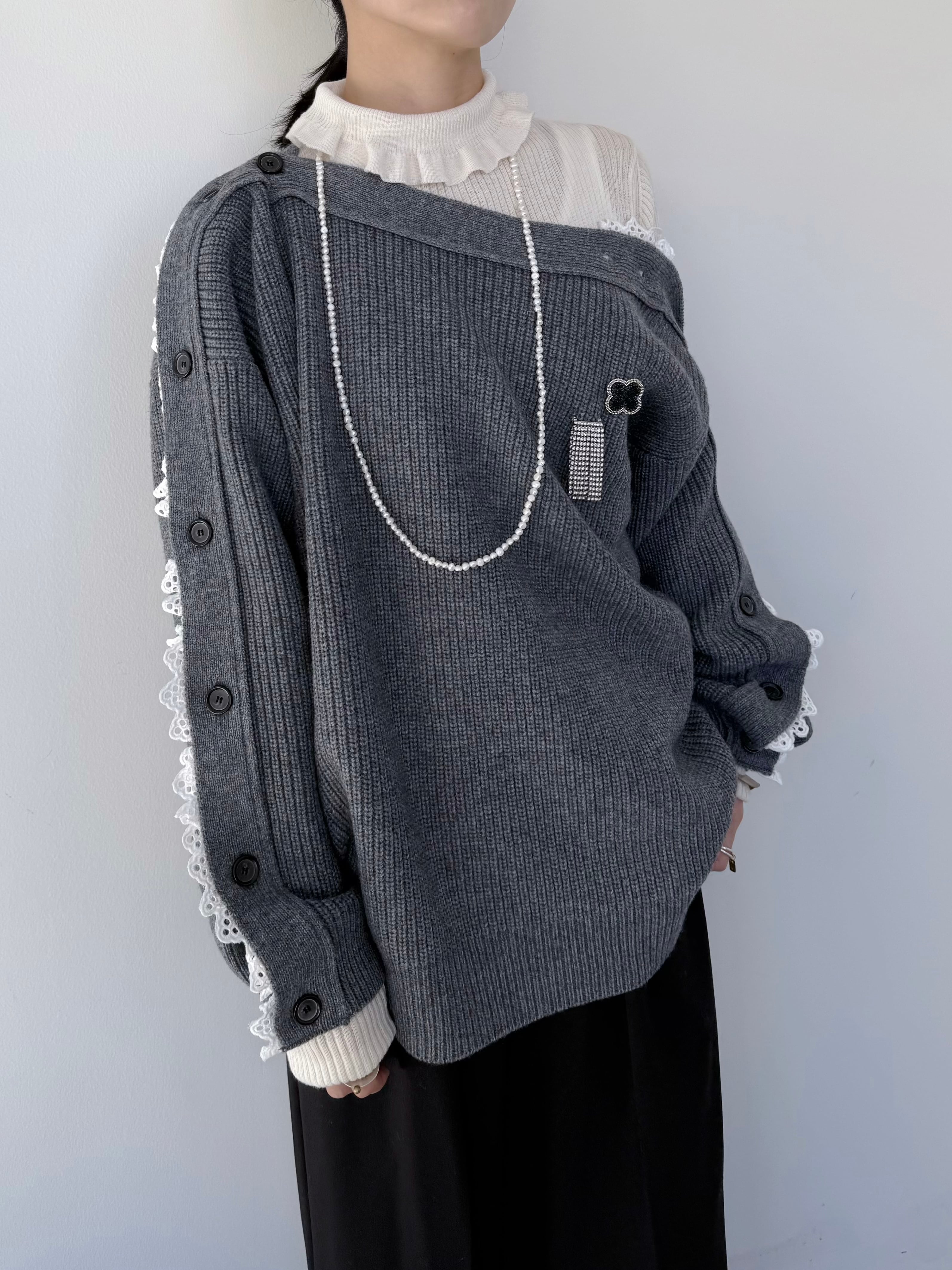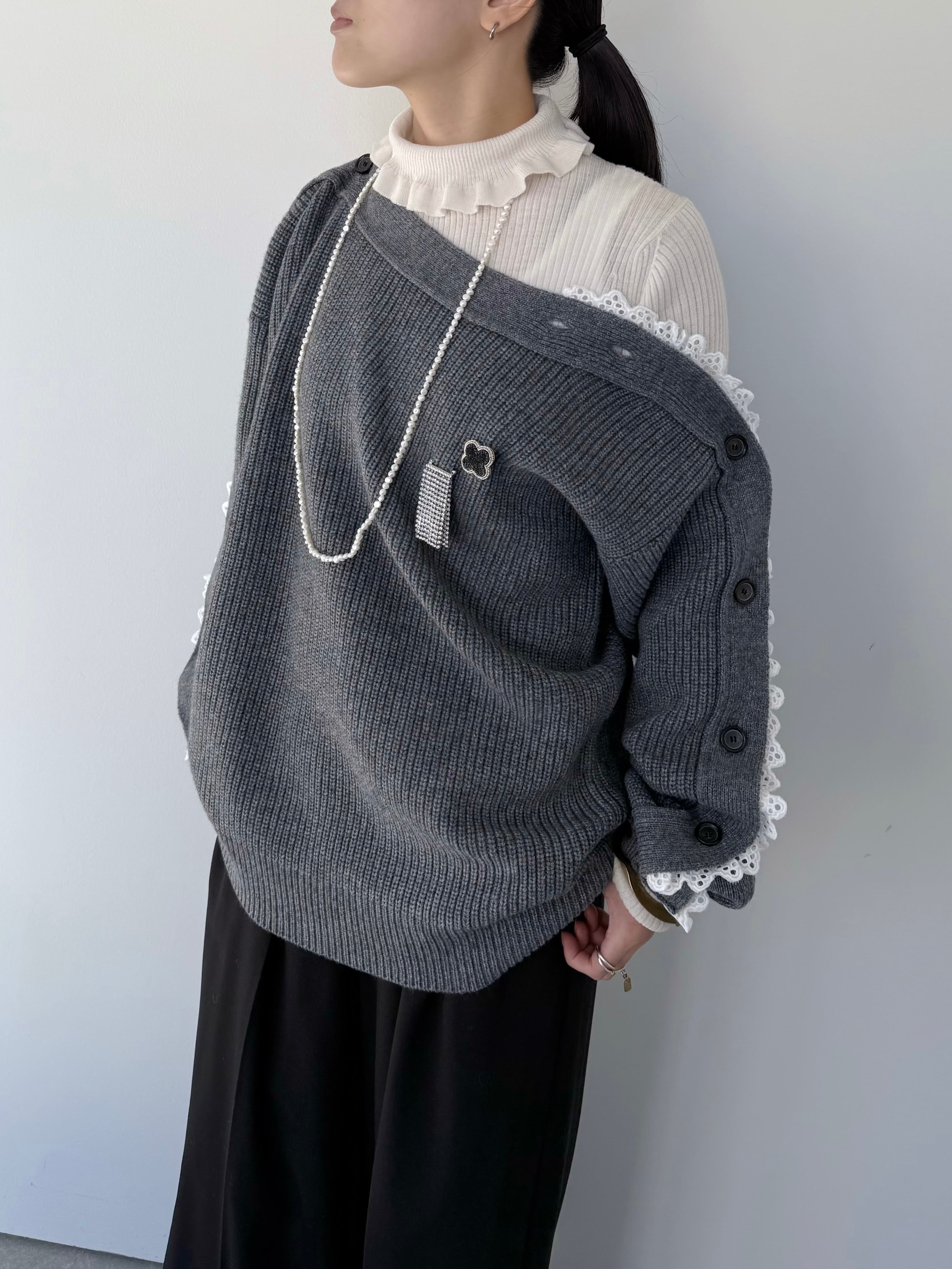 釦を全て閉じてモックネック風に、釦を1箇所外してボートネック、2箇所外すとオフショルとして着用可能なアイテム。