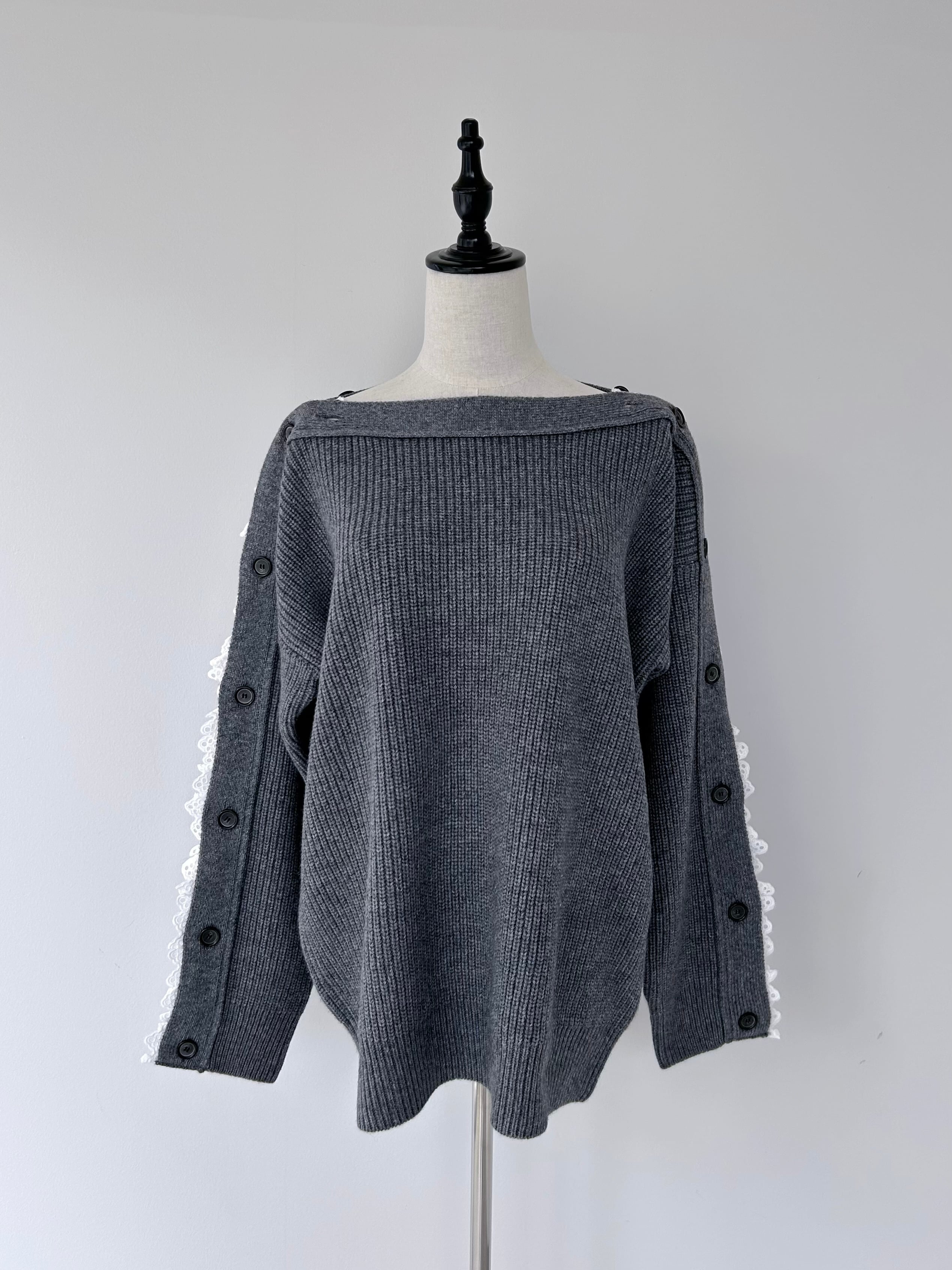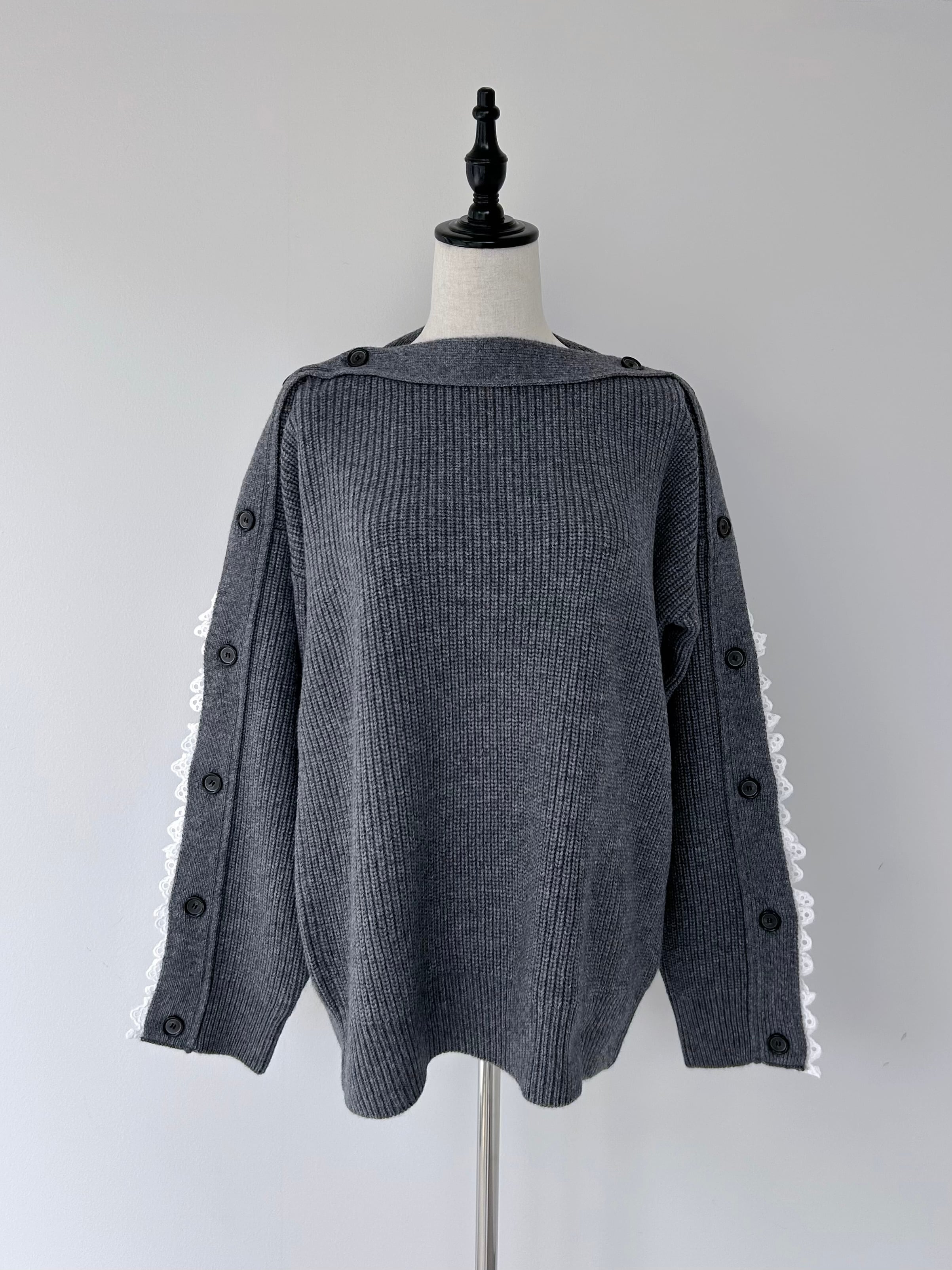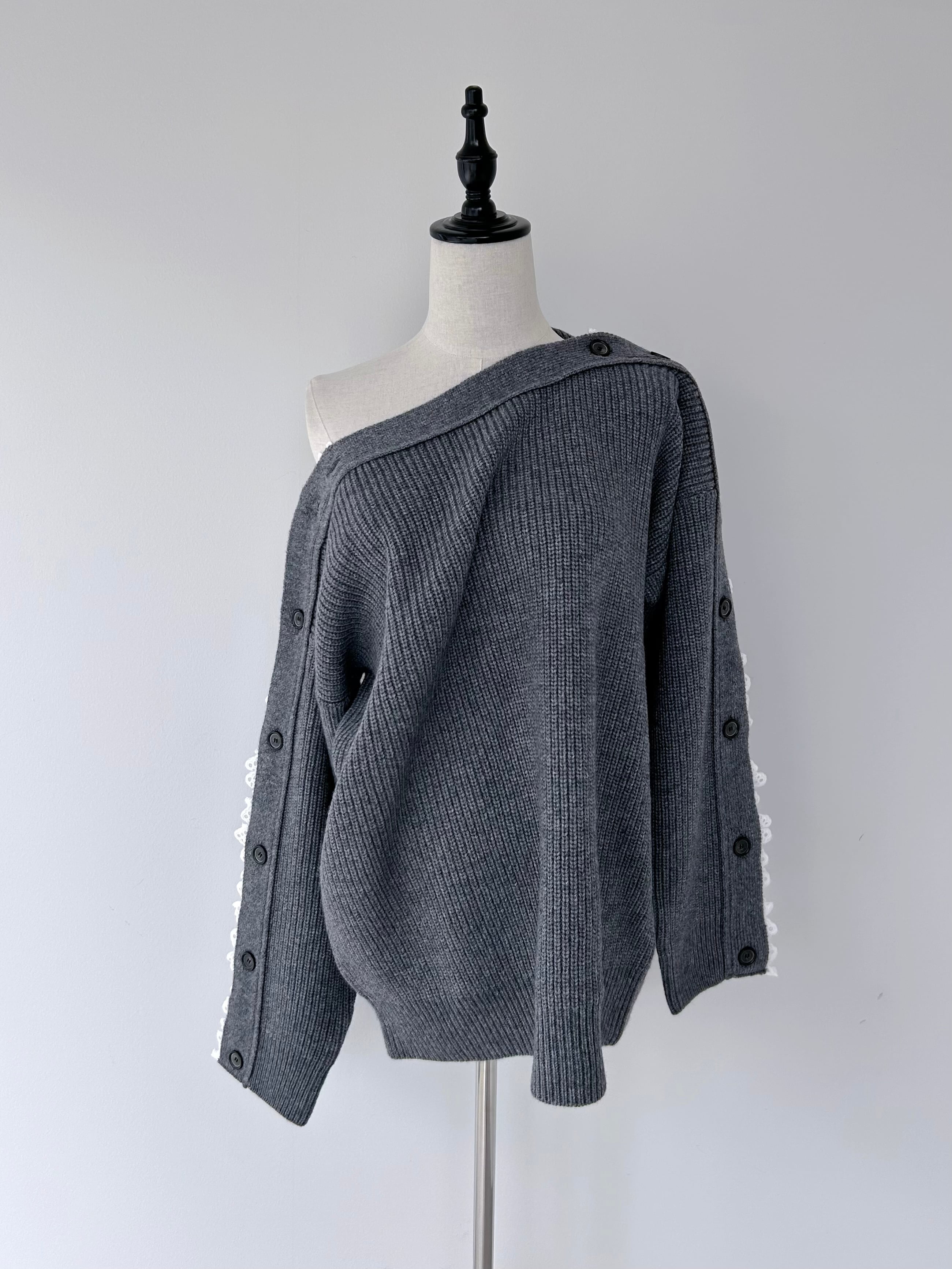 釦を全て閉じてモックネック風に、釦を1箇所外してボートネック、2箇所外すとオフショルとして着用可能なアイテム。