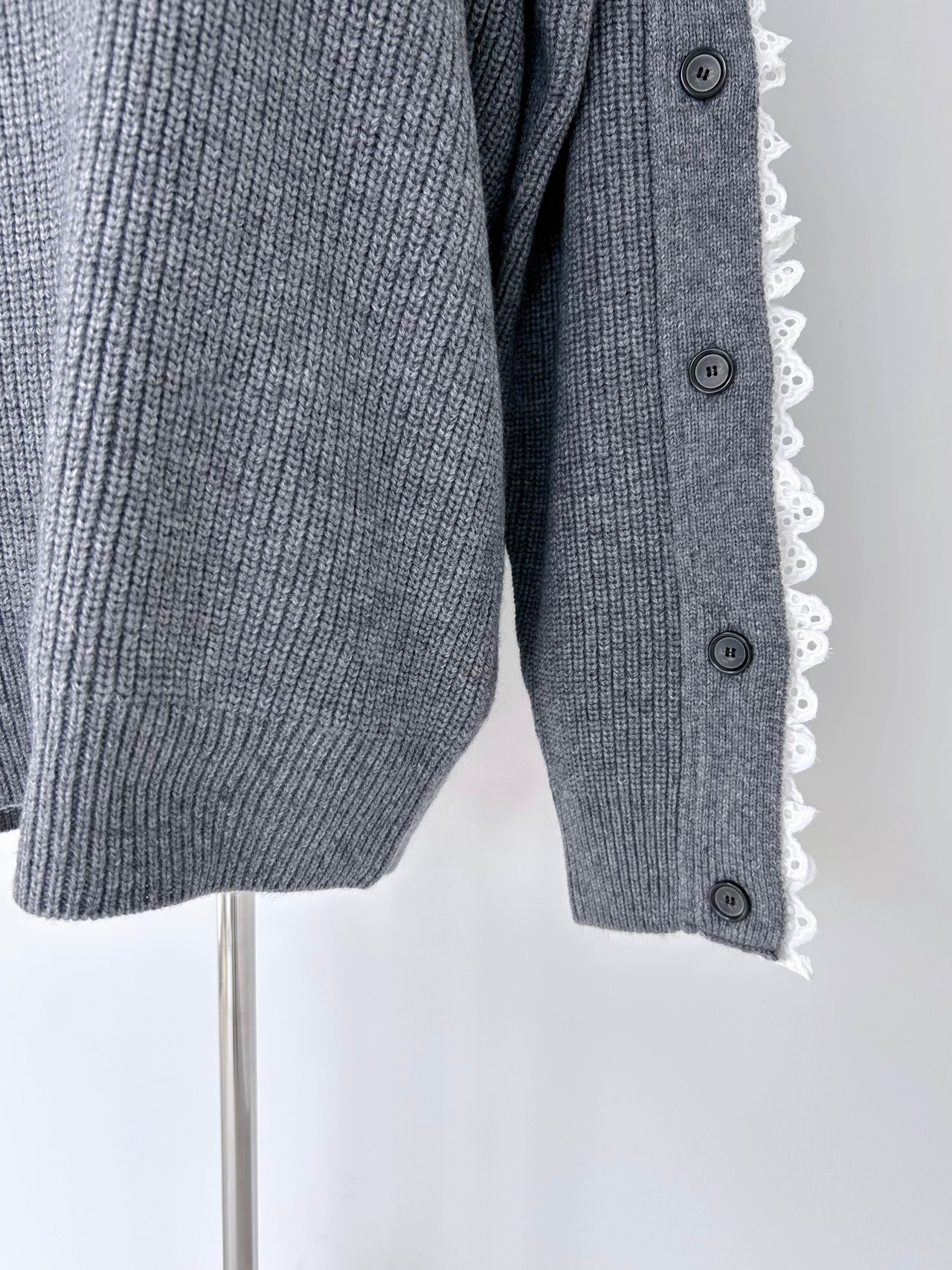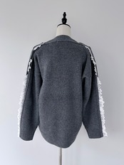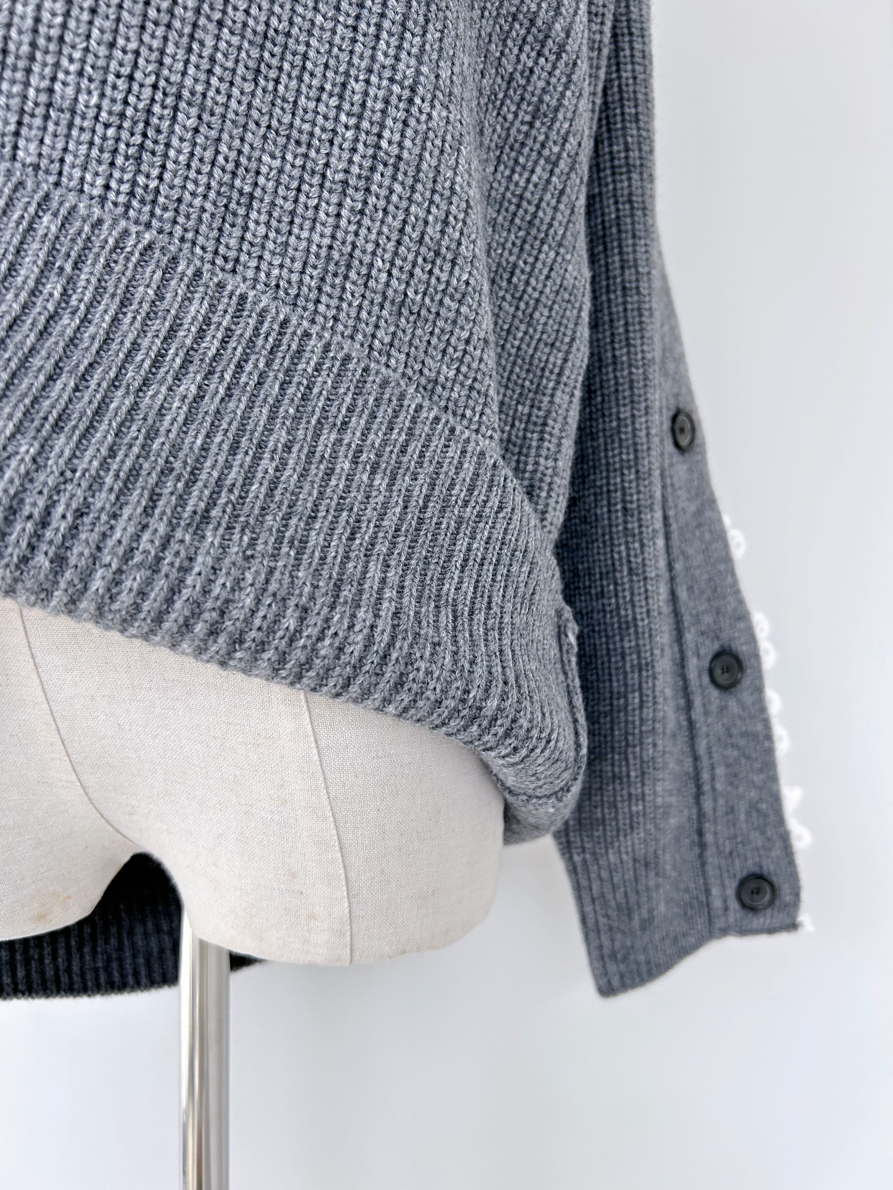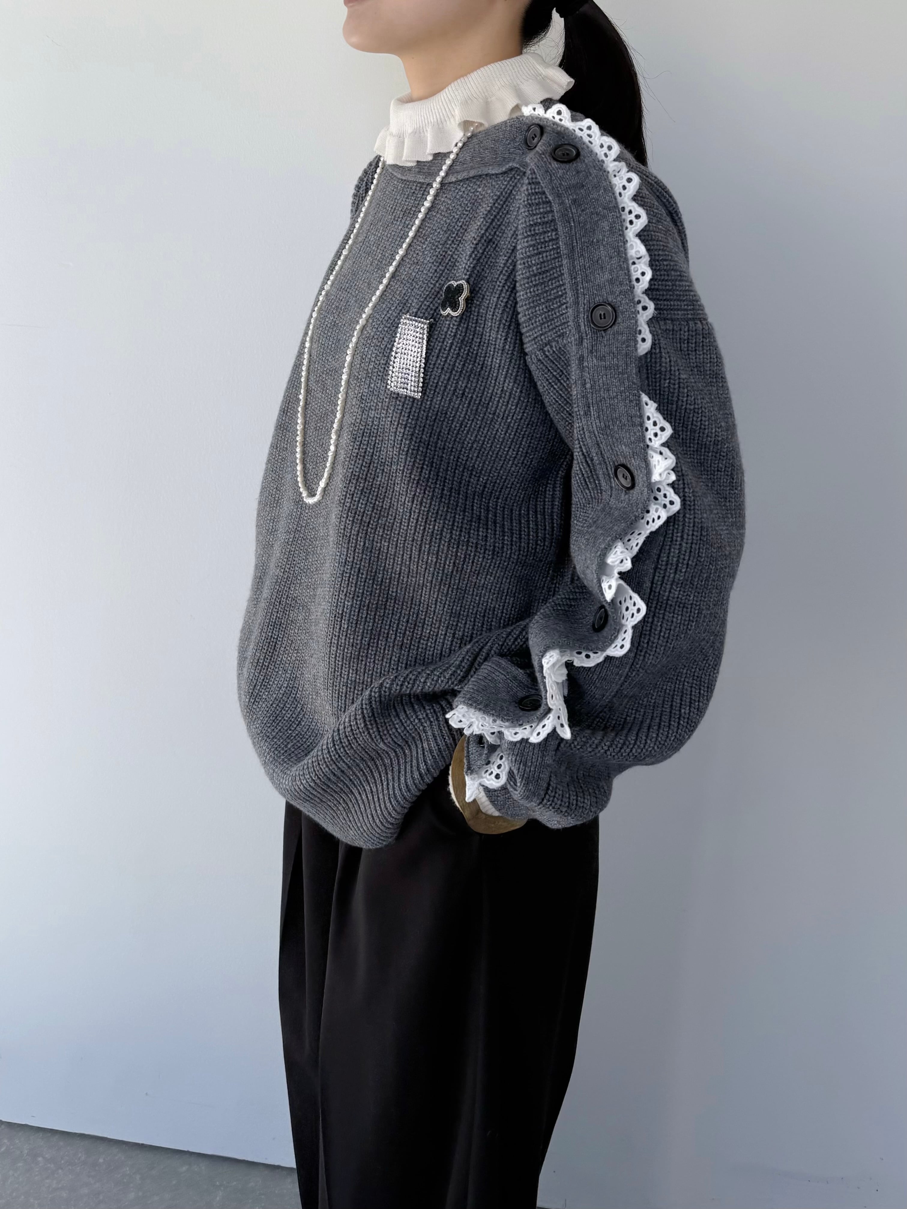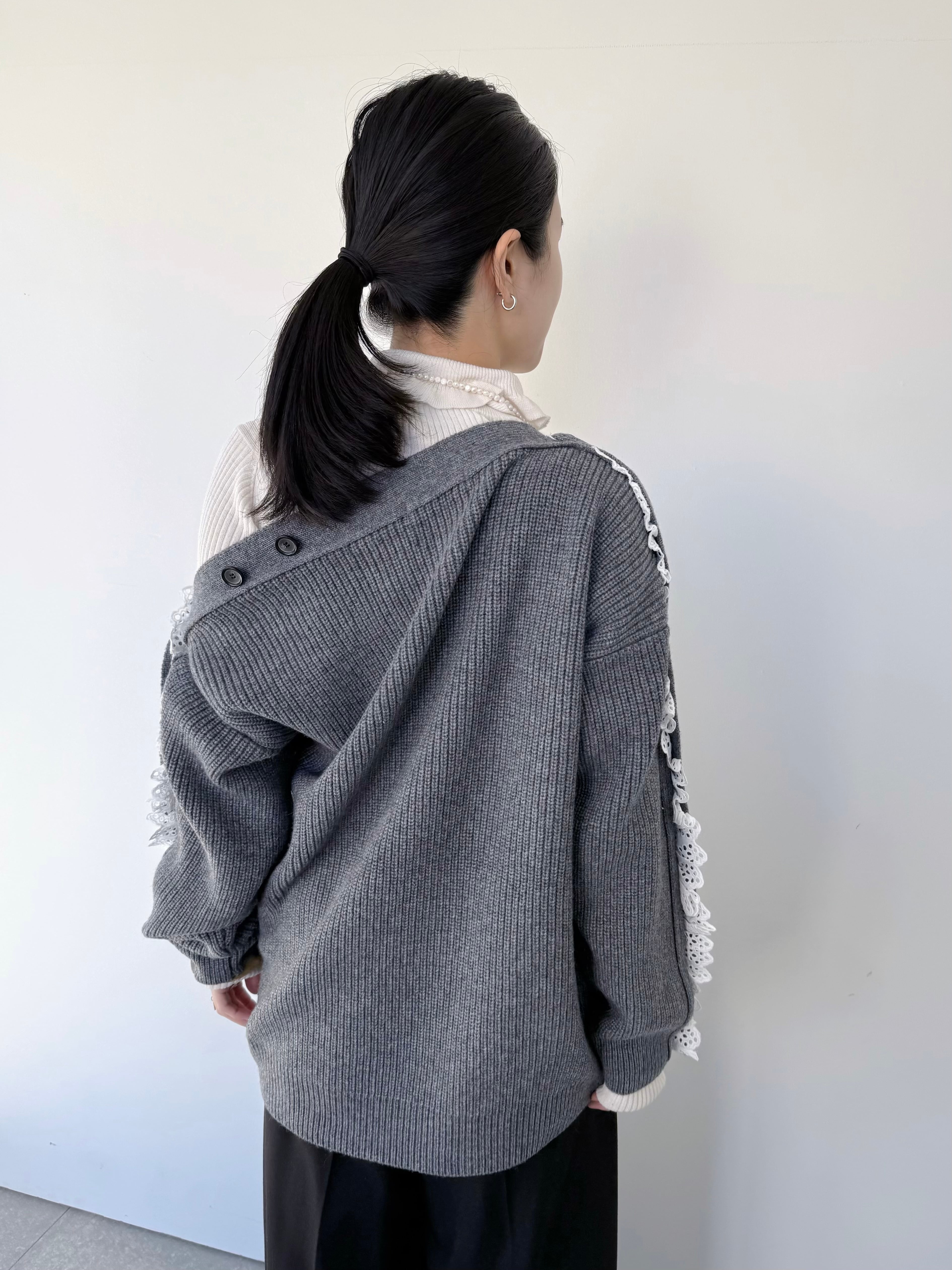 釦を全て閉じてモックネック風に、釦を1箇所外してボートネック、2箇所外すとオフショルとして着用可能なアイテム。