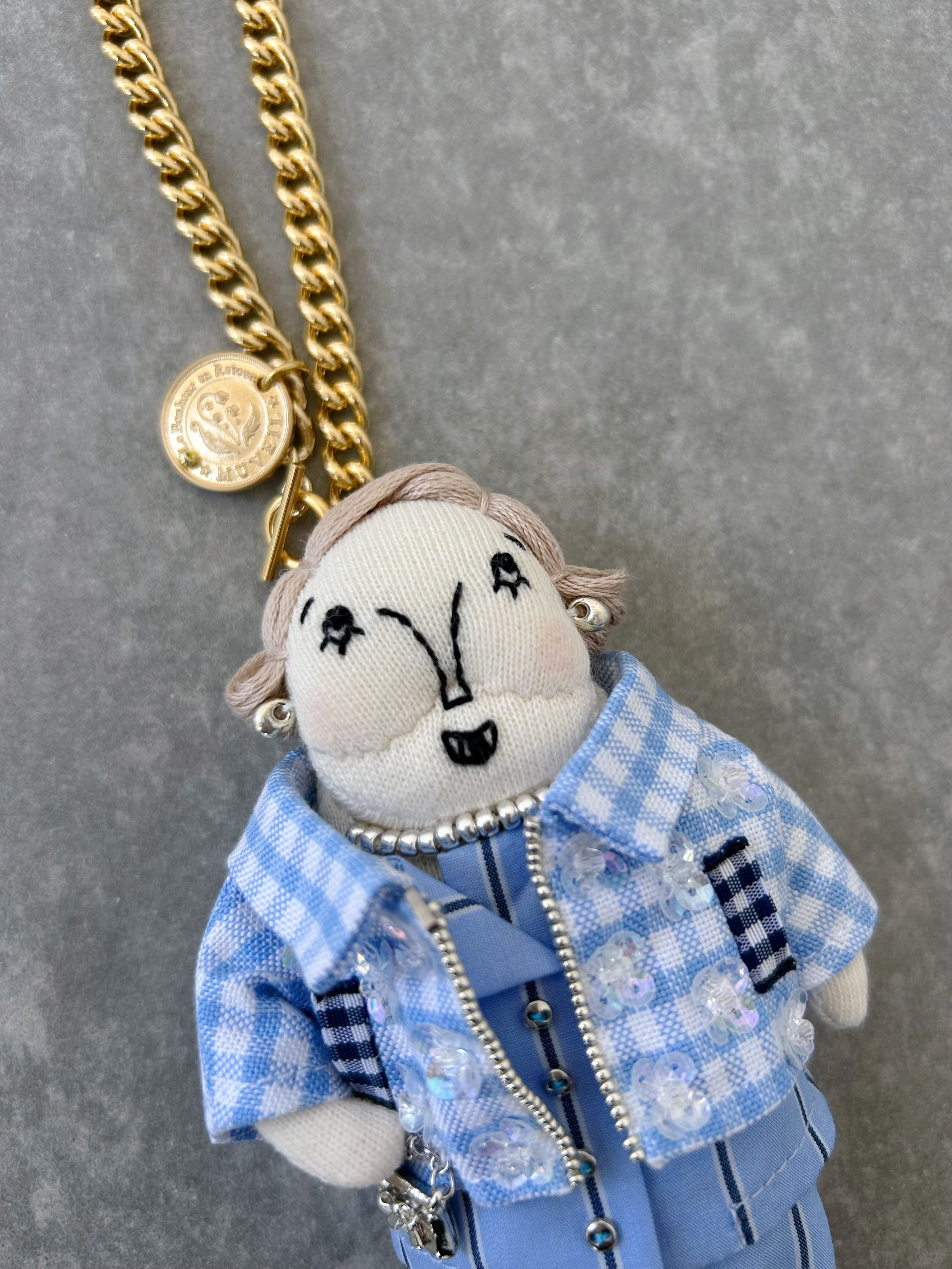 Lilyと同様、ビーズで表現したファスナーもこだわりポイントです。ボーダートップスは、細いベロアテープでボーダーを作り、その上にビーズをのせて華やかにしています。春らしさのあるカゴバッグはメッシュのテープを使用して再現。イヤリングはお花をたたせて立体感を出しています。デニムパンツは派手になりすぎないように、透明のパーツを選びました。