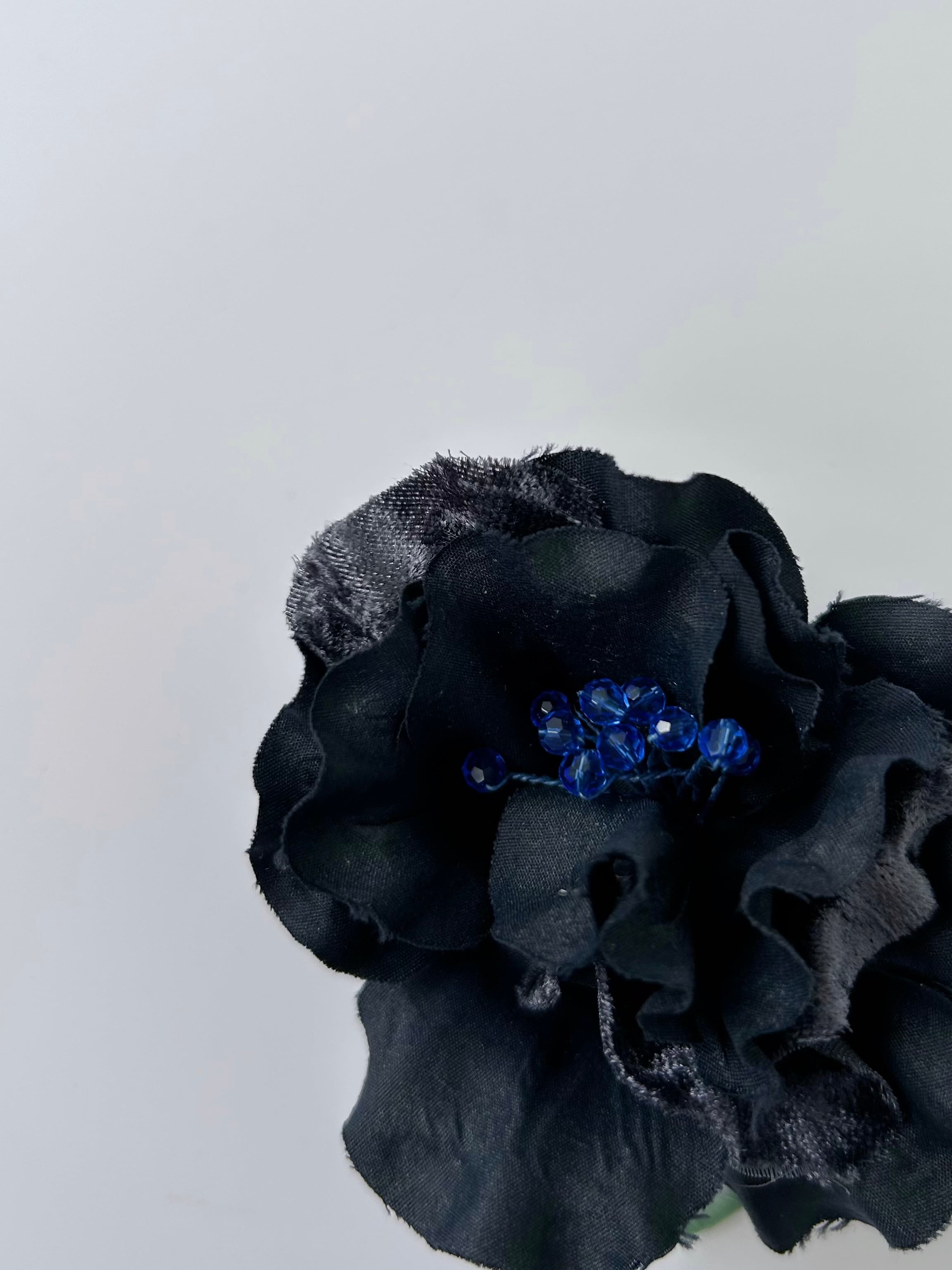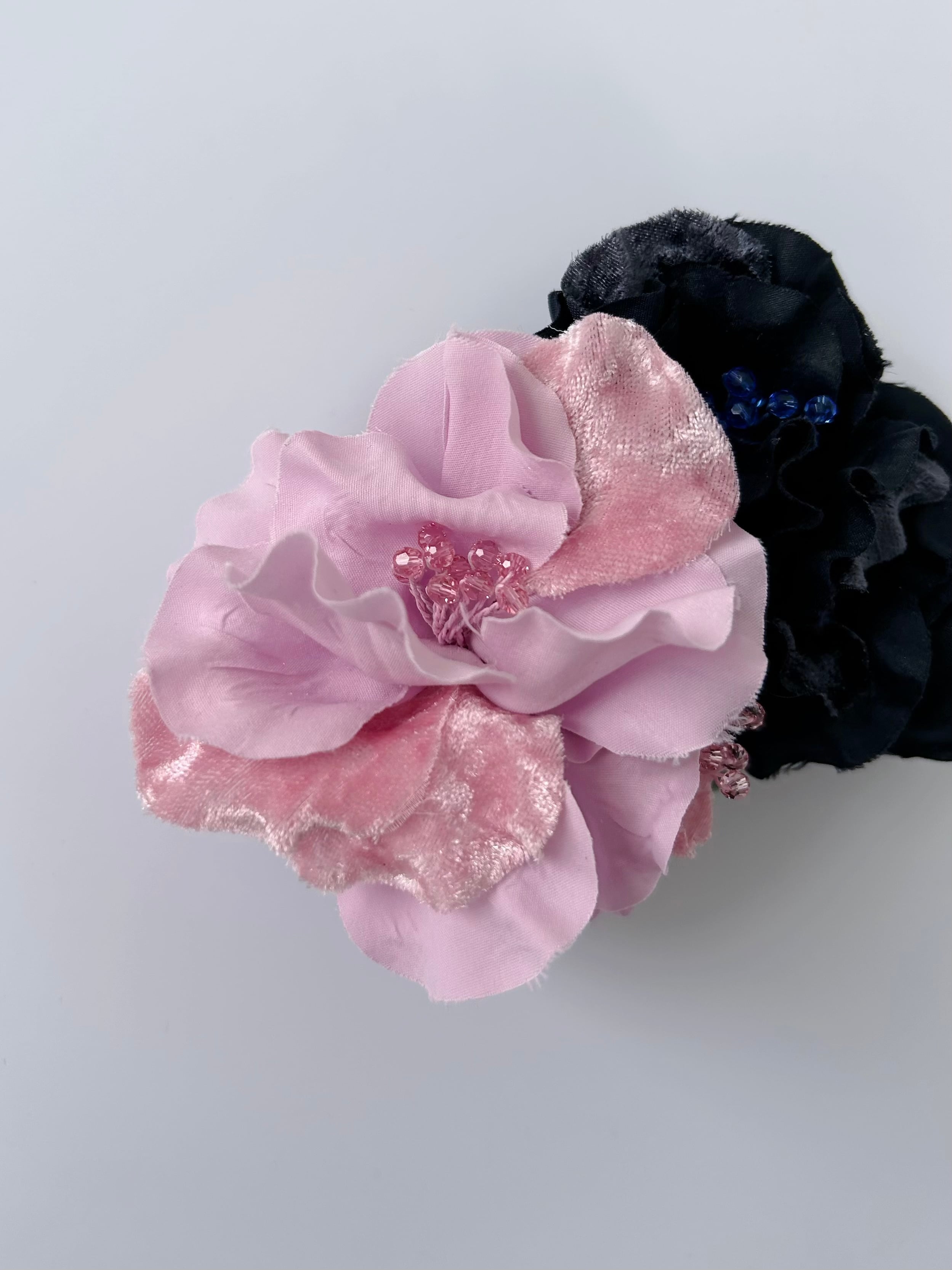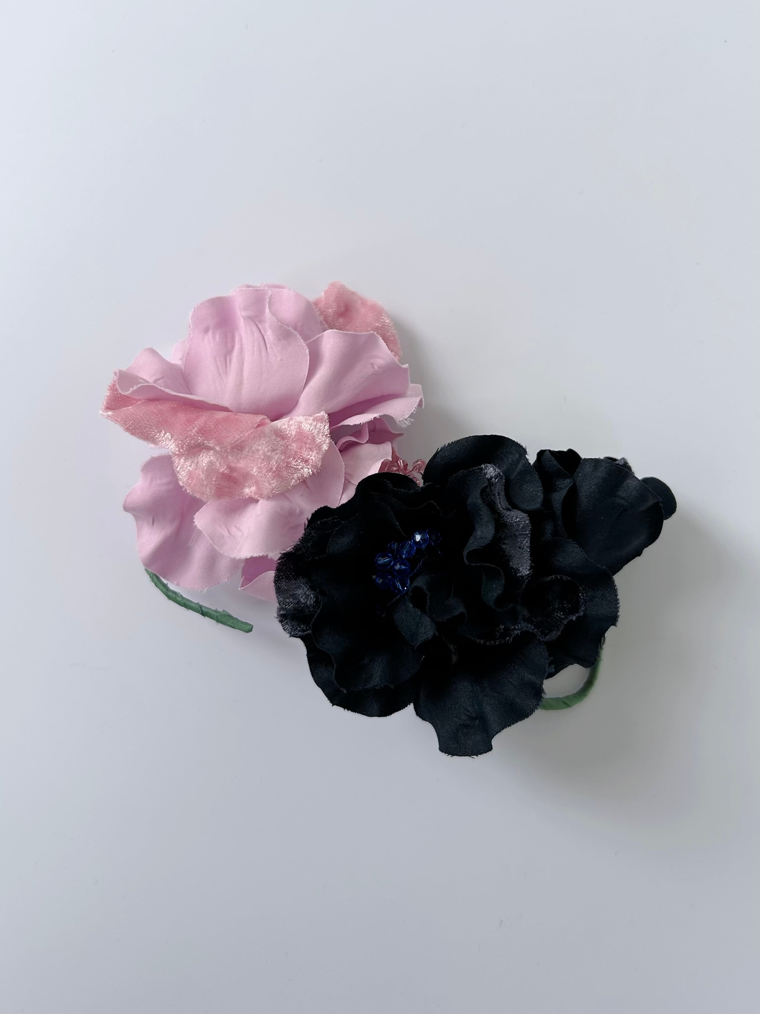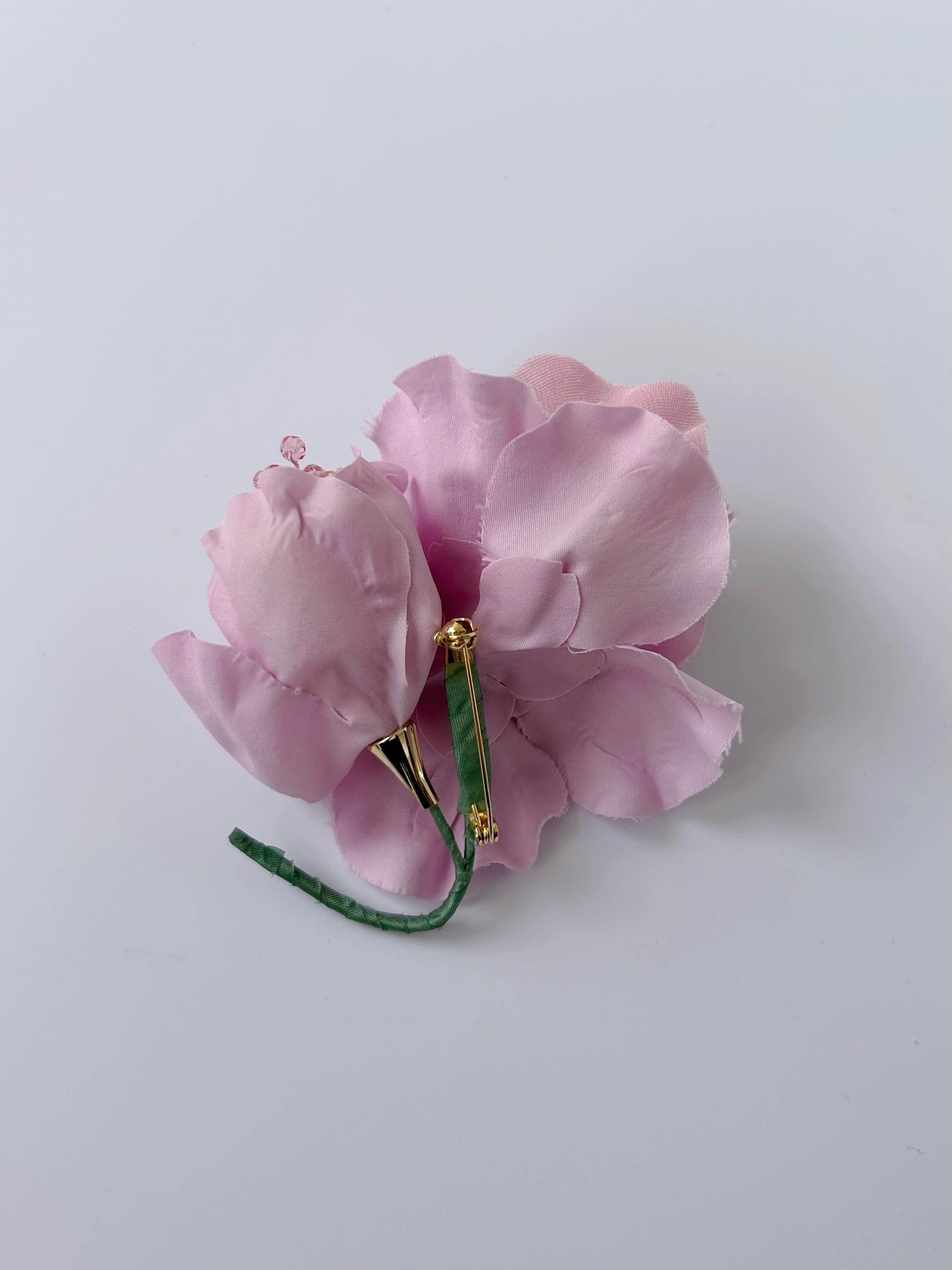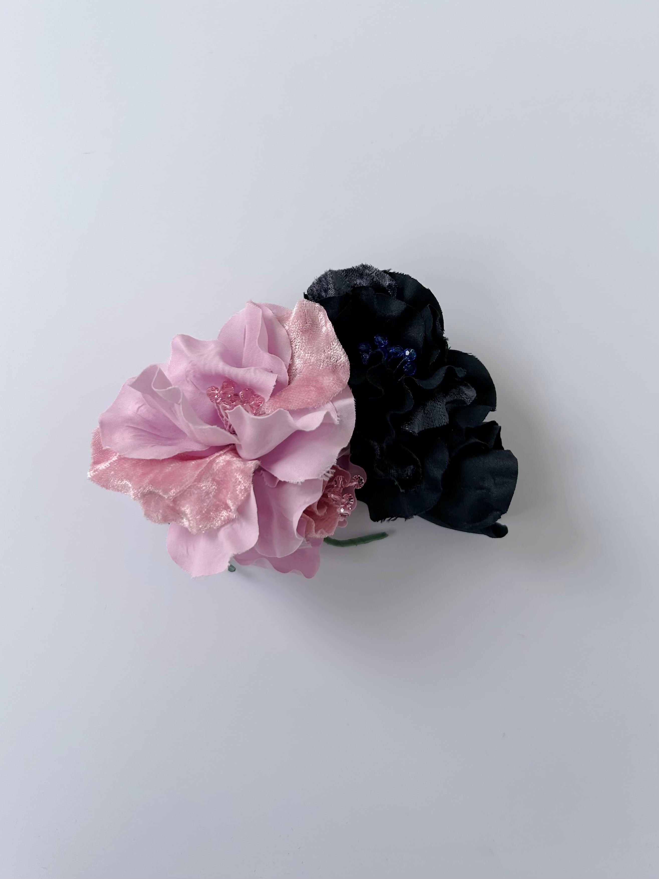 レザーライクサテンのお花にキラキラとした花粉のビーズ、つぼみの根本にゴールドの金具を使用。
