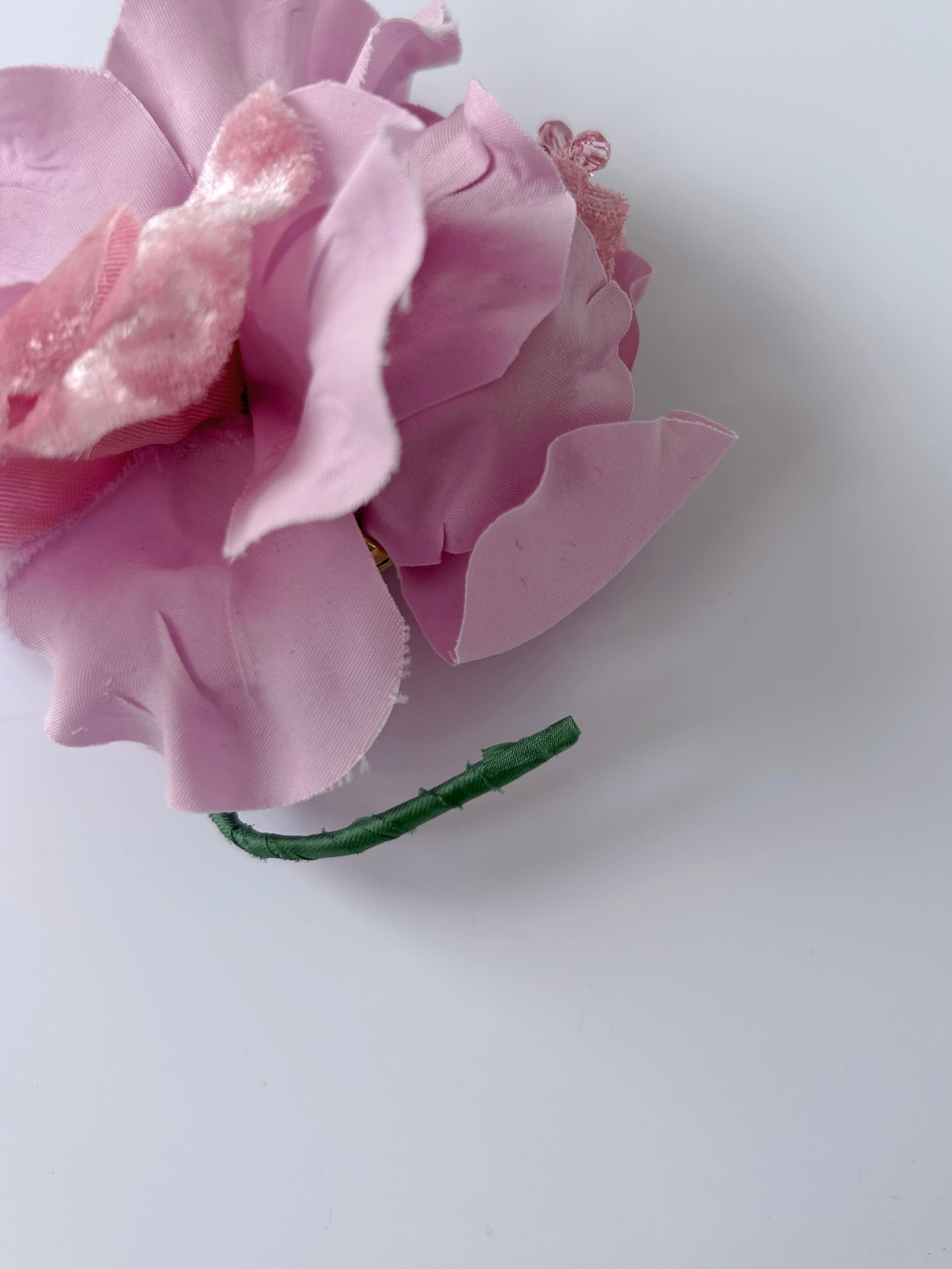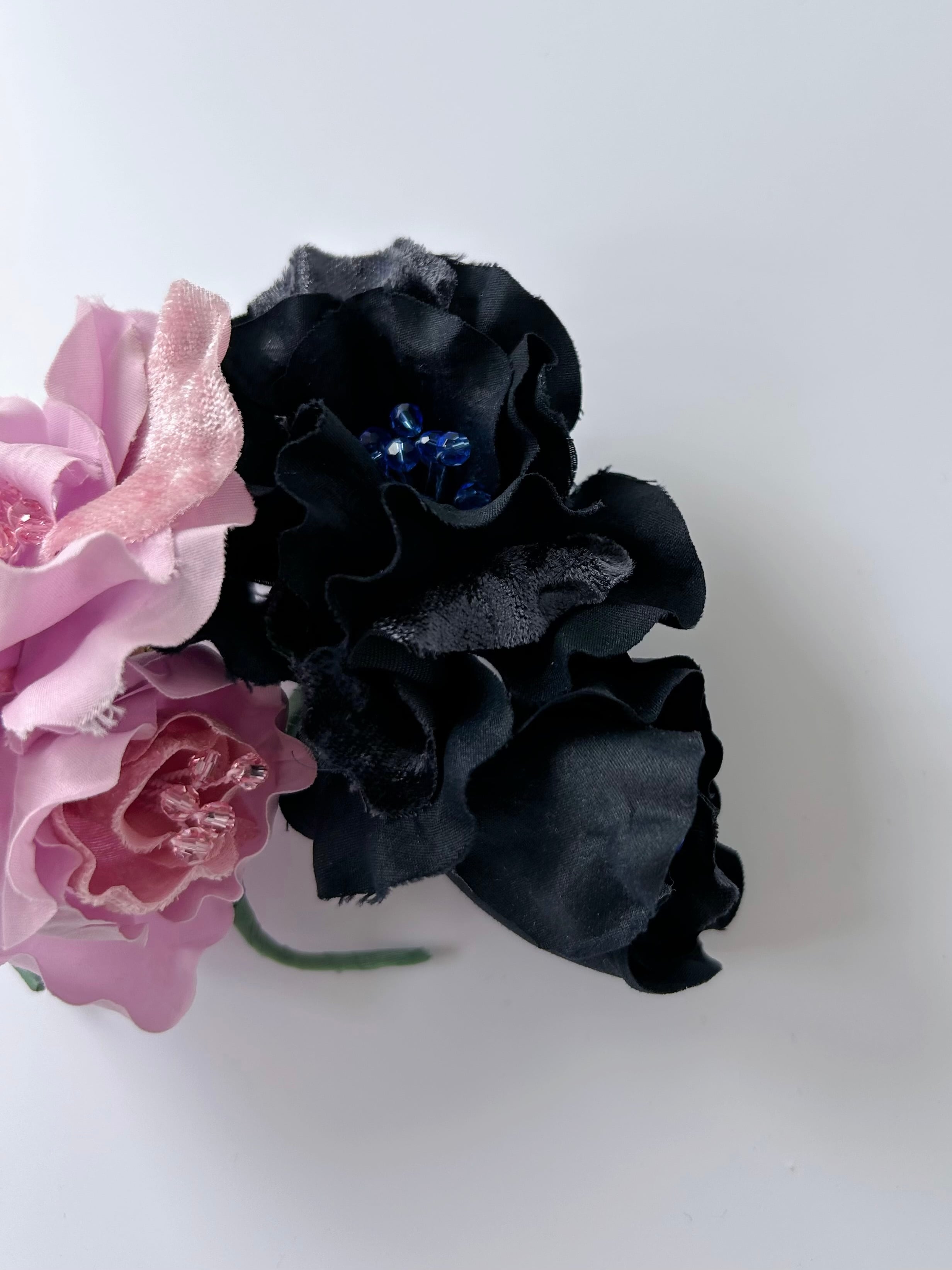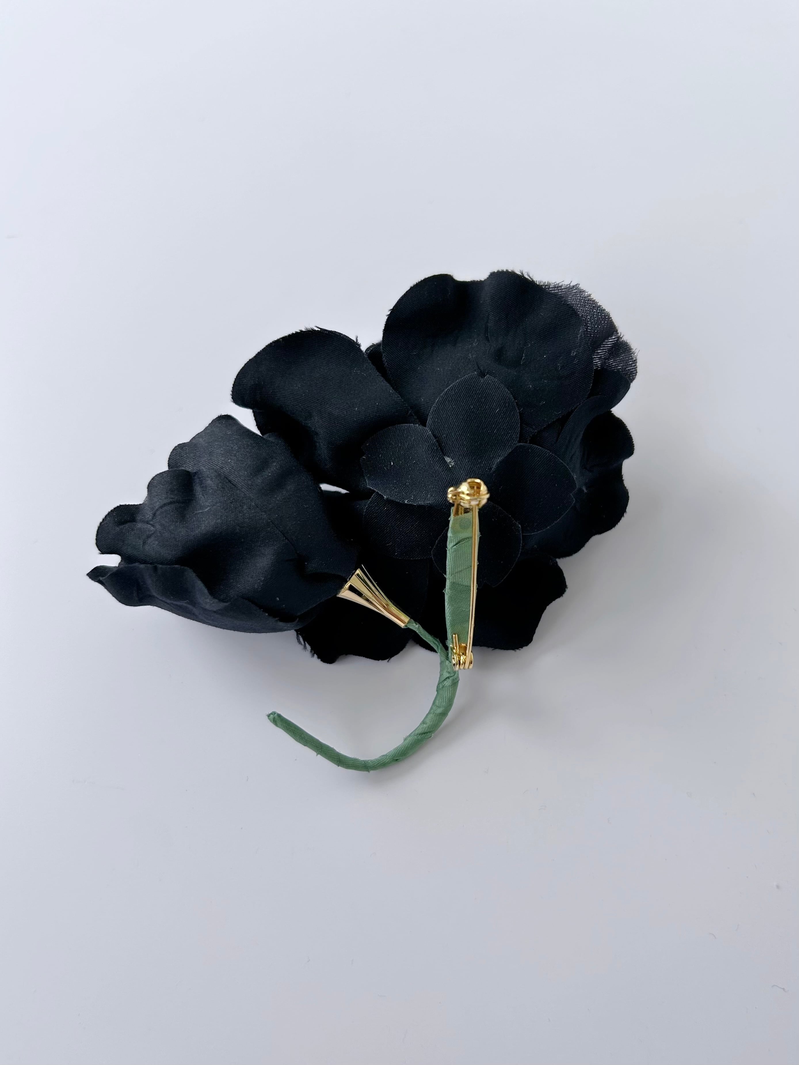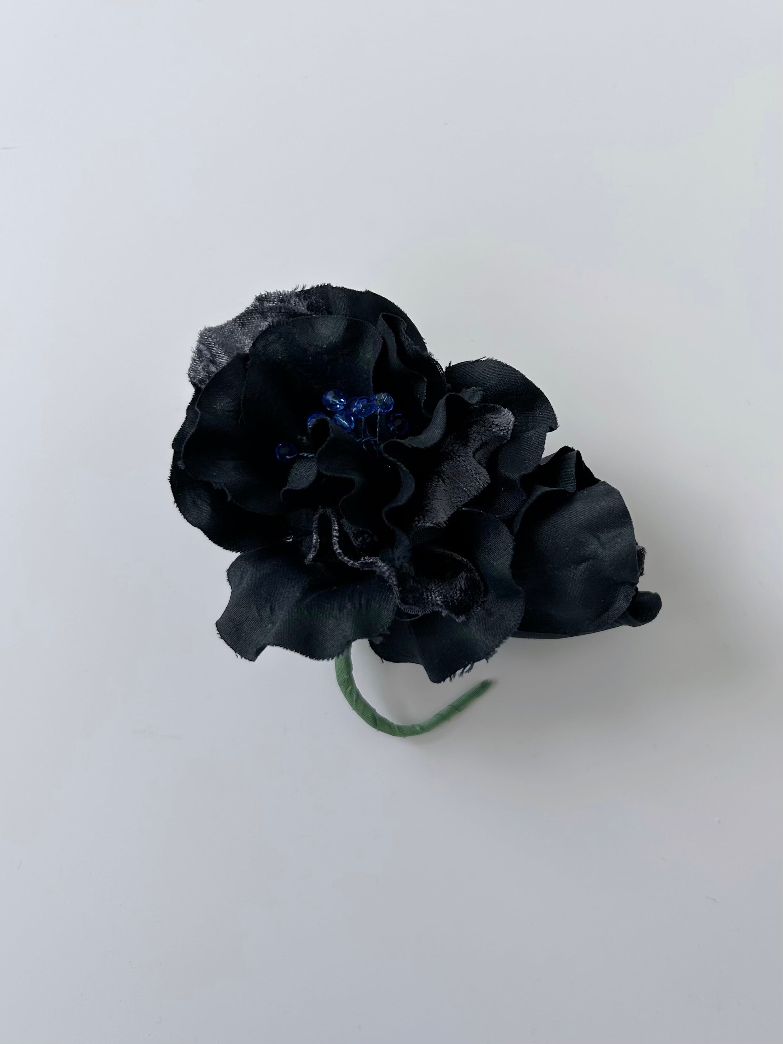 レザーライクサテンのお花にキラキラとした花粉のビーズ、つぼみの根本にゴールドの金具を使用。