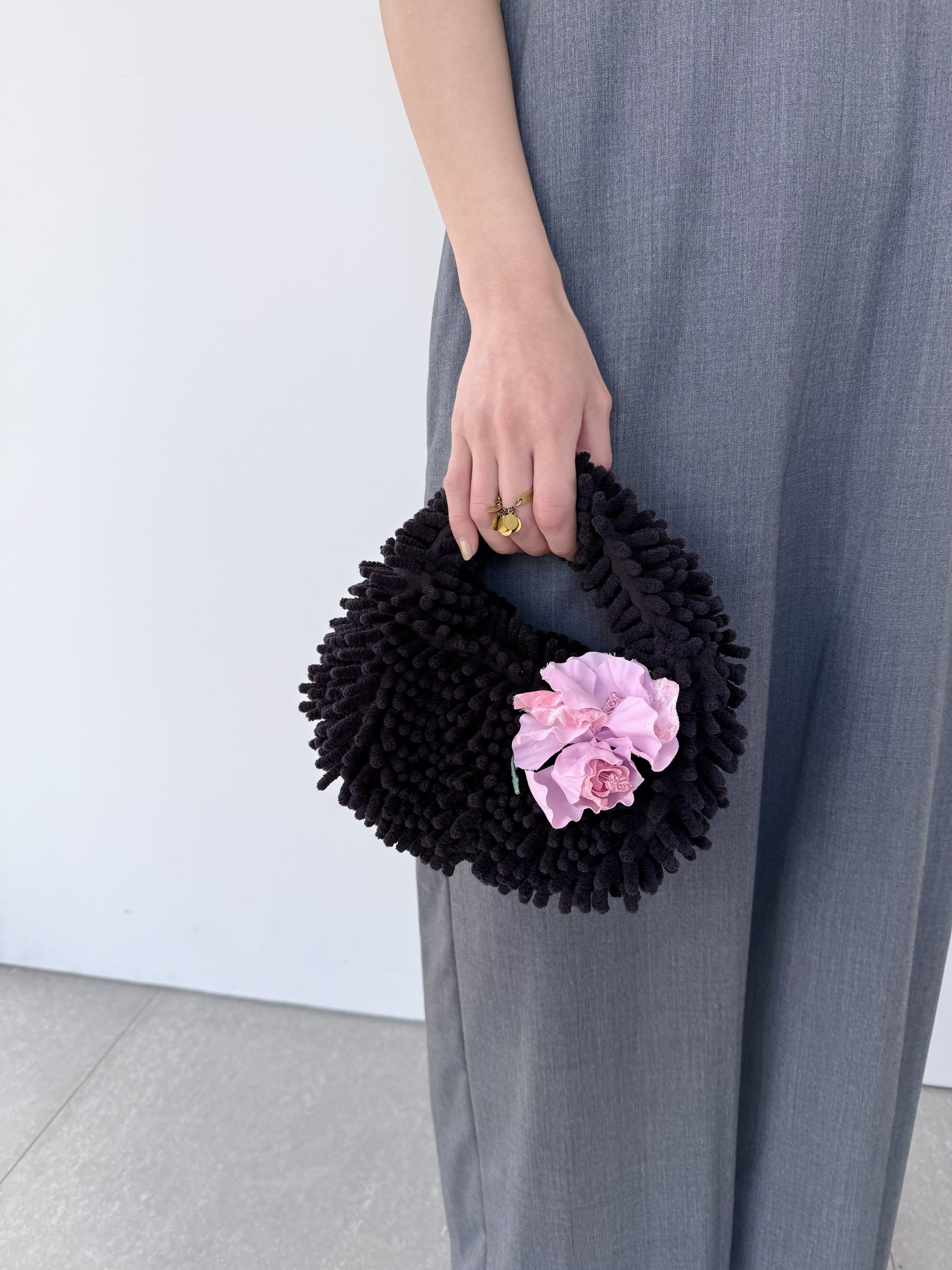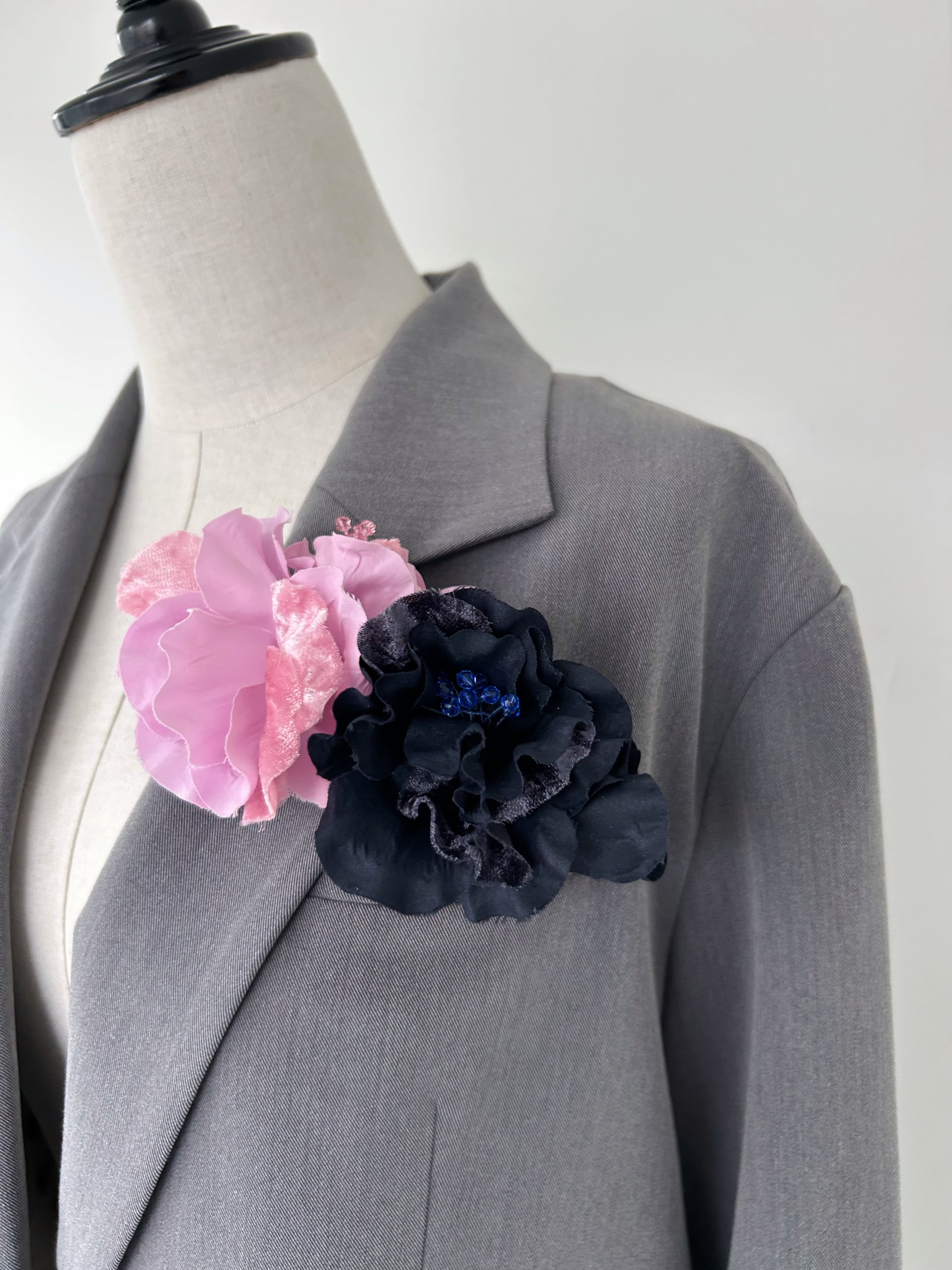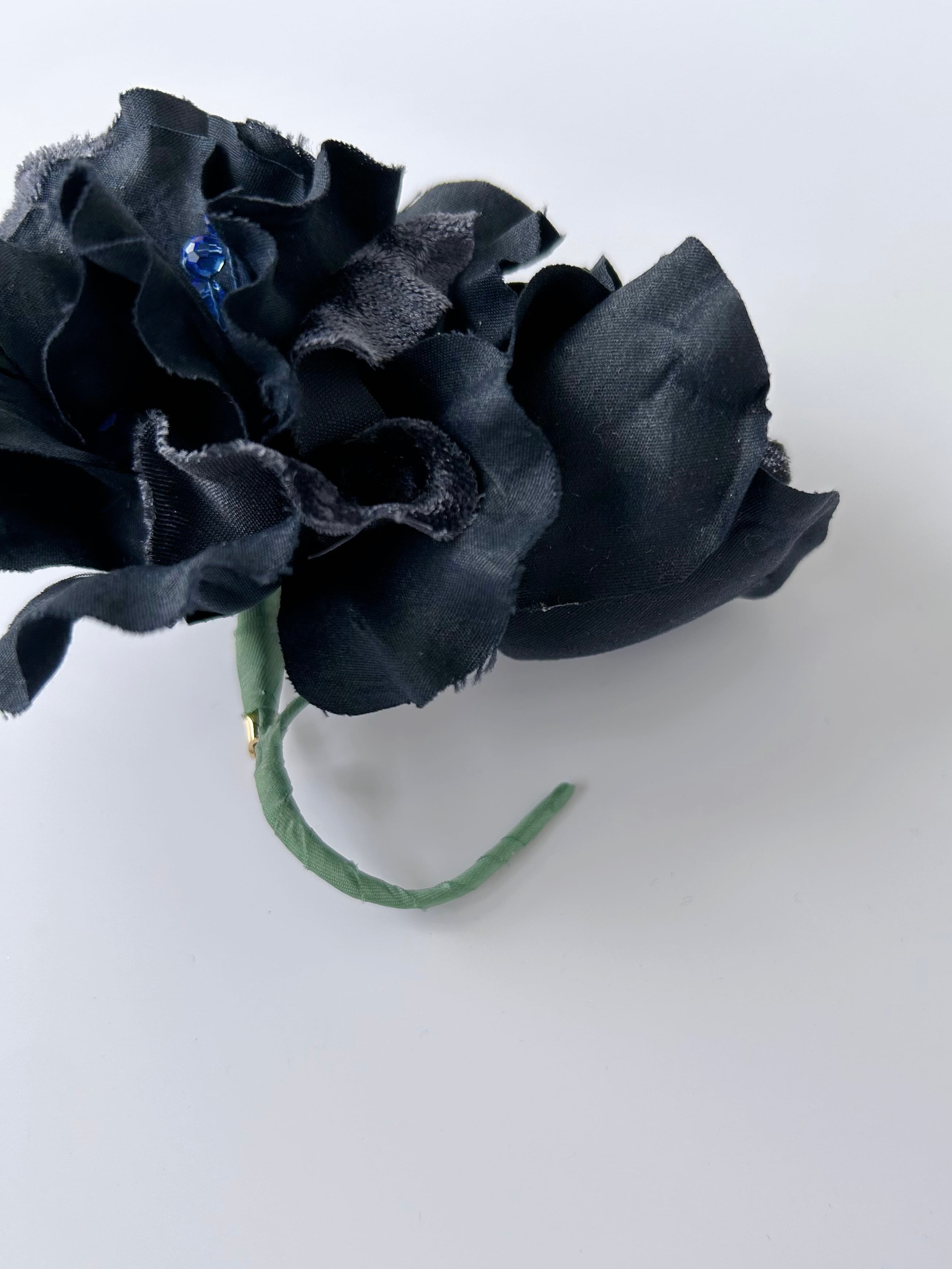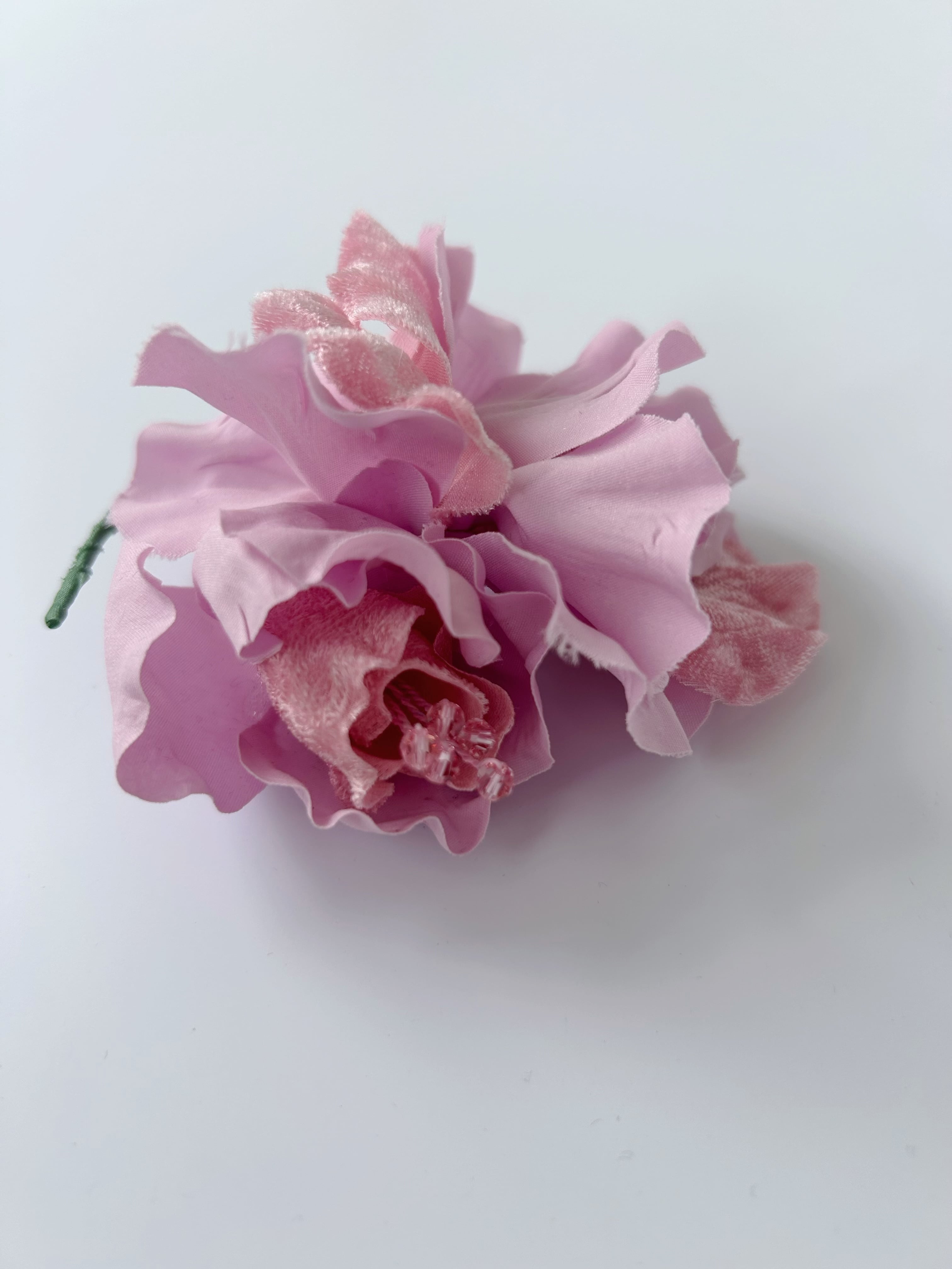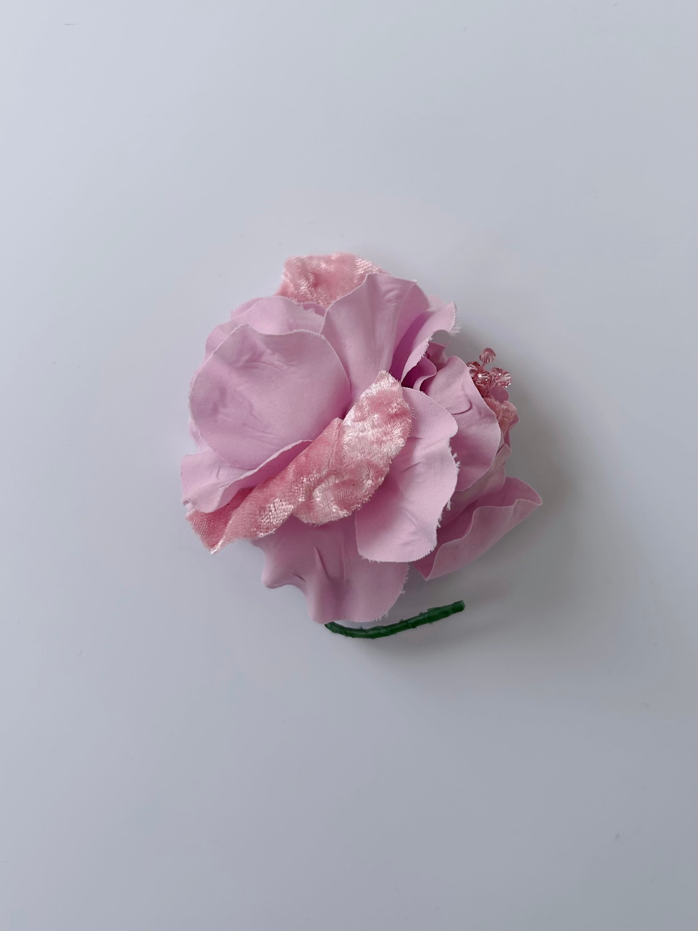 レザーライクサテンのお花にキラキラとした花粉のビーズ、つぼみの根本にゴールドの金具を使用。