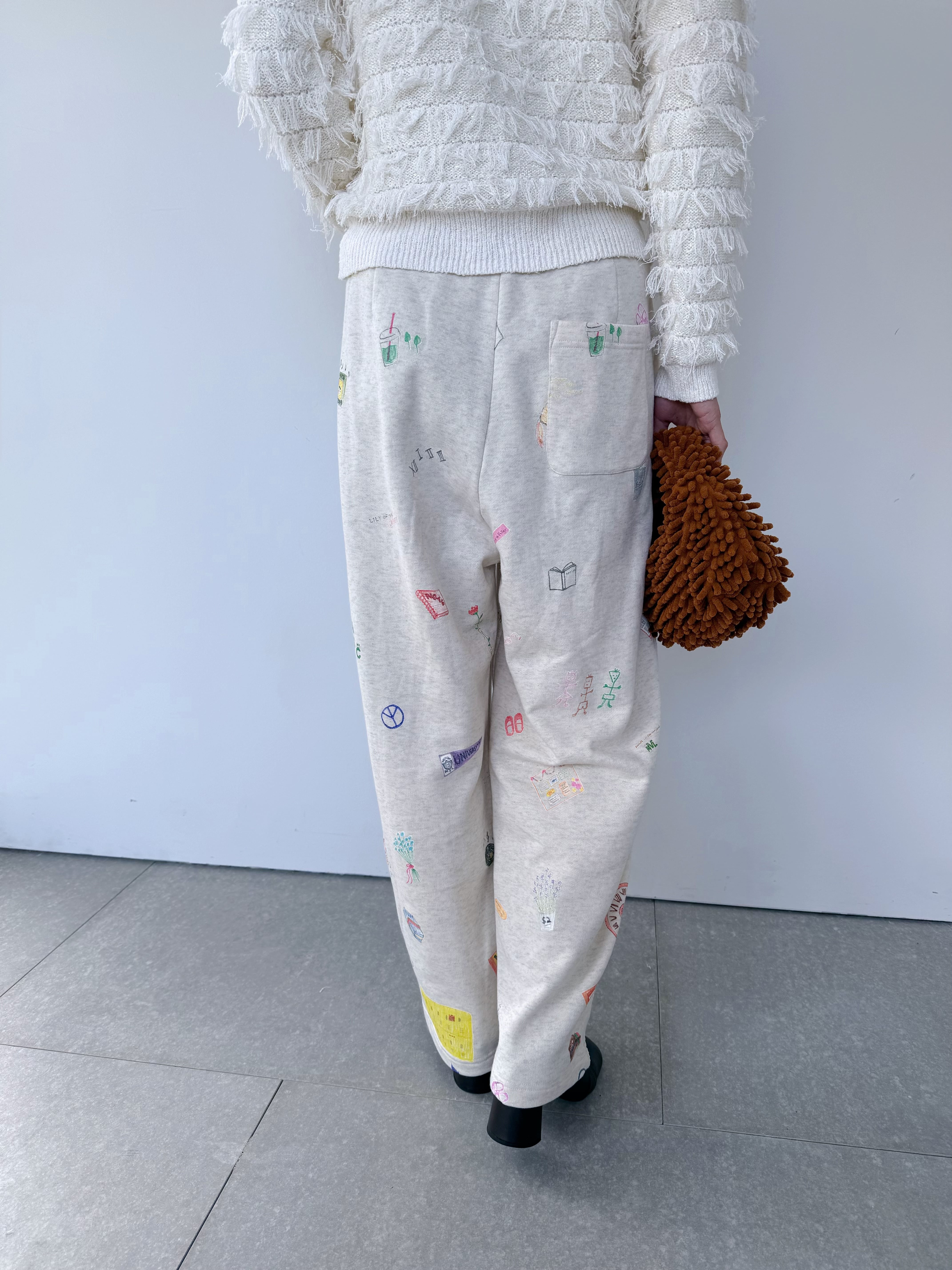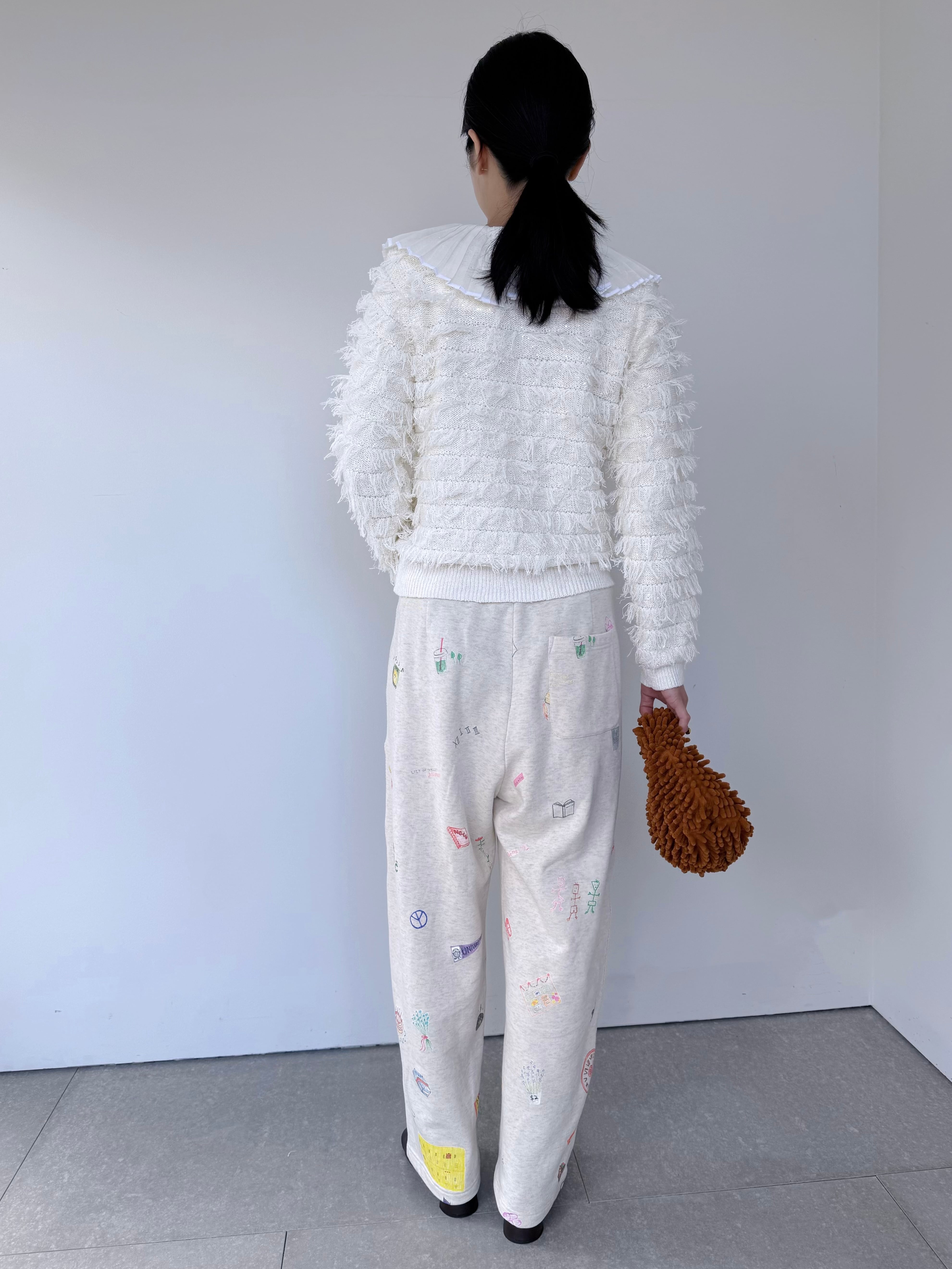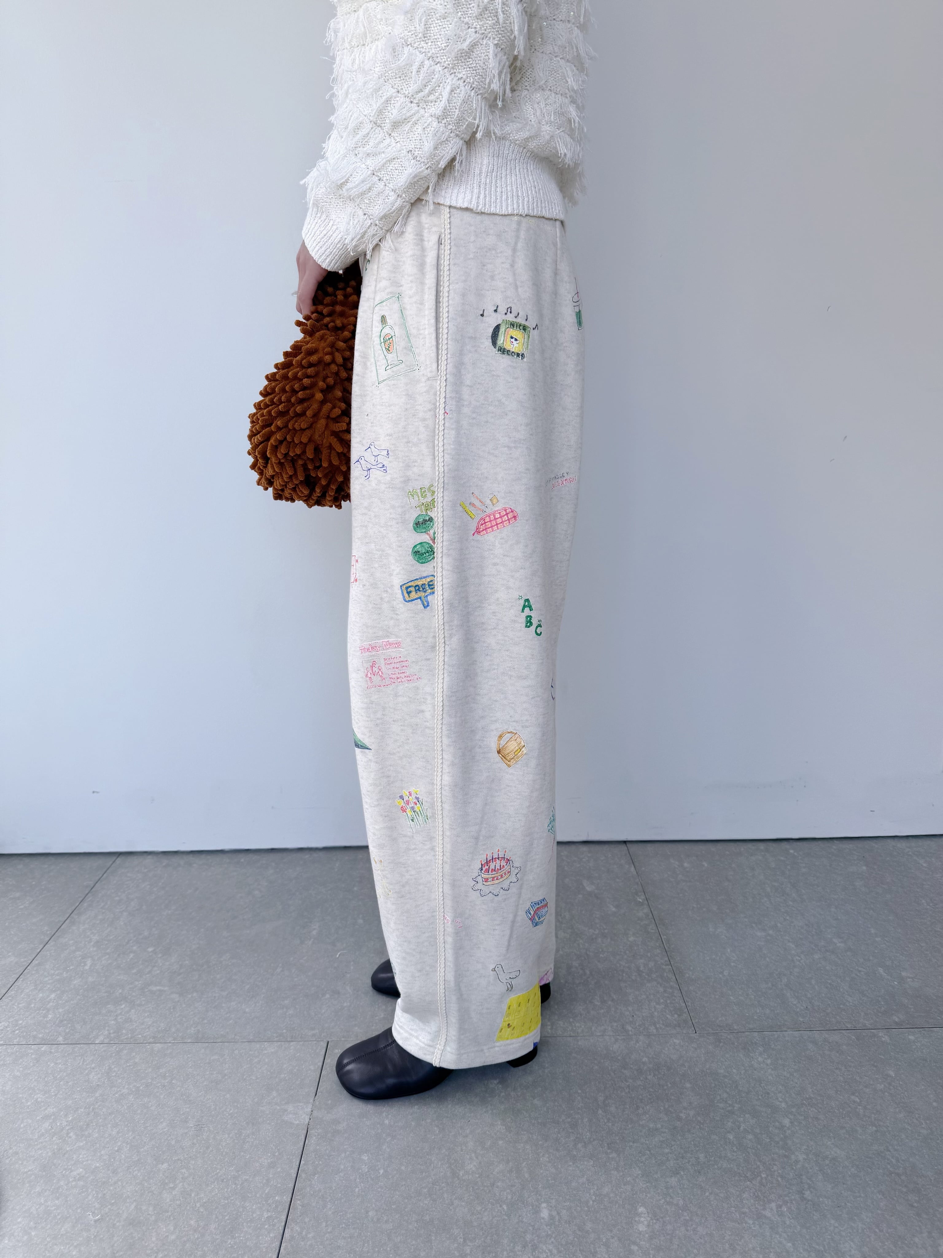 レース襟付き落書きプリントスウェットプルオーバーとセットアップでの着用もおすすめ。
