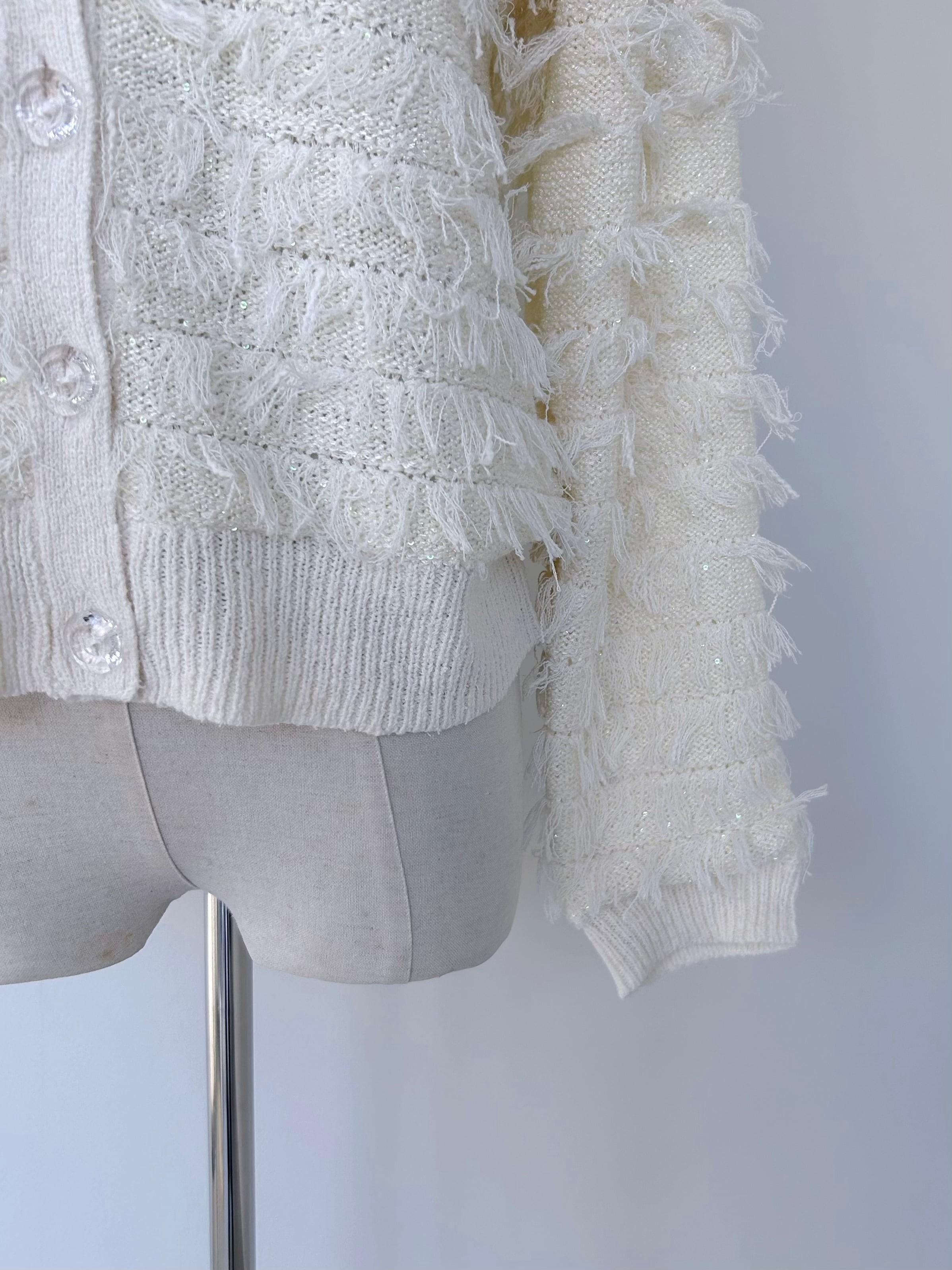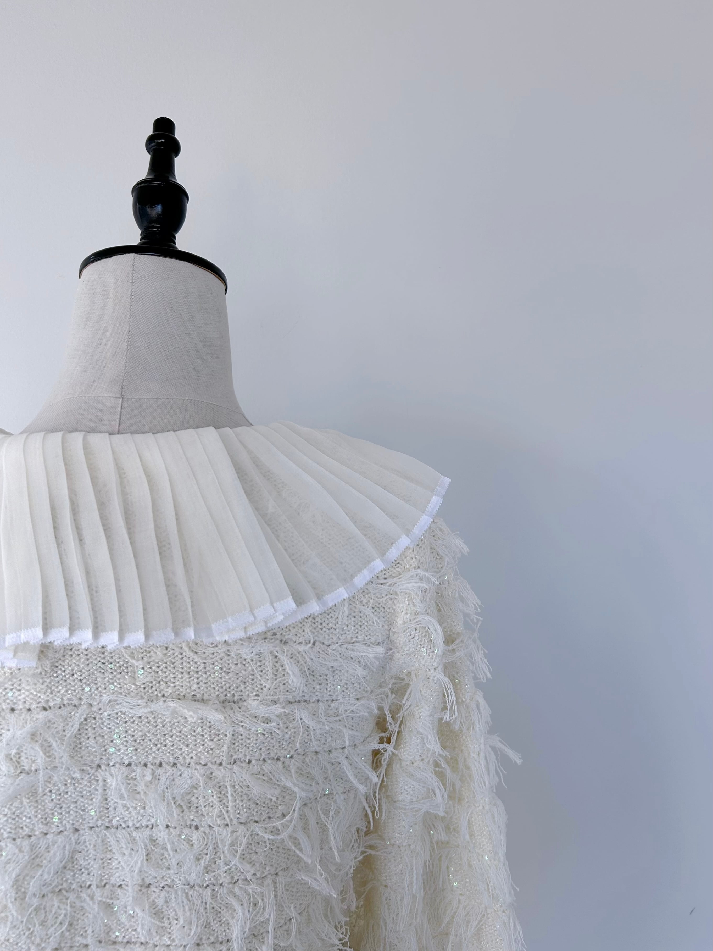 オーガンジーのプリーツ襟に小さなスパンコールできらめきを添えたフリンジ付きツイードカーディガン。