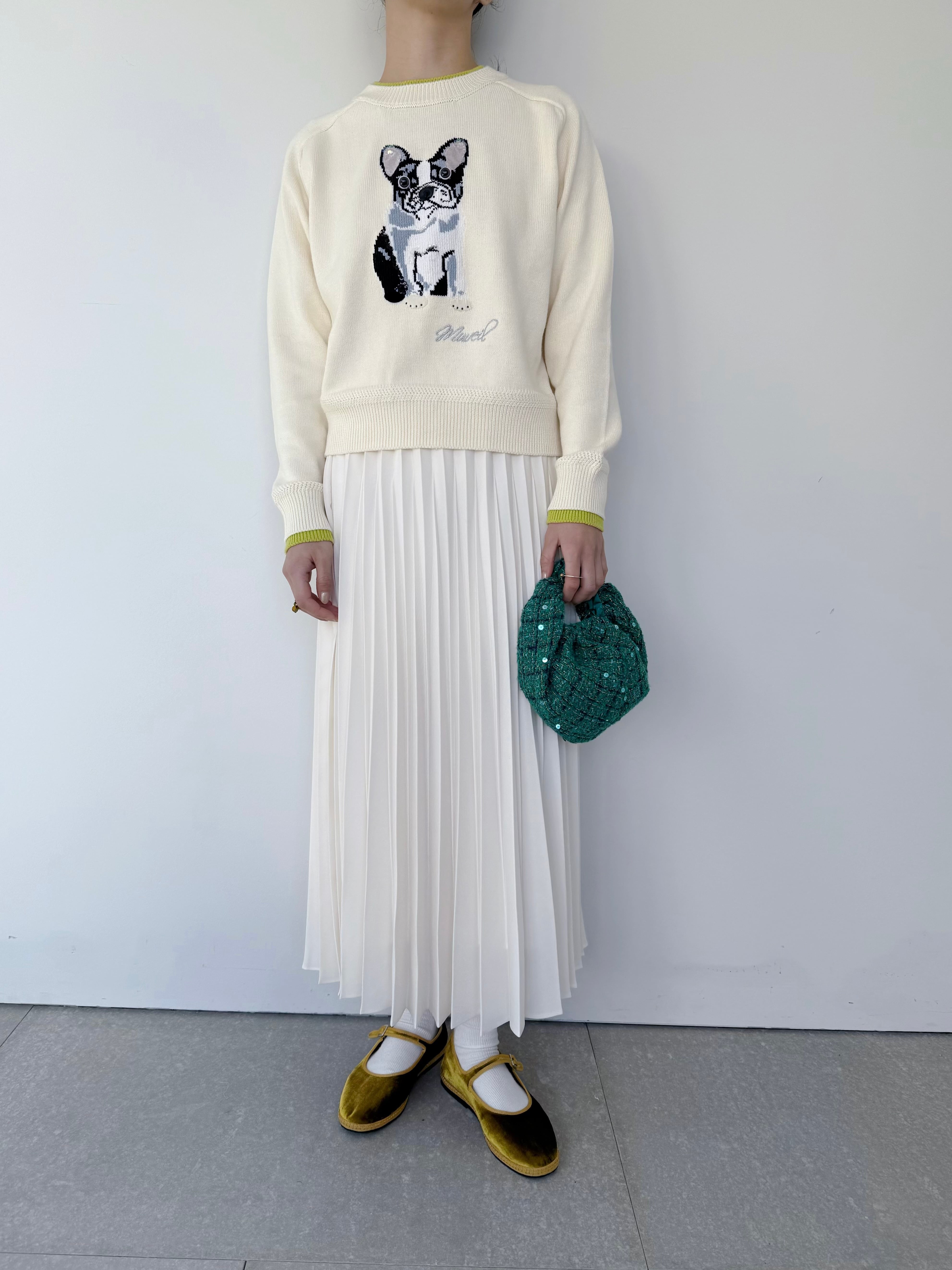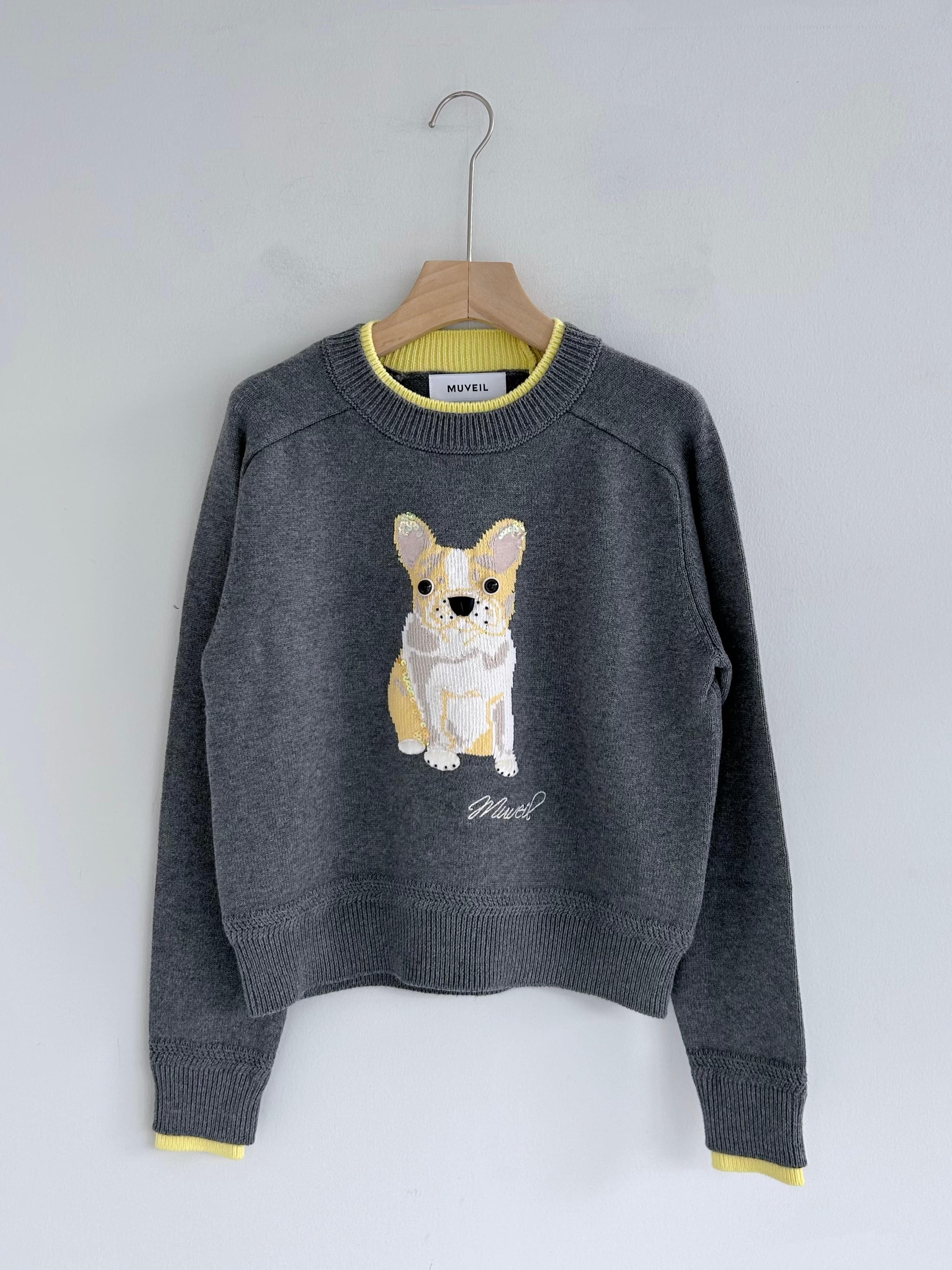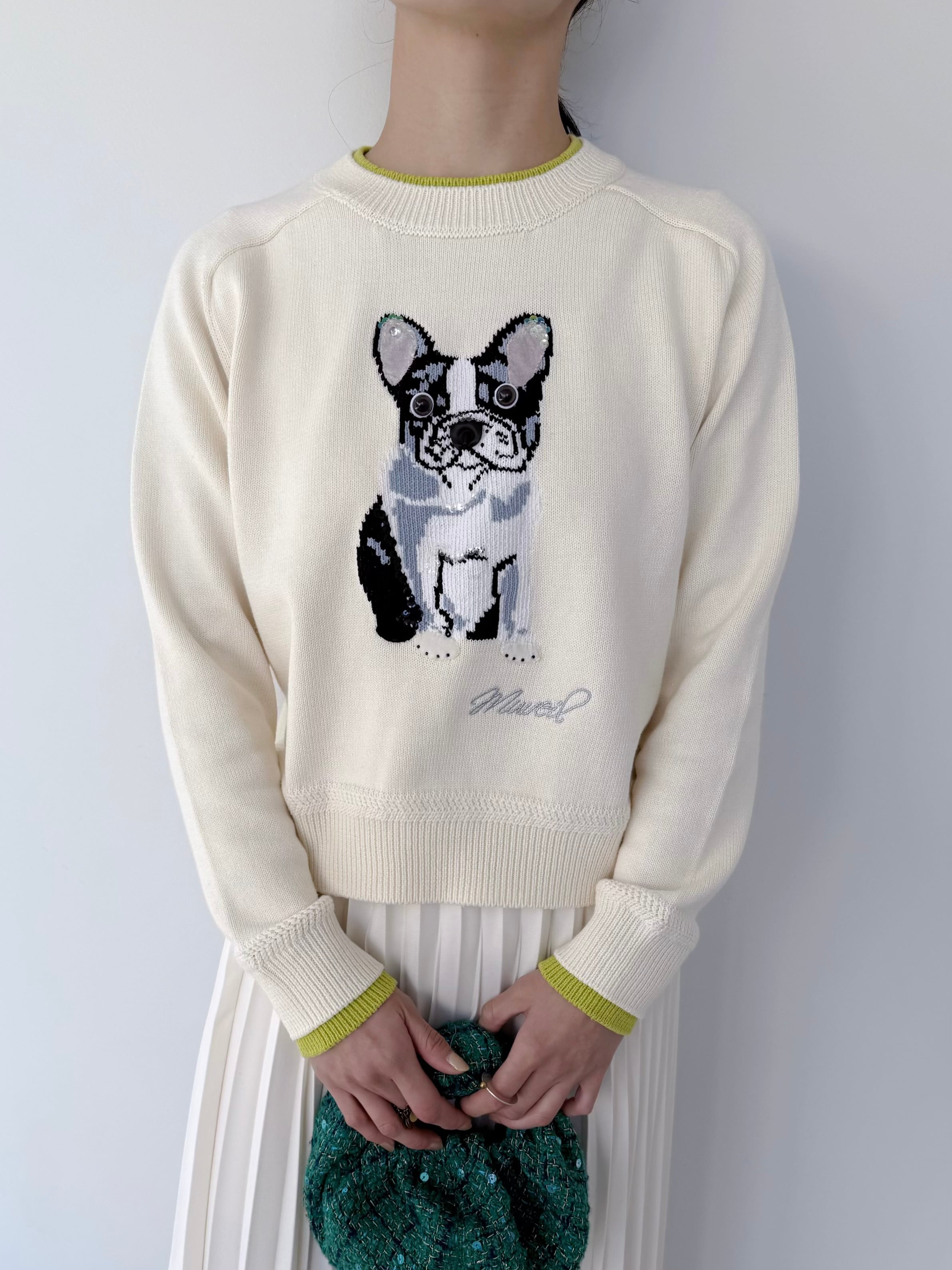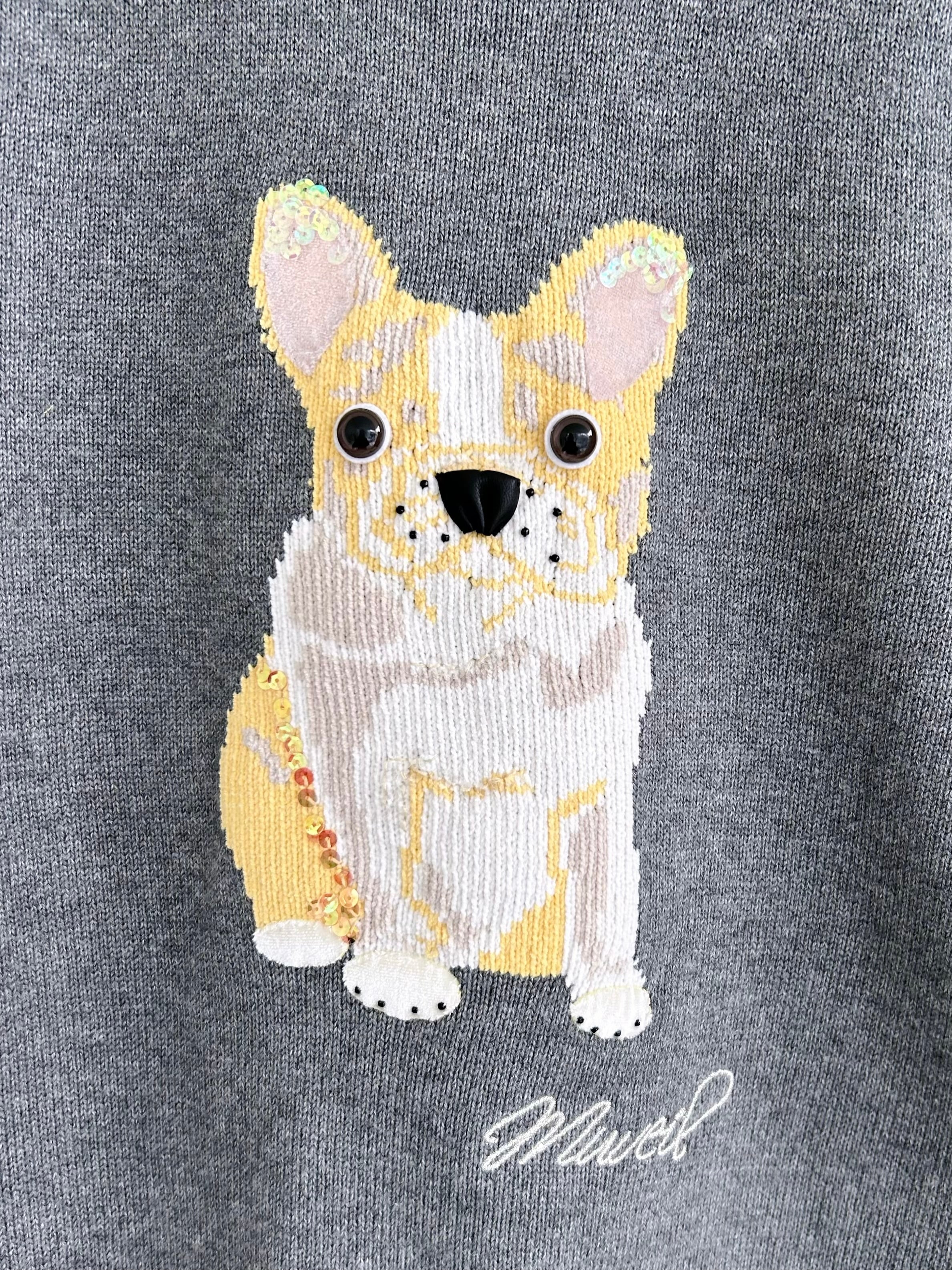 コレクションテーマに合わせたフレンチブルドッグがモチーフのインターシャプルオーバー。