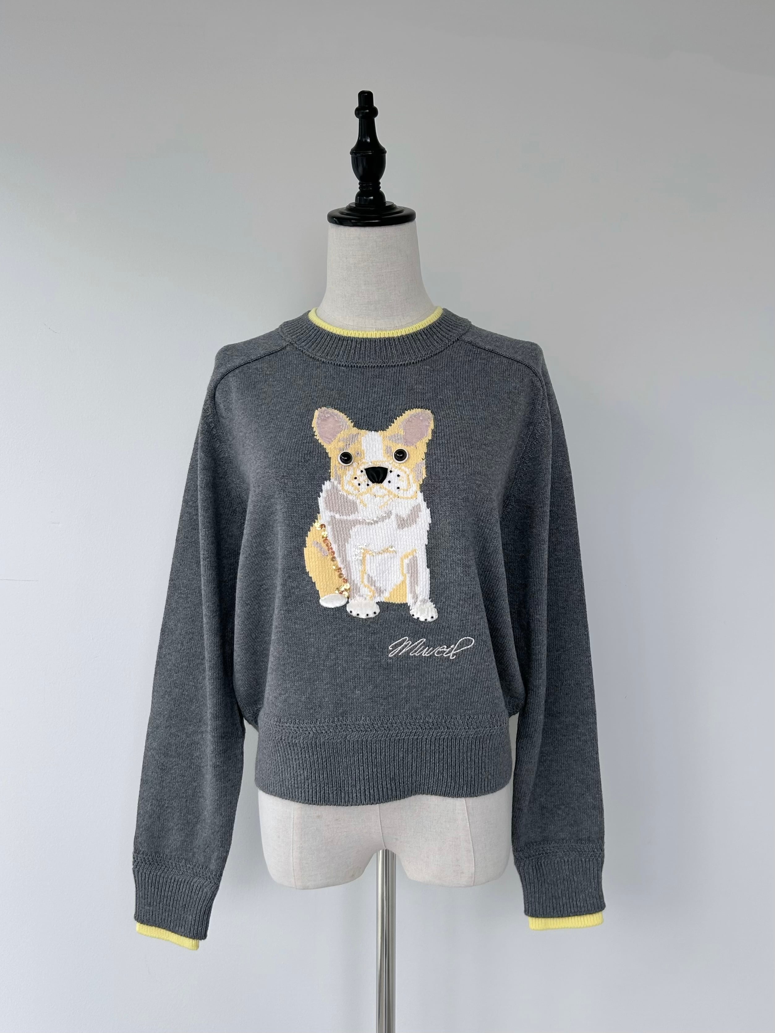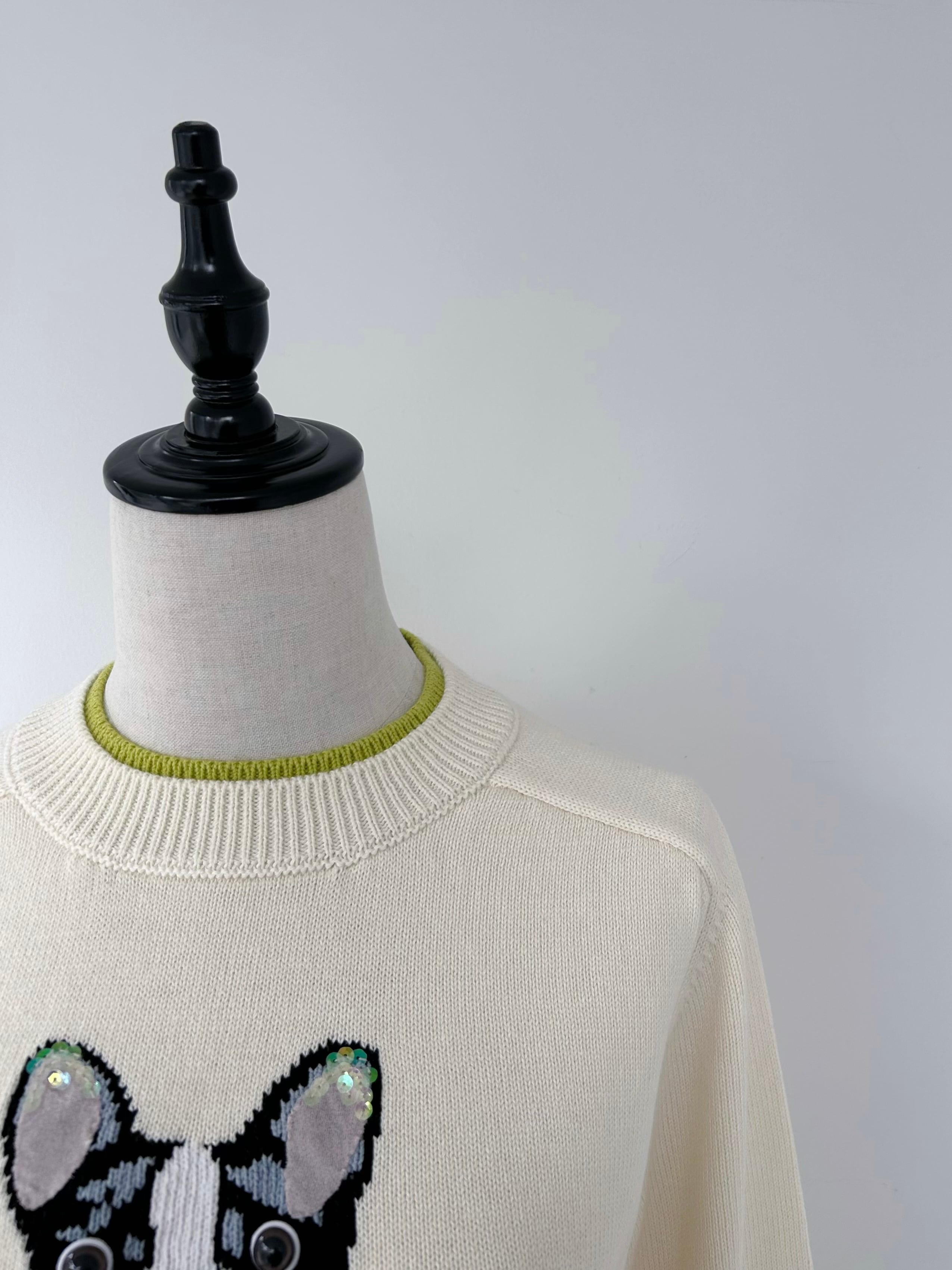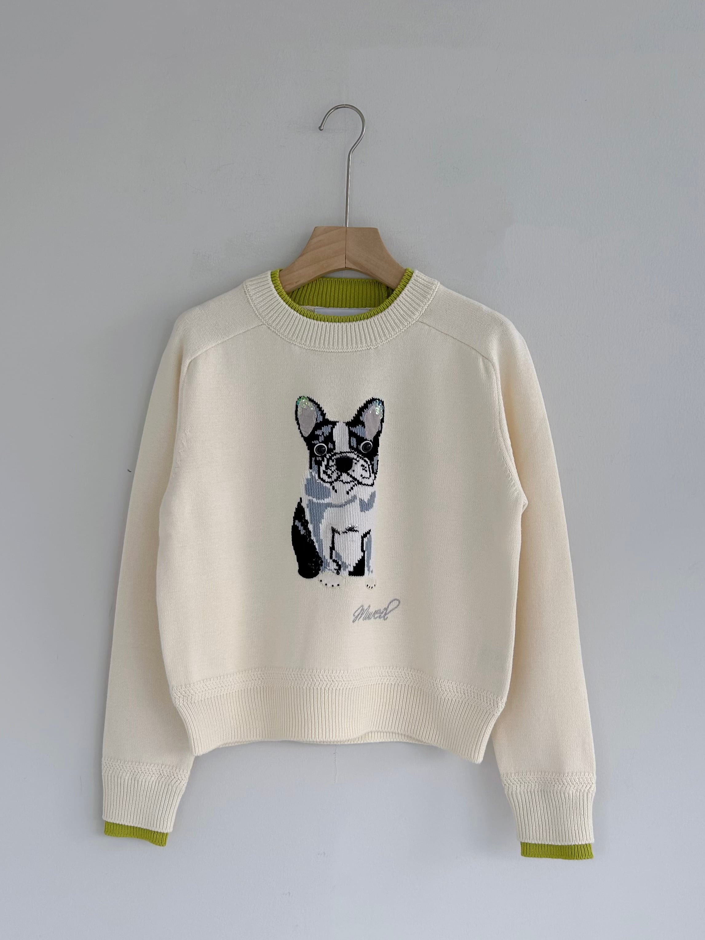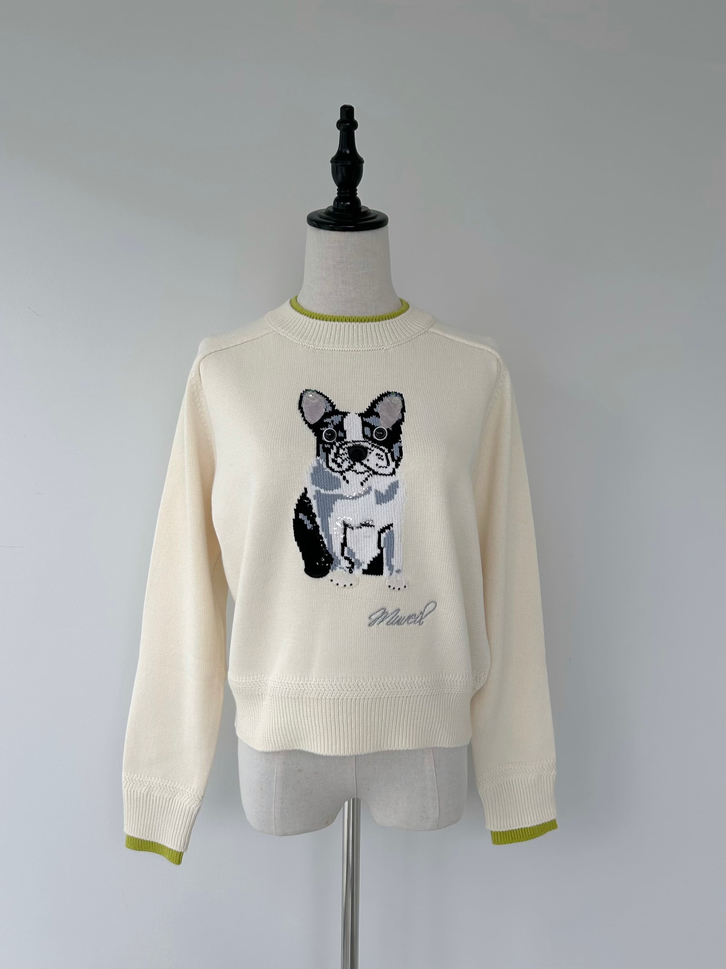 コレクションテーマに合わせたフレンチブルドッグがモチーフのインターシャプルオーバー。
