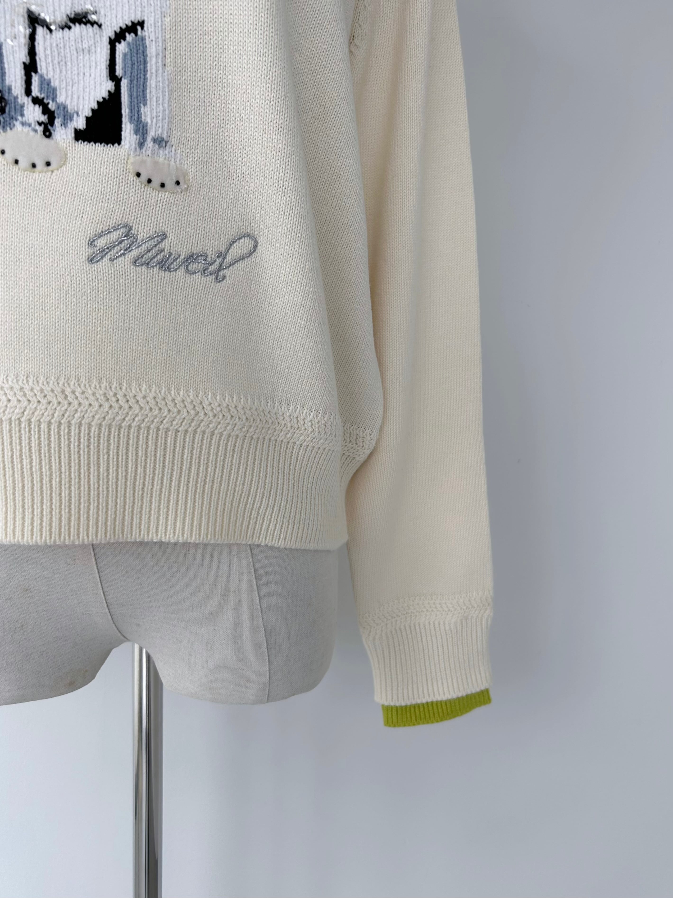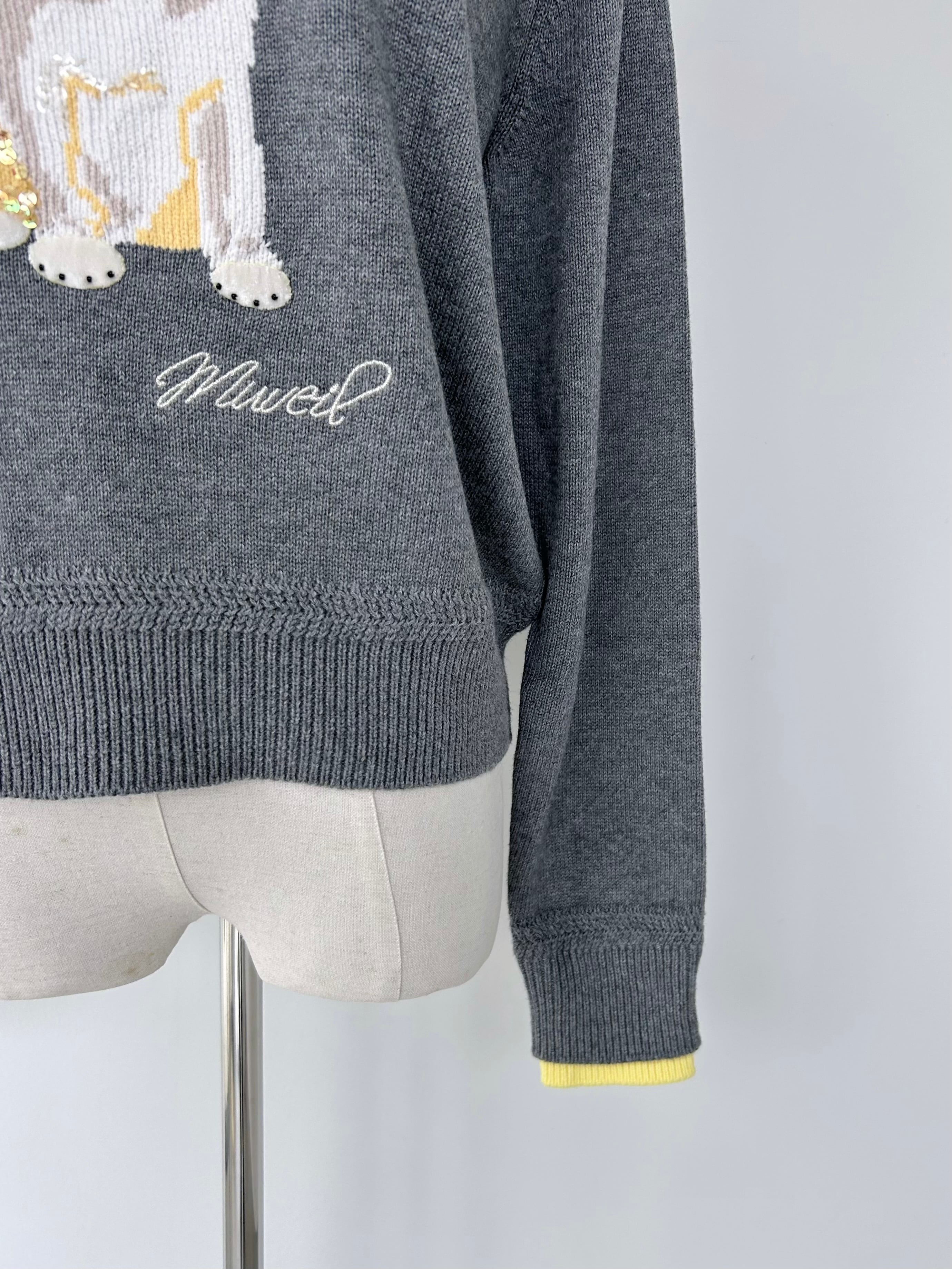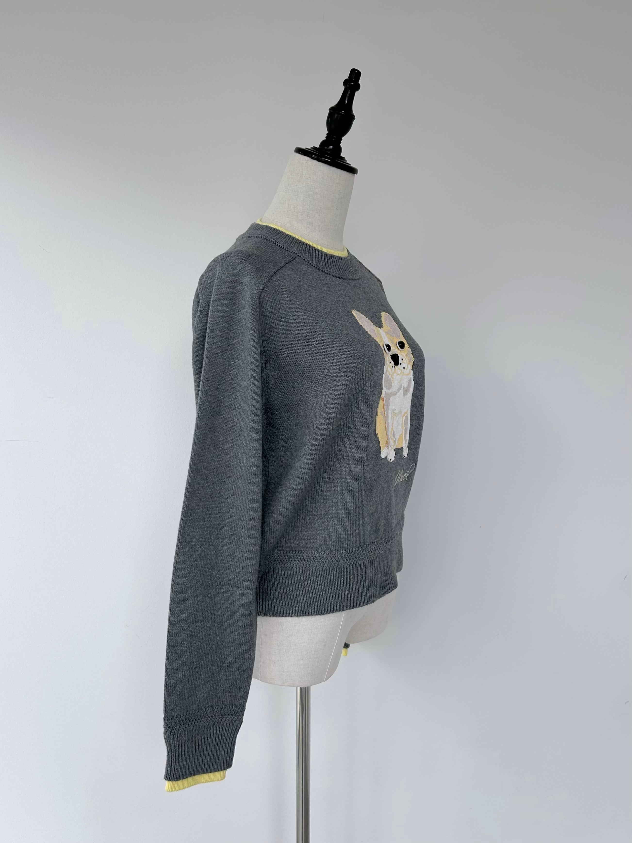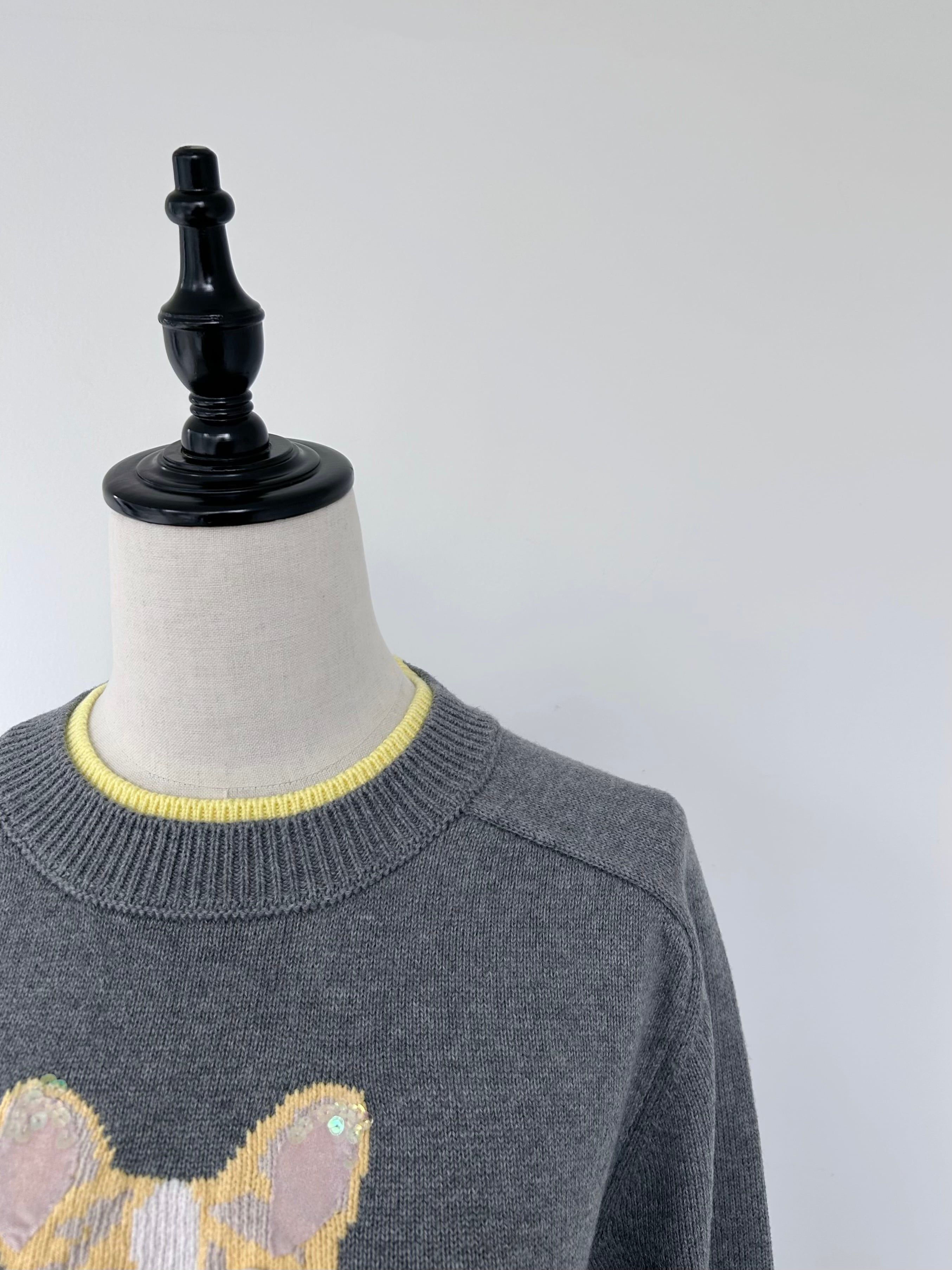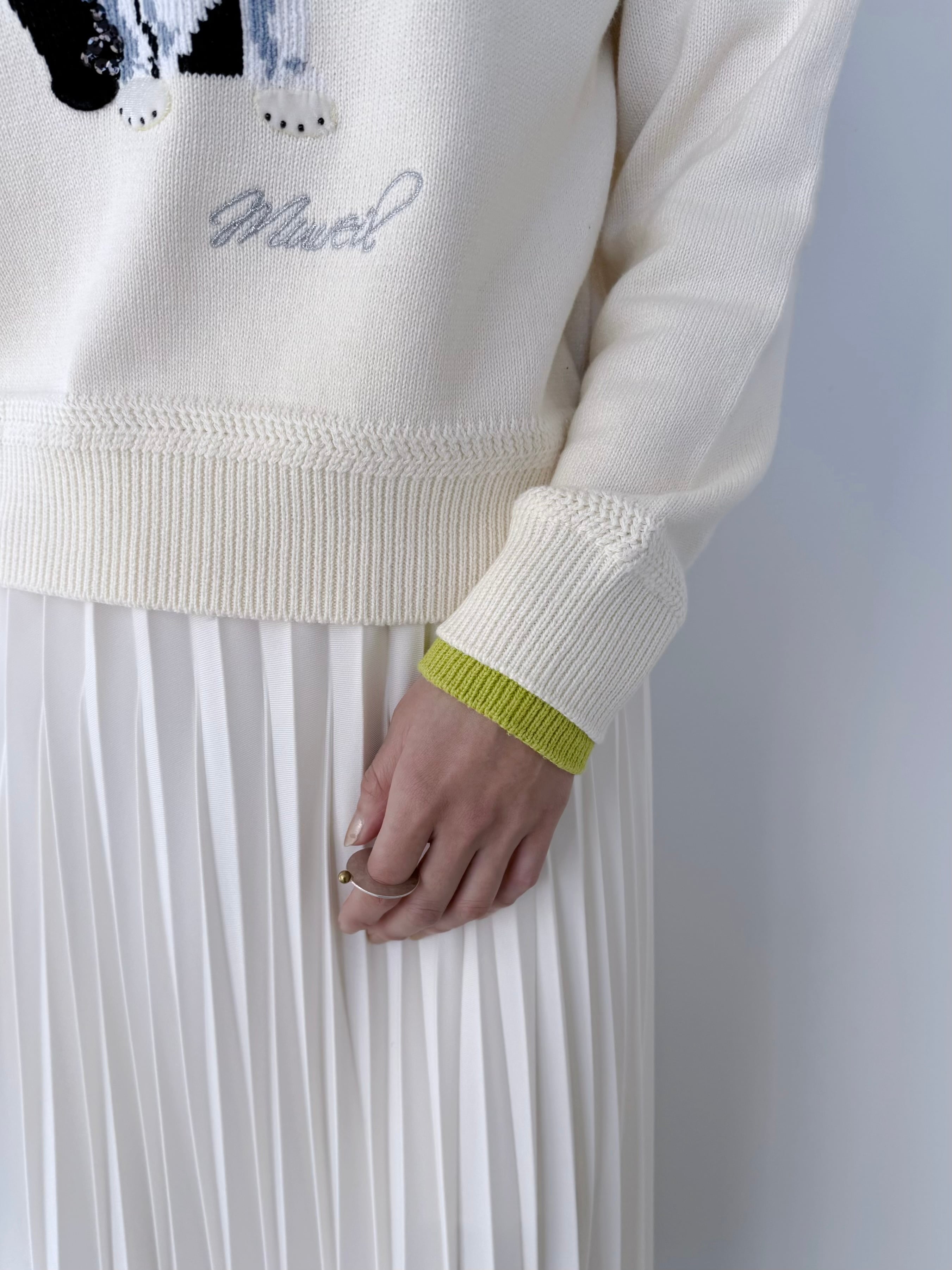 コレクションテーマに合わせたフレンチブルドッグがモチーフのインターシャプルオーバー。
