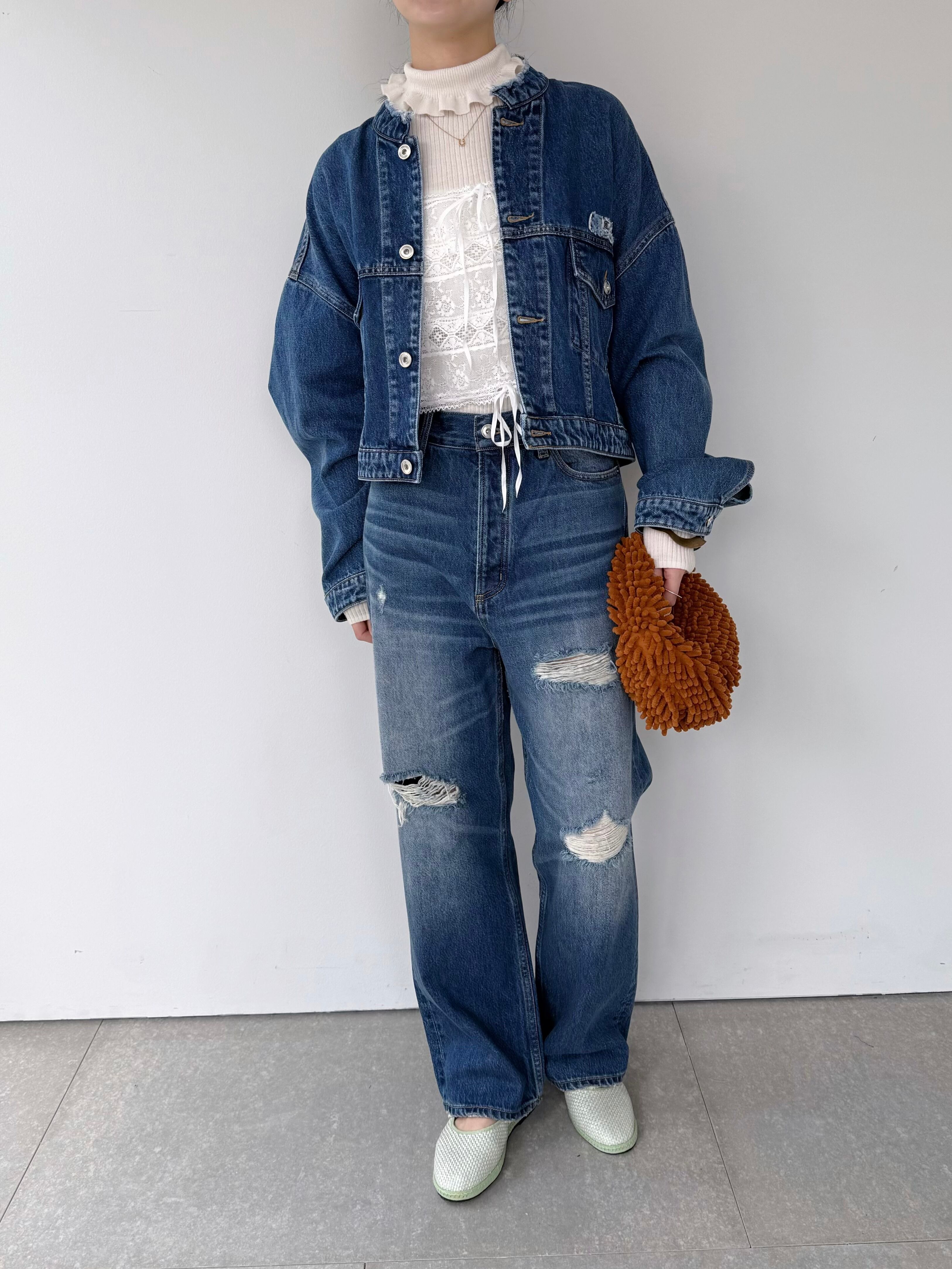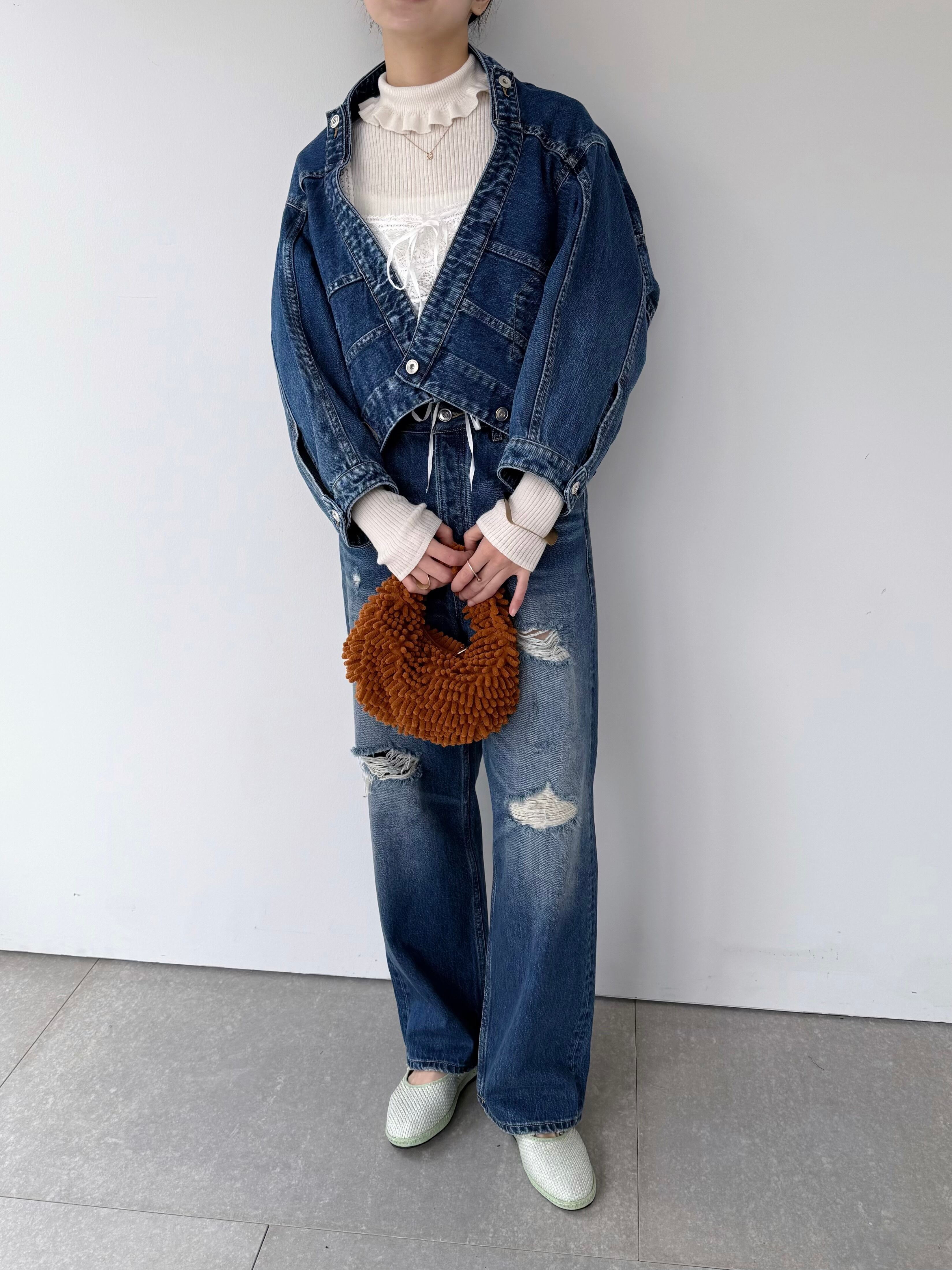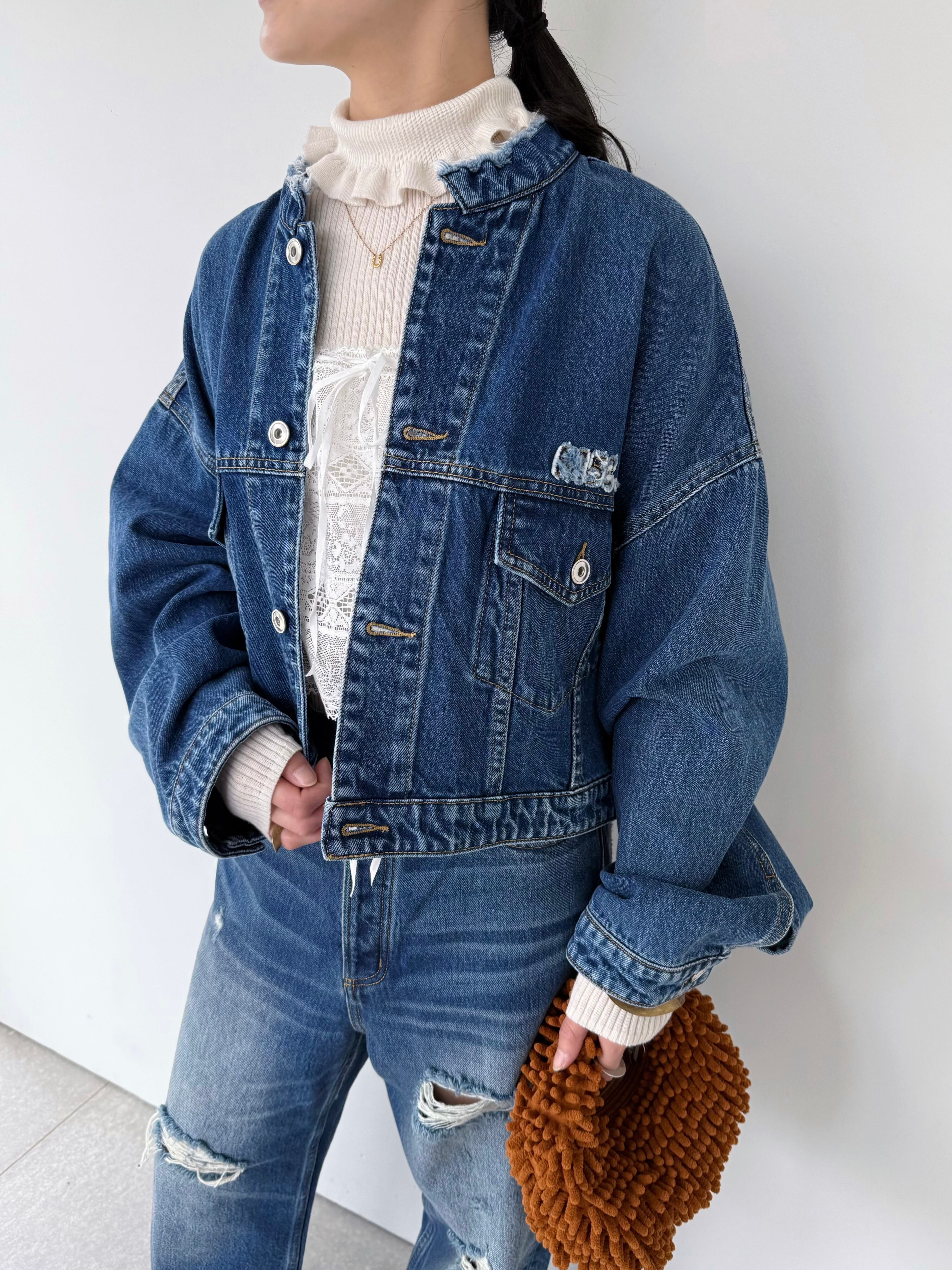 ドロップショルダーにカマ底深めで袖は長め、襟は切りっぱなしデザイン。