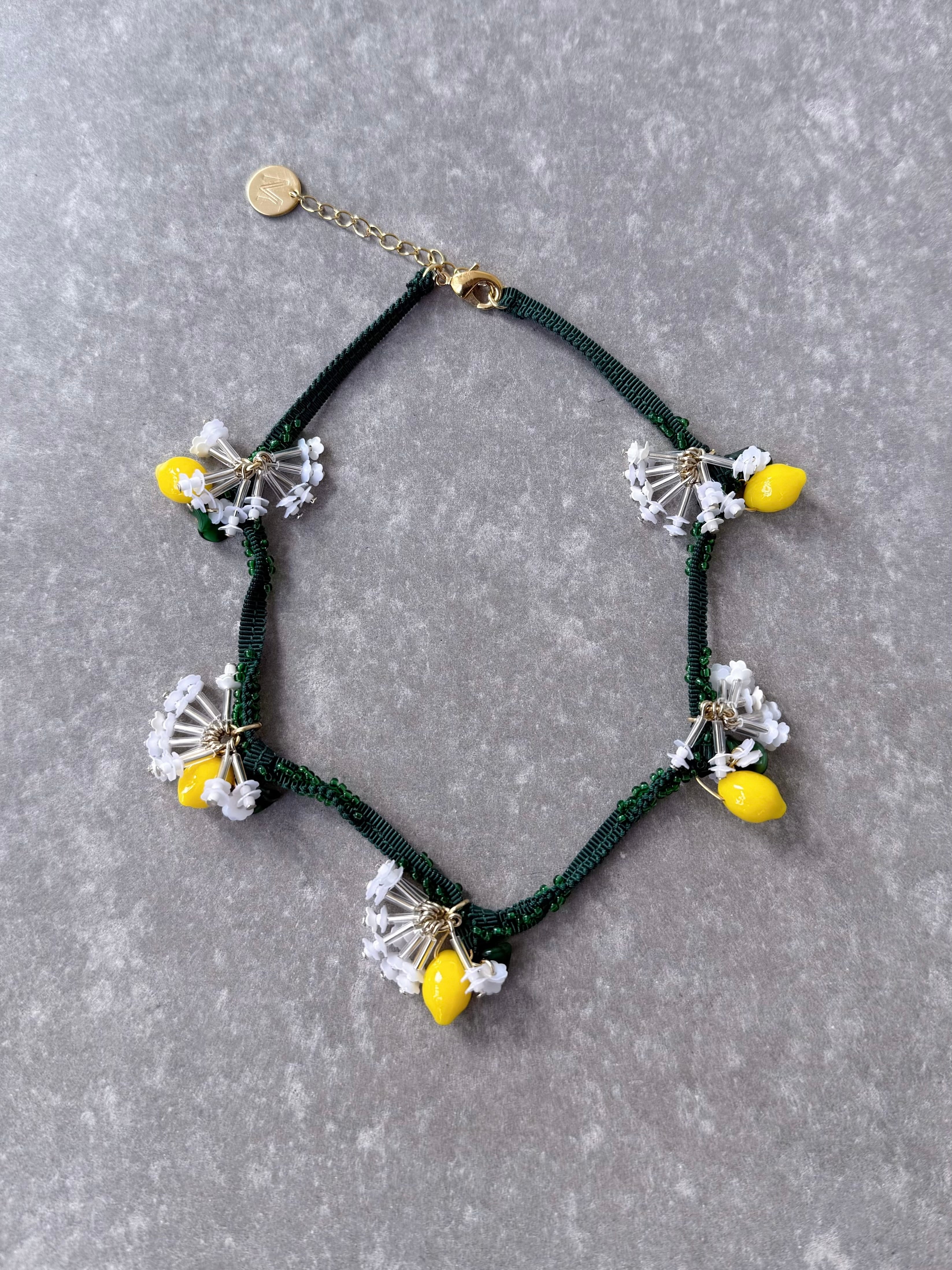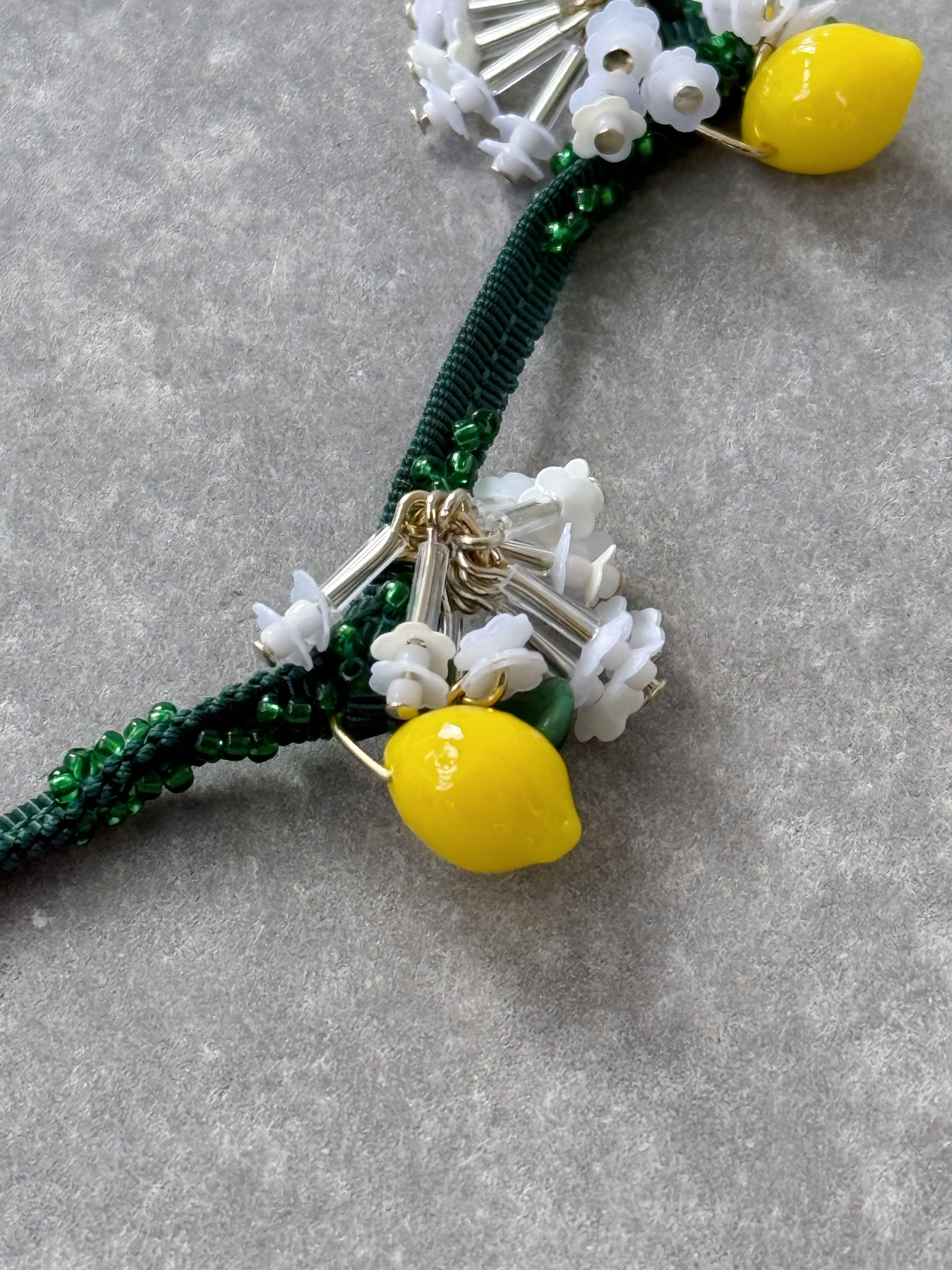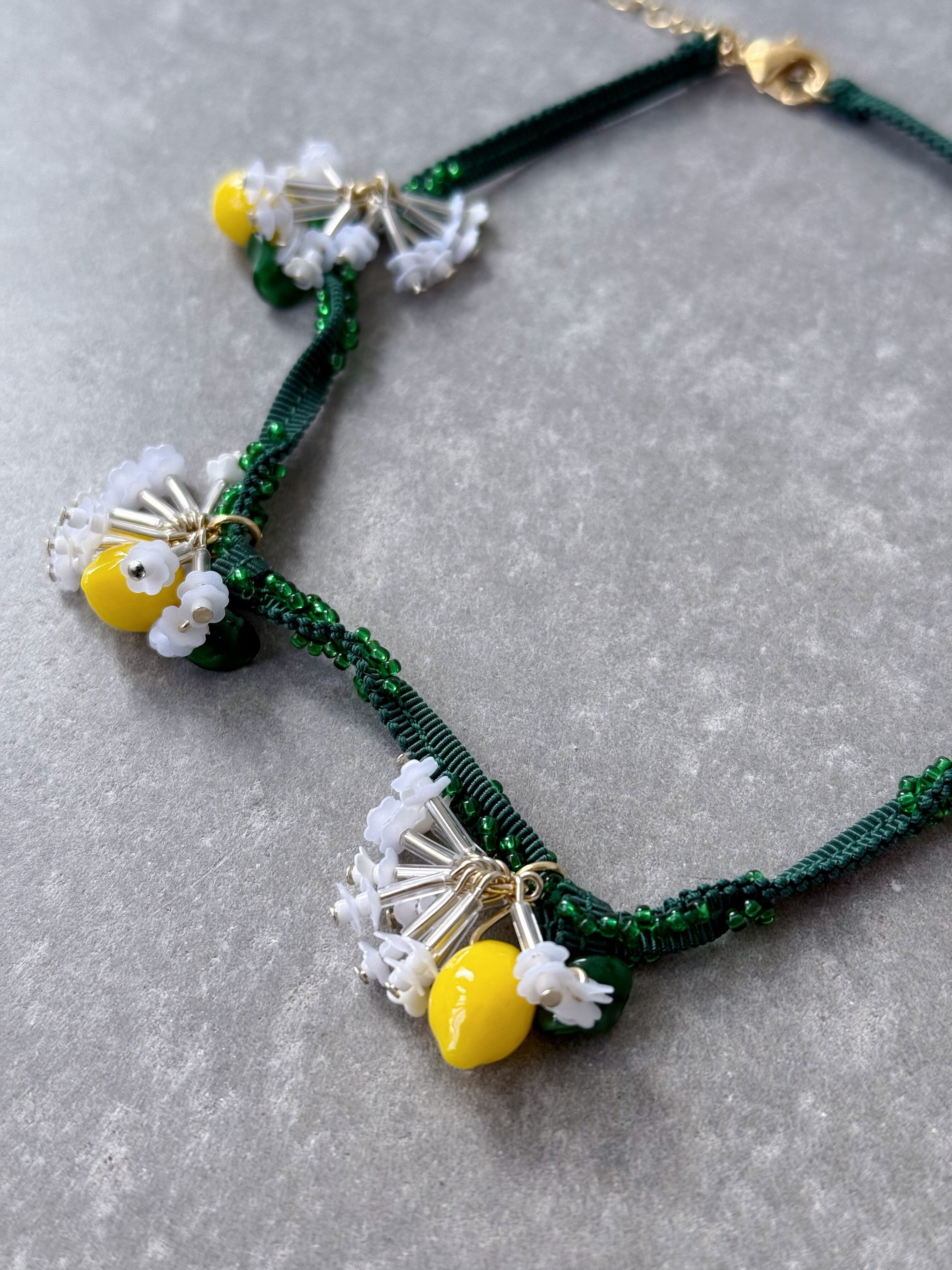 連なった立体的なレモンパーツが、目を惹くネックレス。葉はヴィンテージのガラスビーズを使用。