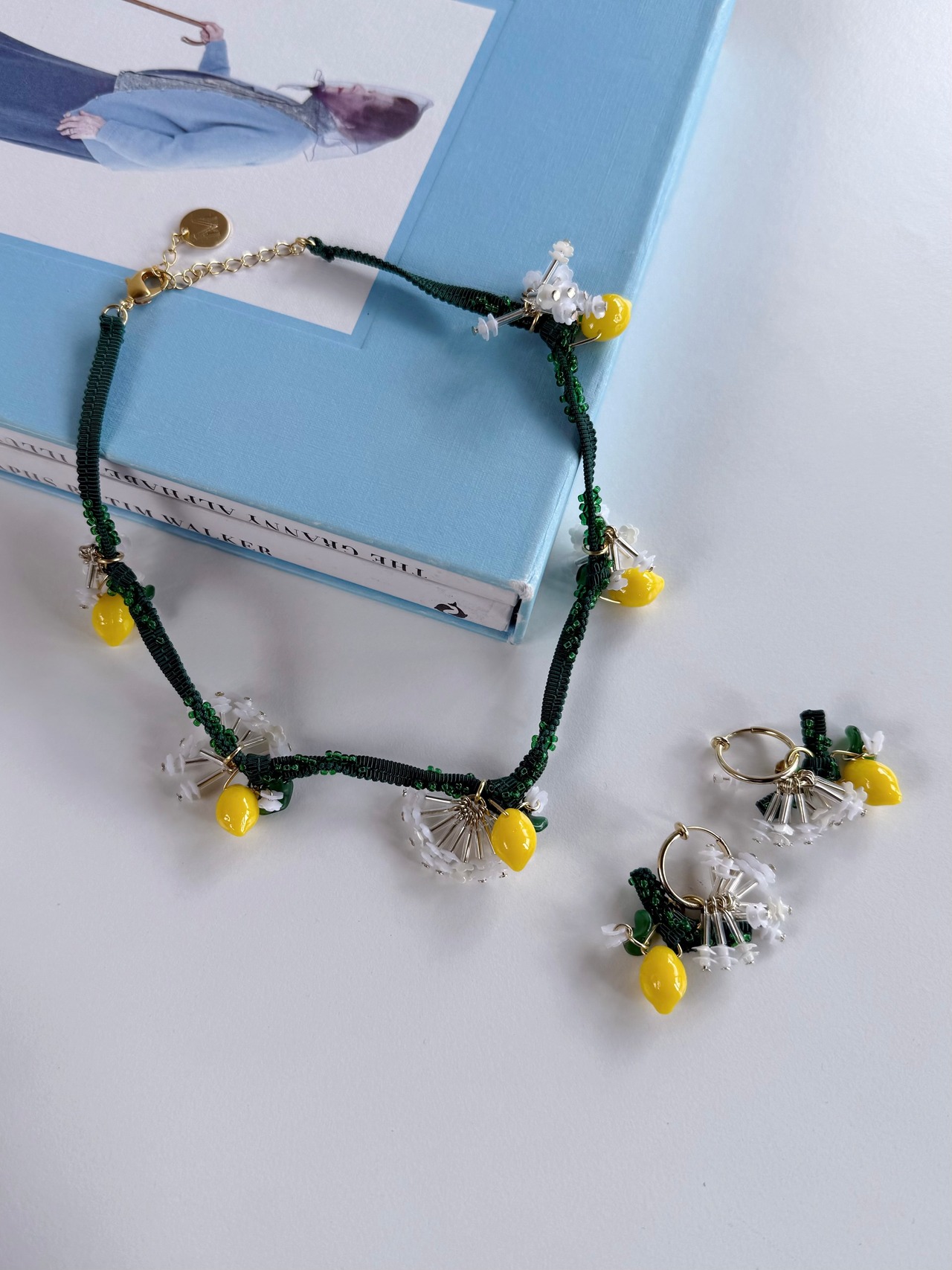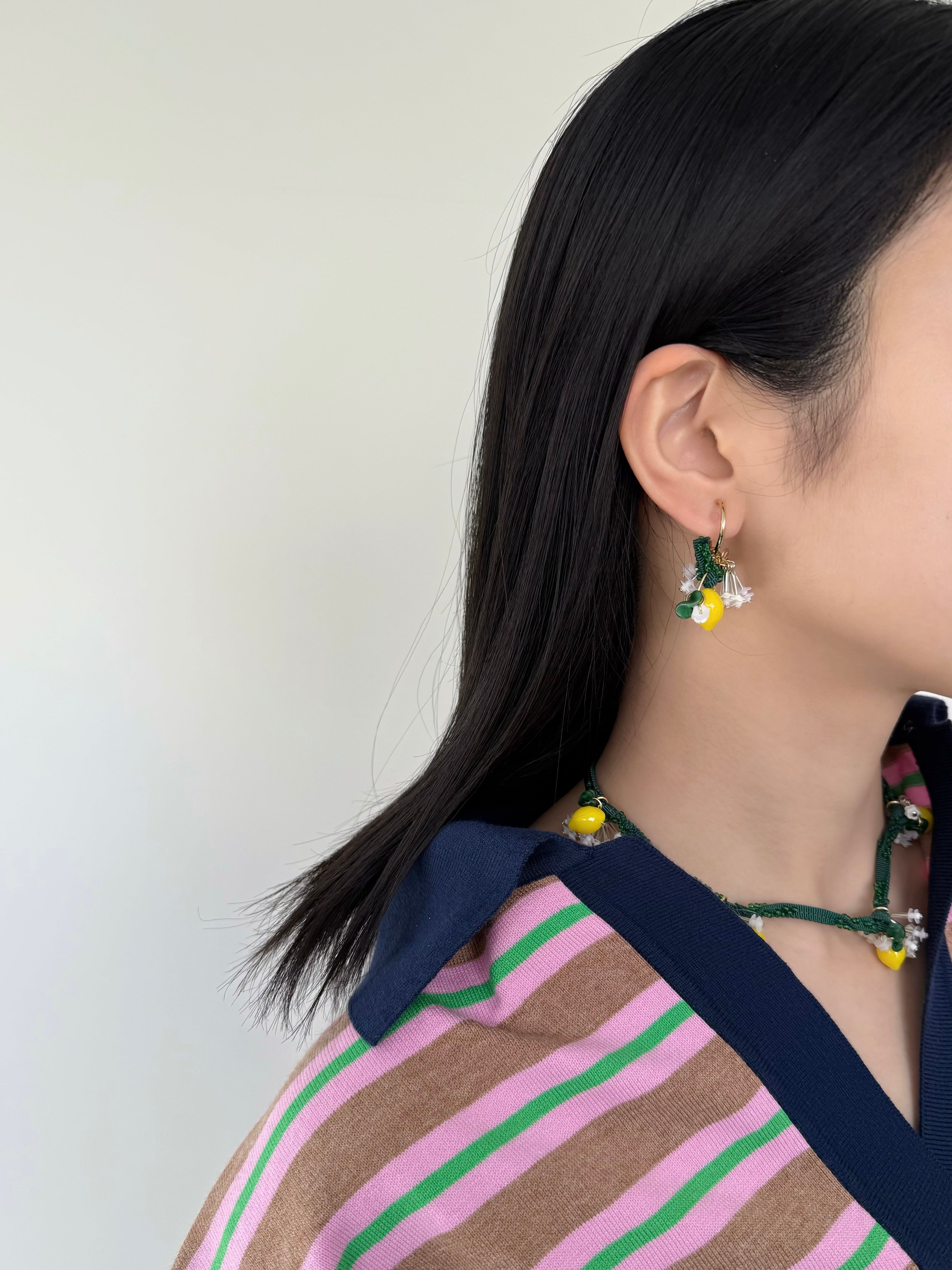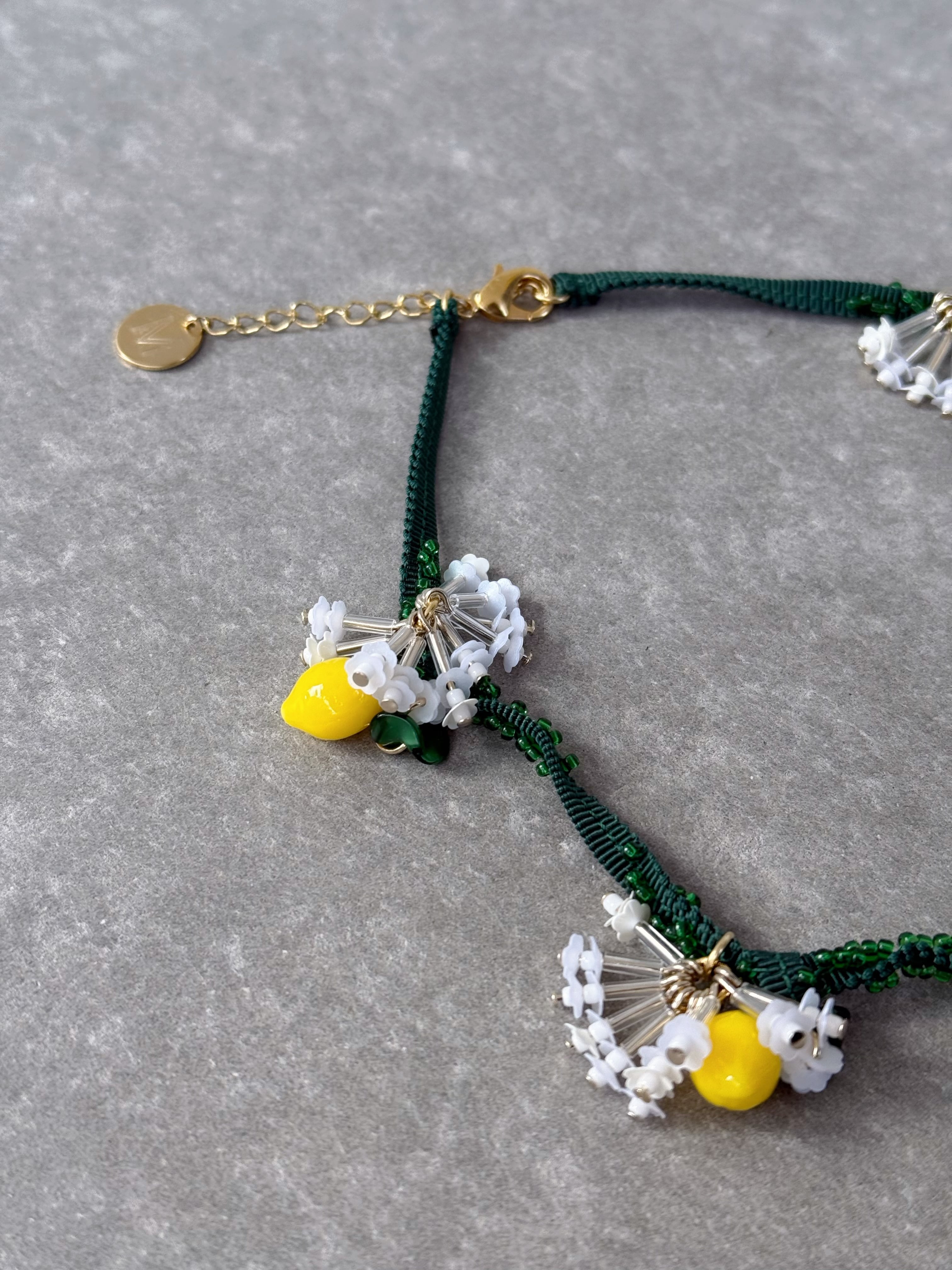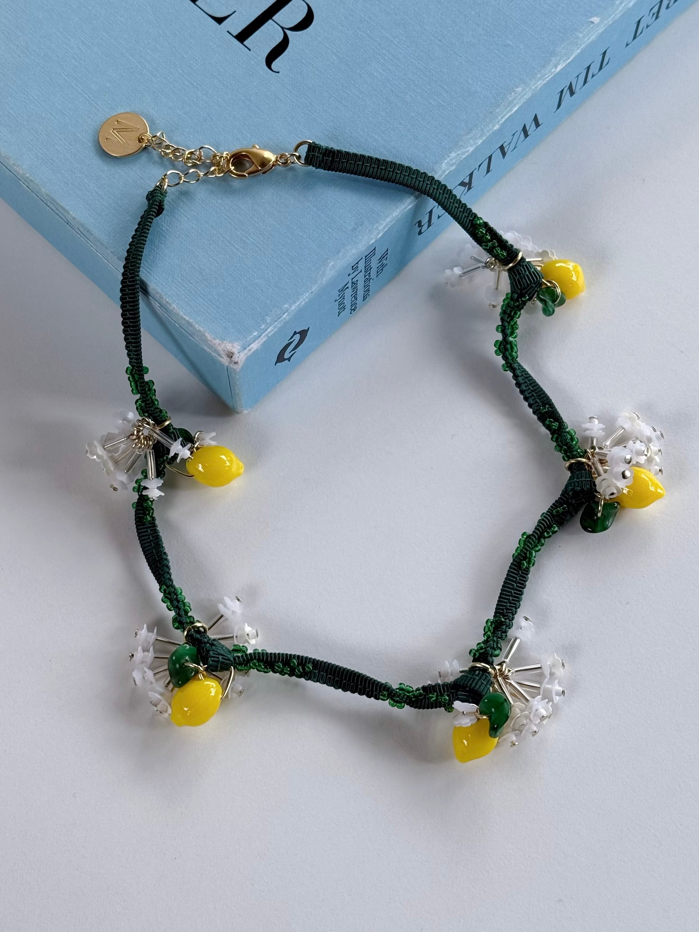 連なった立体的なレモンパーツが、目を惹くネックレス。葉はヴィンテージのガラスビーズを使用。