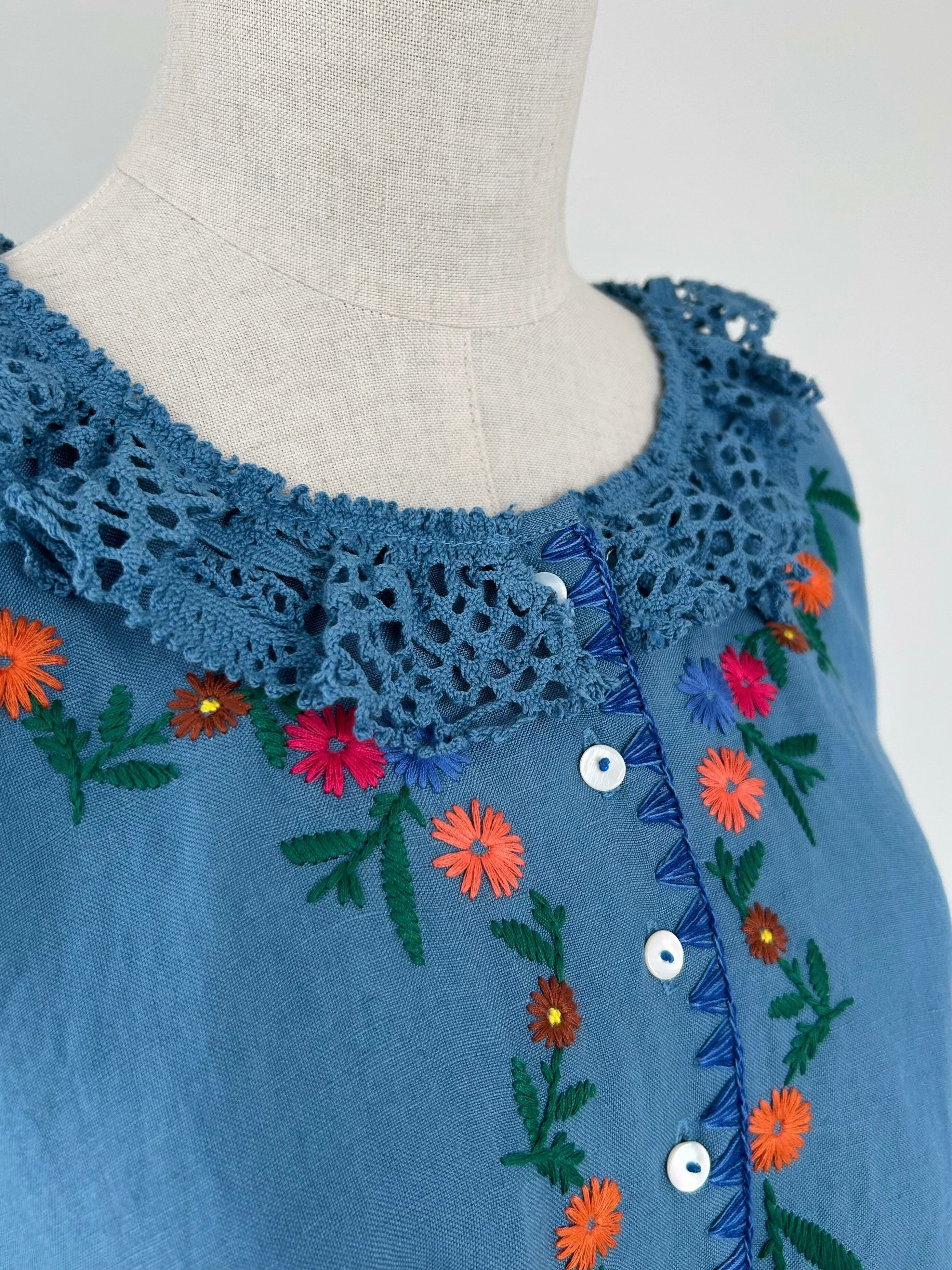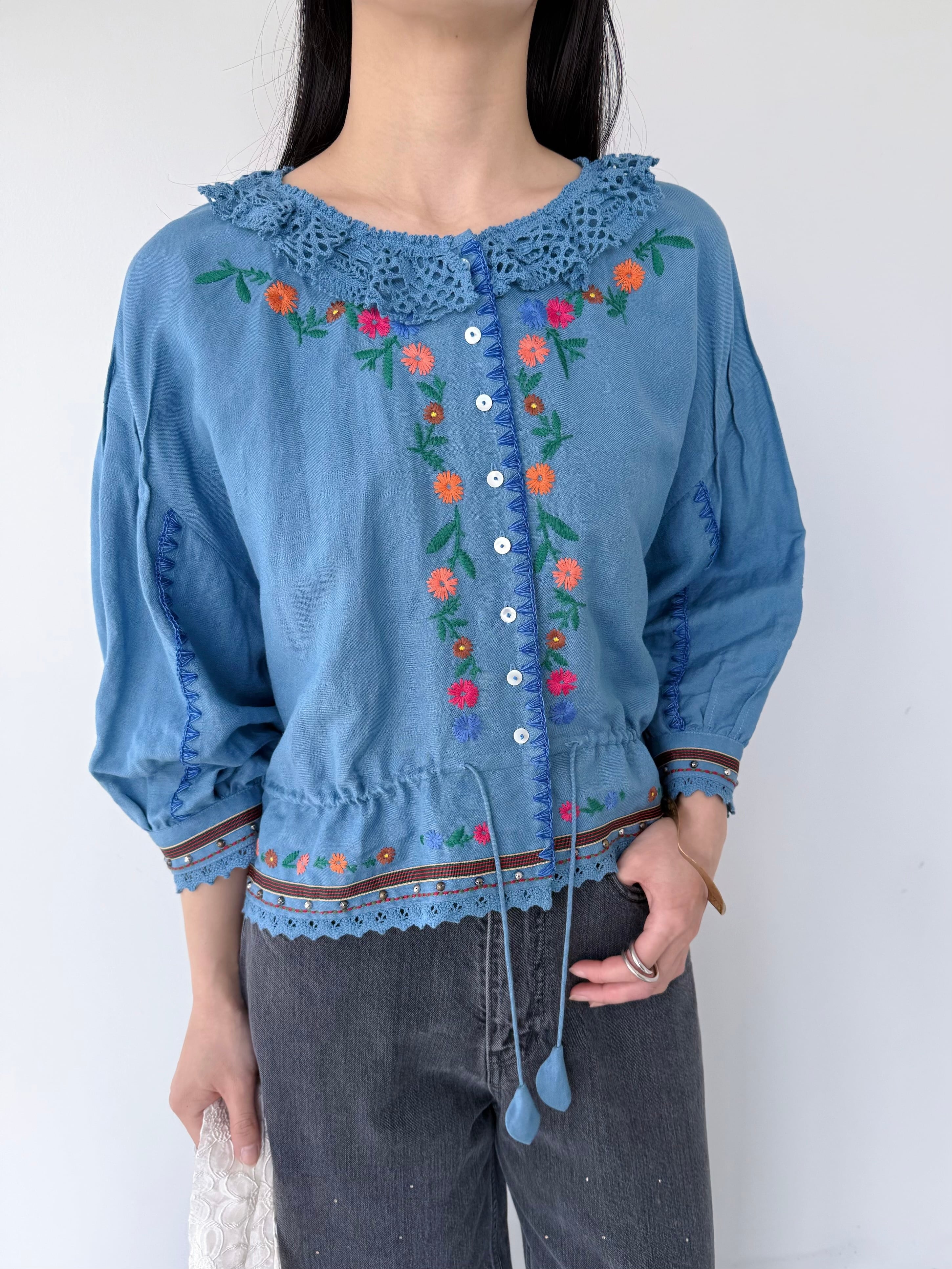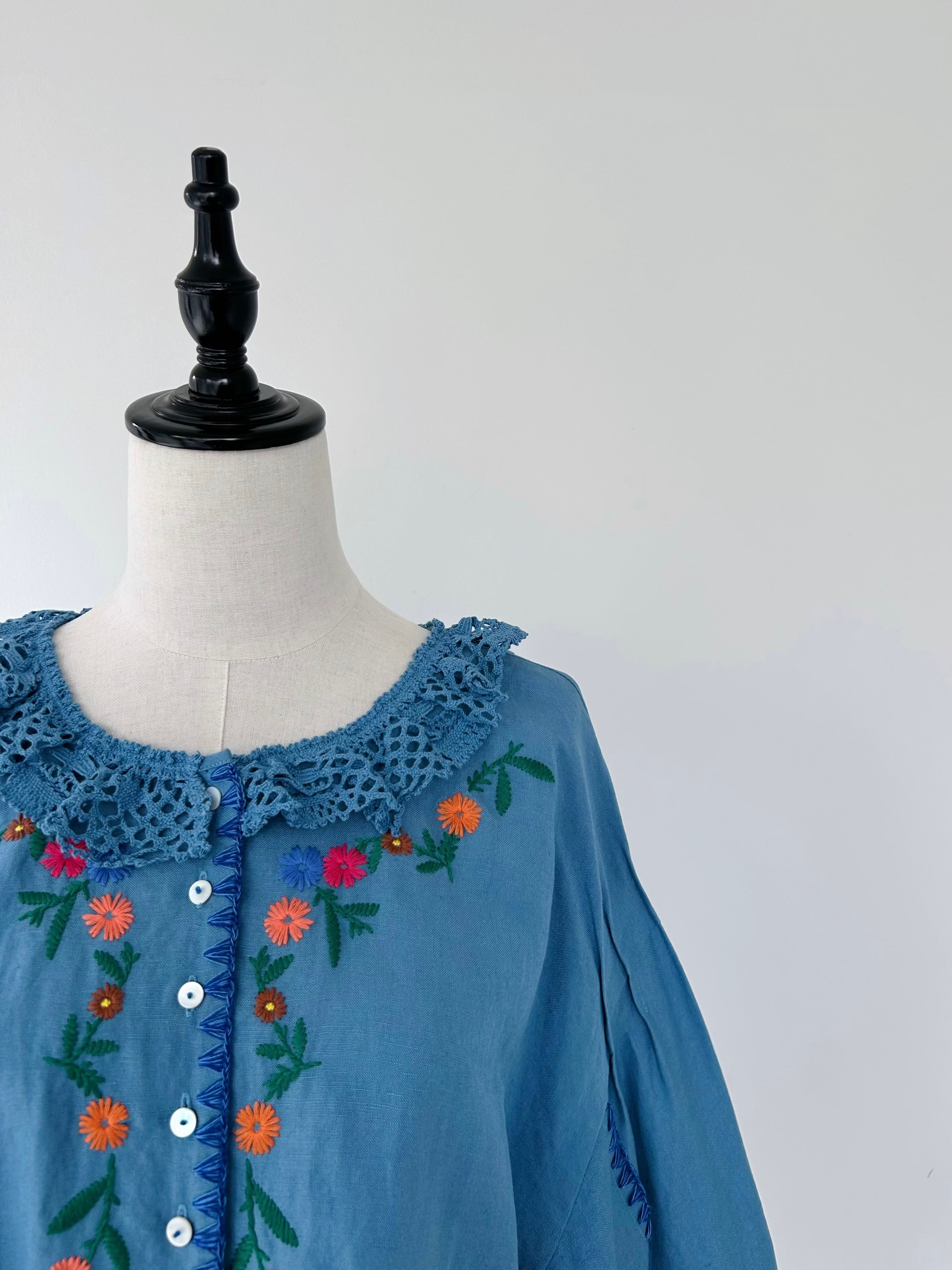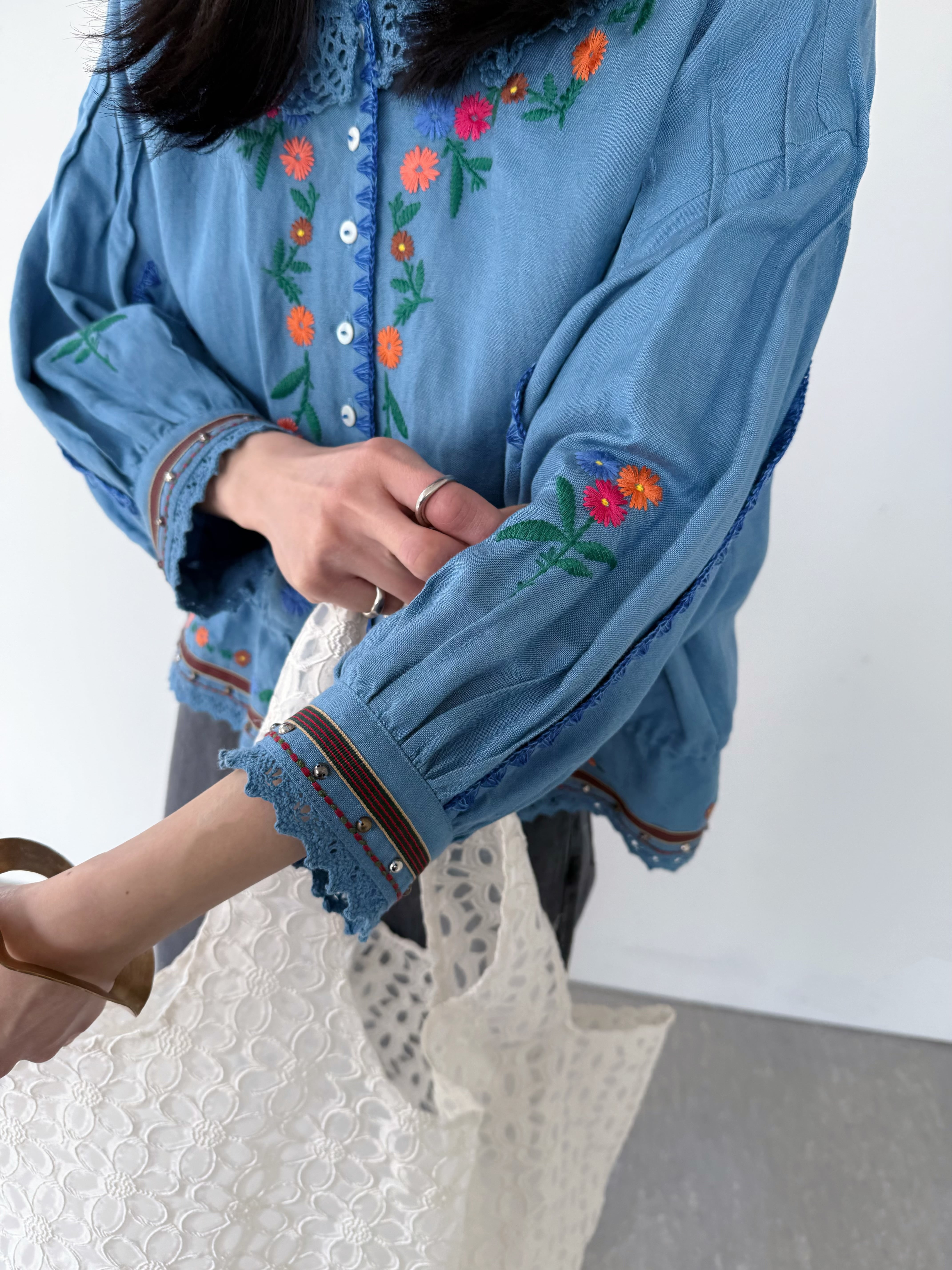 ハンドメイドタッチのフラワー刺繍やフレームのハマグリ刺繍、貝ボタンに施したビーズと表情豊かにデザインした一着。