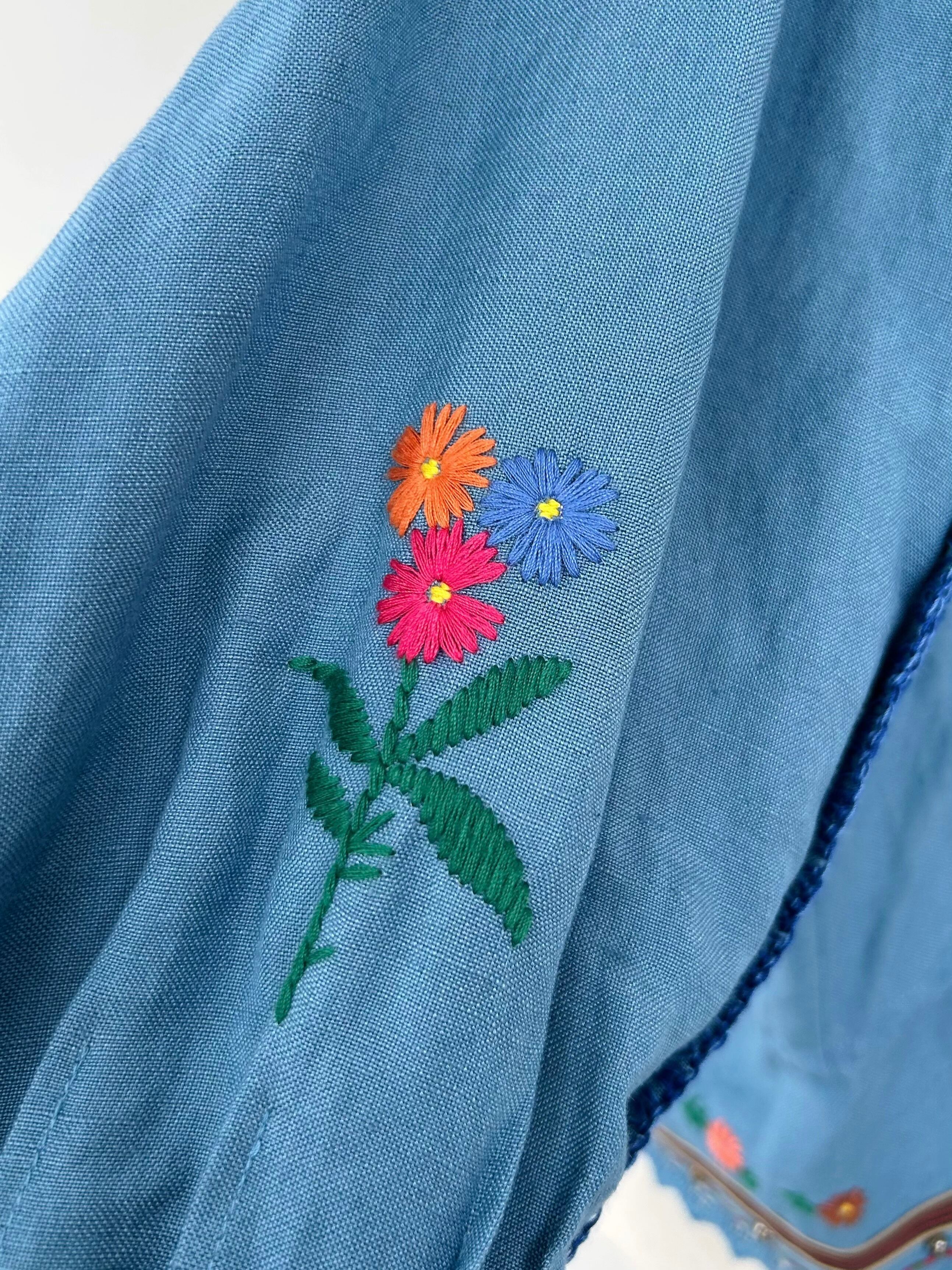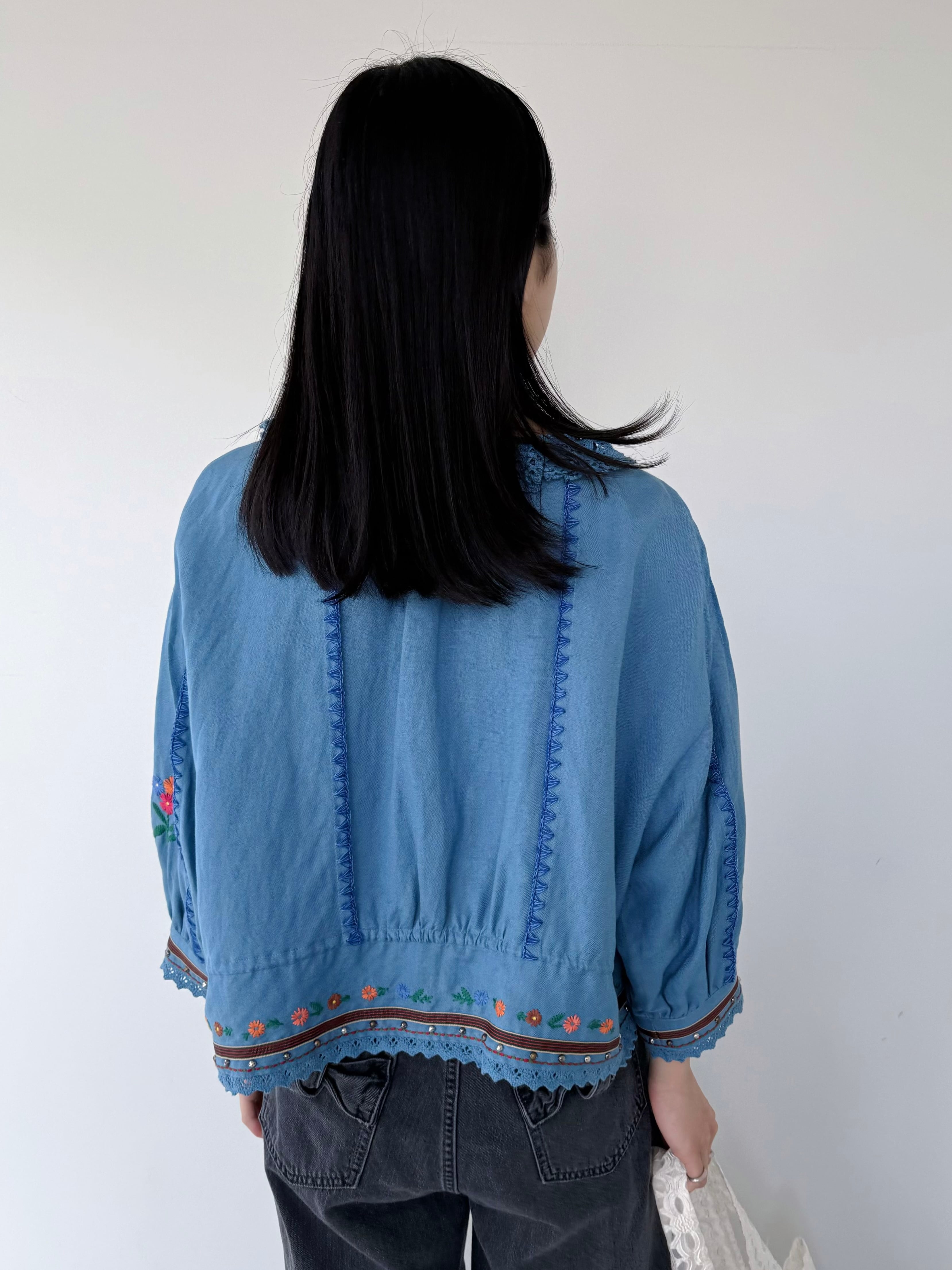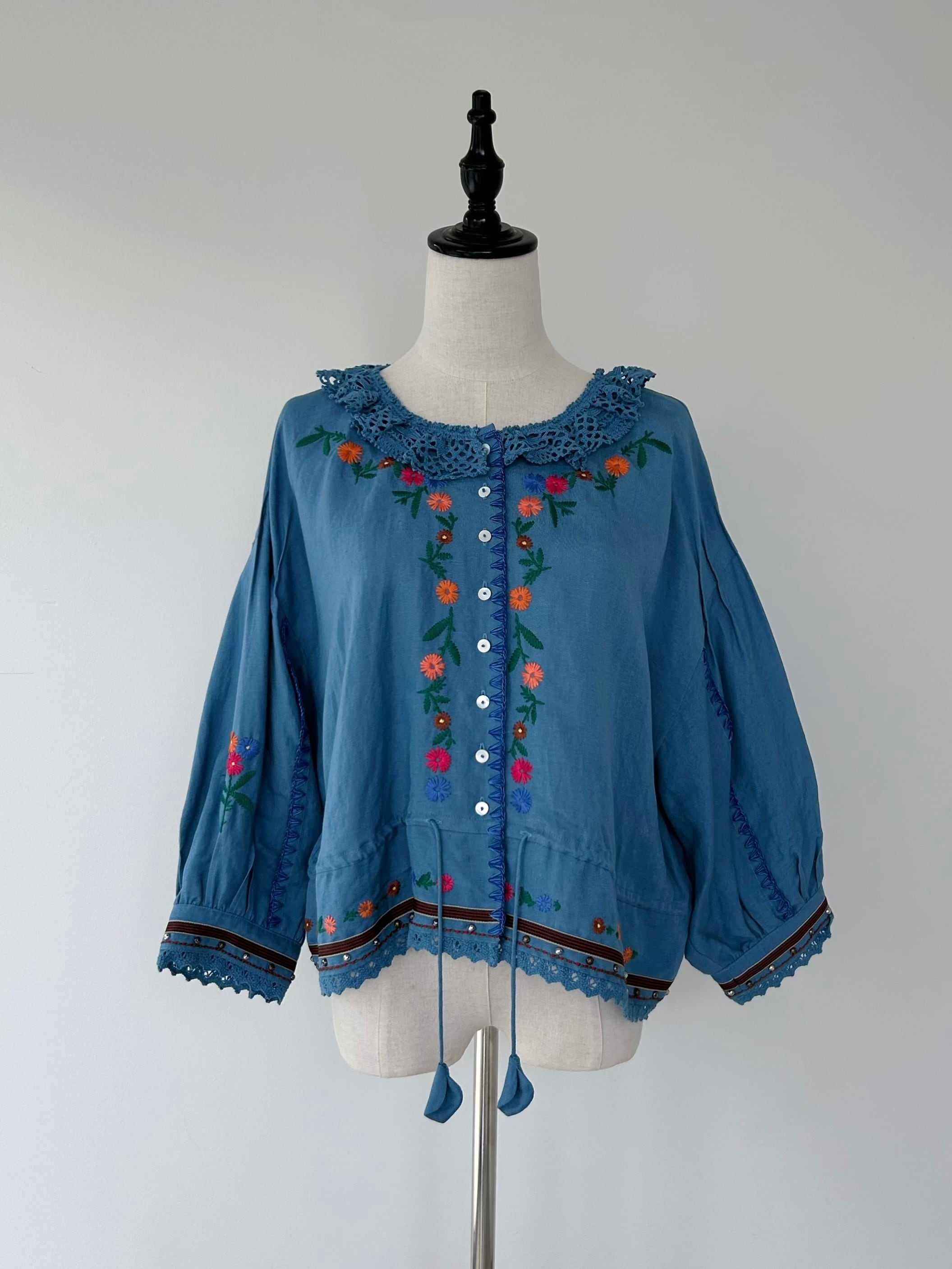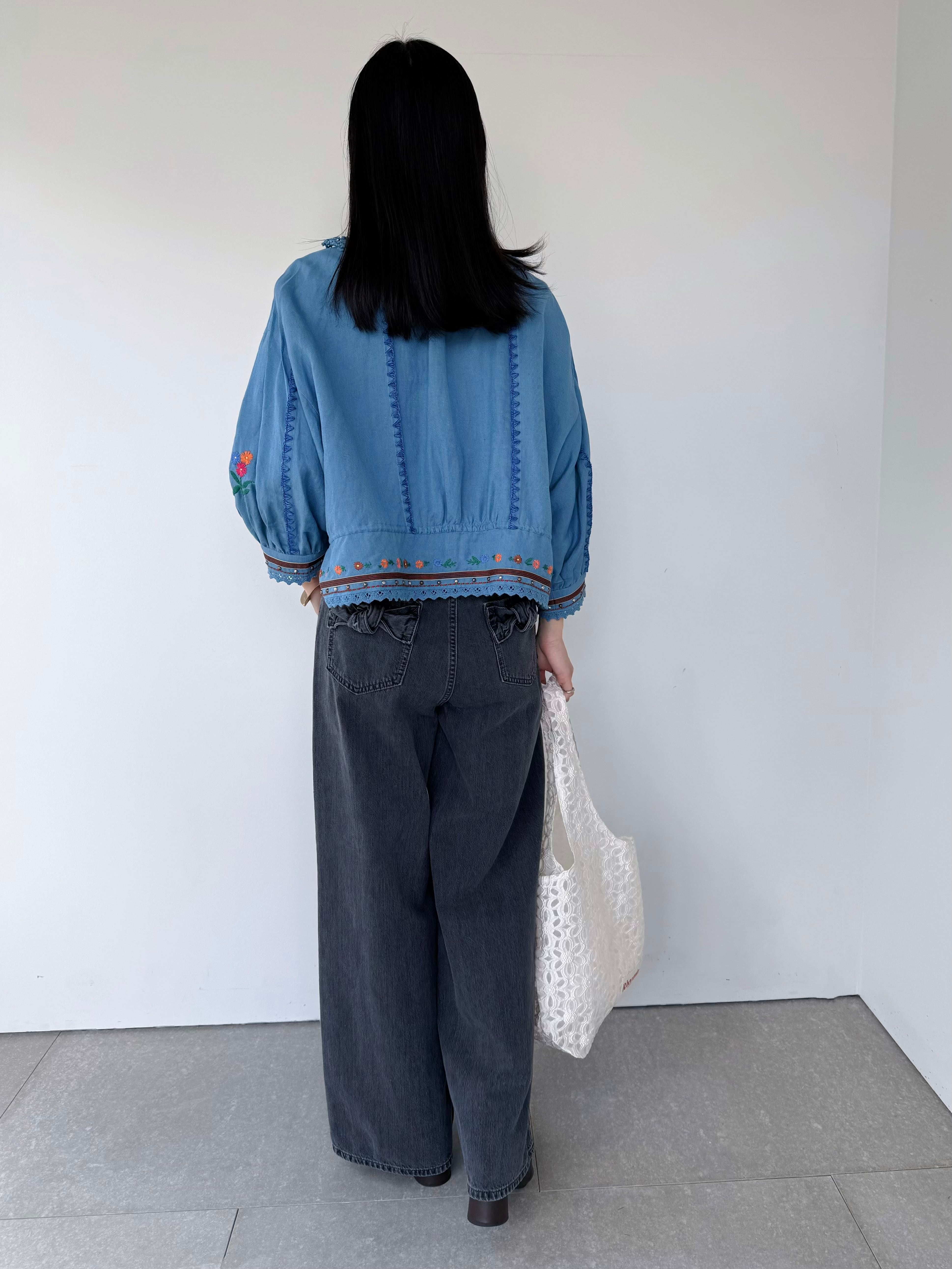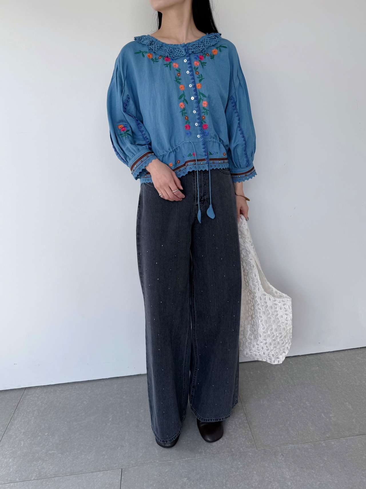 ハンドメイドタッチのフラワー刺繍やフレームのハマグリ刺繍、貝ボタンに施したビーズと表情豊かにデザインした一着。