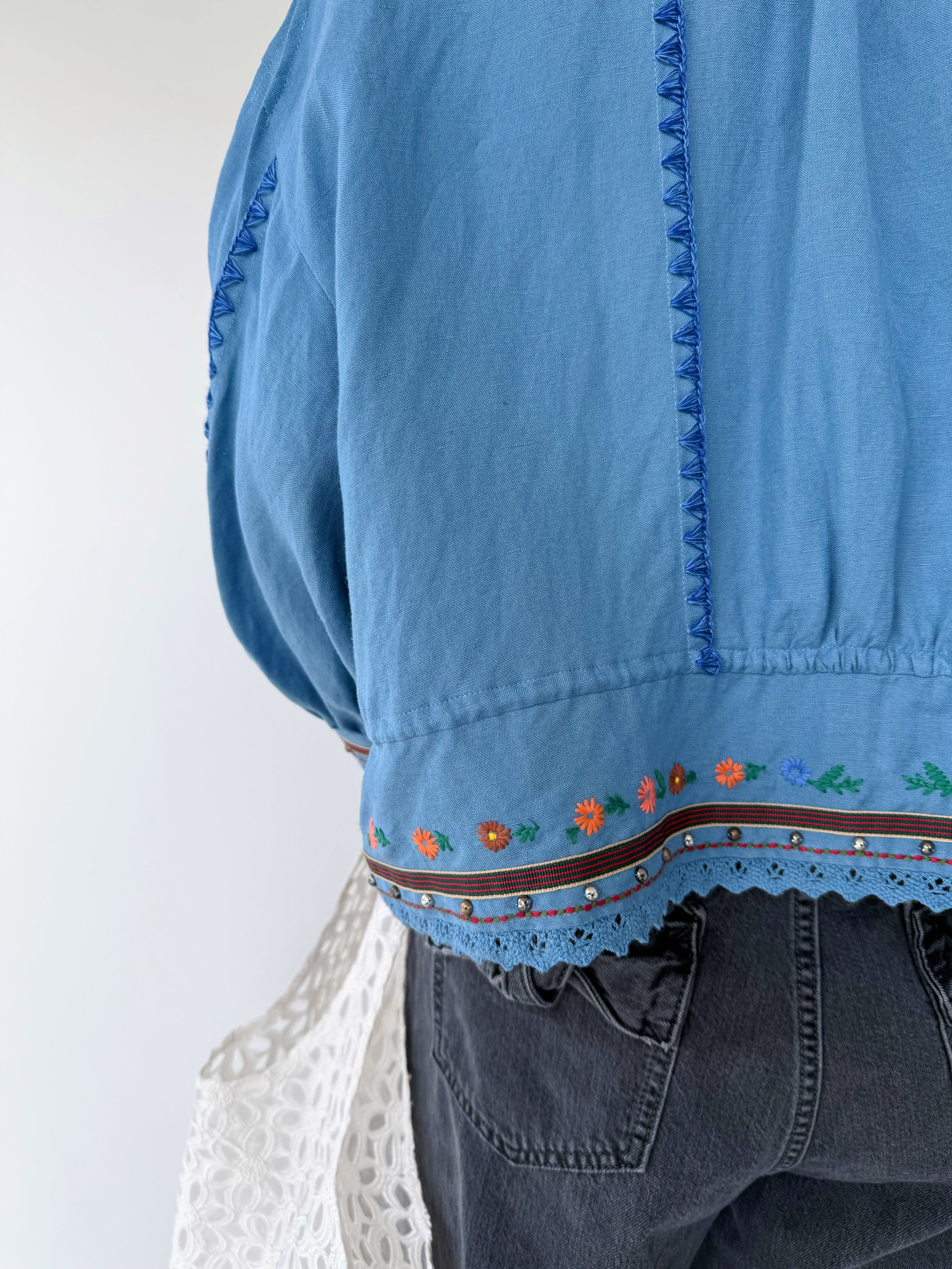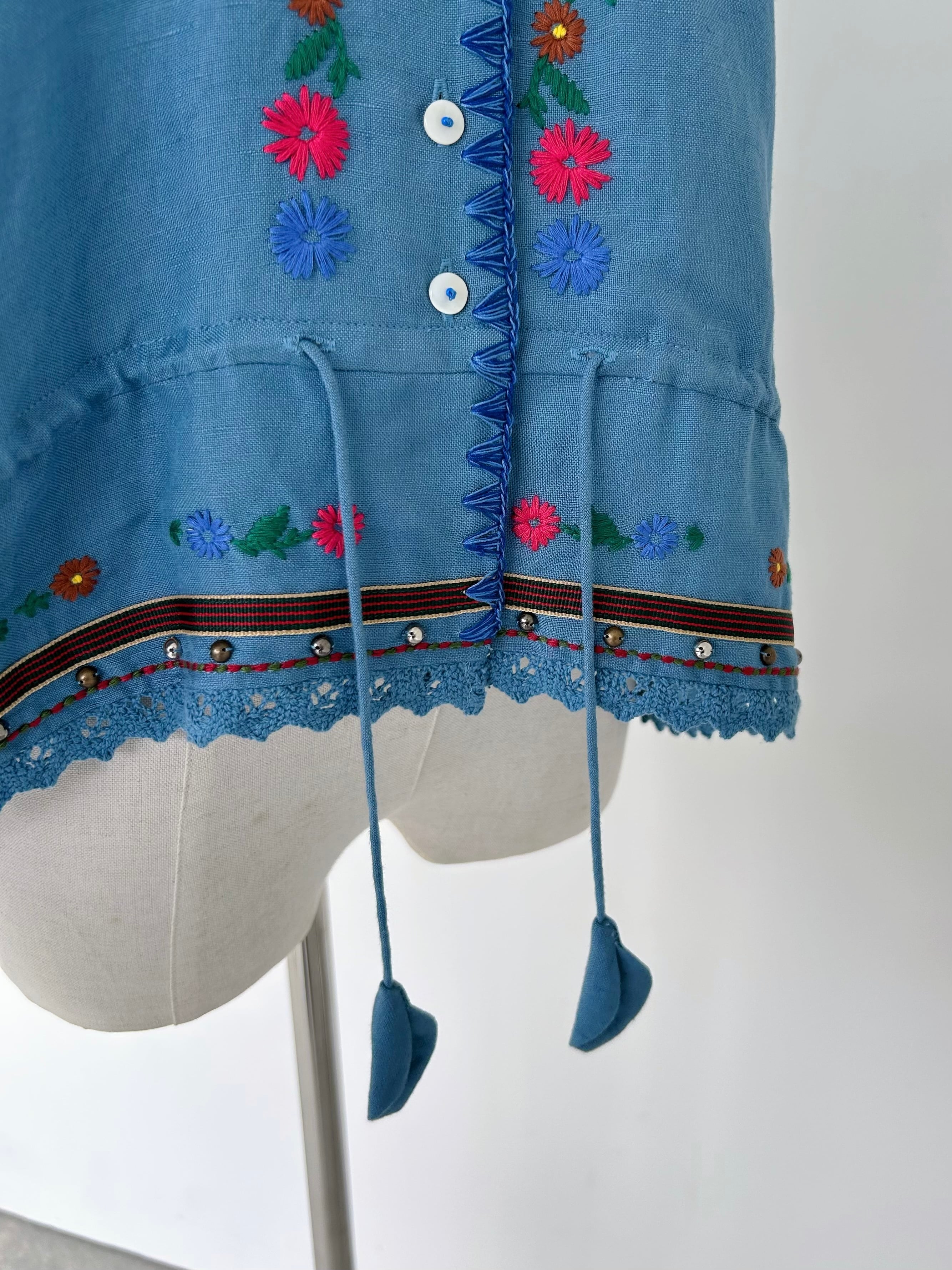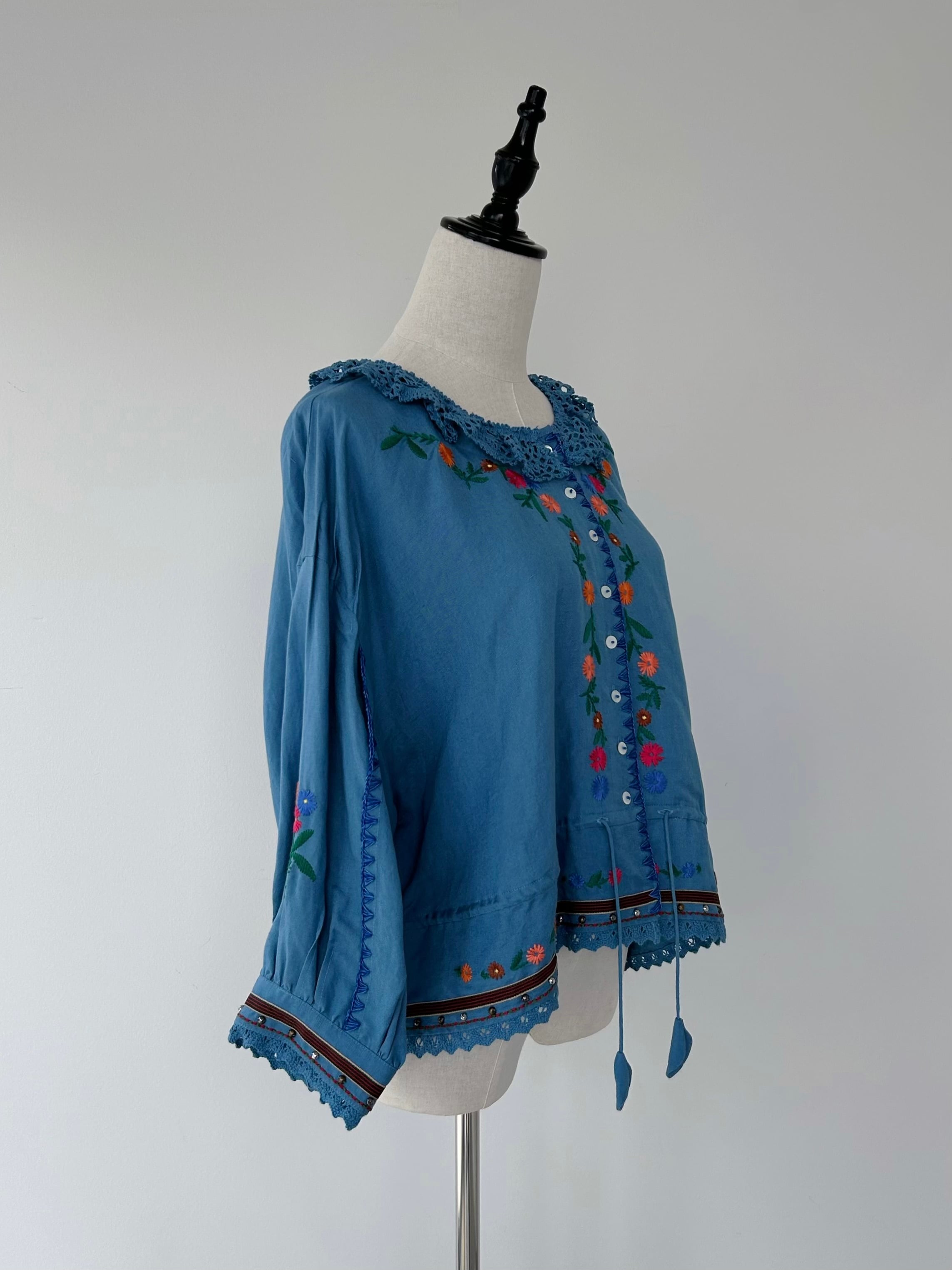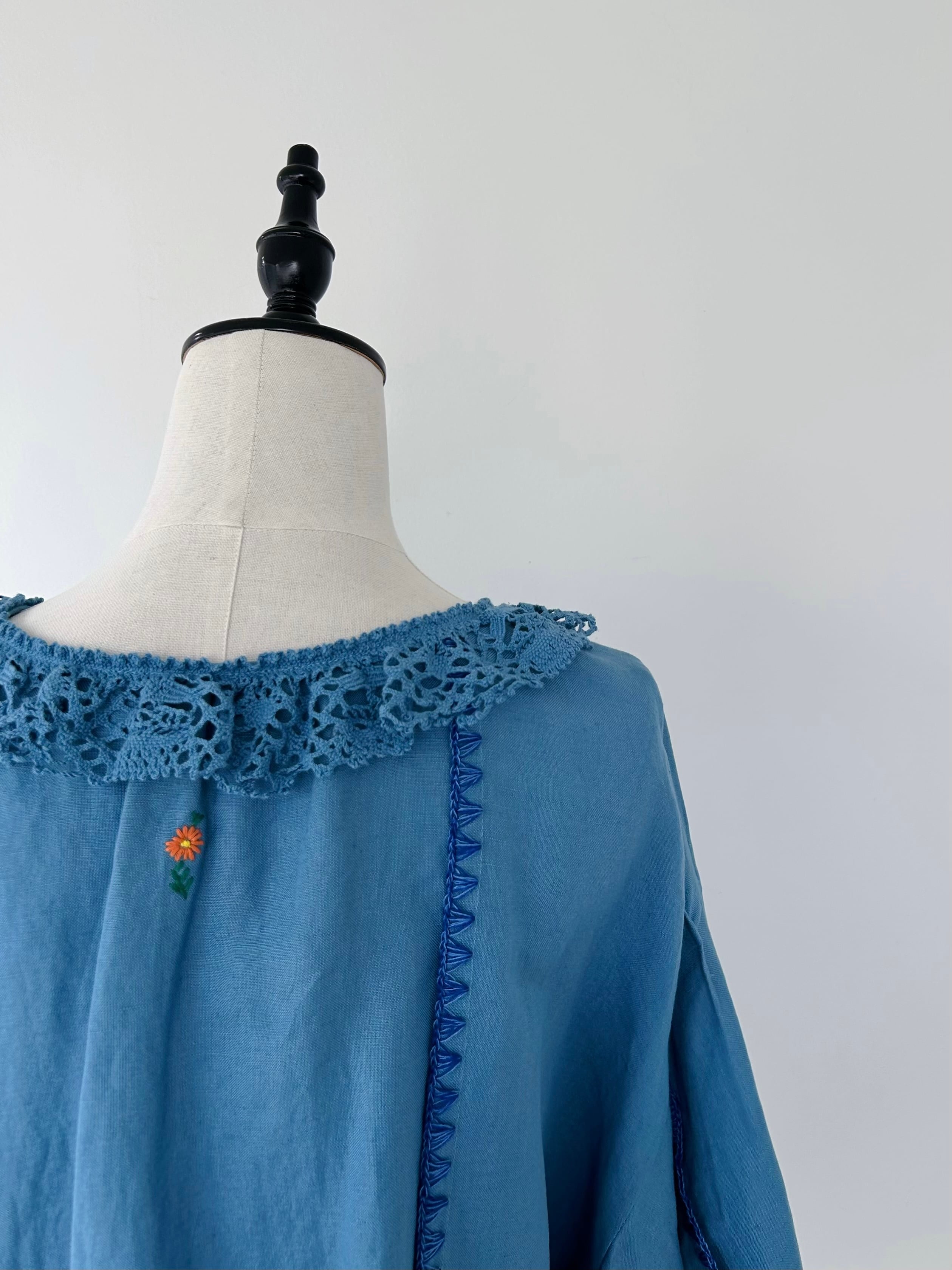 ハンドメイドタッチのフラワー刺繍やフレームのハマグリ刺繍、貝ボタンに施したビーズと表情豊かにデザインした一着。