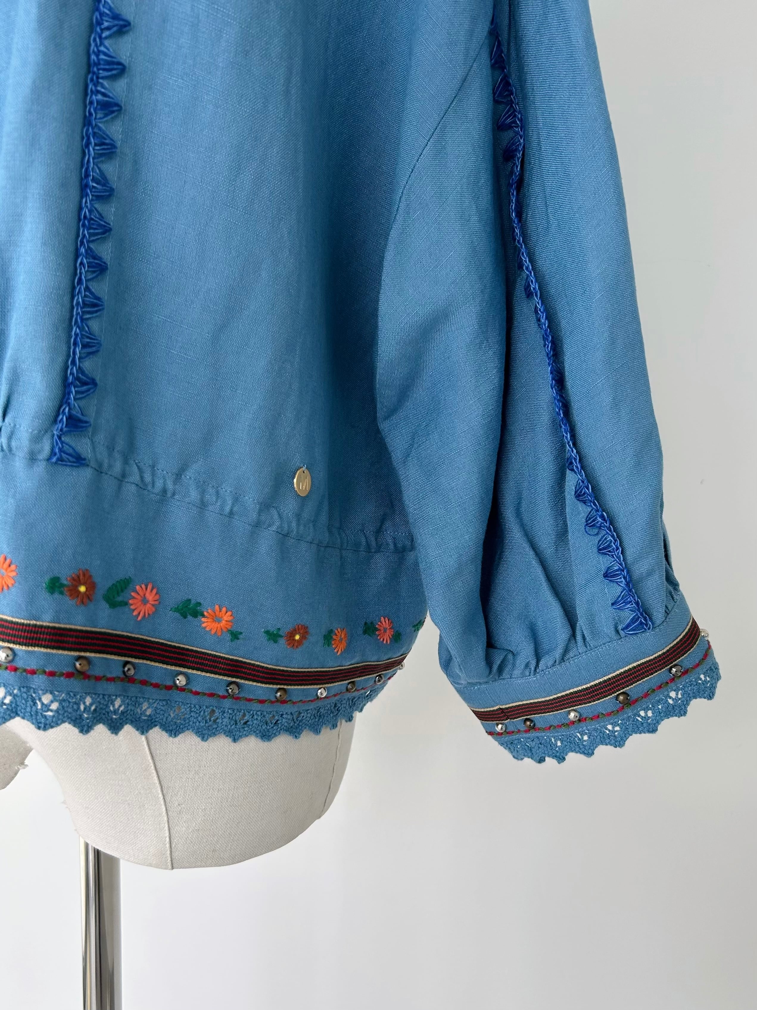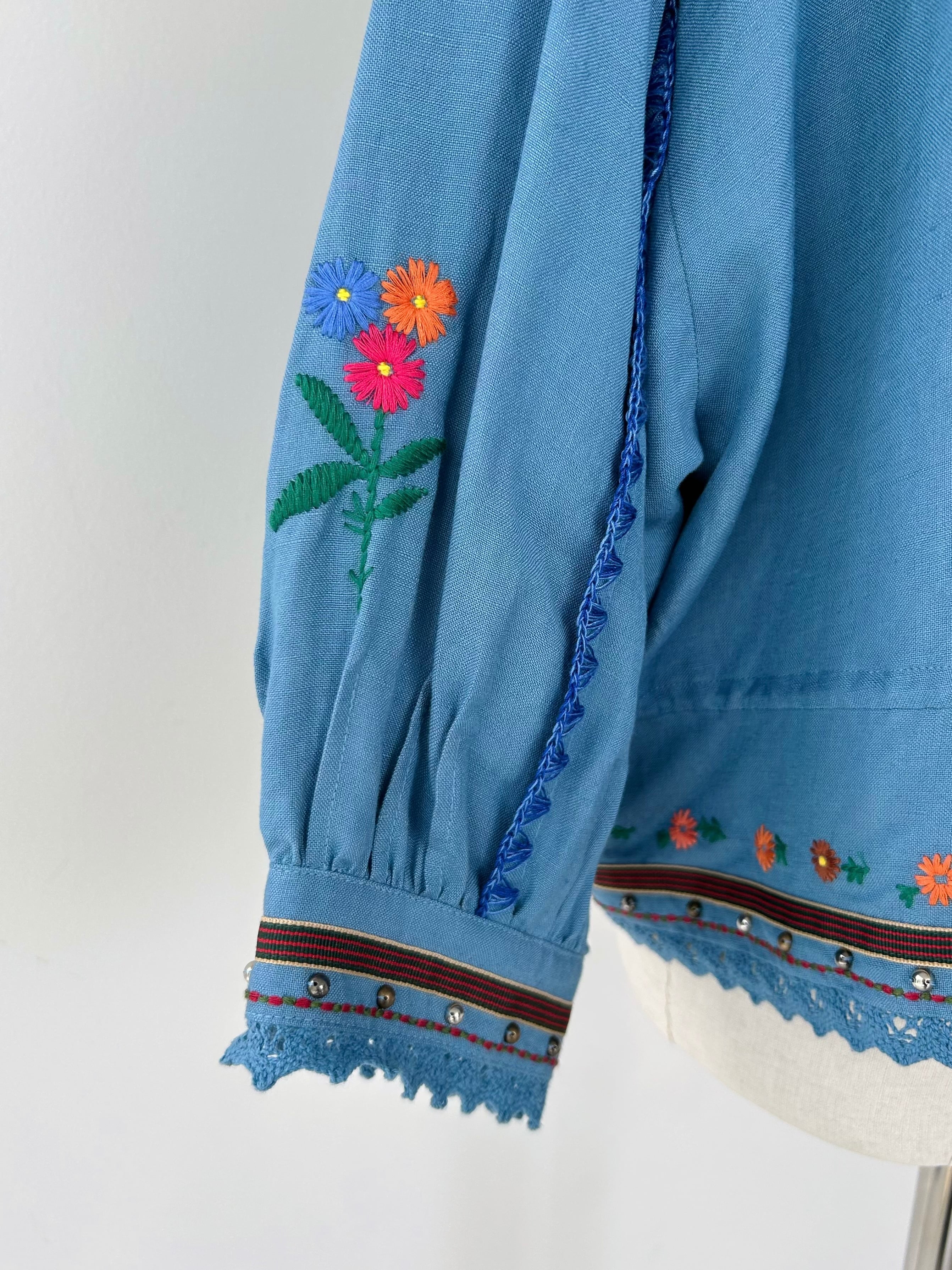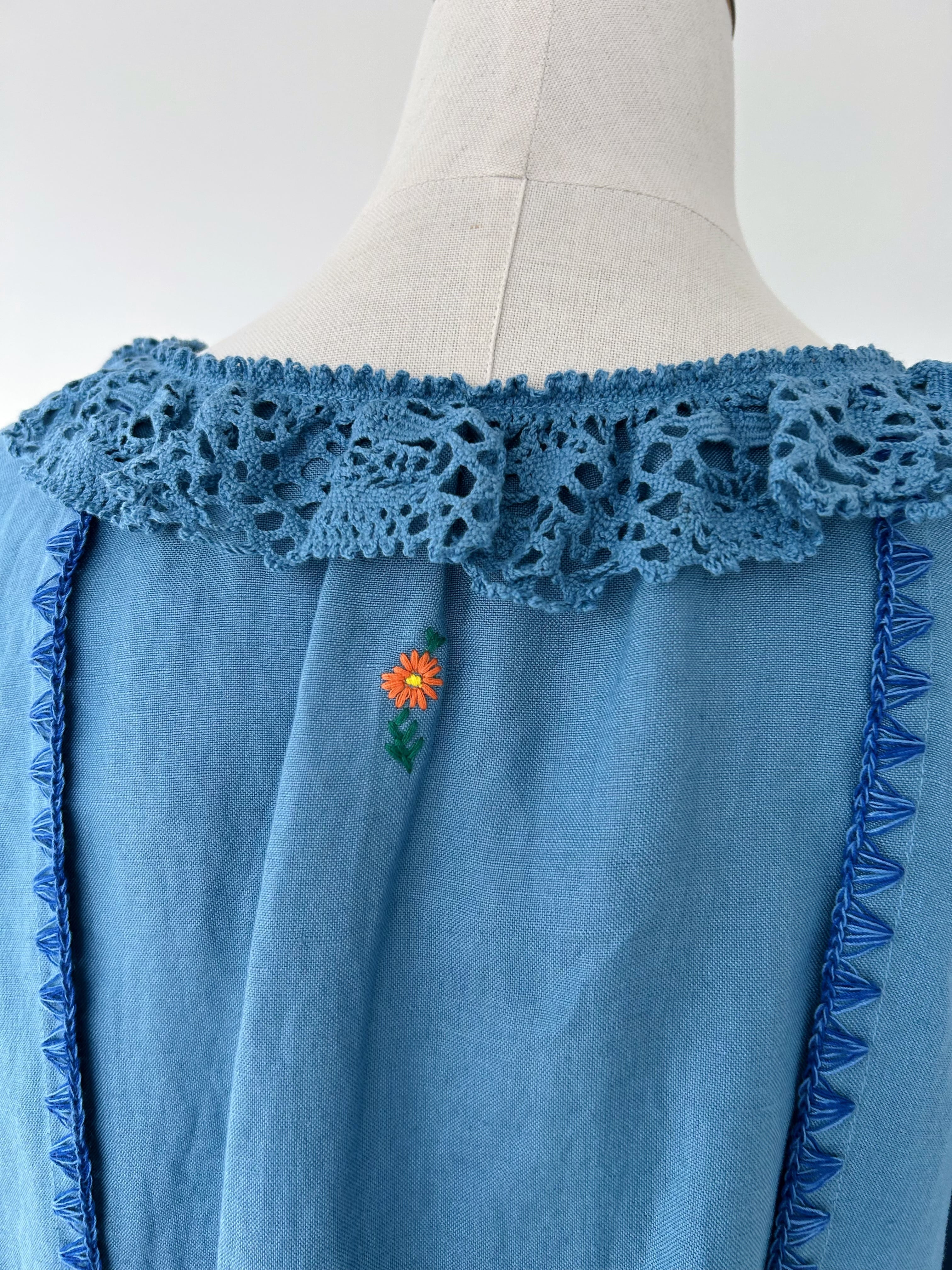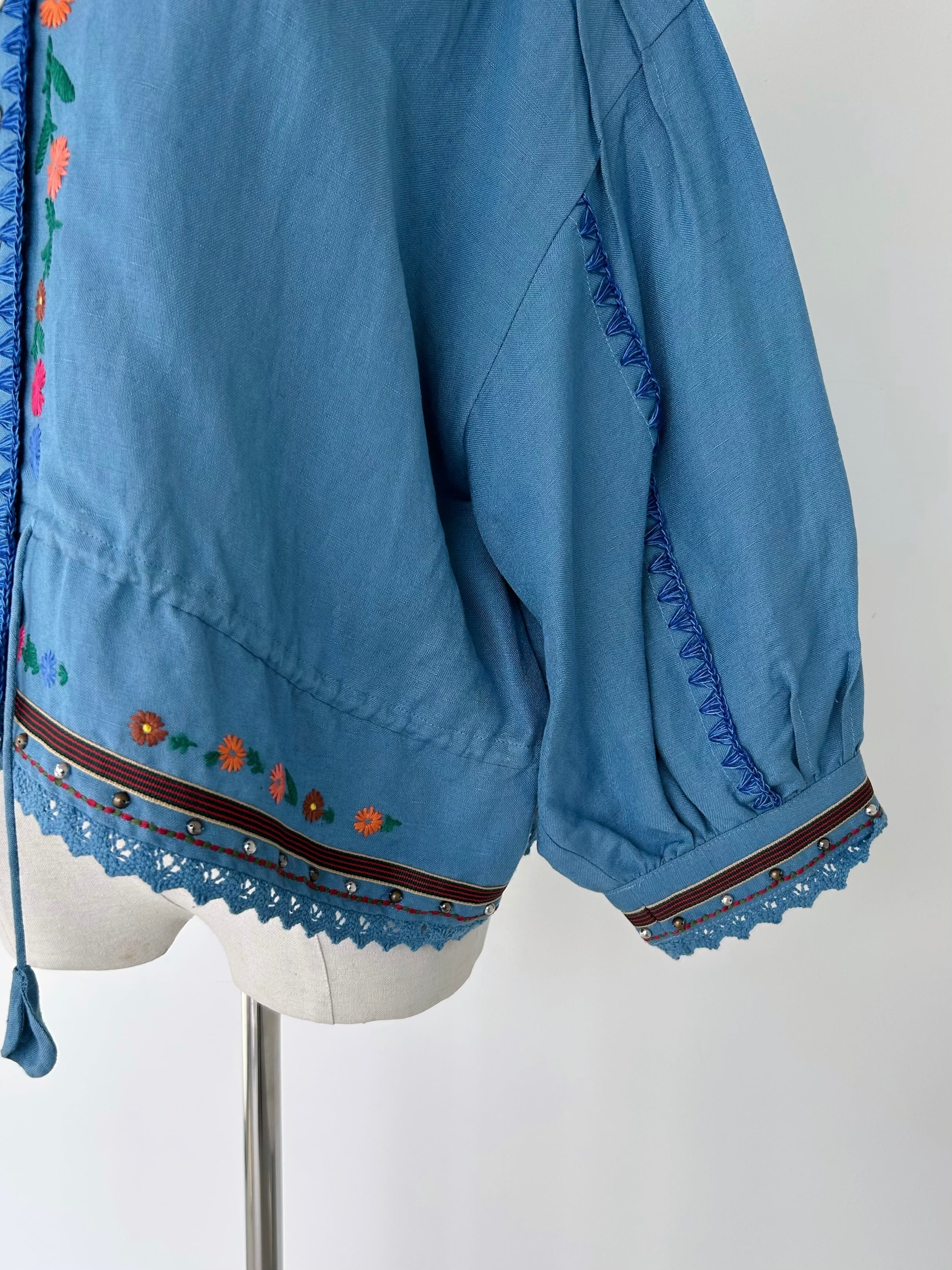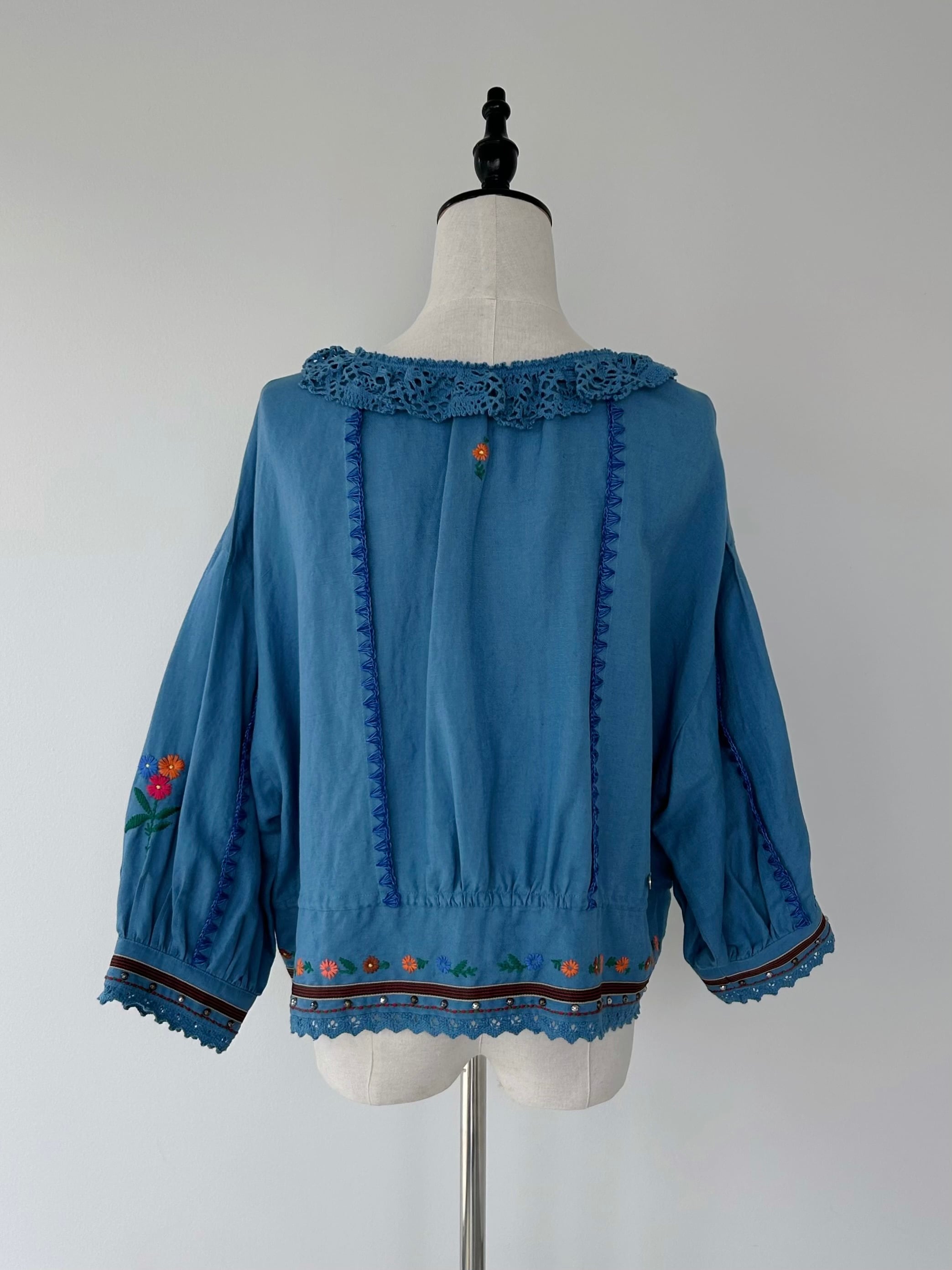 ハンドメイドタッチのフラワー刺繍やフレームのハマグリ刺繍、貝ボタンに施したビーズと表情豊かにデザインした一着。