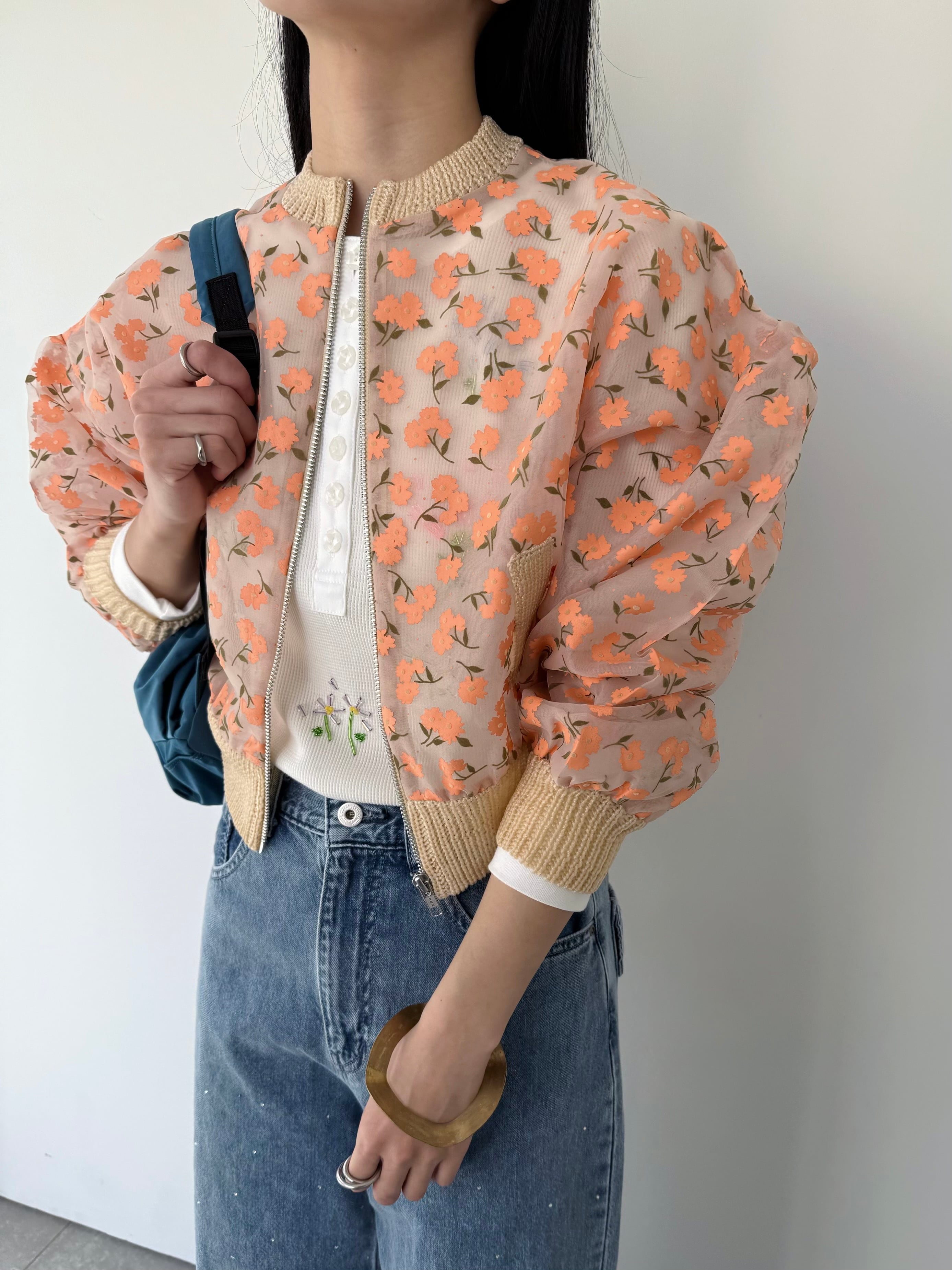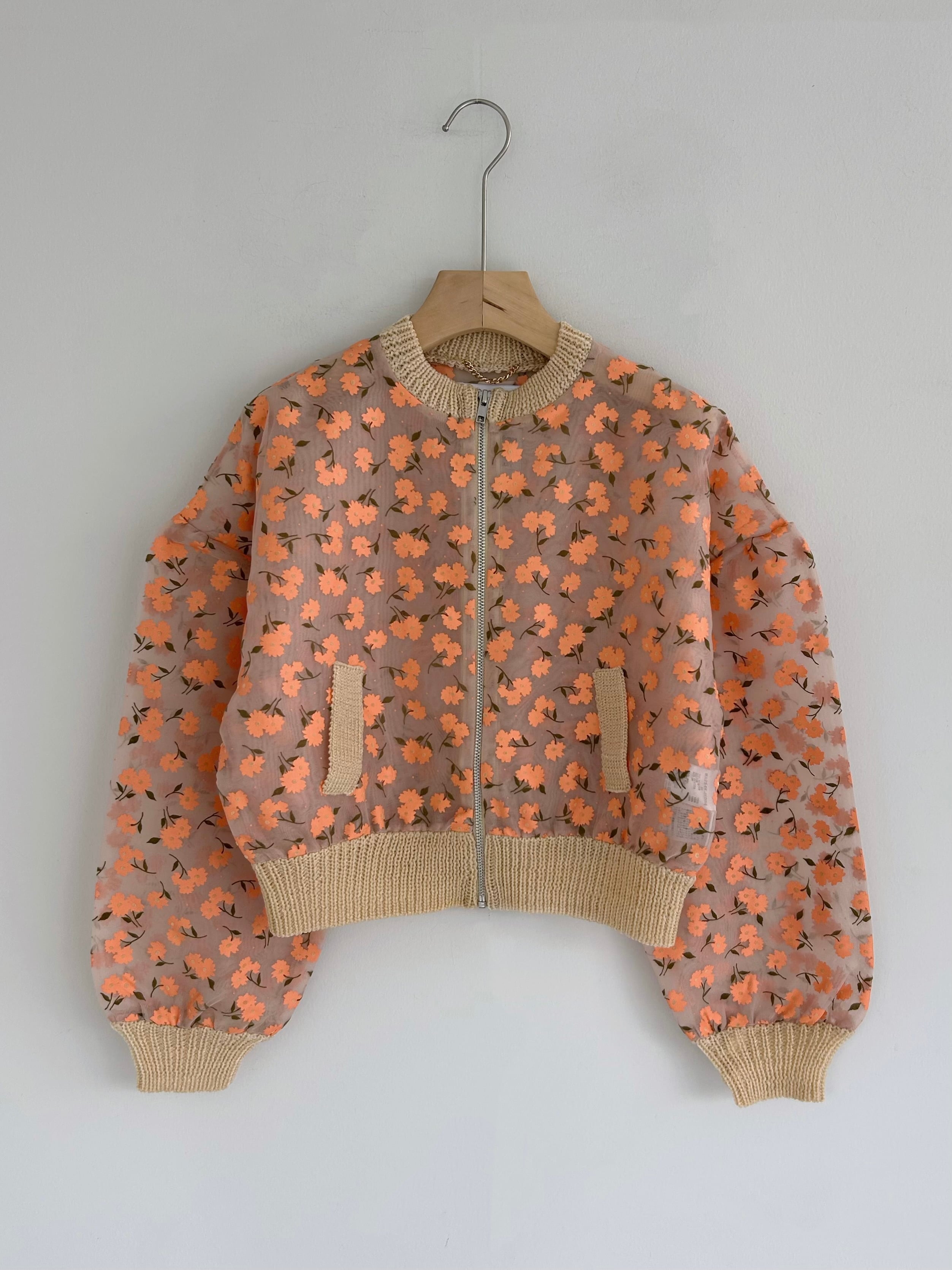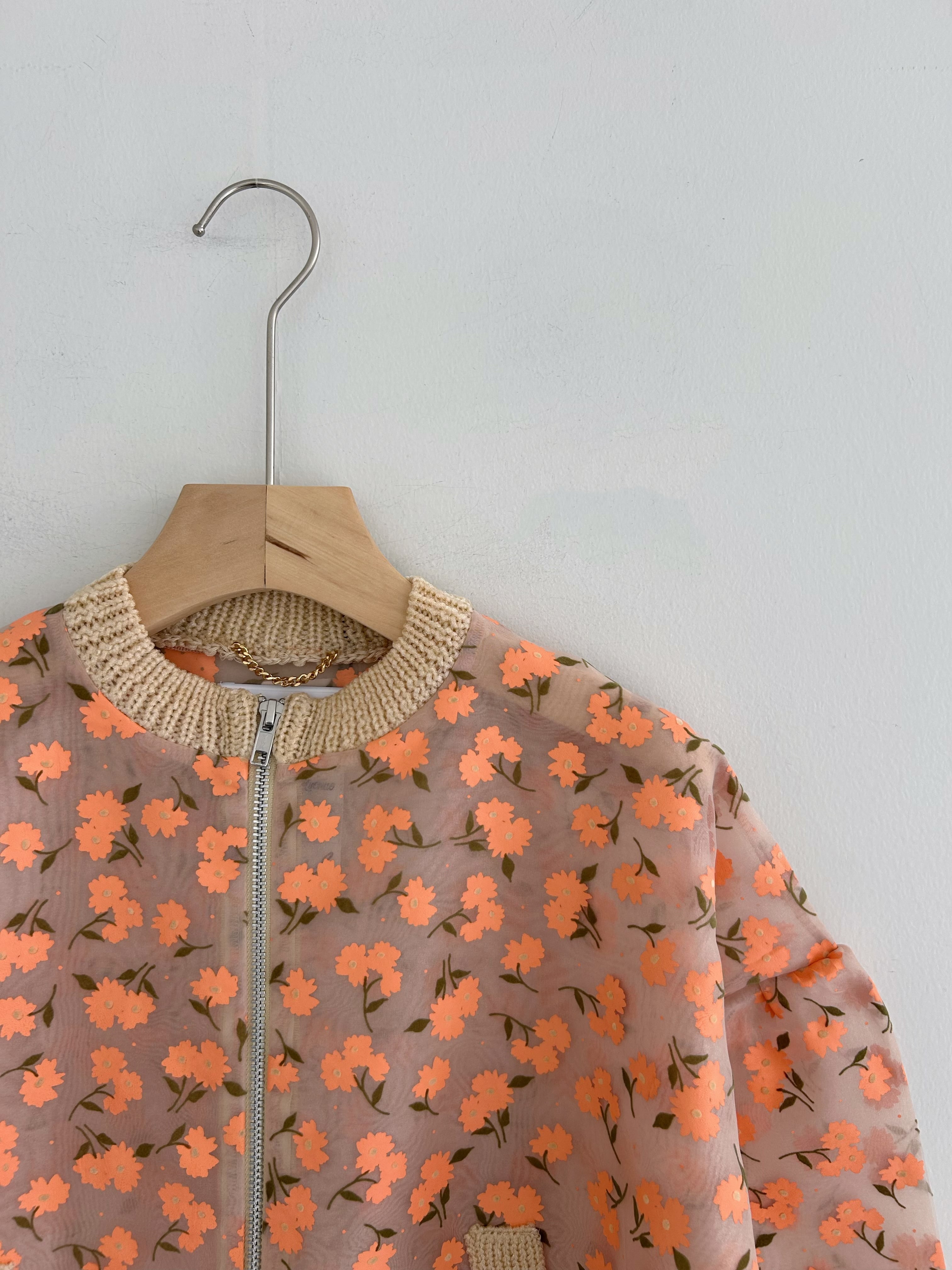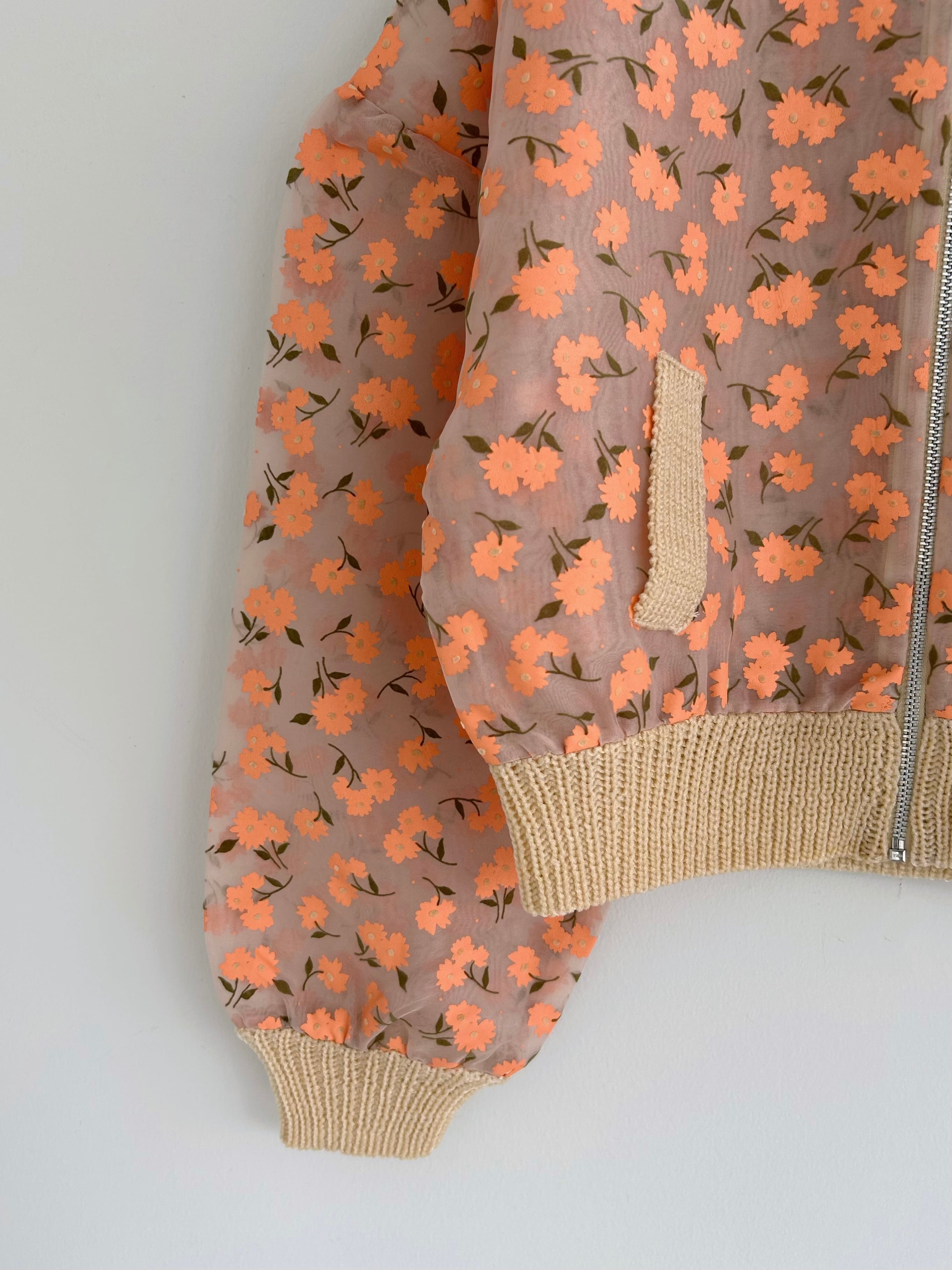 オーガンジー素材に顔料とフロッキーを組み合わせたオリジナルフラワープリントのジップカーディガン。