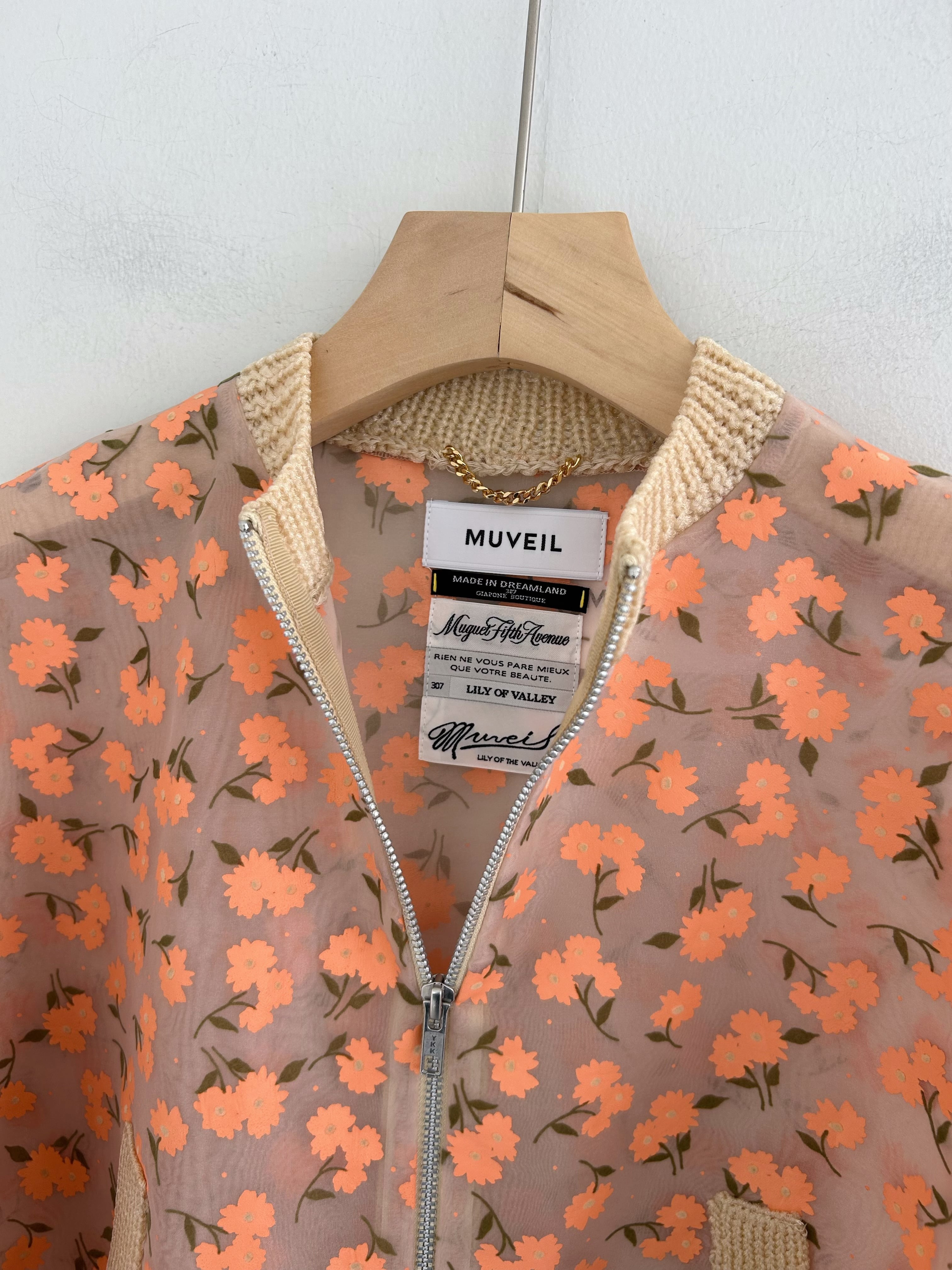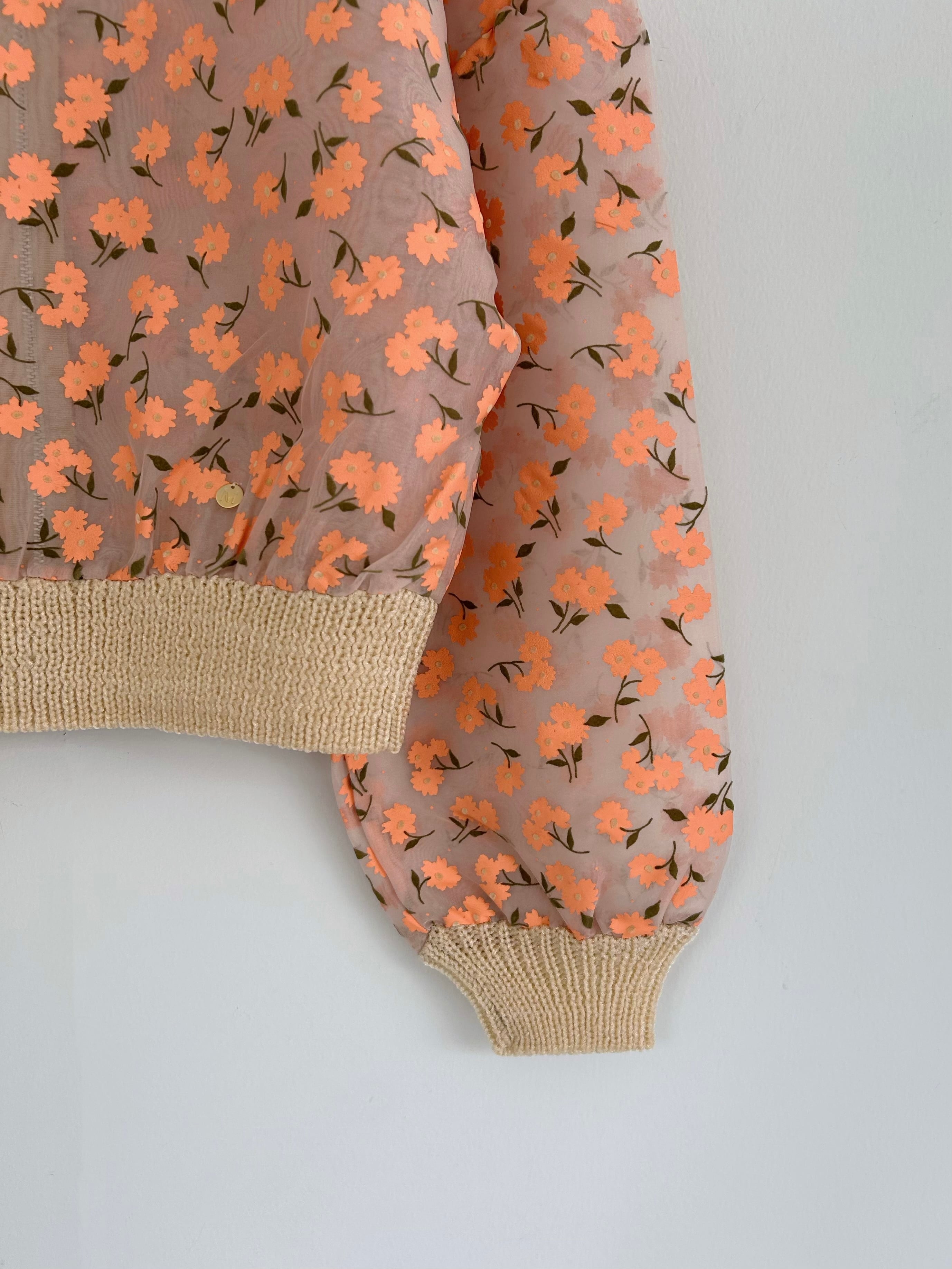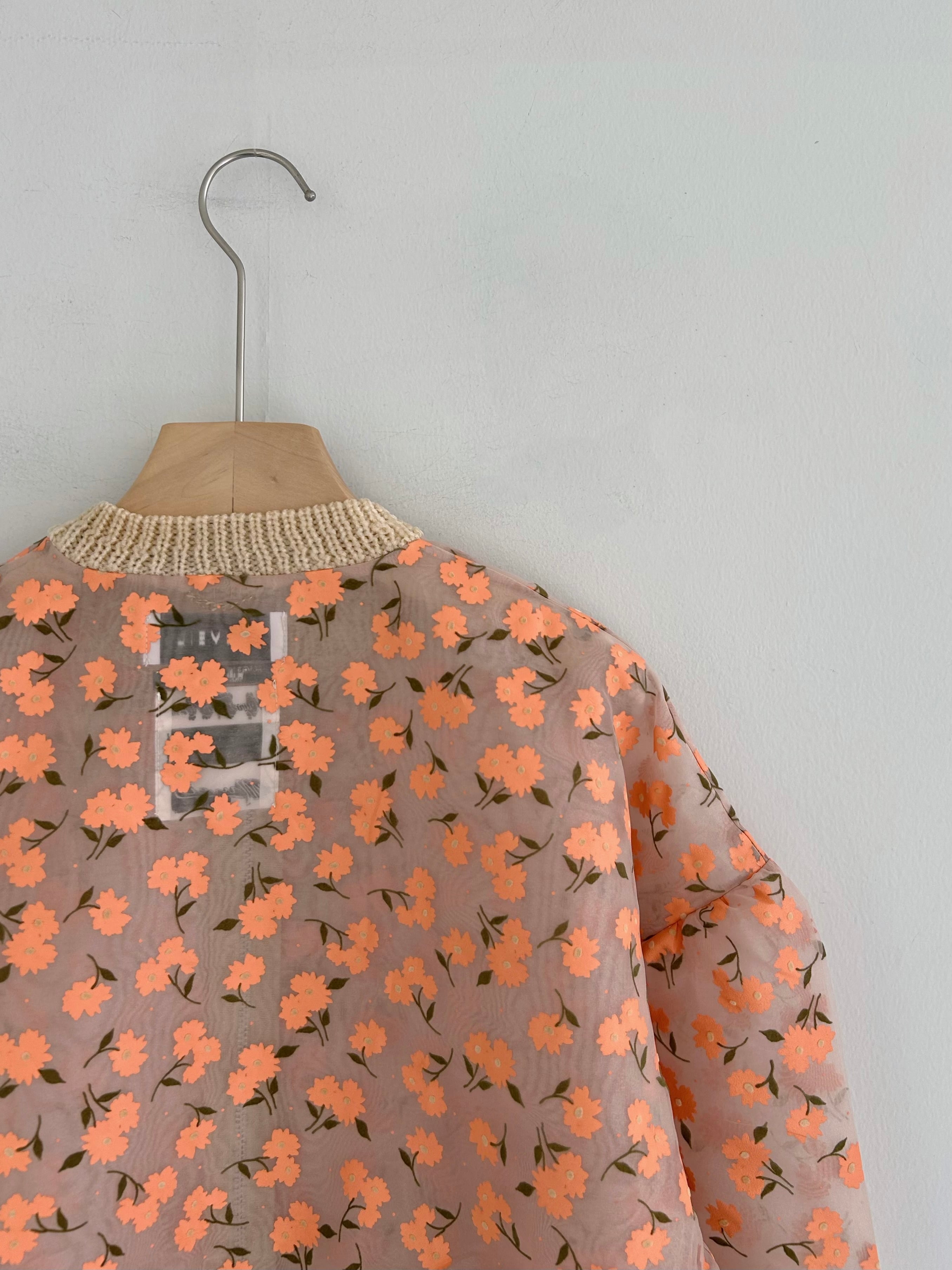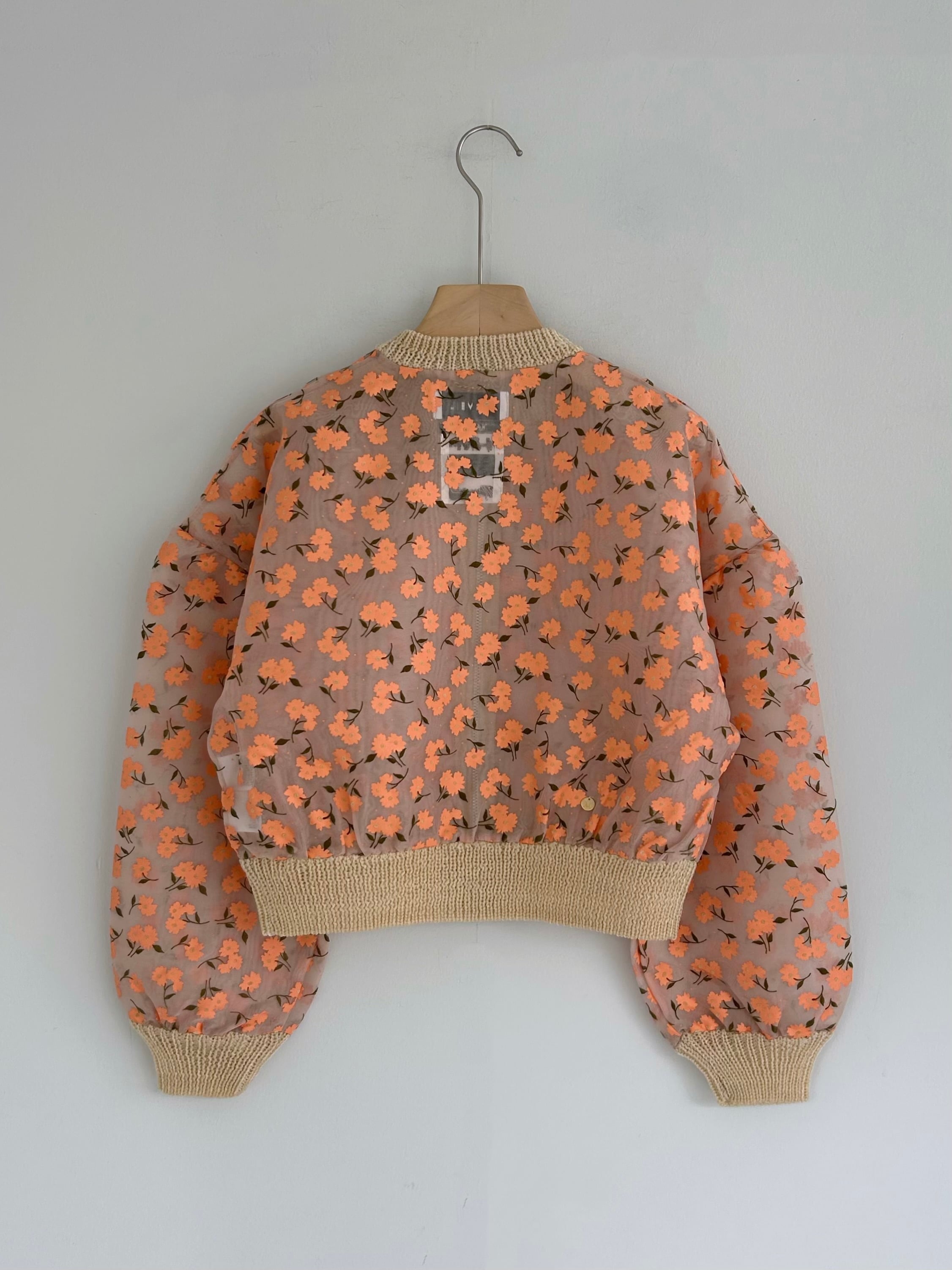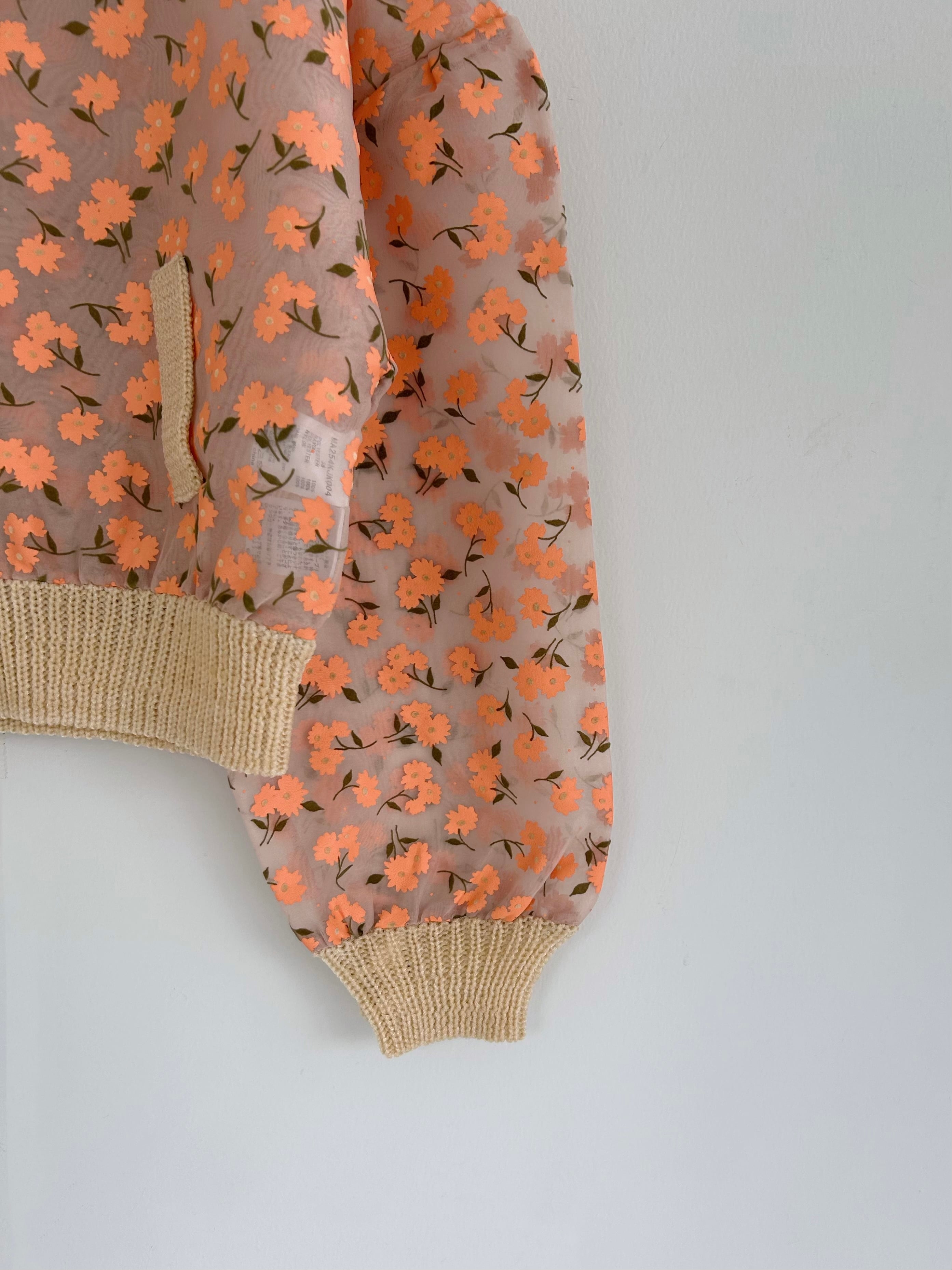 オーガンジー素材に顔料とフロッキーを組み合わせたオリジナルフラワープリントのジップカーディガン。